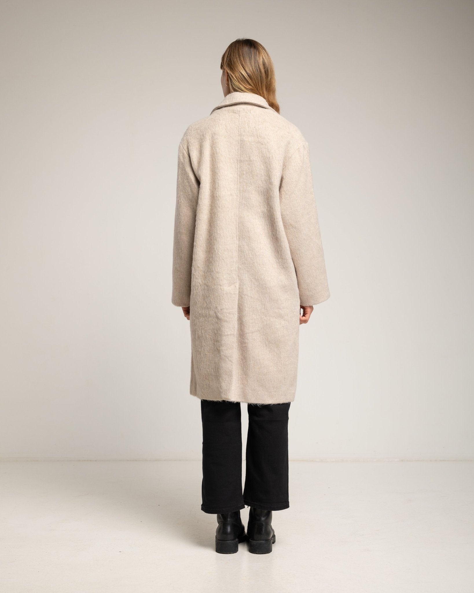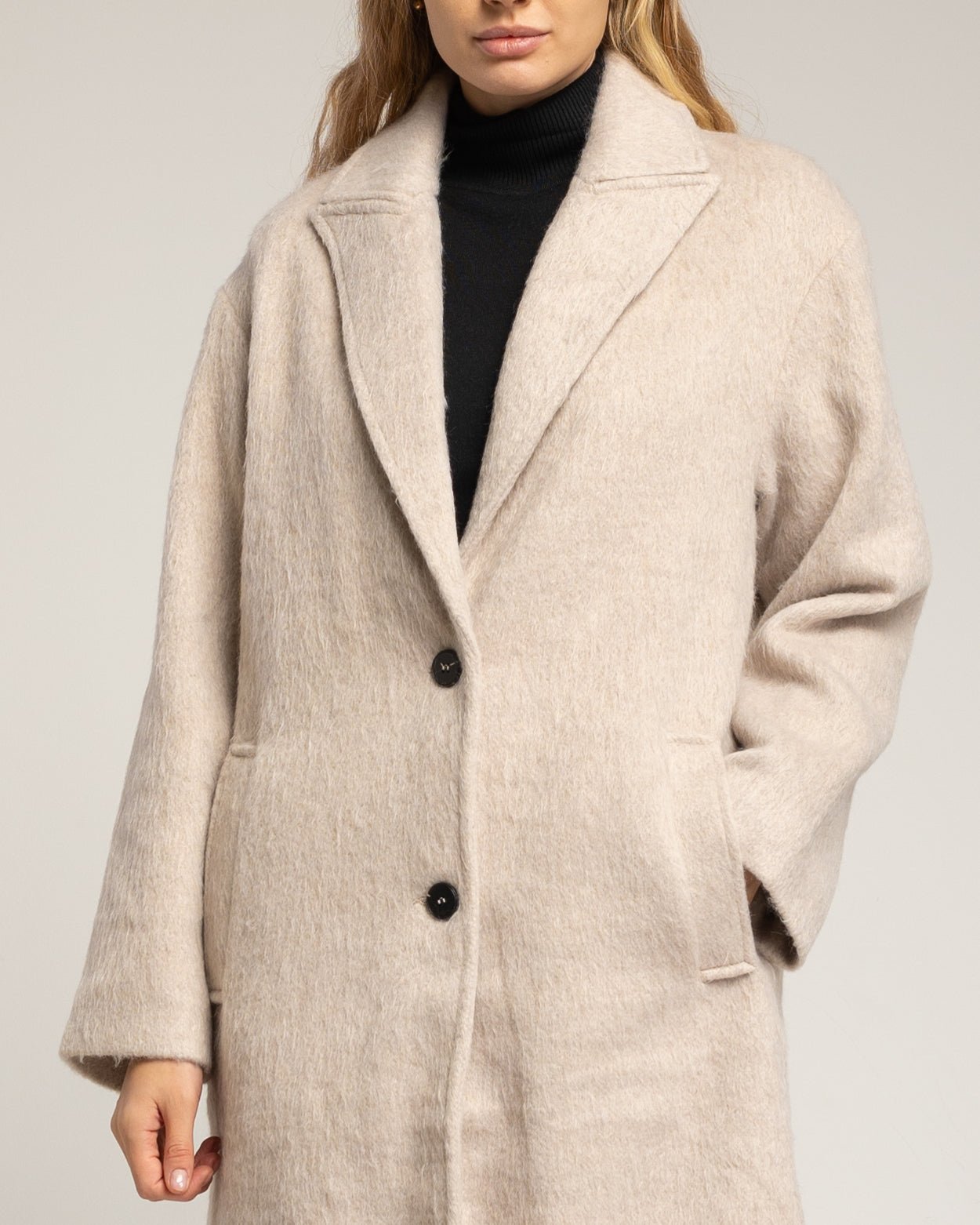 Abrigo con lana con solapas, cierre de boton. Ecru.