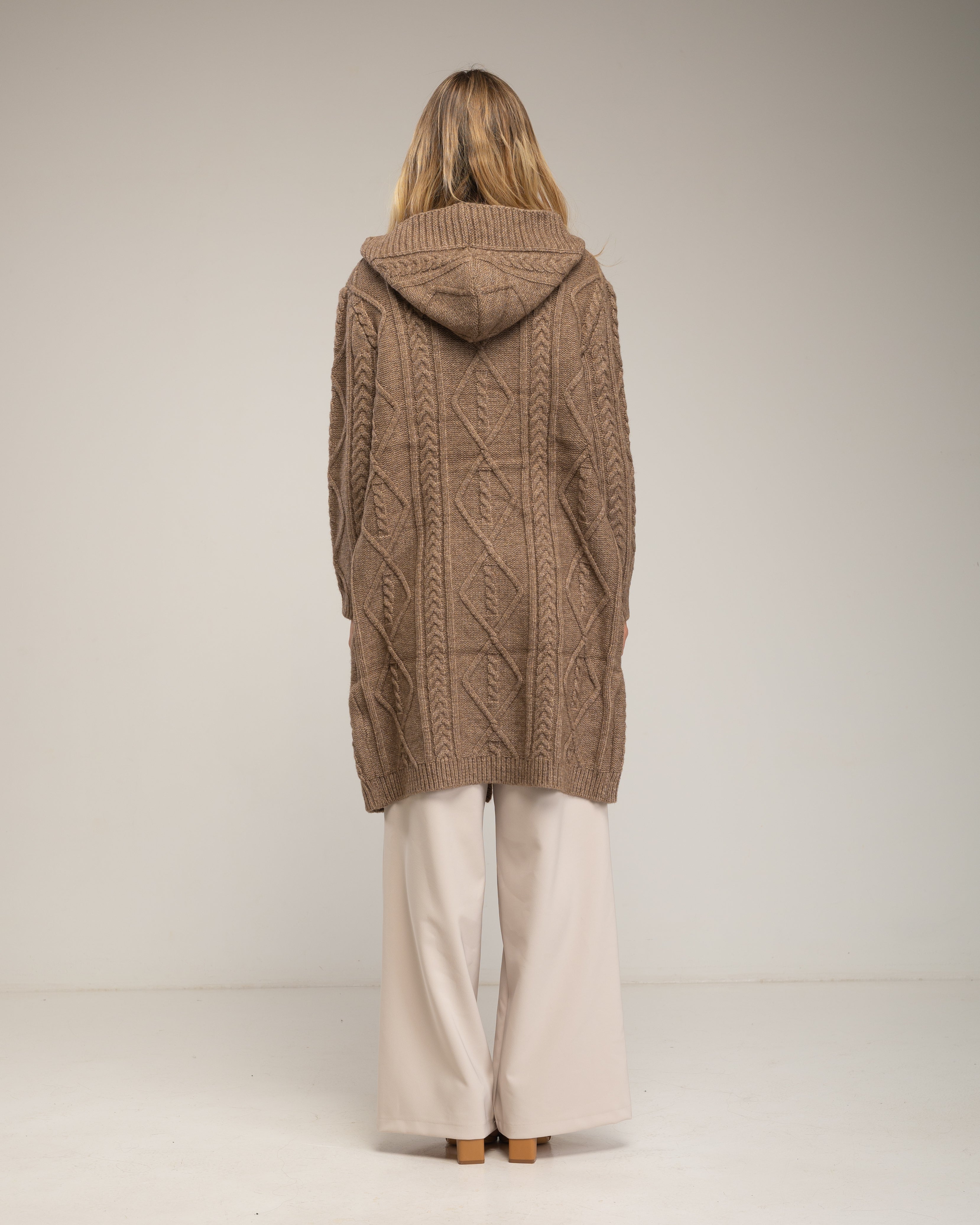 Abrigo de punto gordo, amplia con capucha, bolsillos y botones grandes.