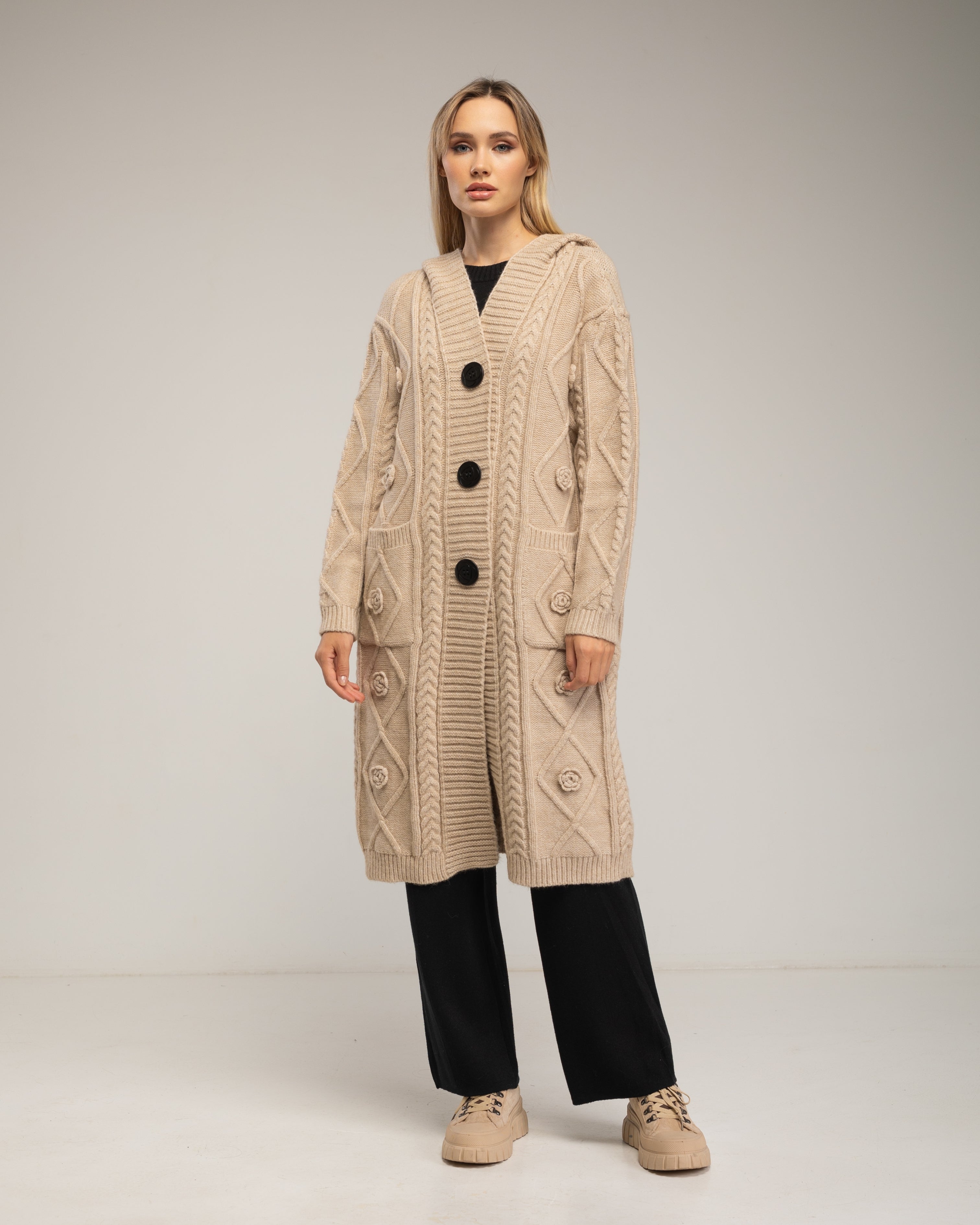 Detalles: punto grueso, dibujo de flor, capucha, bolsillos, botones grandes, diseño acogedor y con personalidad.