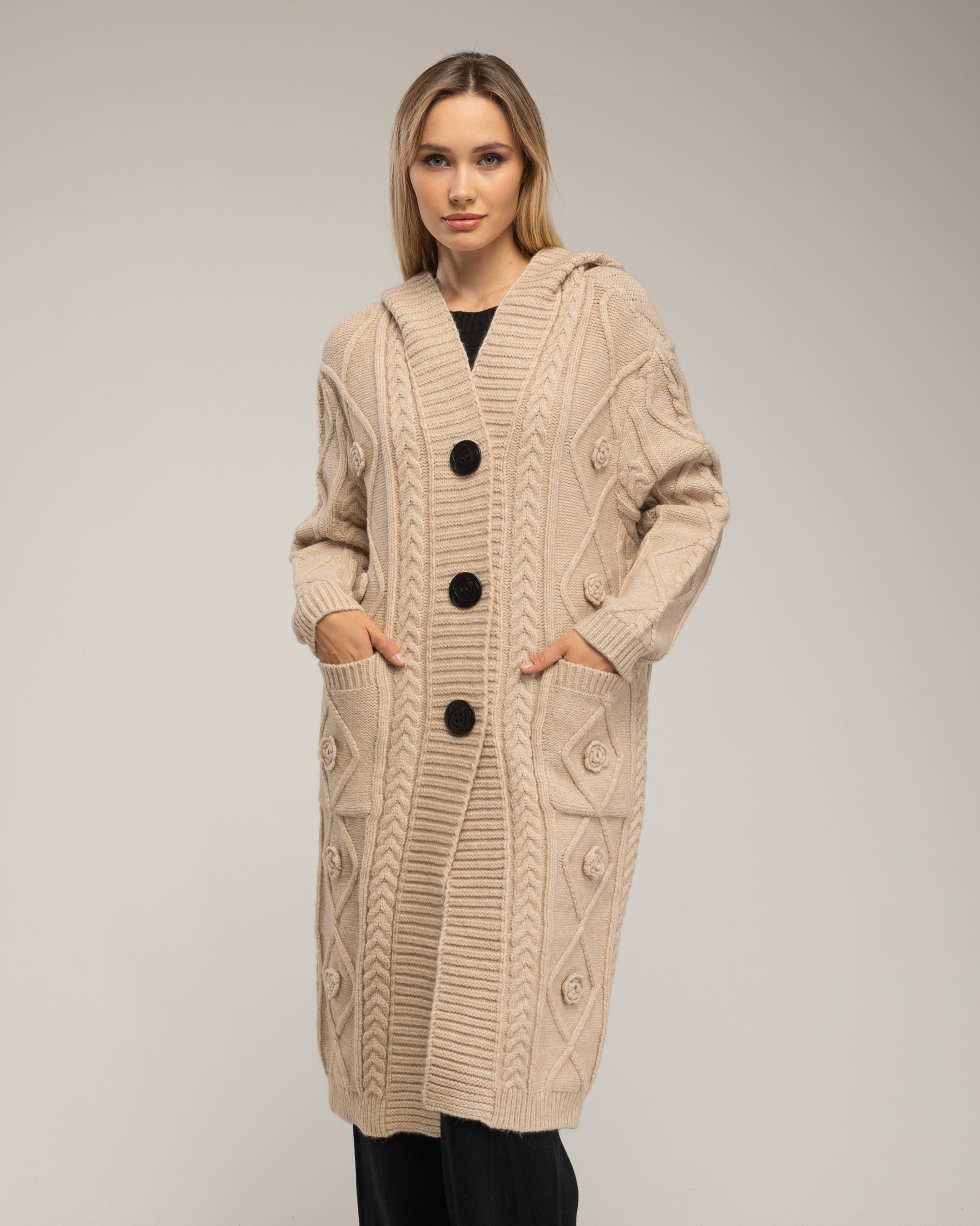 Este abrigo de punto grueso destaca por su calidez y diseño encantador, con un dibujo de flor que le da un toque distintivo. Su corte amplio, capucha, bolsillos y botones grandes lo hacen cómodo y funcional, ideal para looks casuales con estilo.