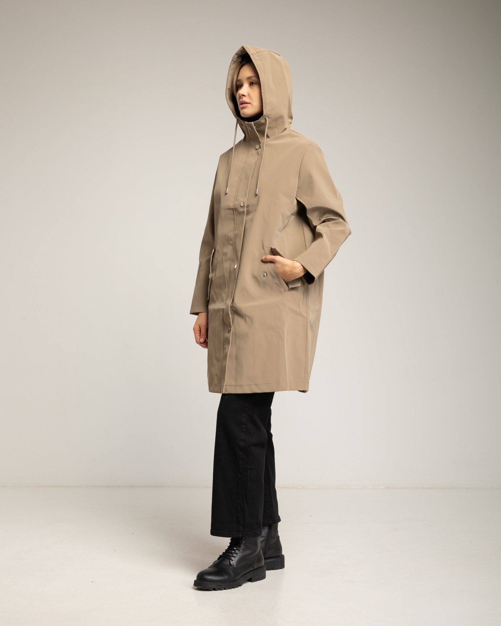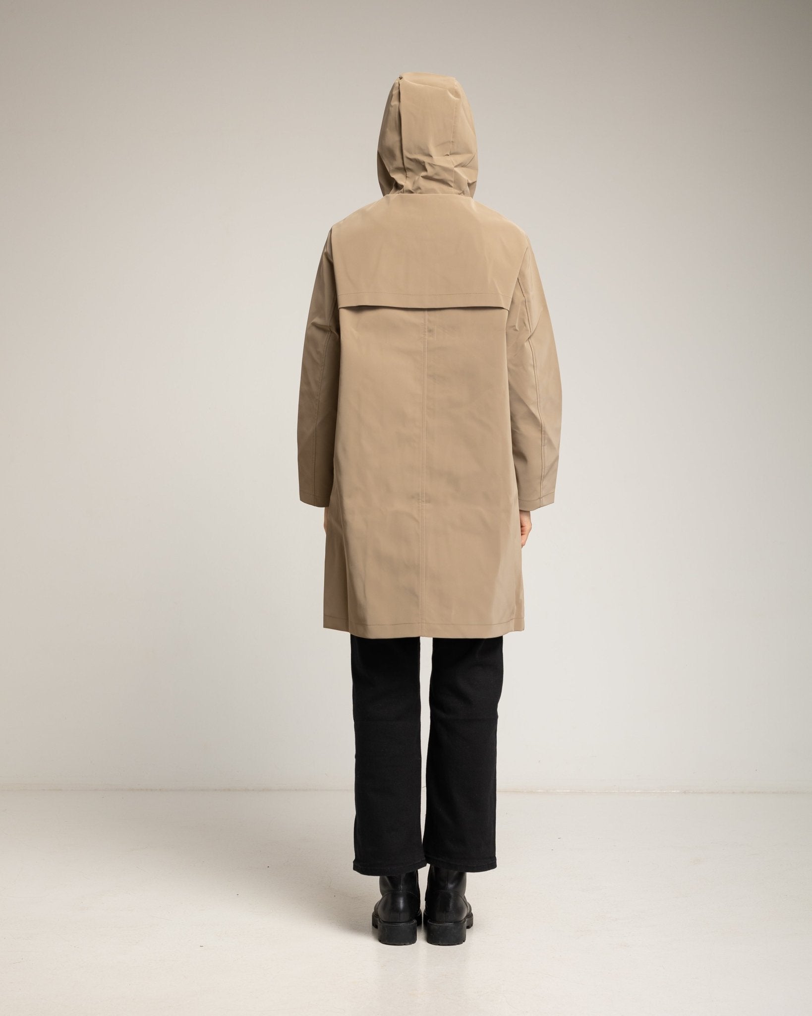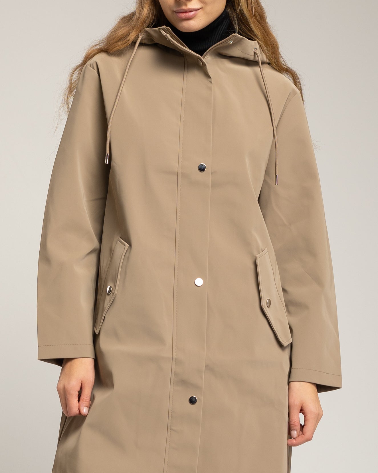 Abrigo impermeable con capucha y cierre de clip. Beige.