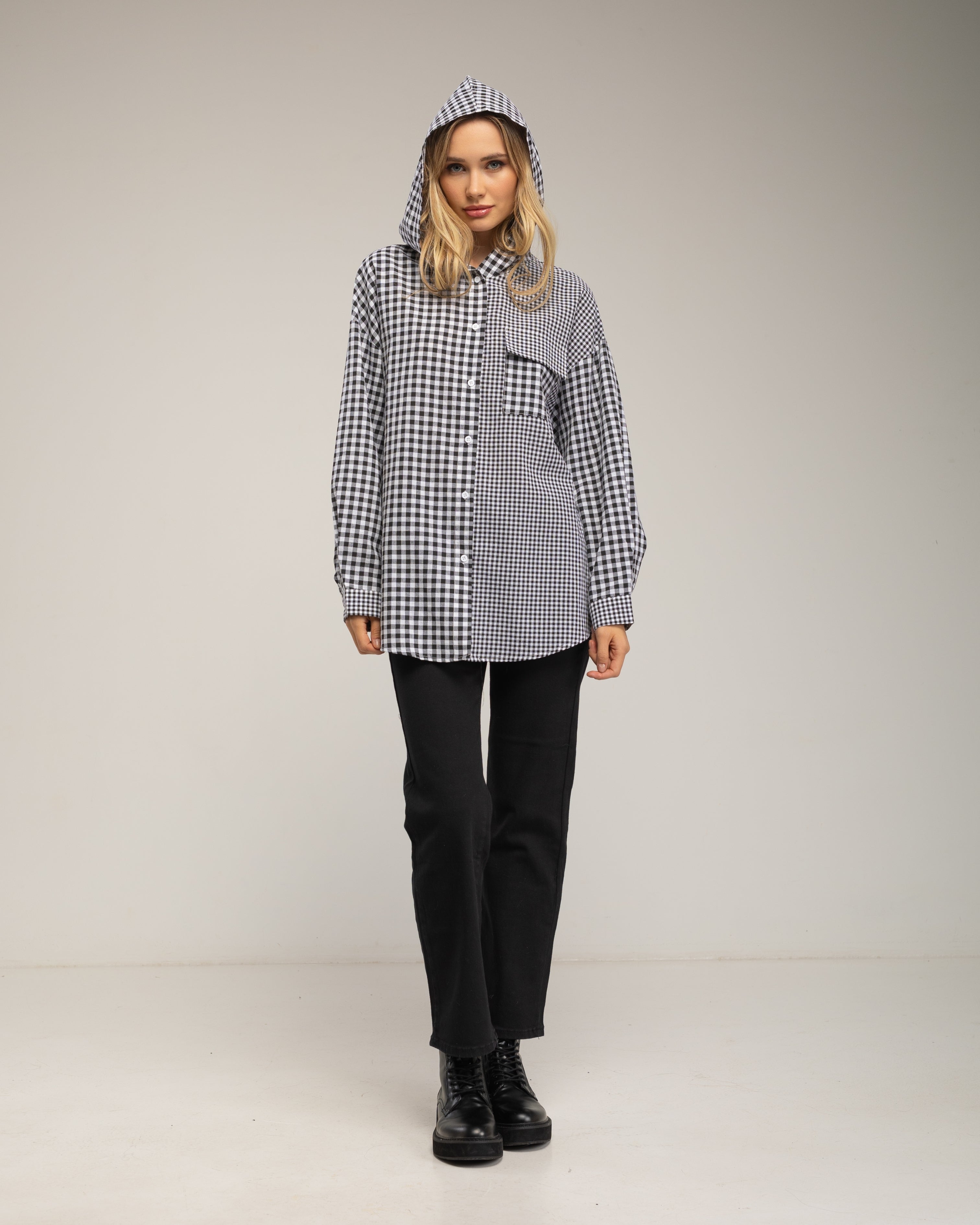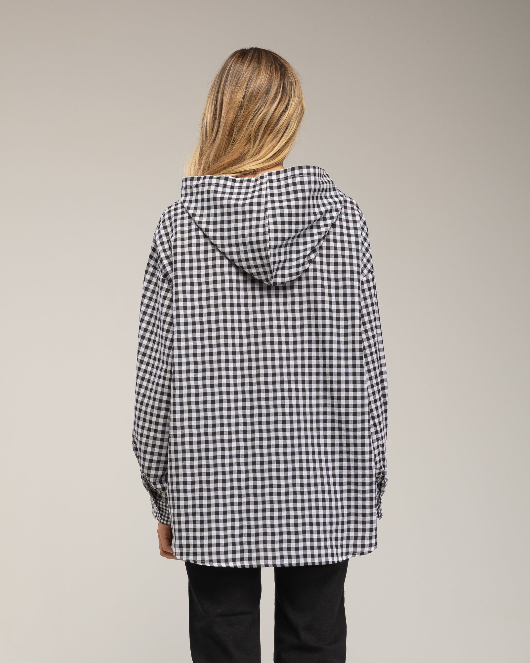 Camisa oversize de vichy con capucha y bolsillo.