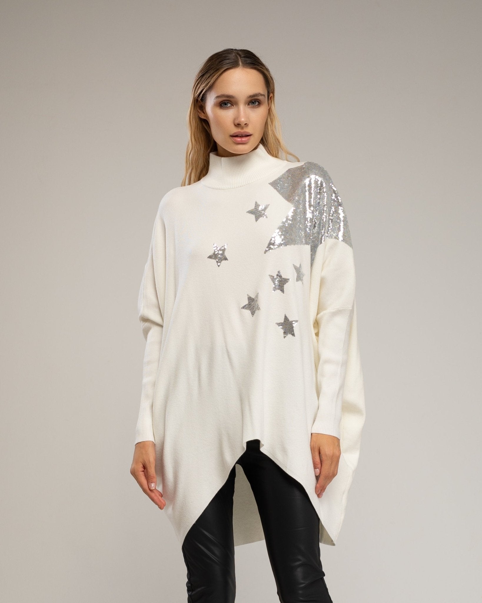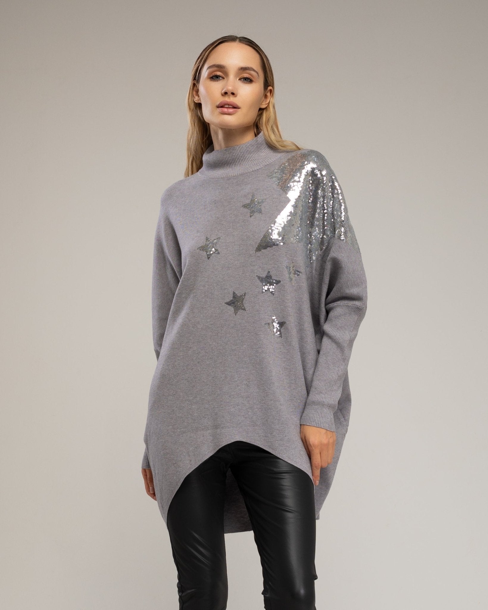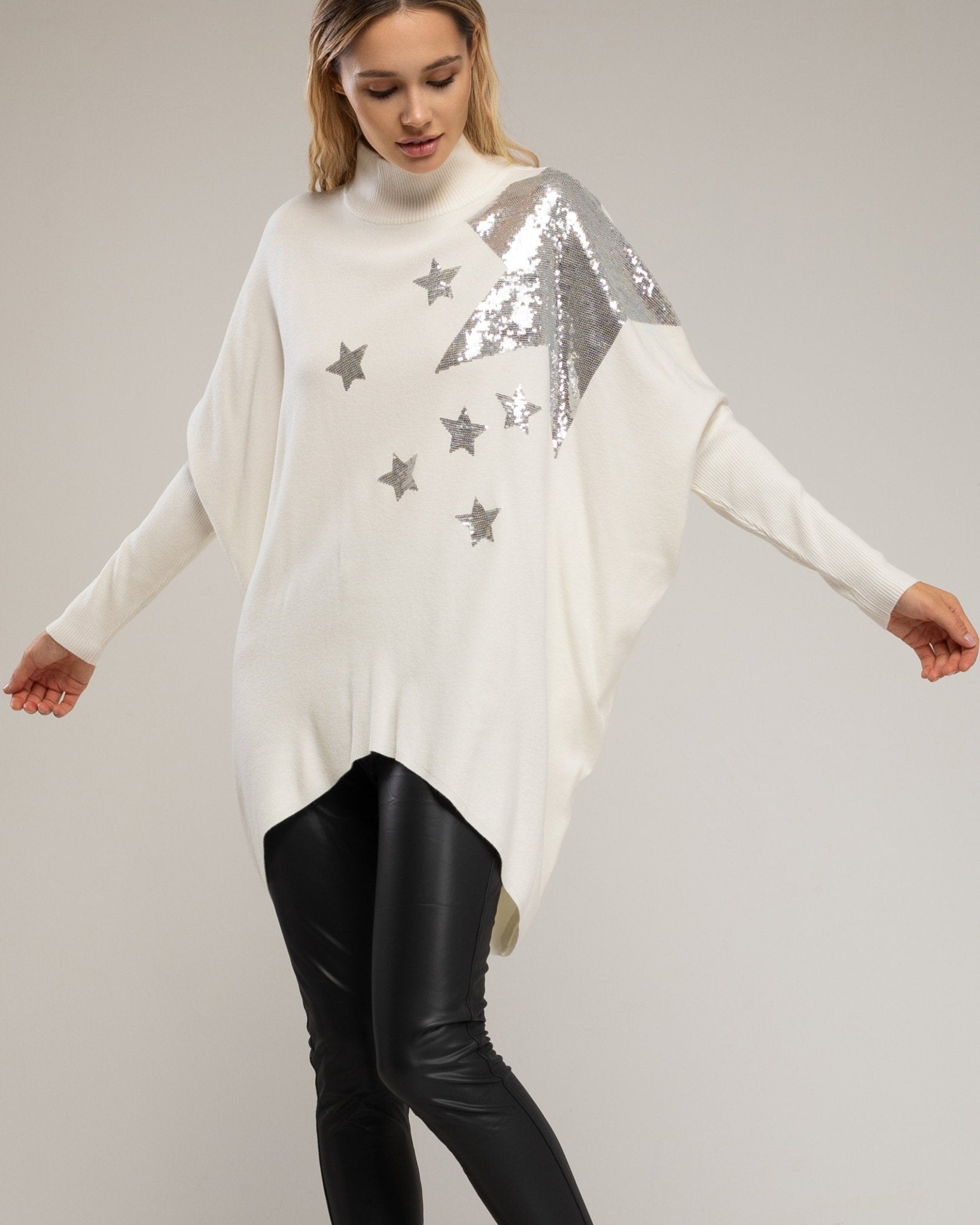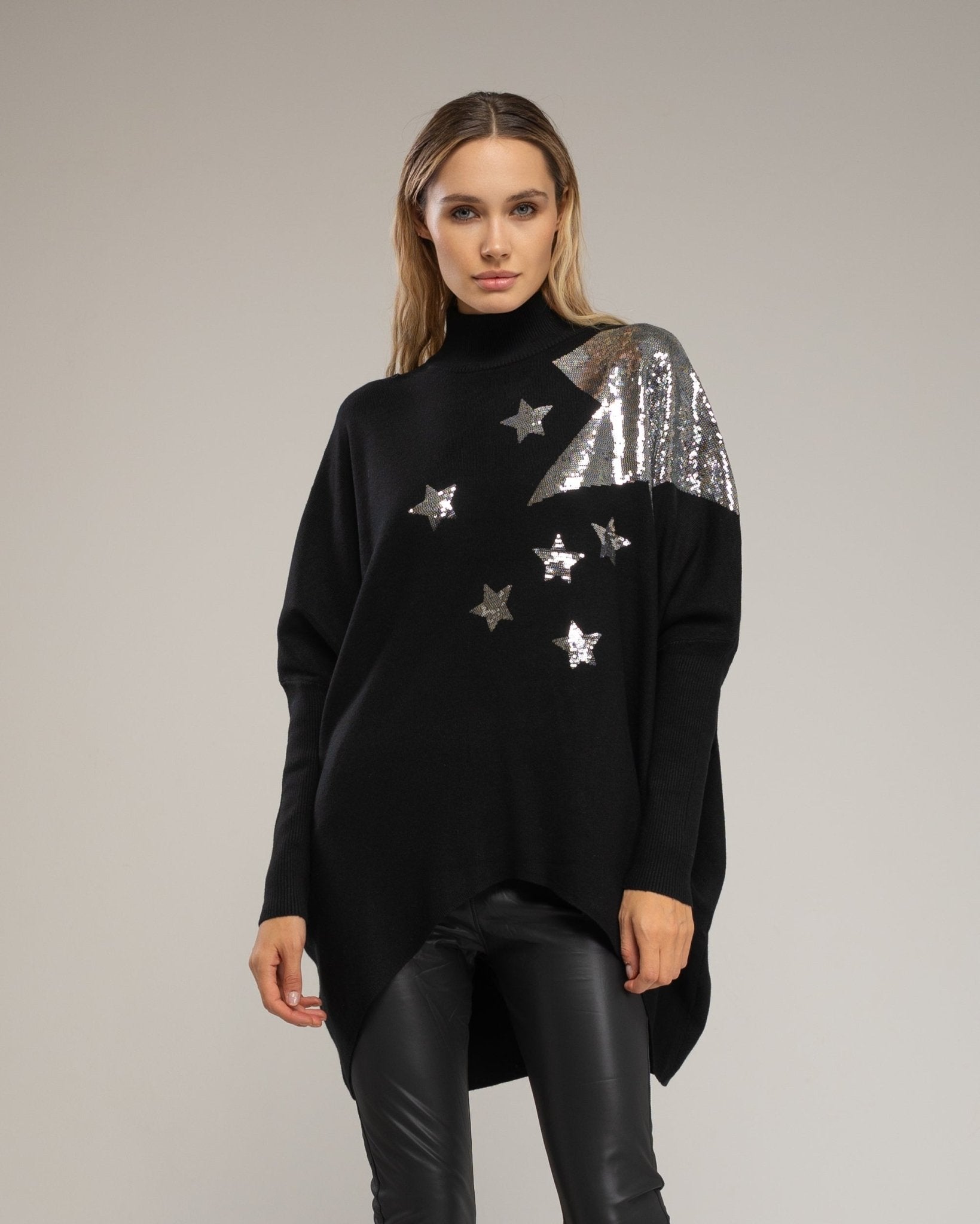 Jersey de punto fino amplio e irregular abajo, con estrellas de strass y cuello perkins