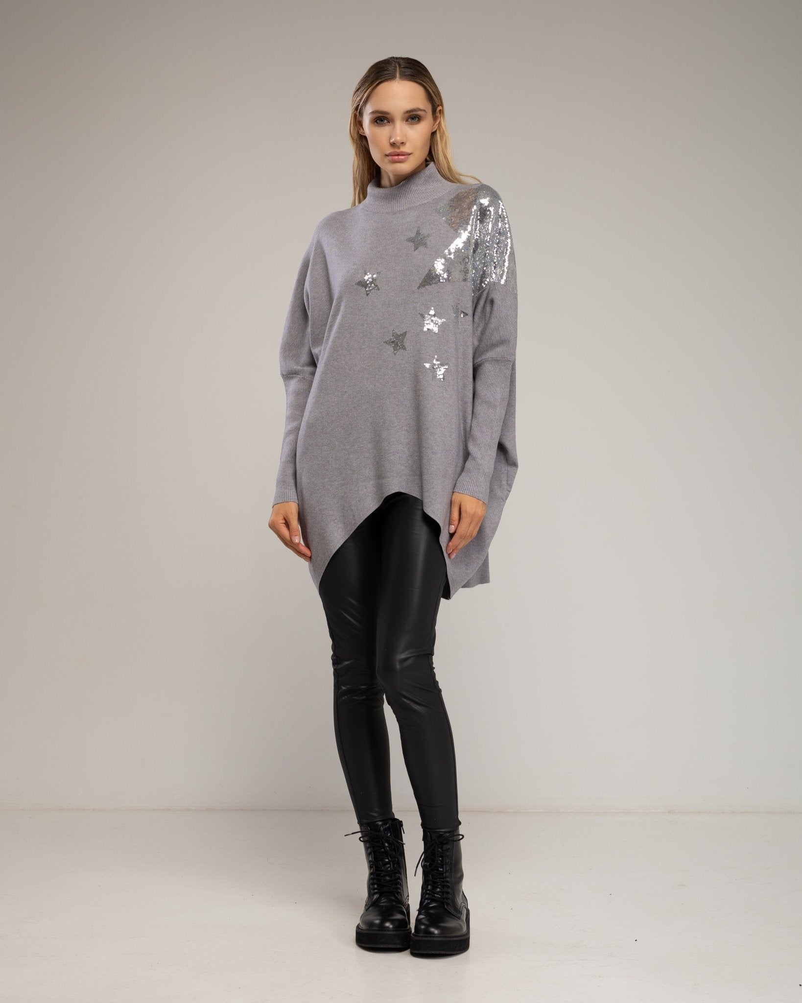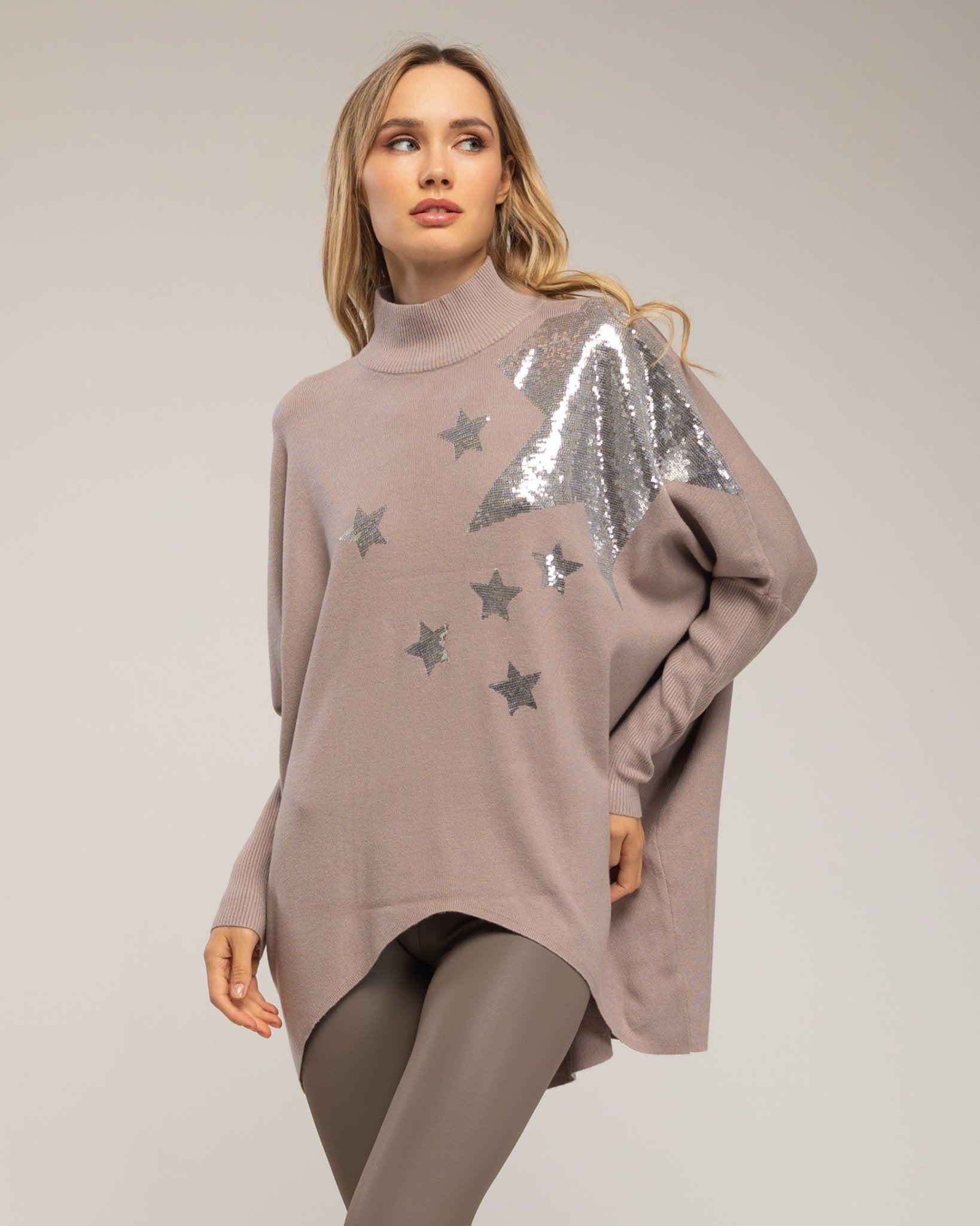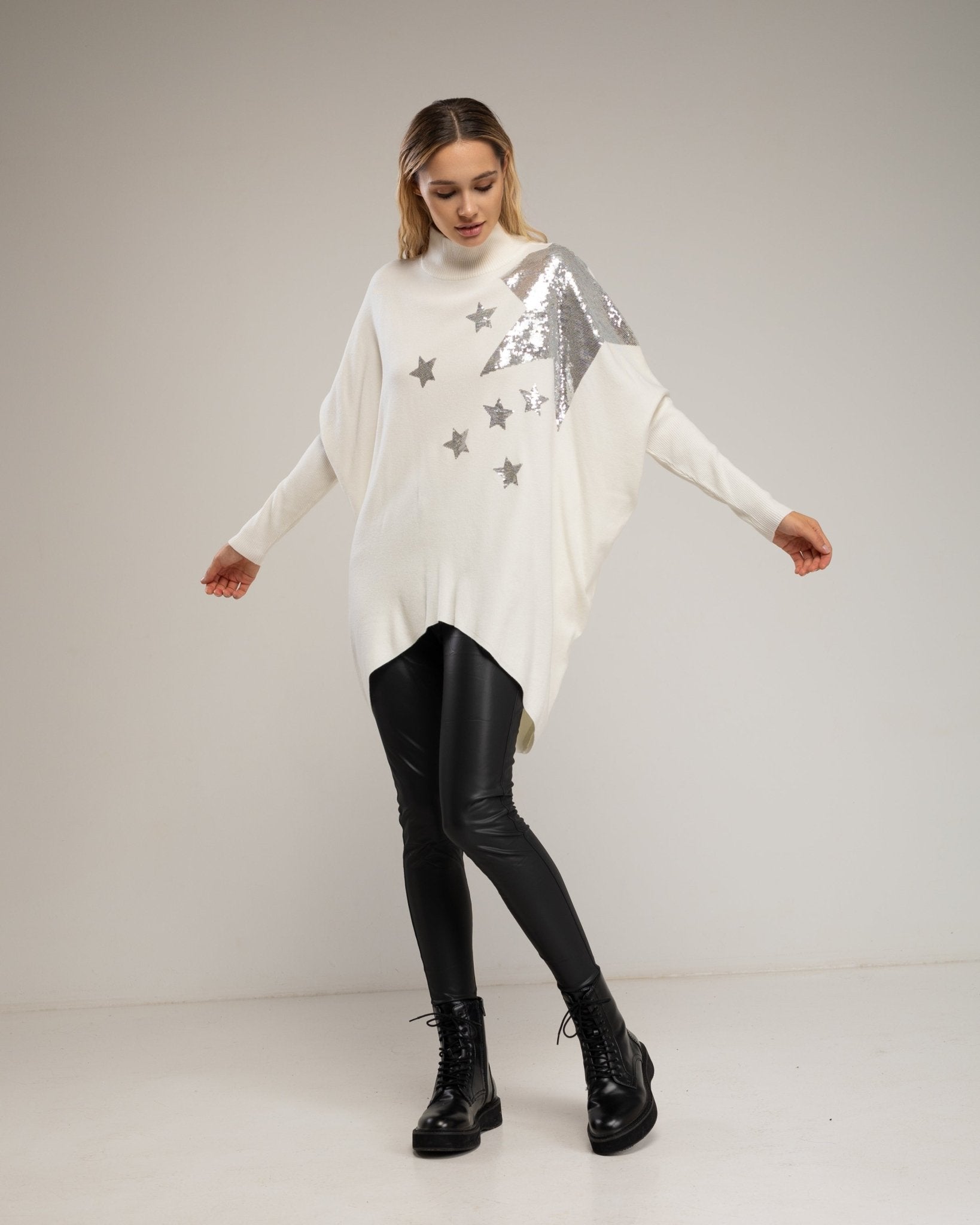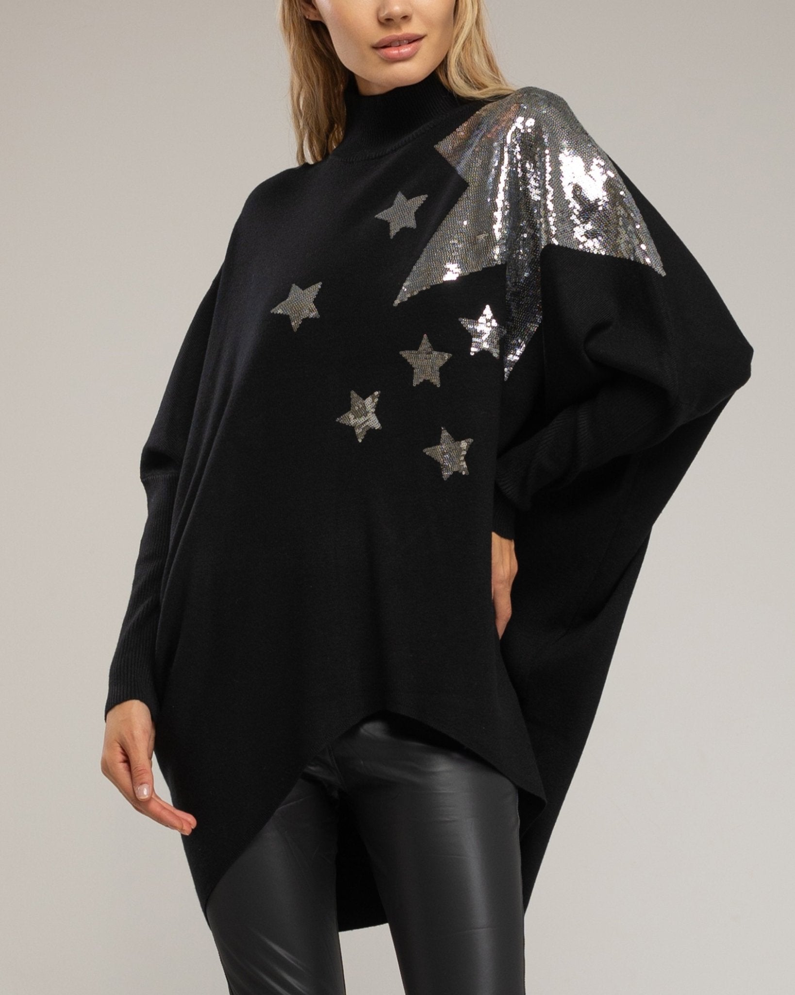 Jersey de punto fino amplio e irregular abajo, con estrellas de strass y cuello perkins
