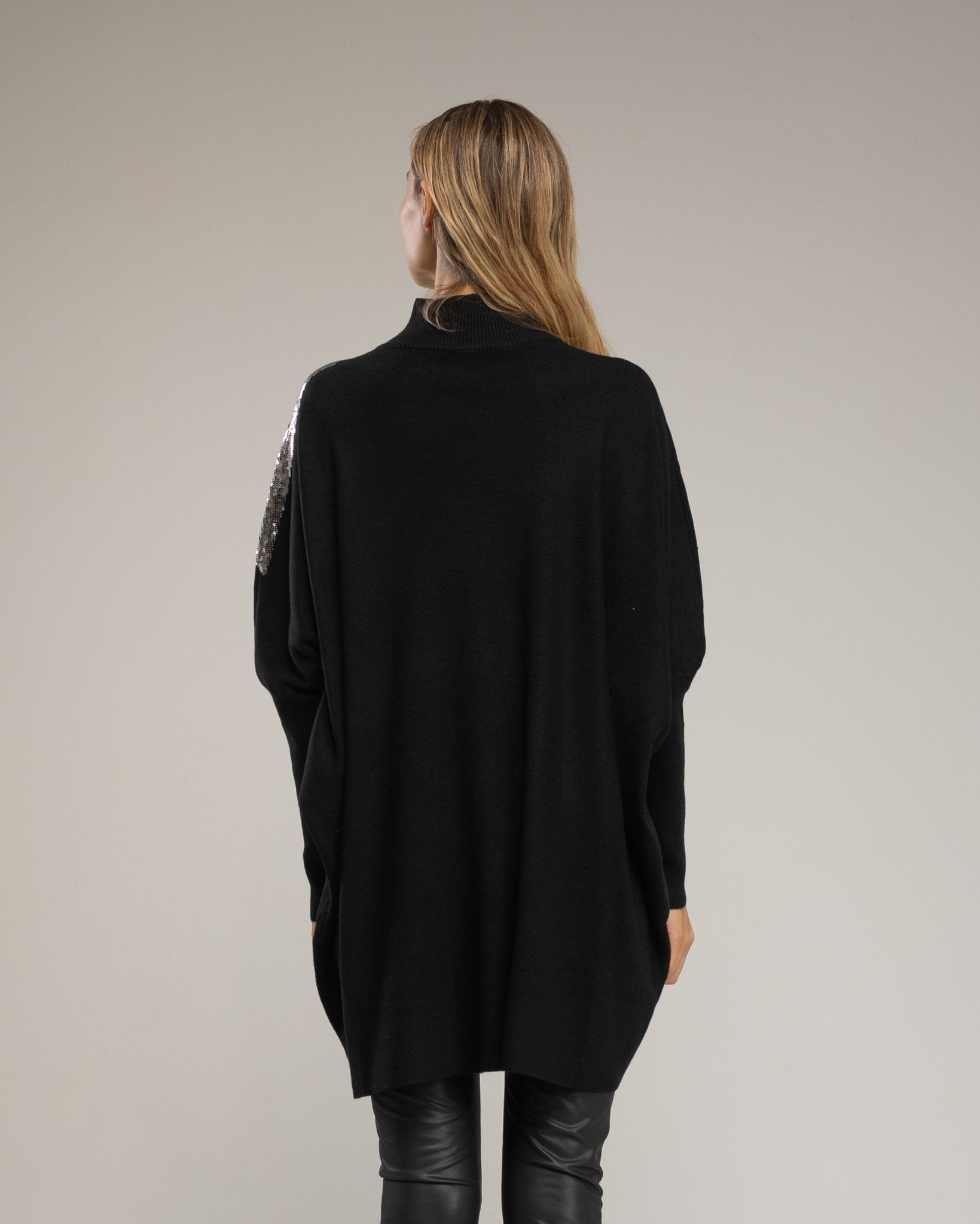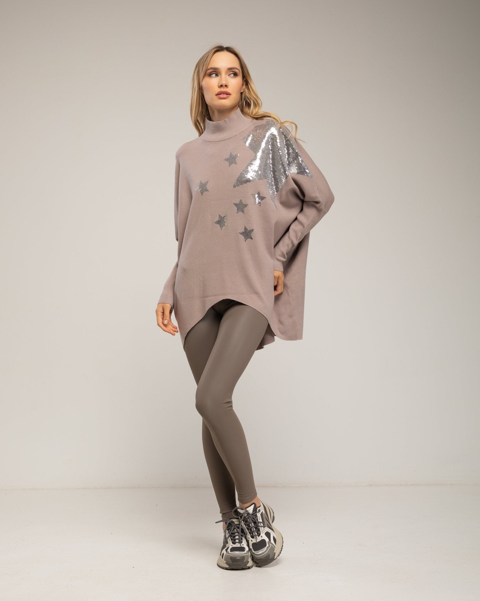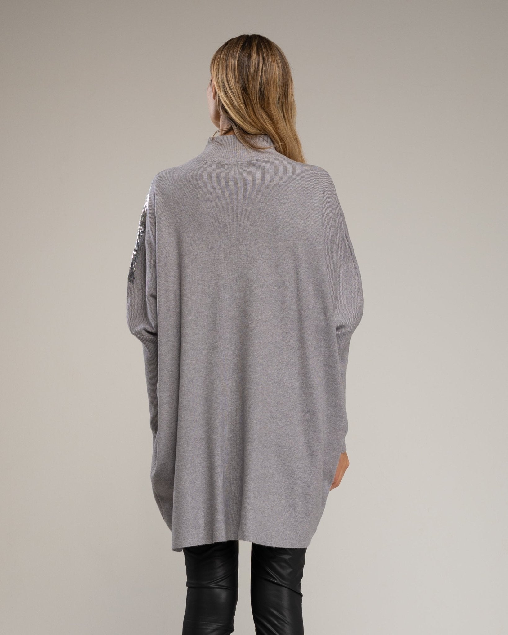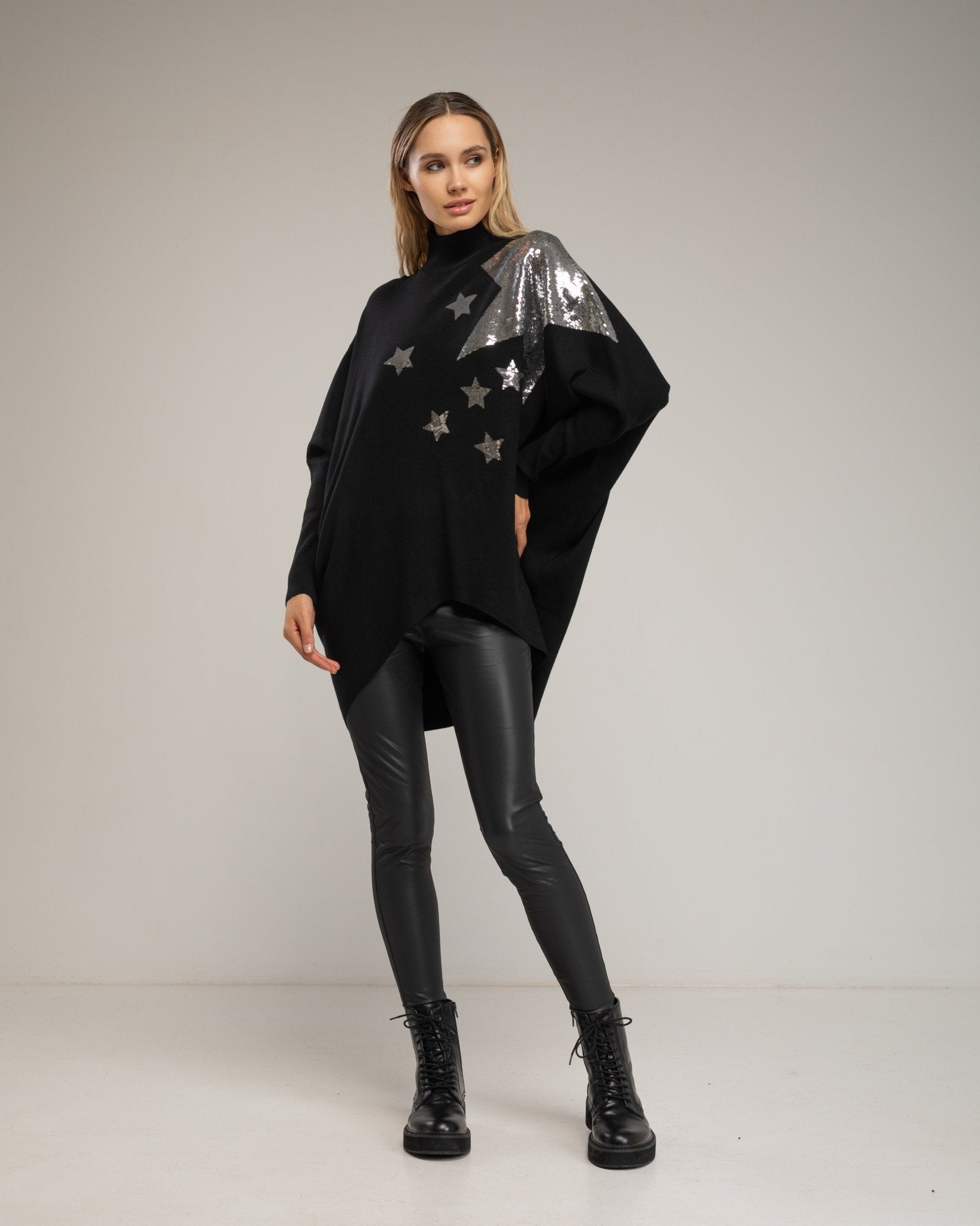 Jersey de punto fino amplio e irregular abajo, con estrellas de strass y cuello perkins