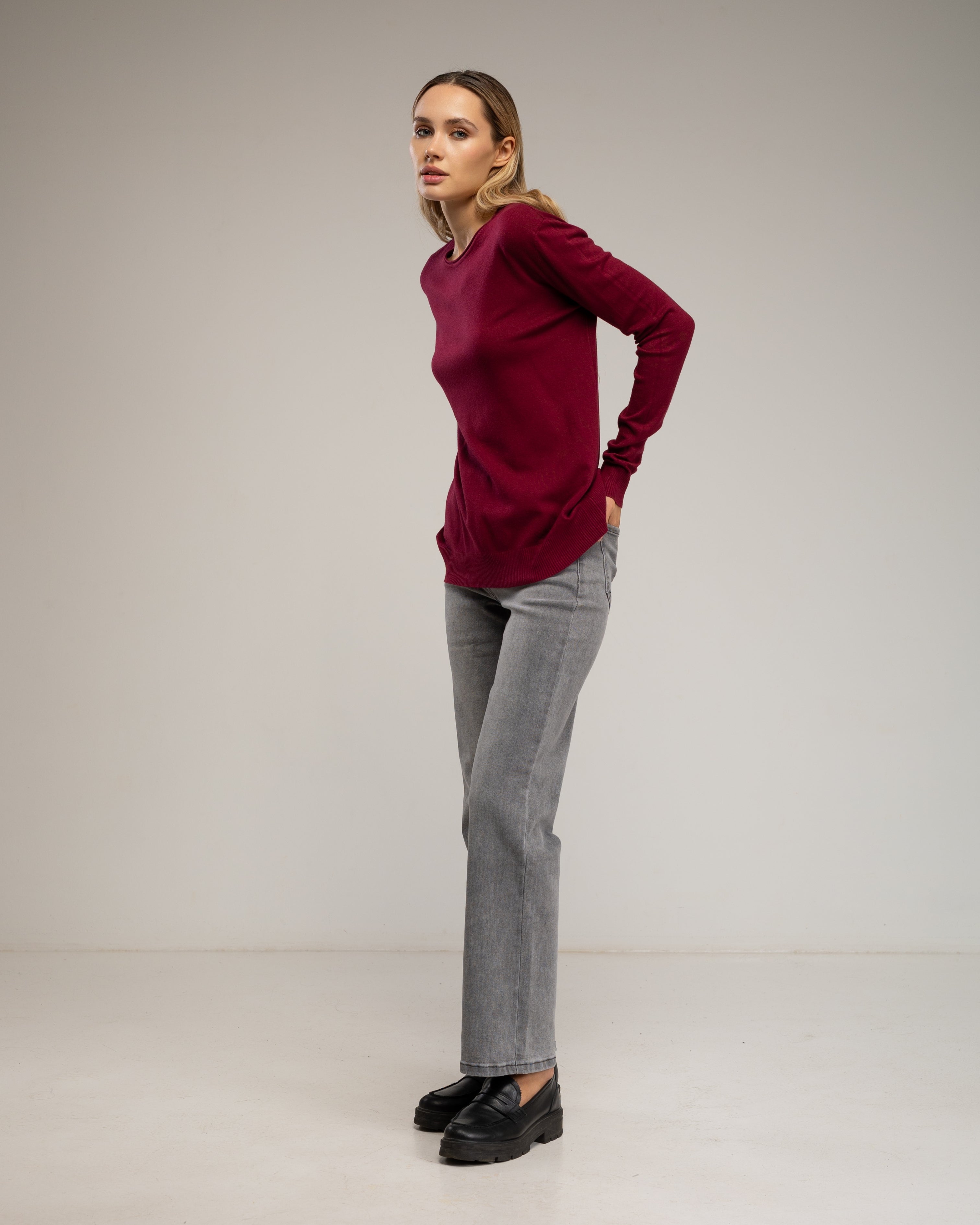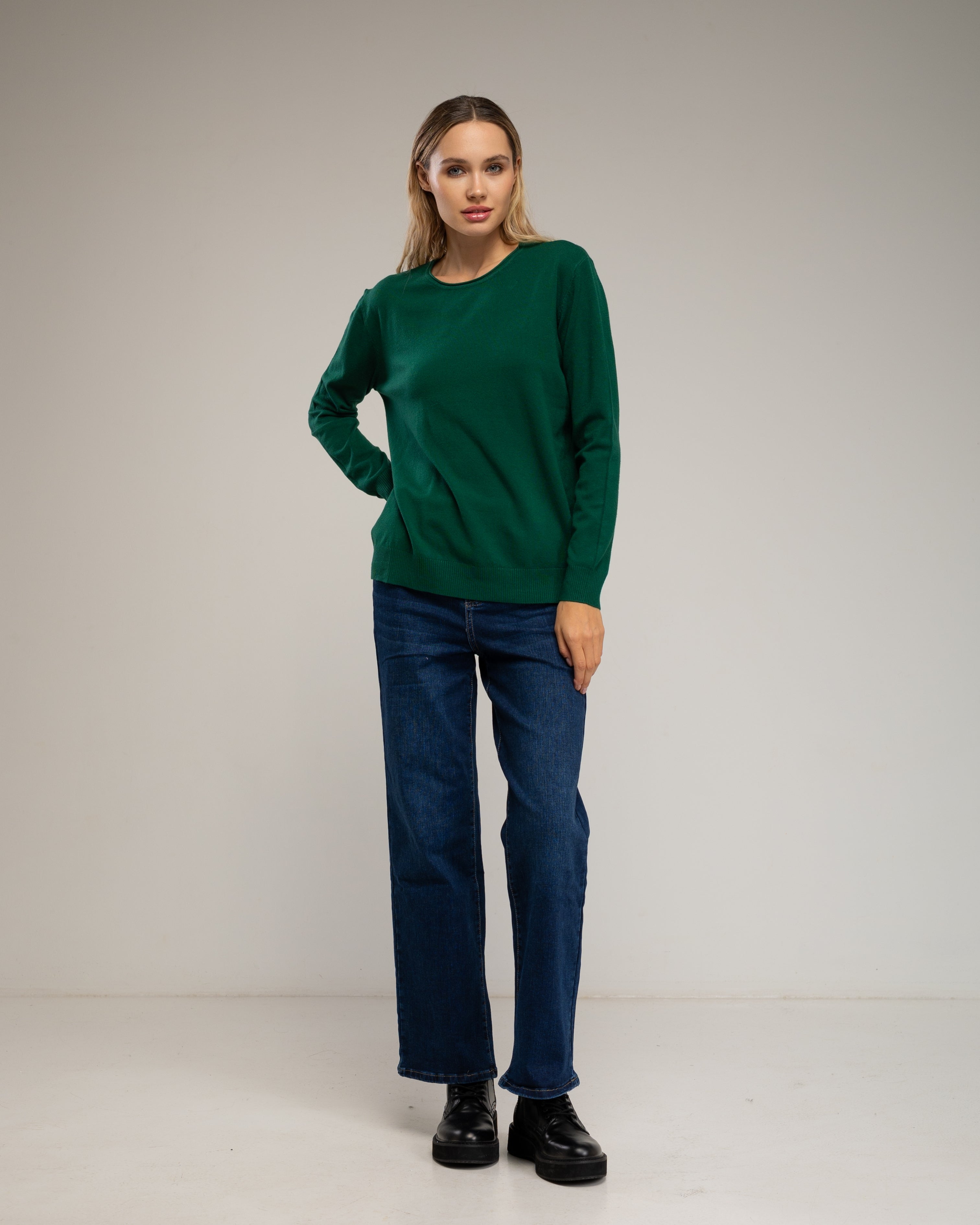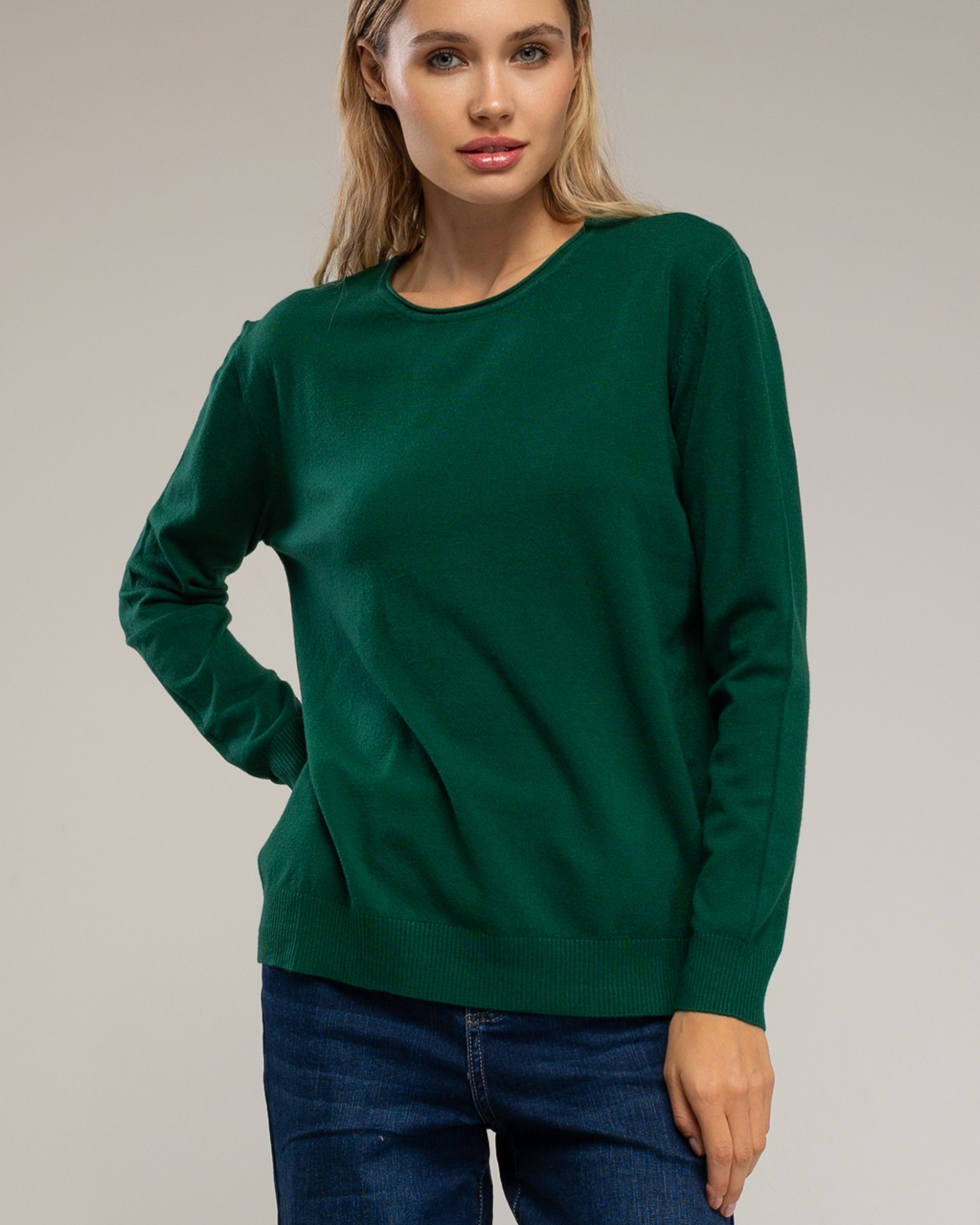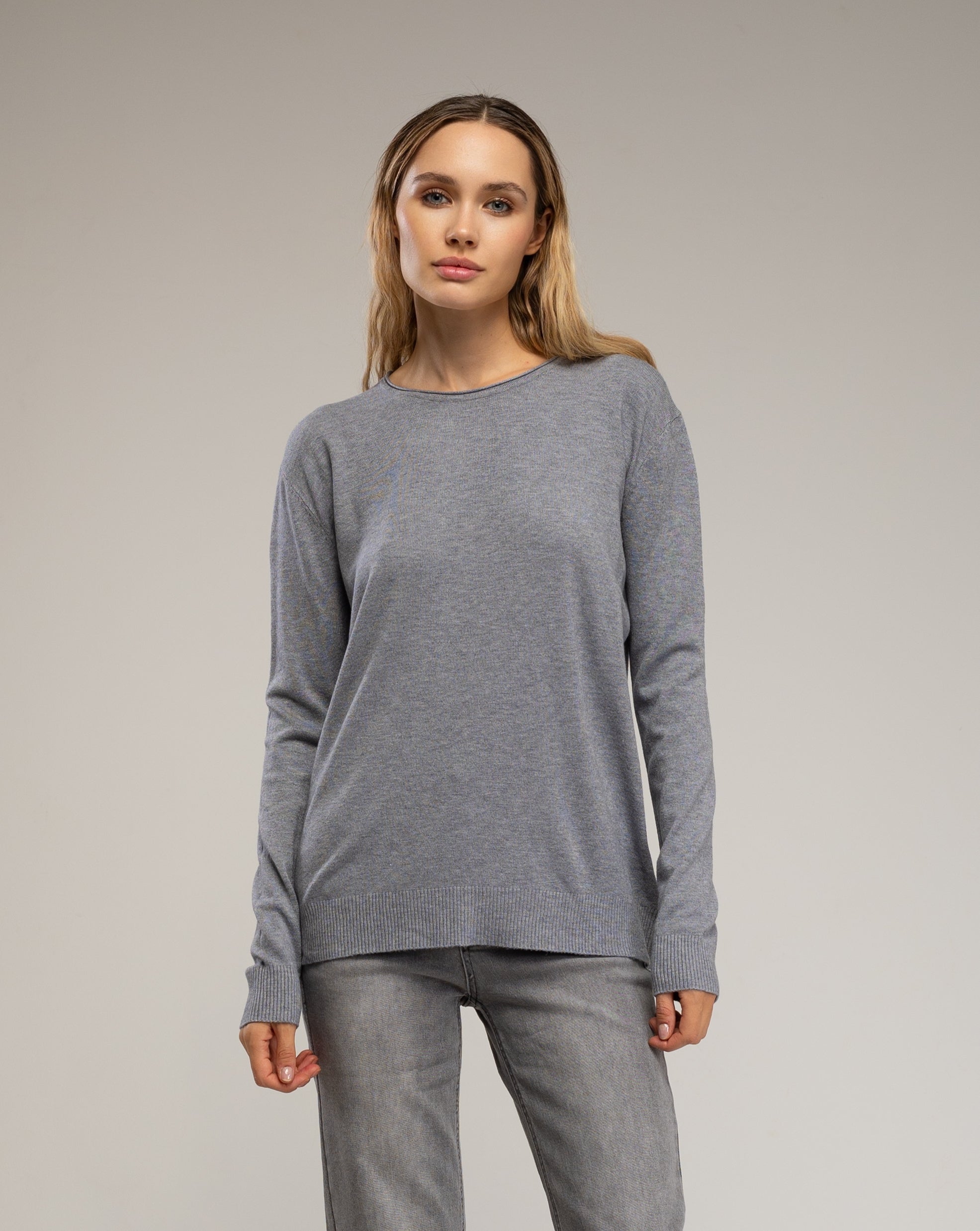 Este jersey de punto fino básico con cuello redondo es una prenda esencial para el día a día. Su tejido suave, ligero y elástico ofrece una gran comodidad y un ajuste favorecedor, ideal para combinar con cualquier estilo, desde looks casuales hasta más formales.