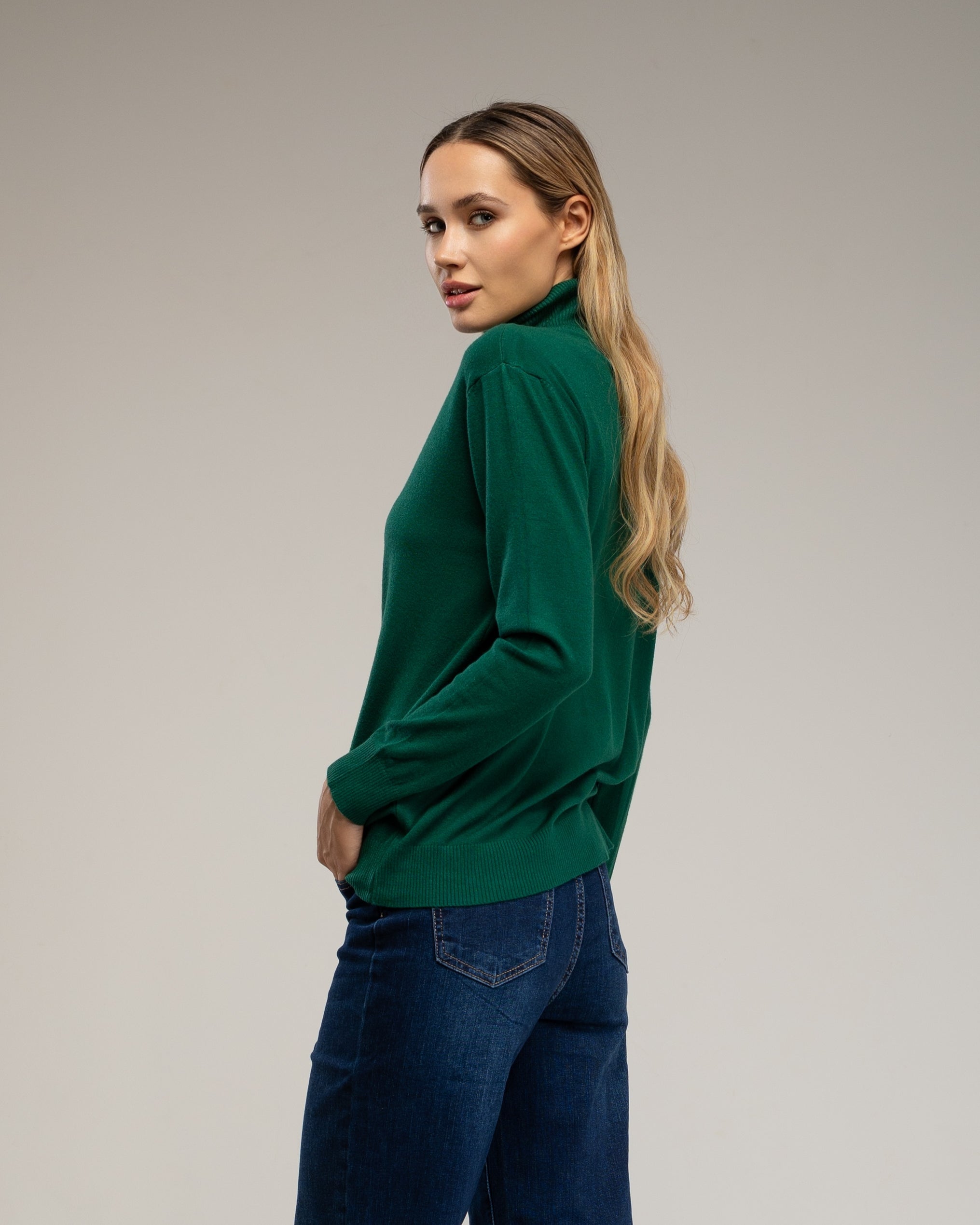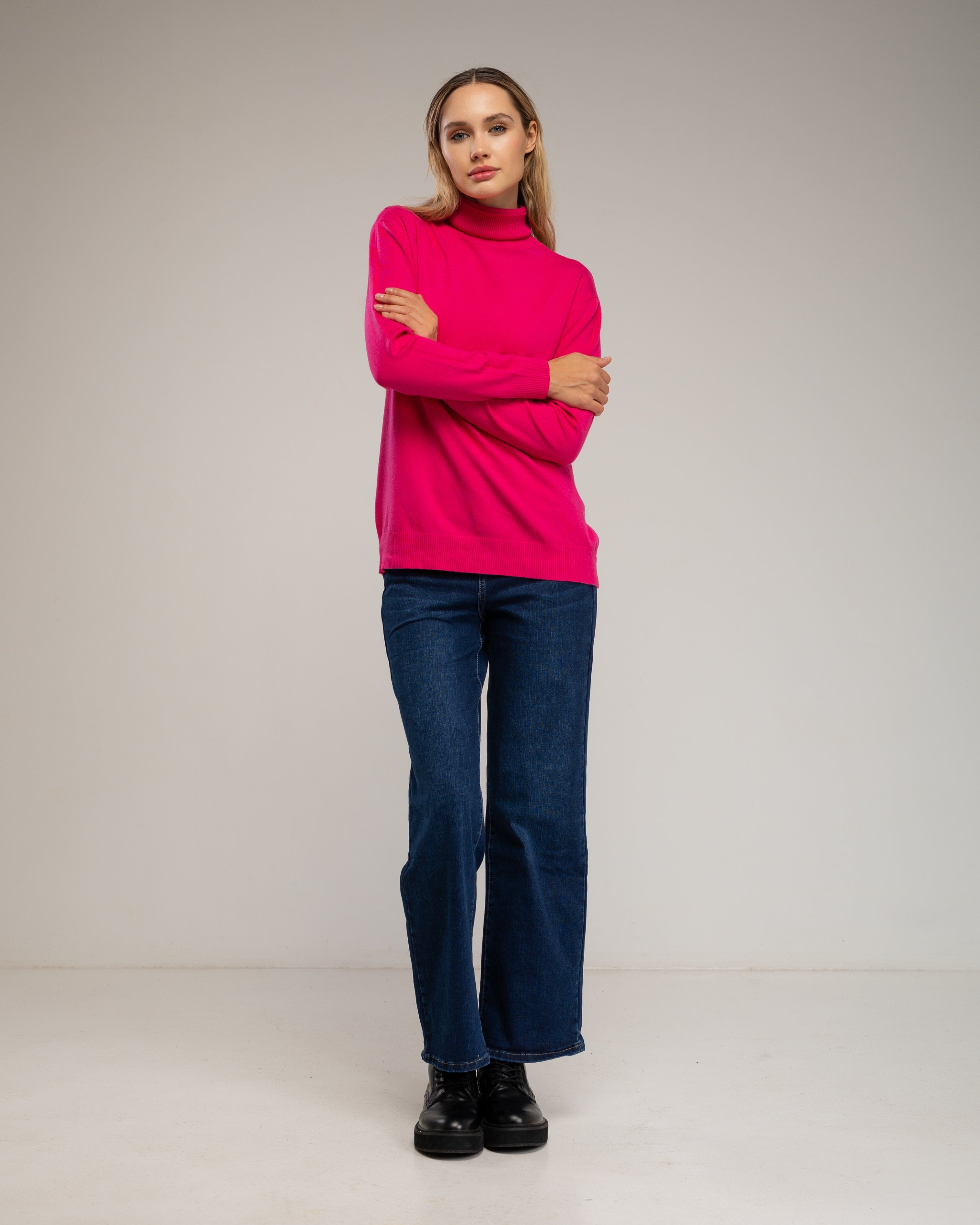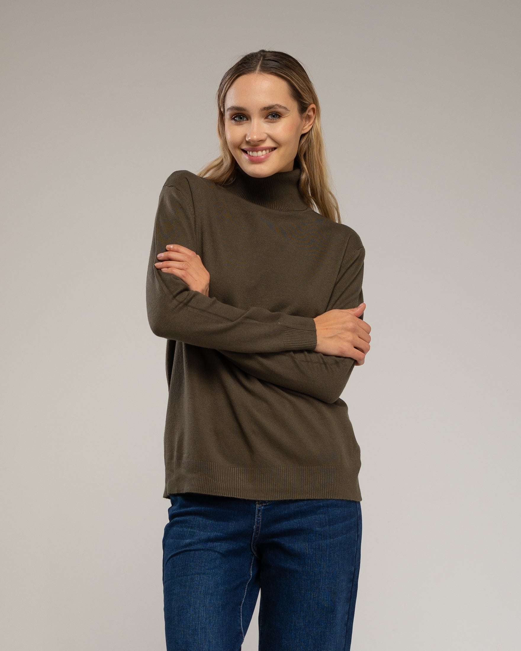 Este jersey de punto fino básico con cuello vuelto es un clásico atemporal que combina confort y estilo. Su tejido suave y elástico se adapta al cuerpo, aportando calidez sin renunciar a la elegancia. Ideal para llevar solo o como capa base en los meses más fríos.