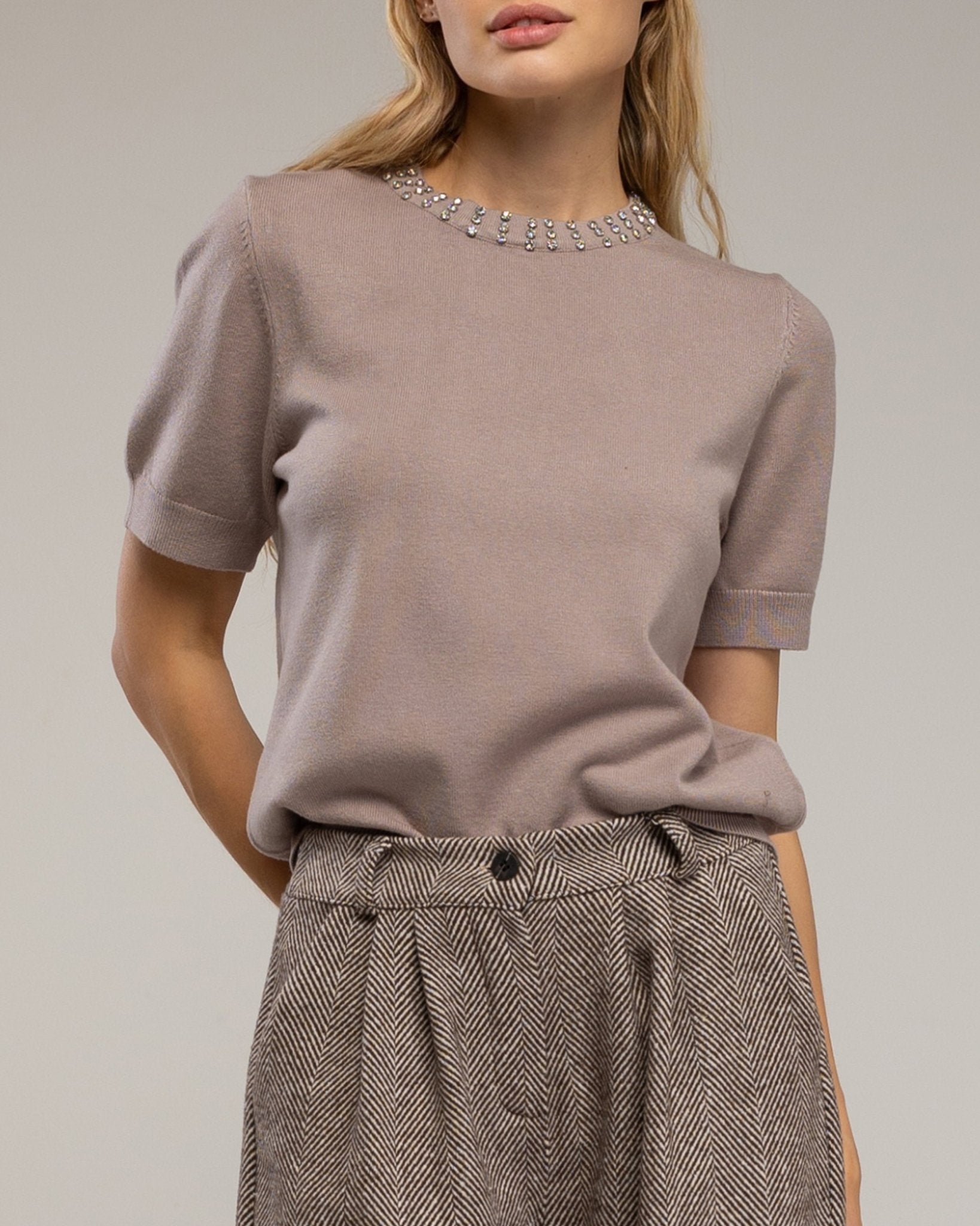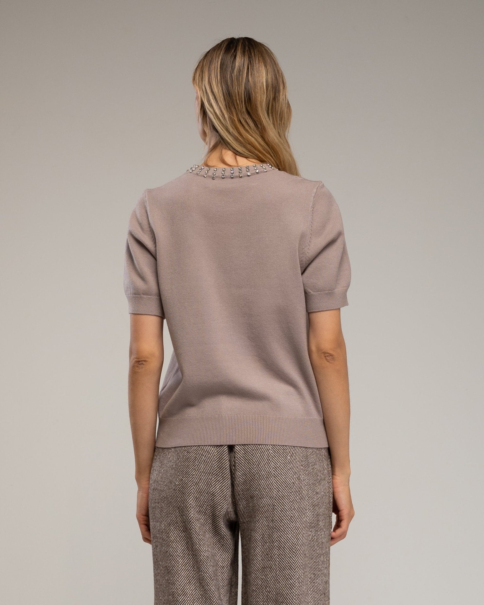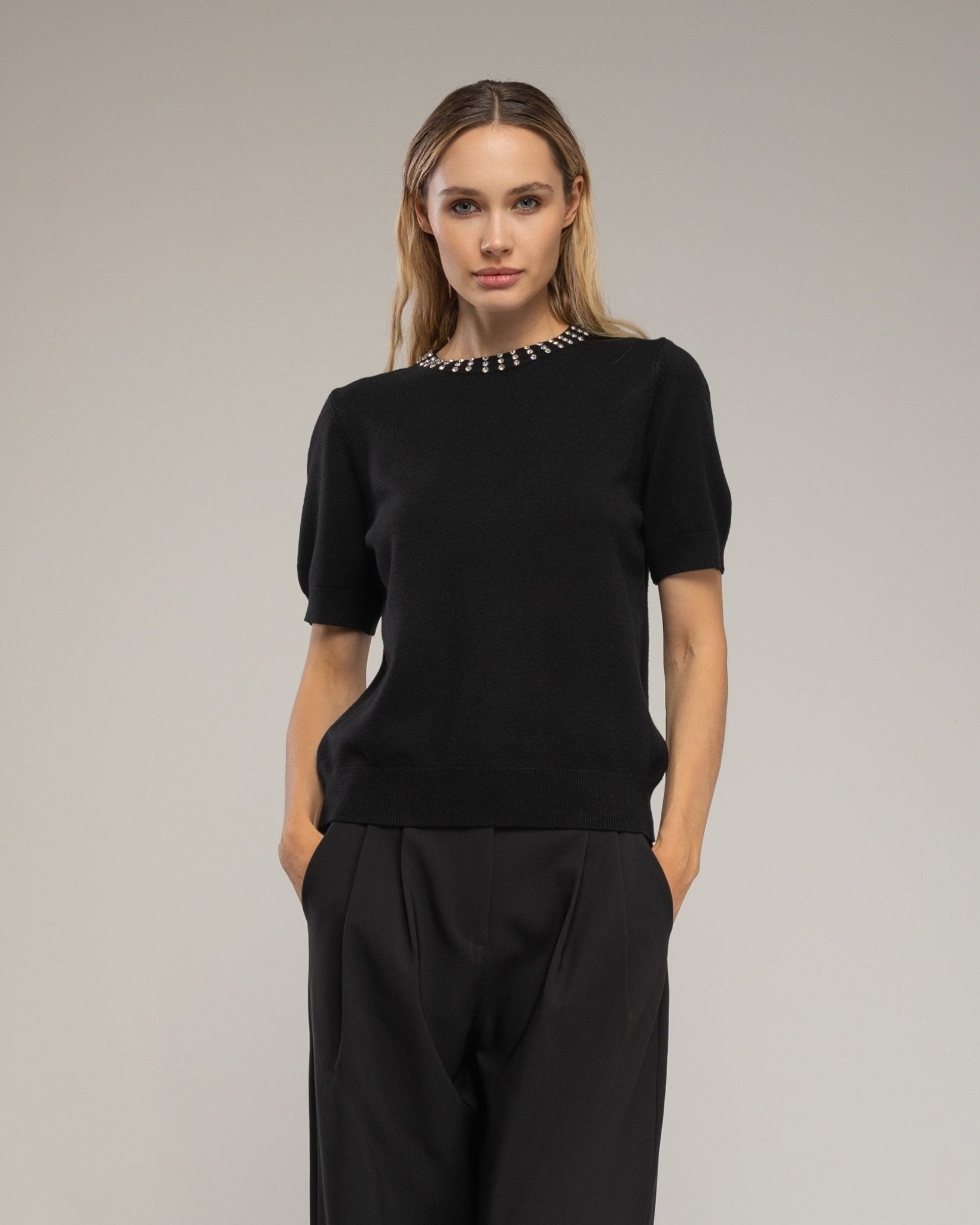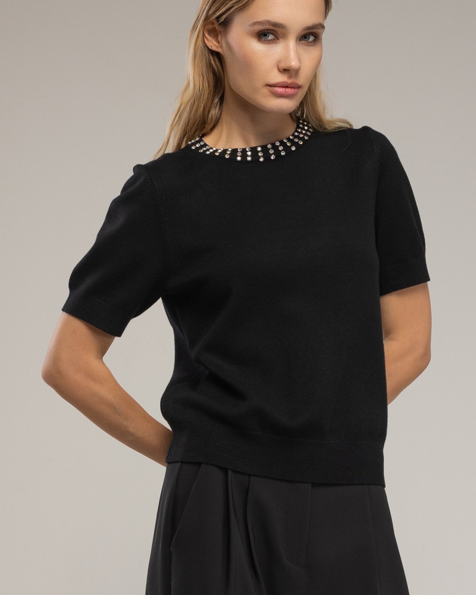 Jersey de punto fino con detalles de piedras de strass en el cuello.