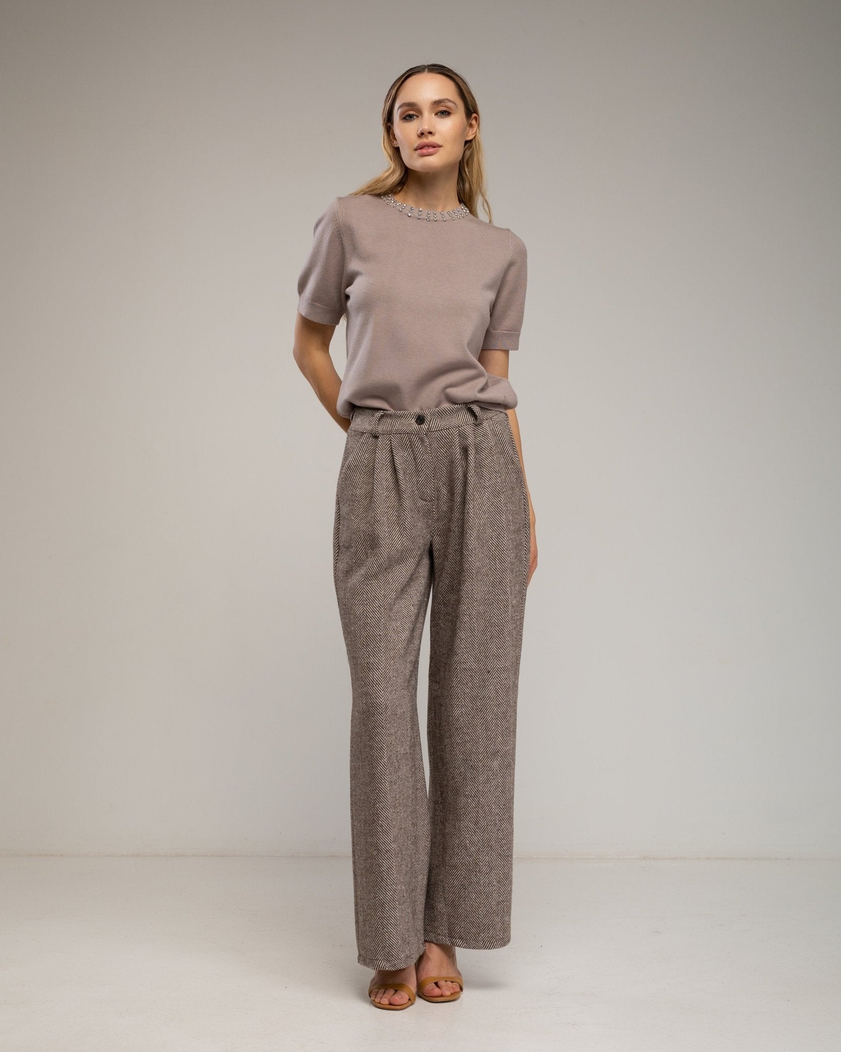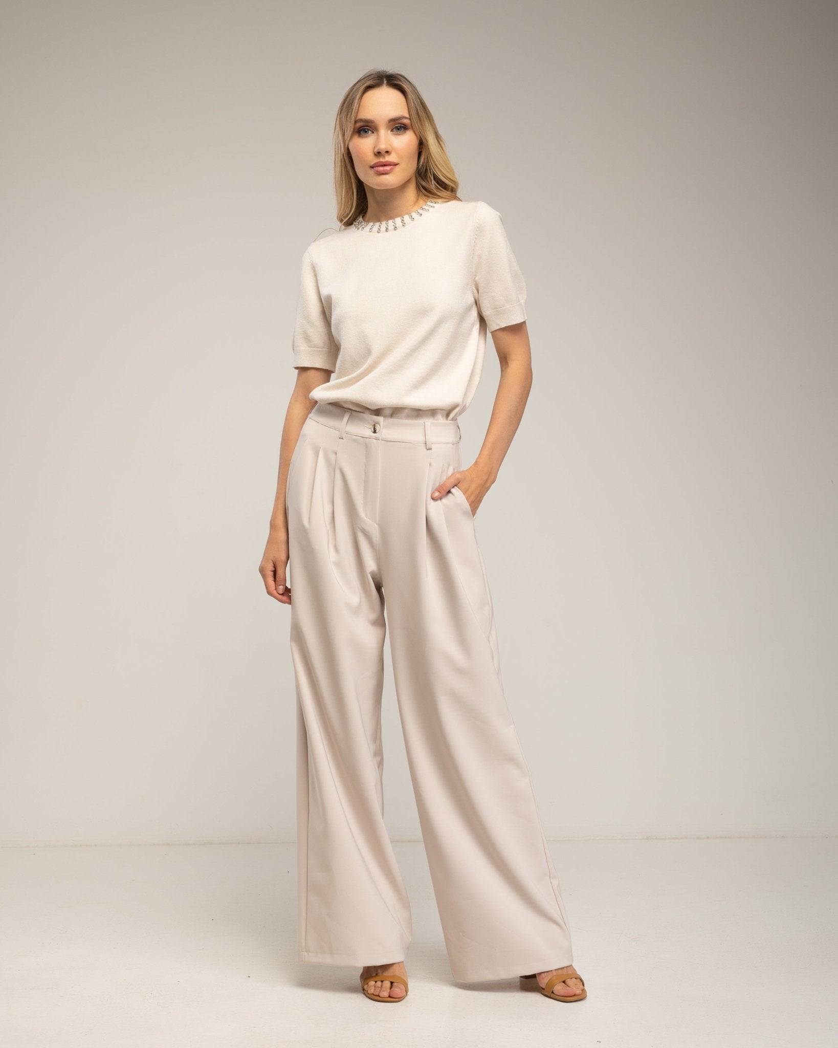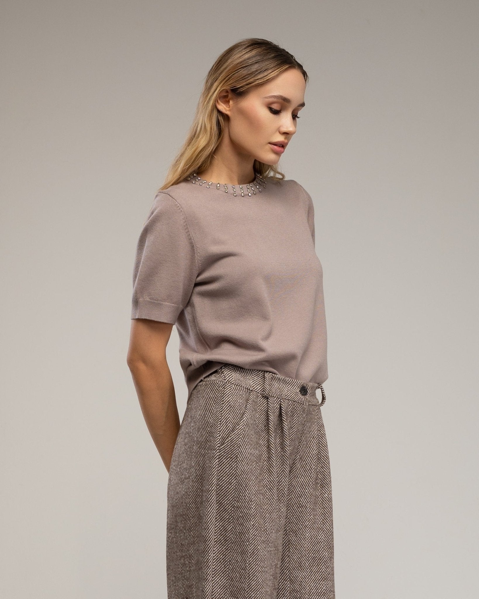 Este jersey de punto fino destaca por su elegancia sutil y su toque de brillo gracias a los delicados detalles de piedras de strass en el cuello. Su tejido ligero y suave ofrece una caída fluida y cómoda, perfecta para crear looks refinados tanto de día como de noche.