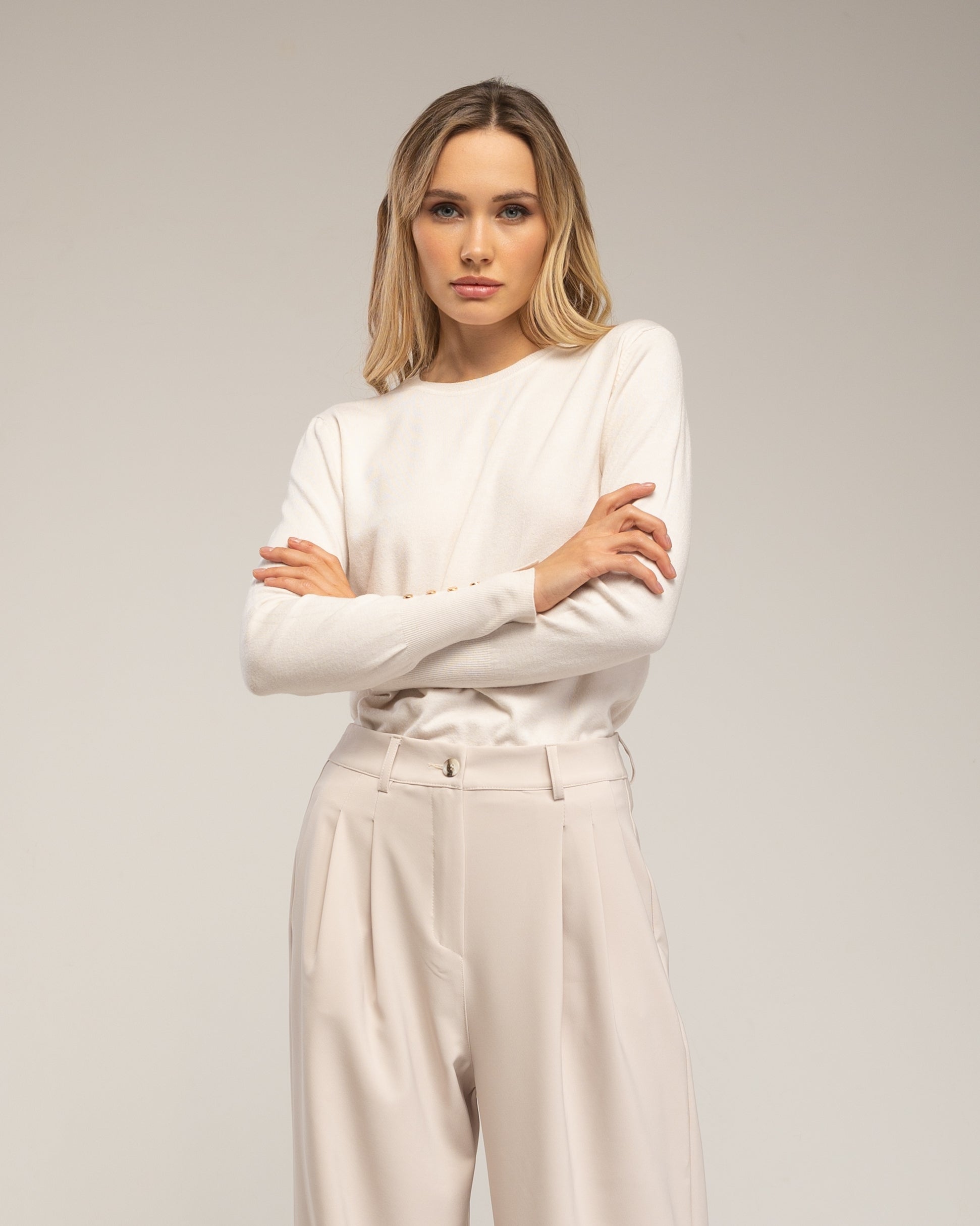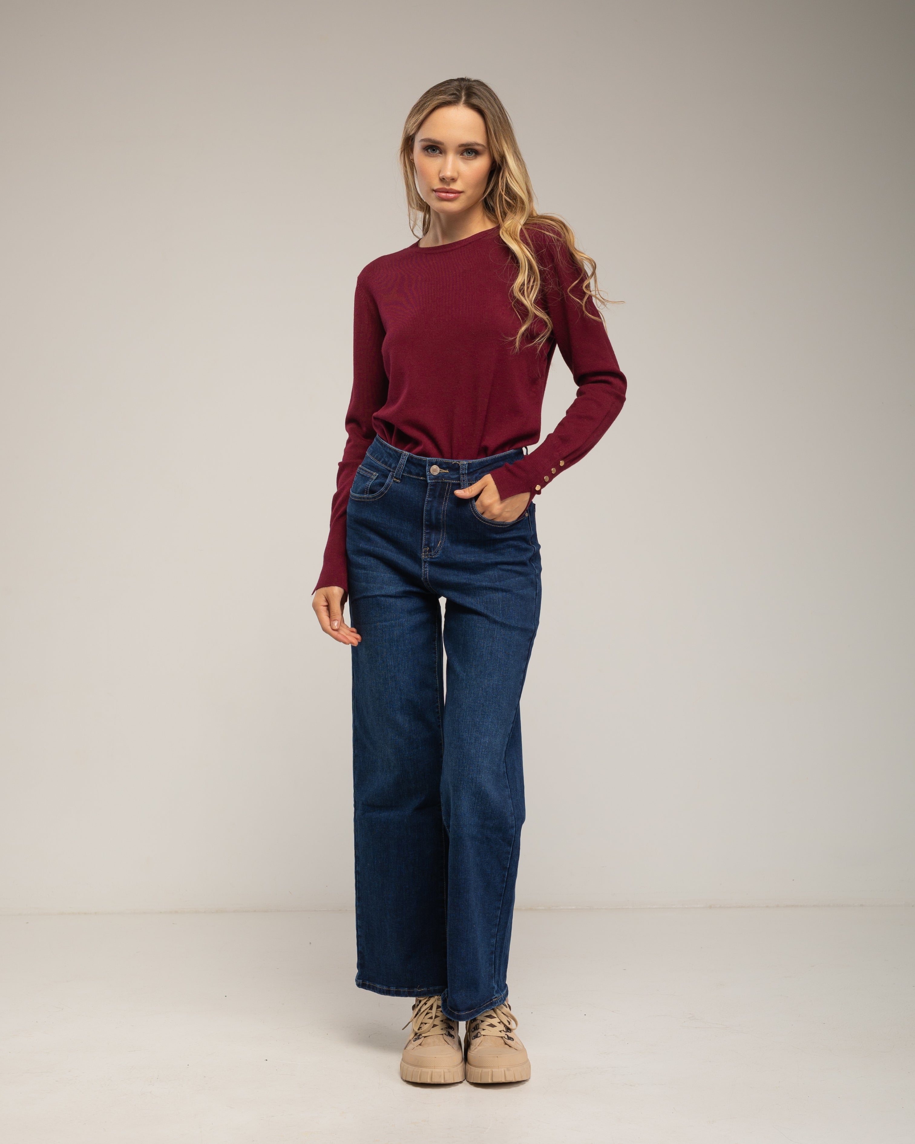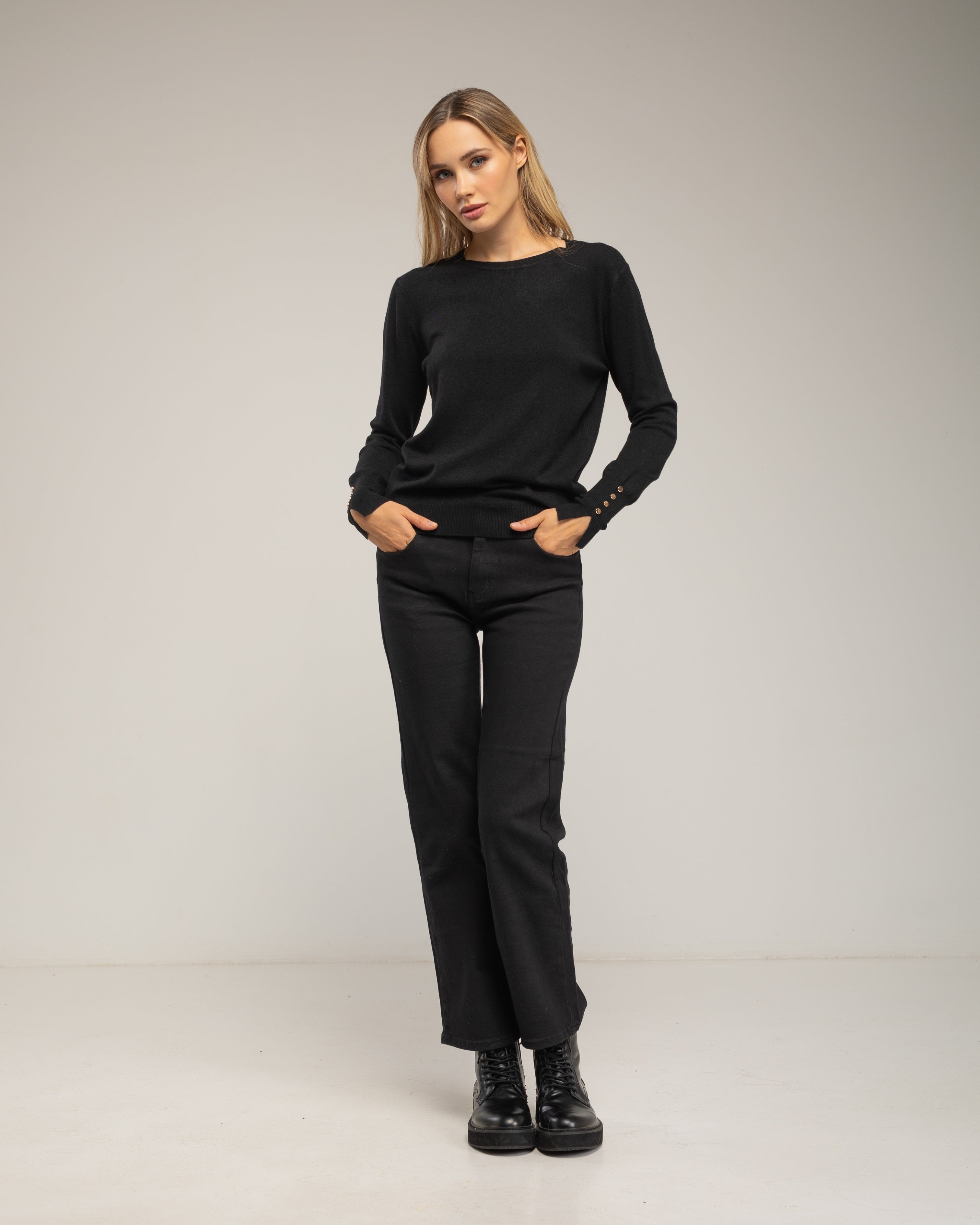 Este jersey de punto fino con lana combina elegancia y confort en una prenda versátil y atemporal. Su cuello redondo y los delicados botones dorados en los puños aportan un toque refinado, ideal para elevar tus looks del día a día con un aire sofisticado.