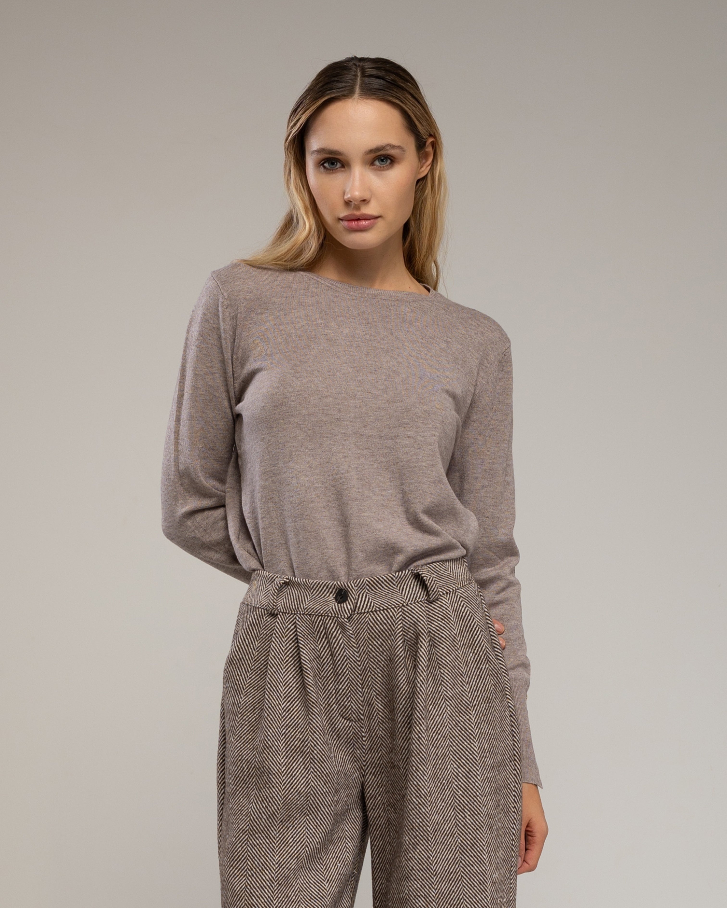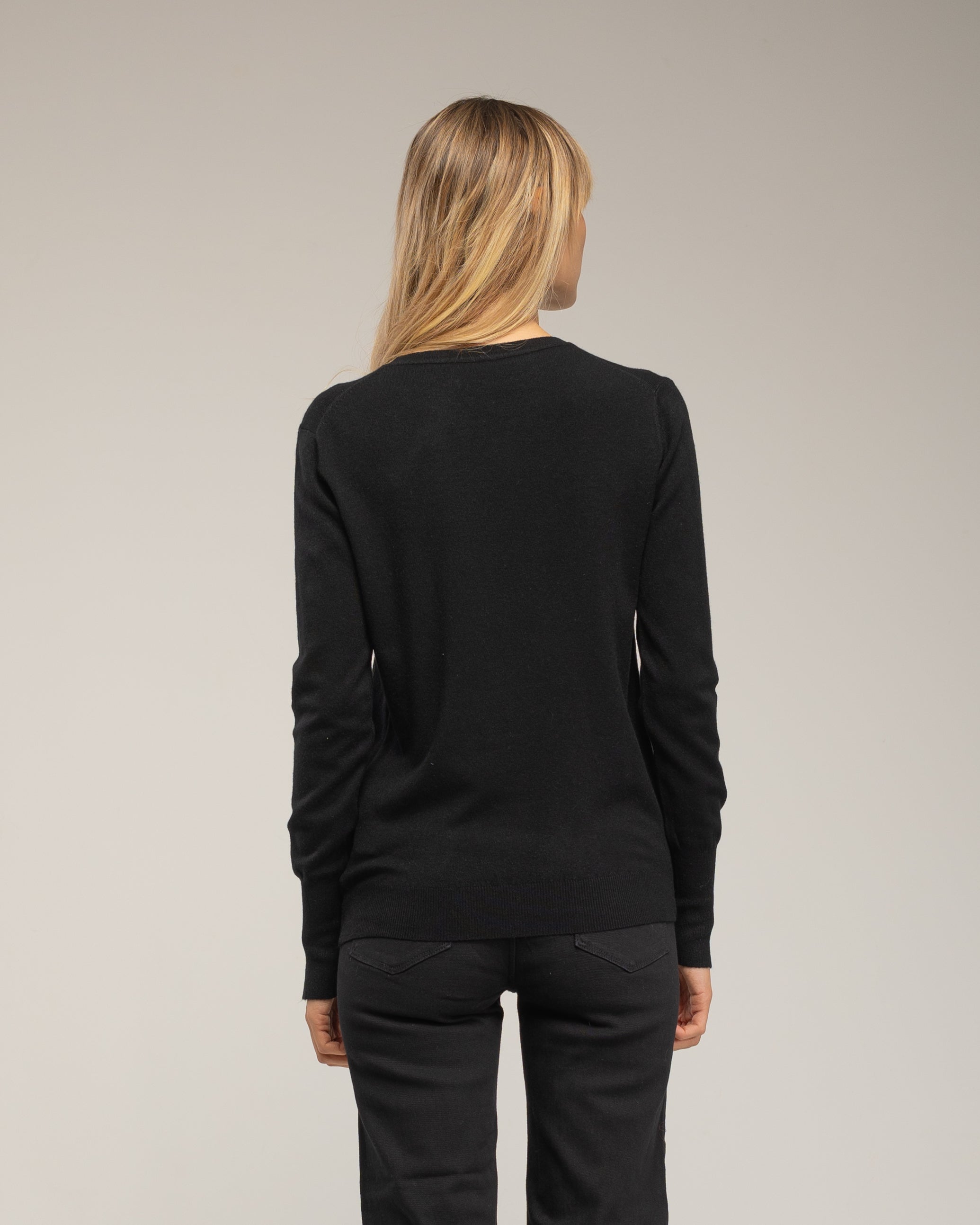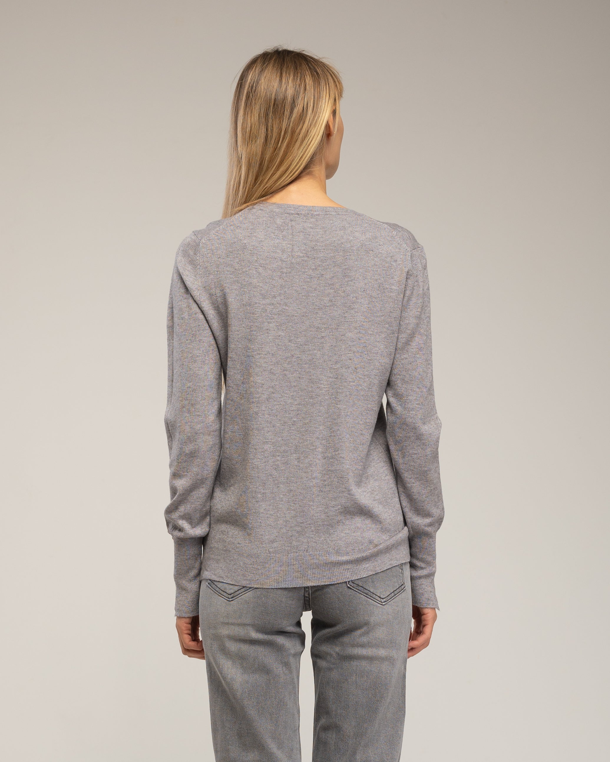 Este jersey de punto fino con lana combina elegancia y confort en una prenda versátil y atemporal. Su cuello redondo y los delicados botones dorados en los puños aportan un toque refinado, ideal para elevar tus looks del día a día con un aire sofisticado.