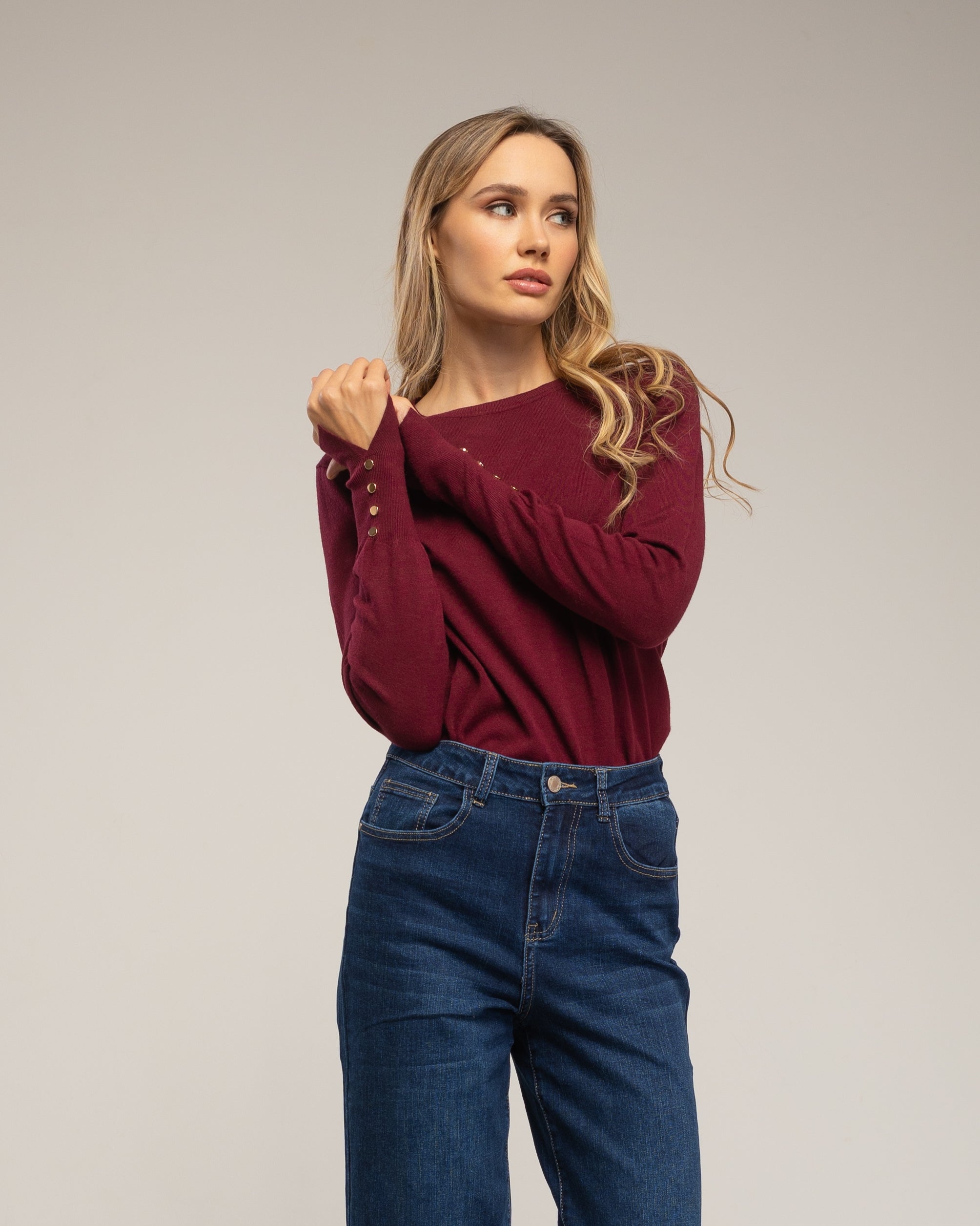 Jersey de punto fino con lana, cuello redondo y detalles de botones dorados en los puños.