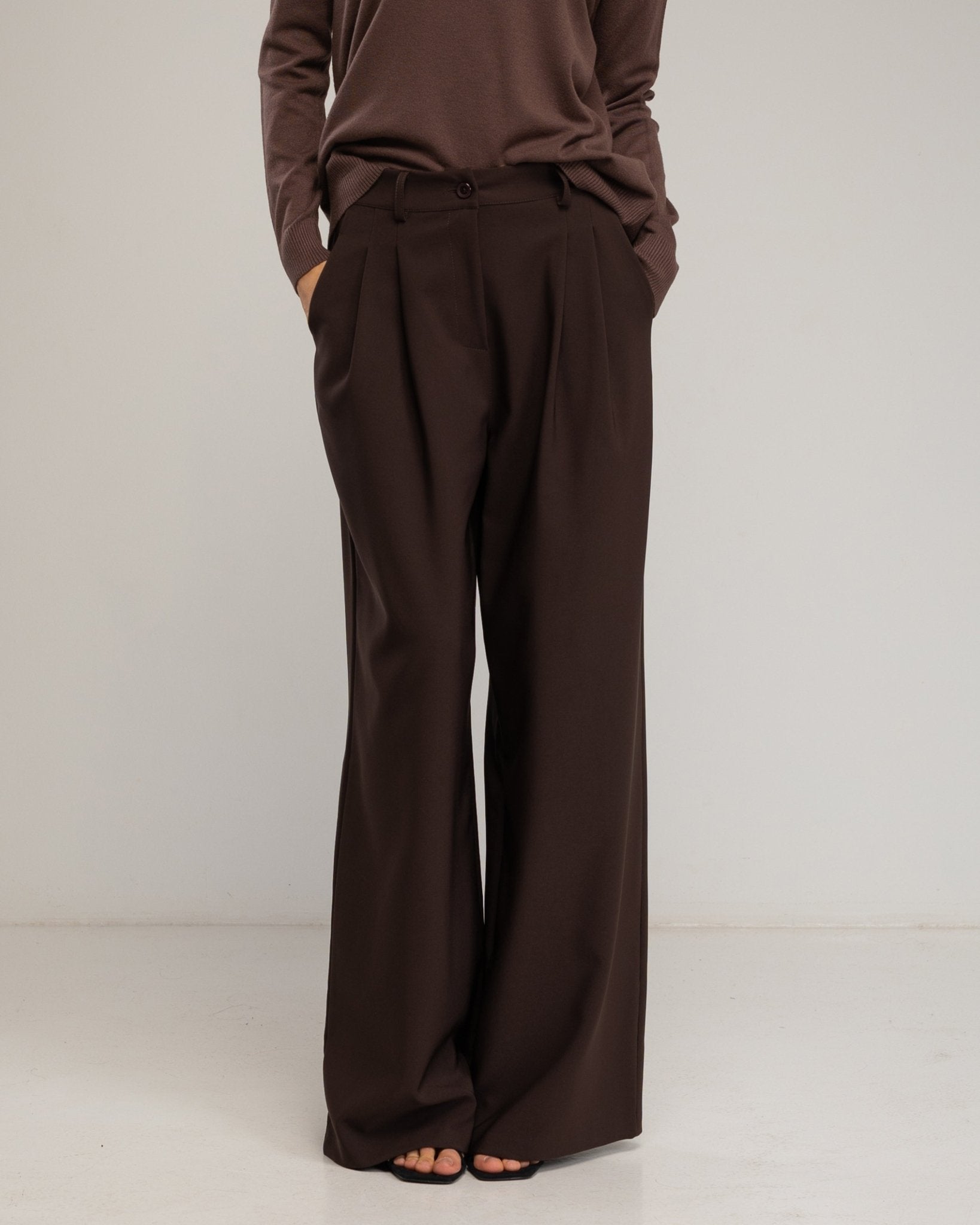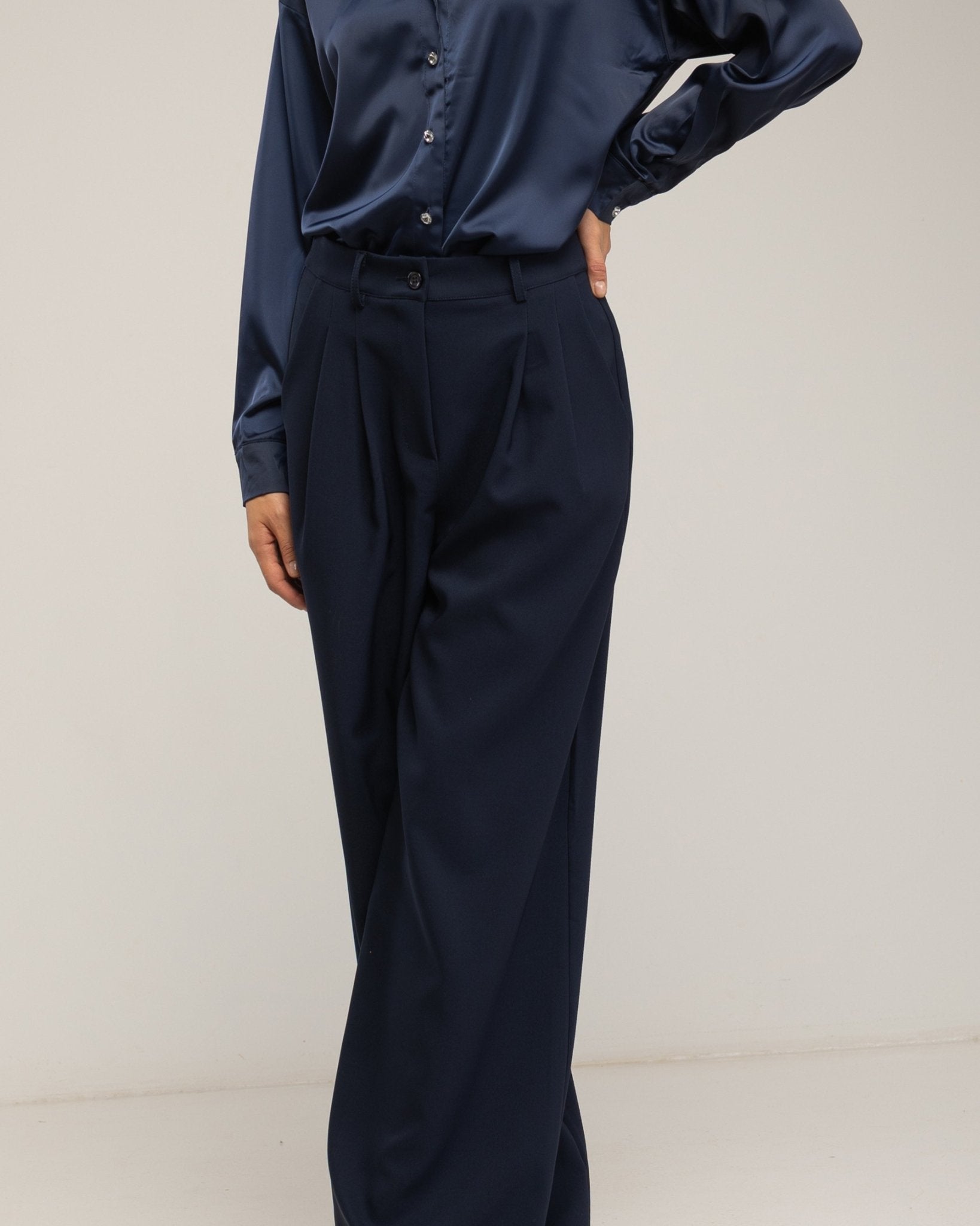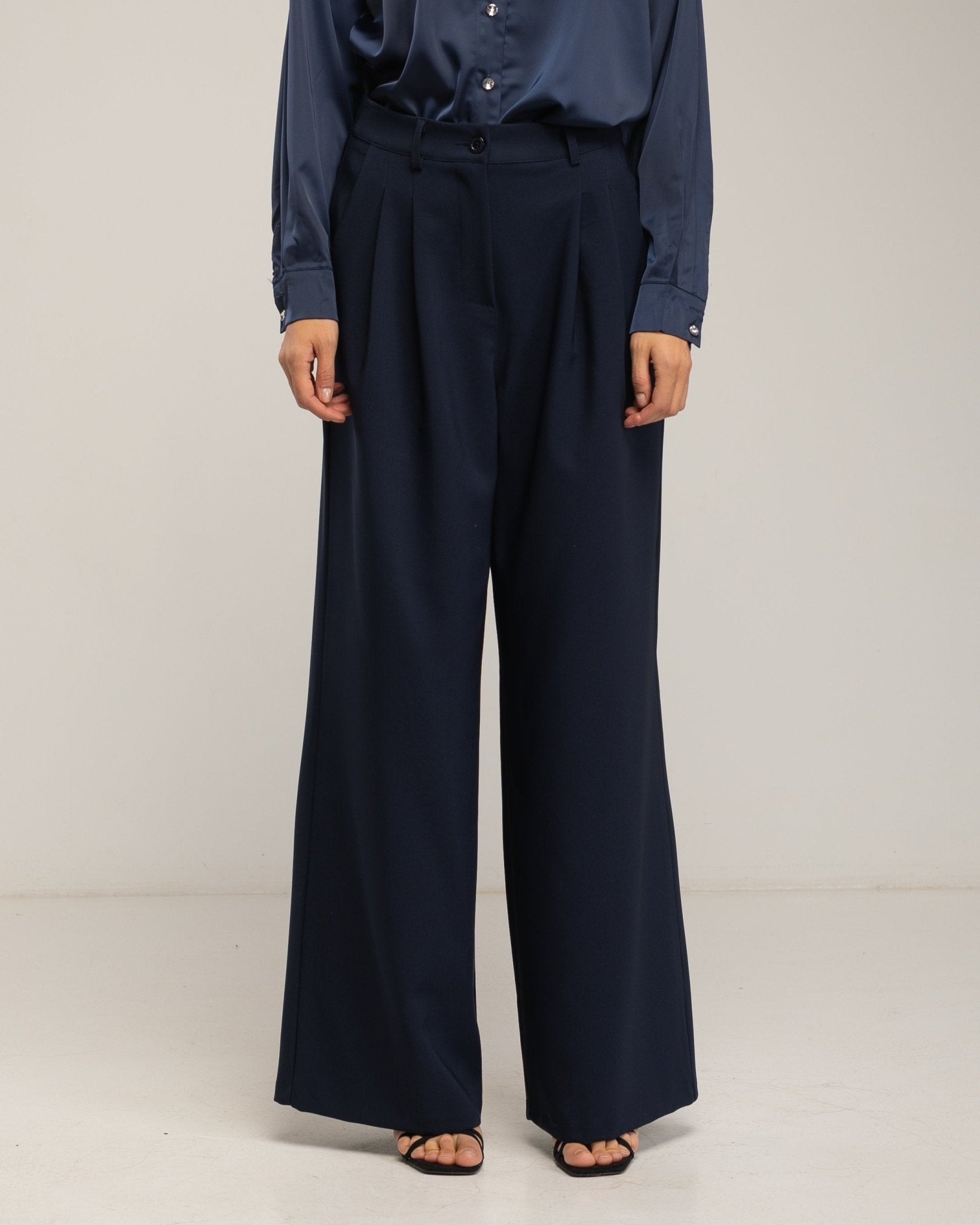 Este pantalón de vestir combina elegancia y comodidad gracias a su corte recto y amplio, que aporta libertad de movimiento sin perder sofisticación. Incluye pinzas que realzan la silueta y bolsillos funcionales que suman practicidad, convirtiéndolo en una pieza versátil para looks formales o de oficina.