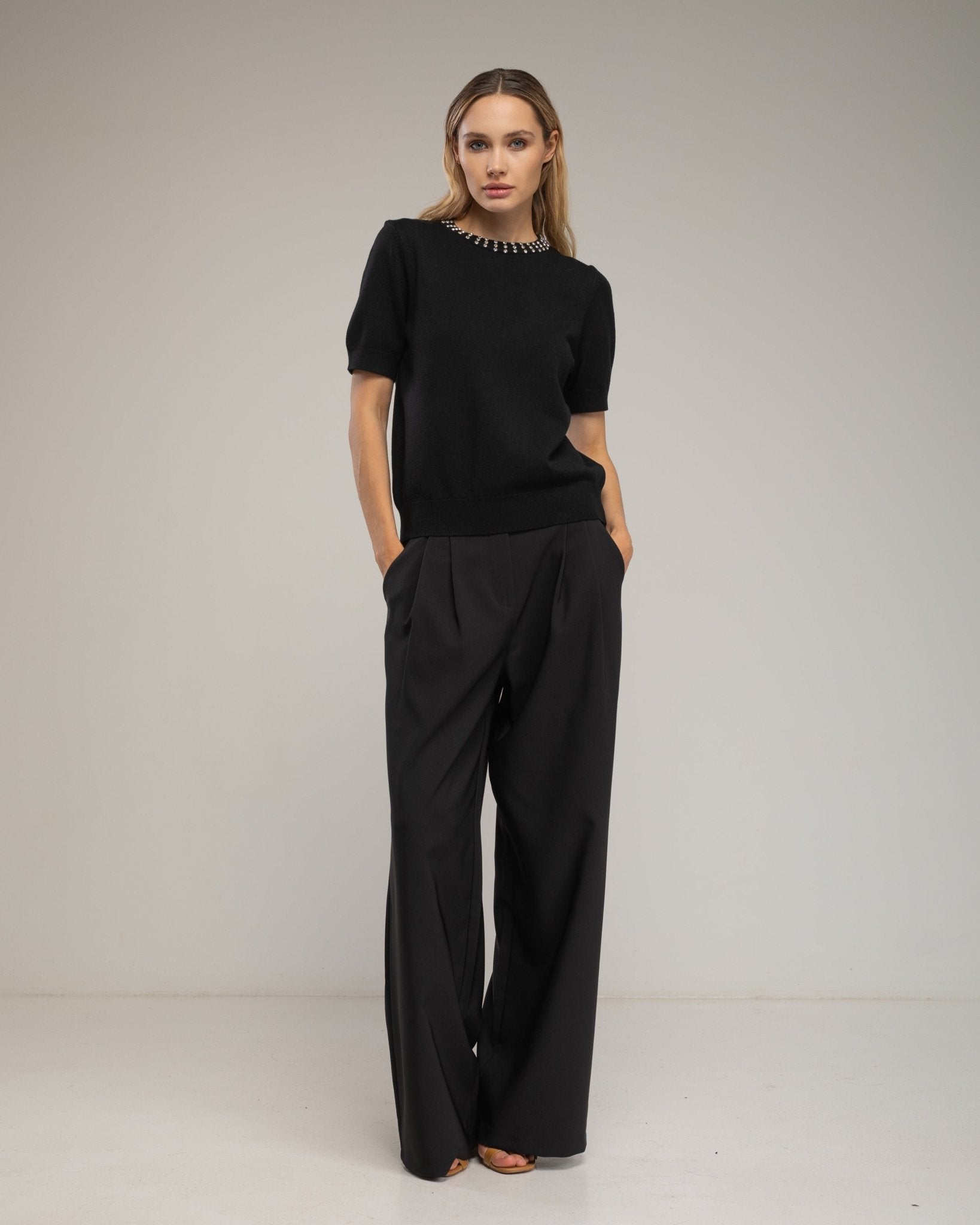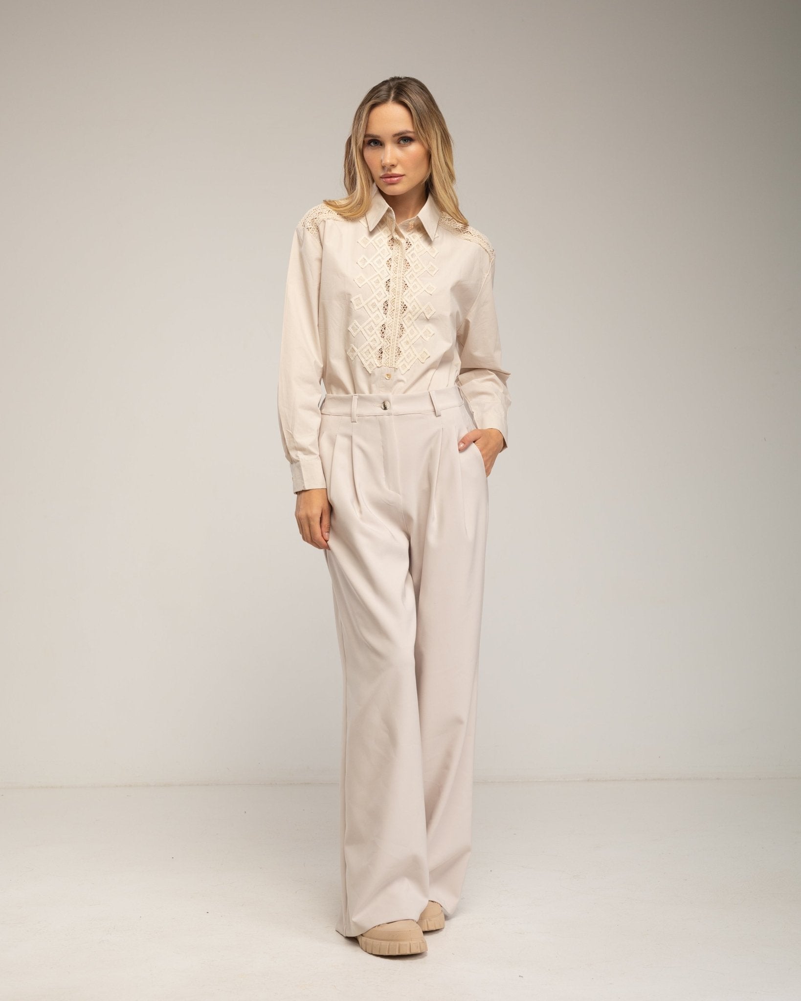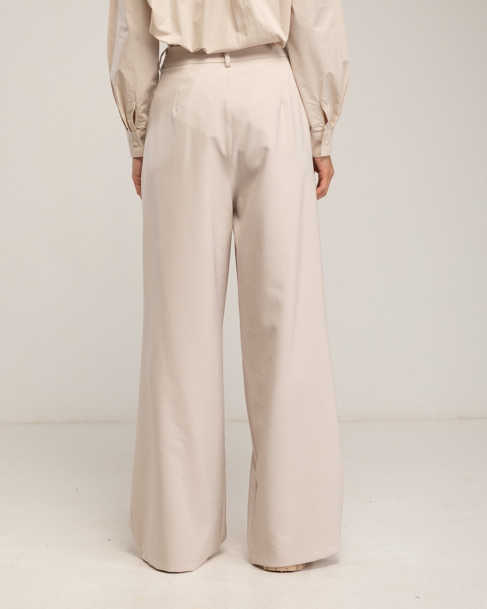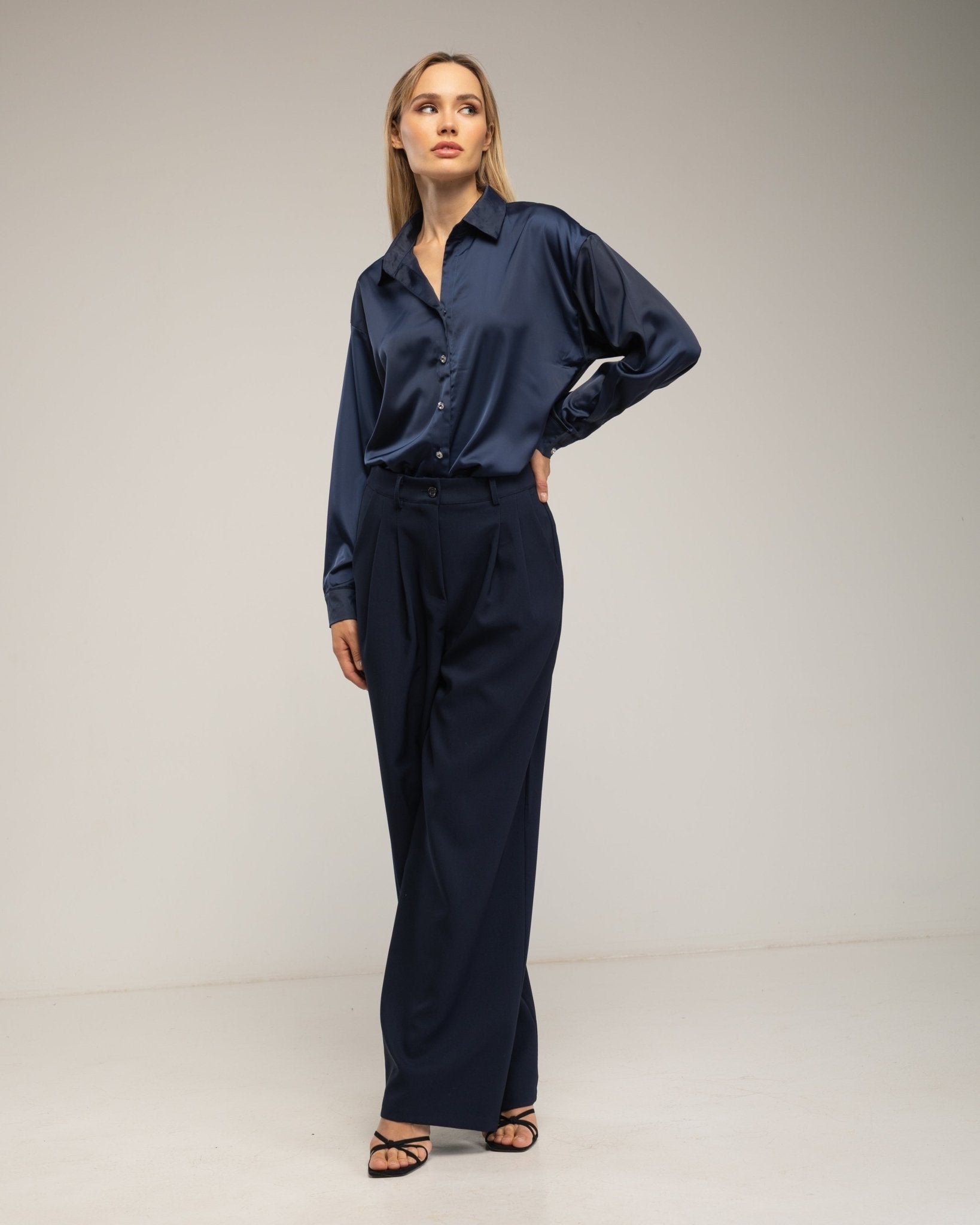 Este pantalón de vestir combina elegancia y comodidad gracias a su corte recto y amplio, que aporta libertad de movimiento sin perder sofisticación. Incluye pinzas que realzan la silueta y bolsillos funcionales que suman practicidad, convirtiéndolo en una pieza versátil para looks formales o de oficina.