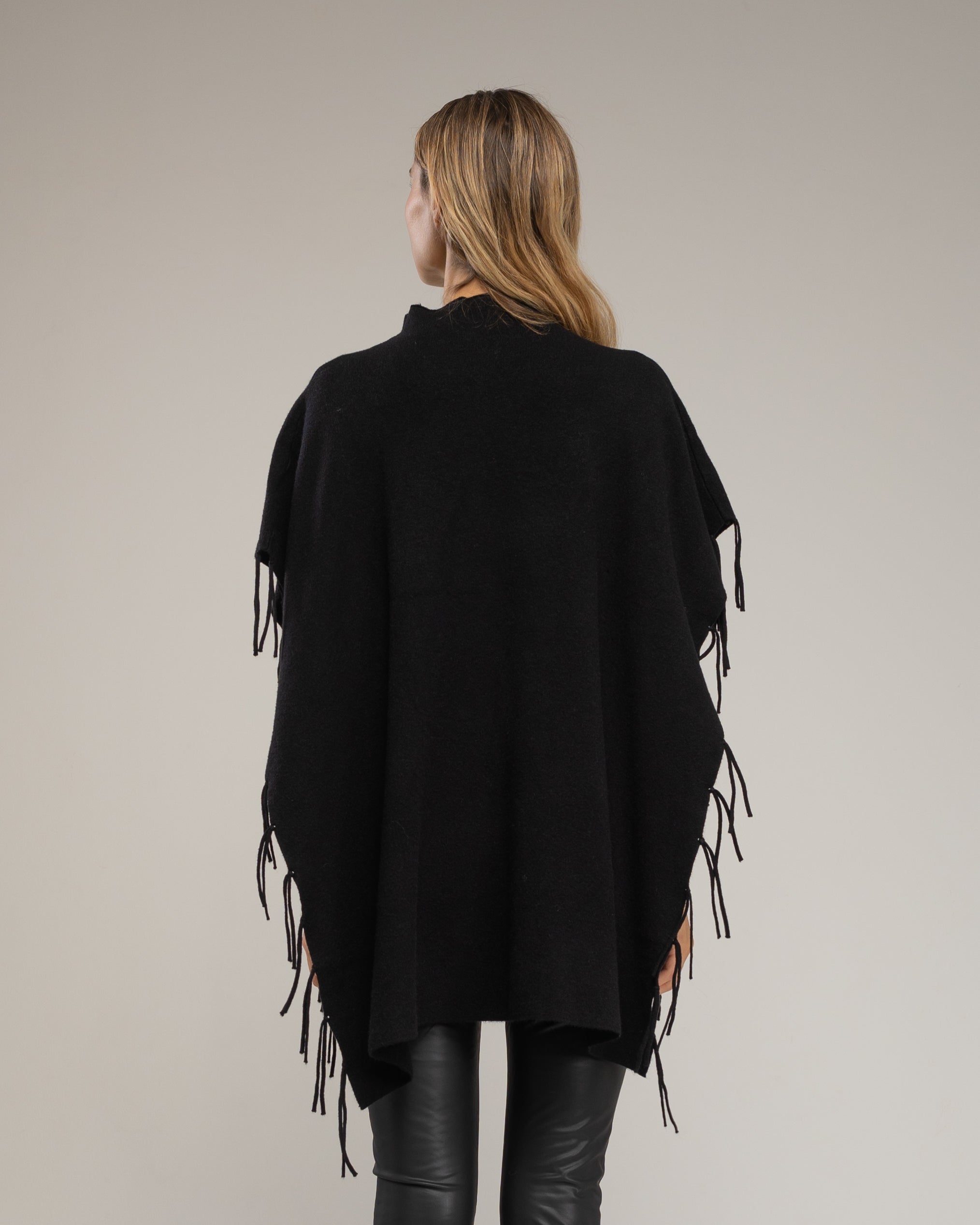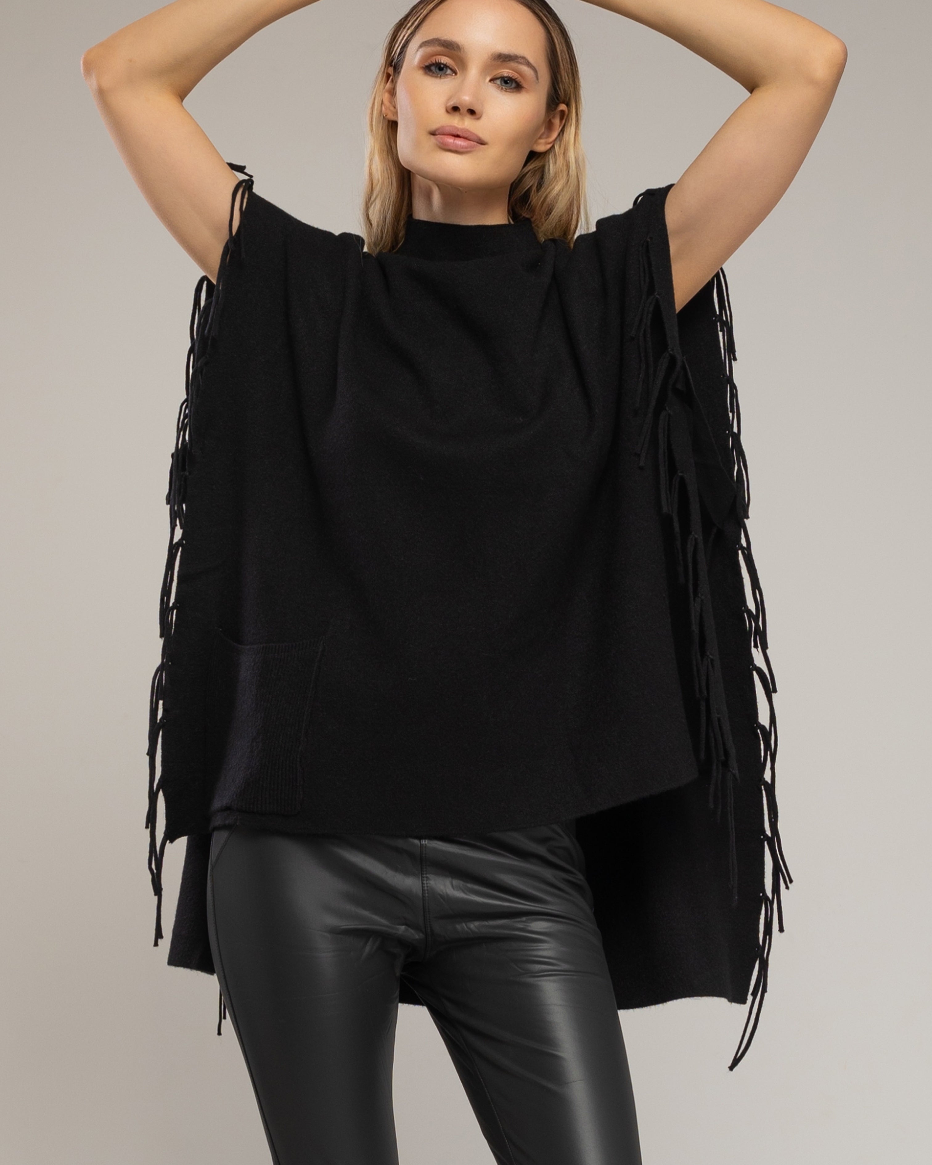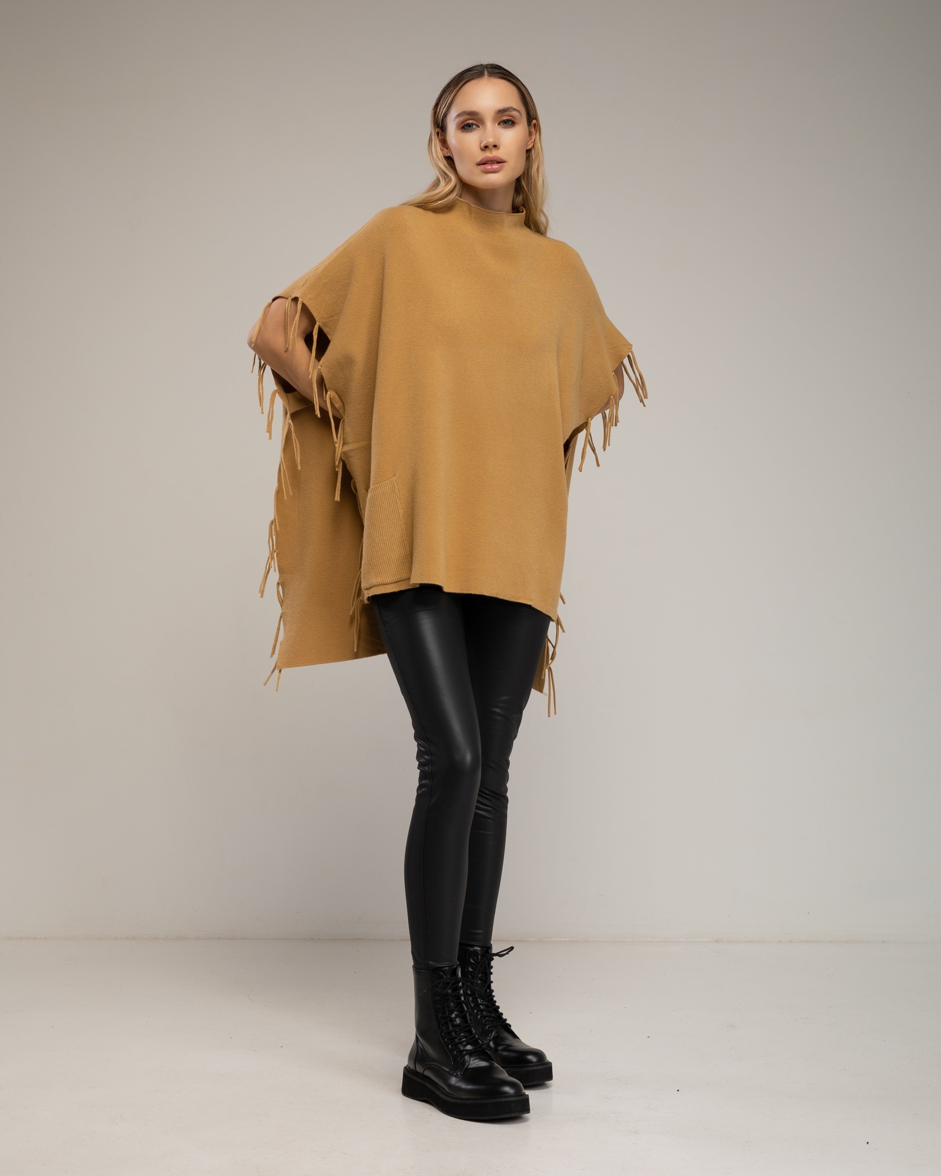 Poncho de punto con flecos en los laterales, cuello perkins y bolsillos.
