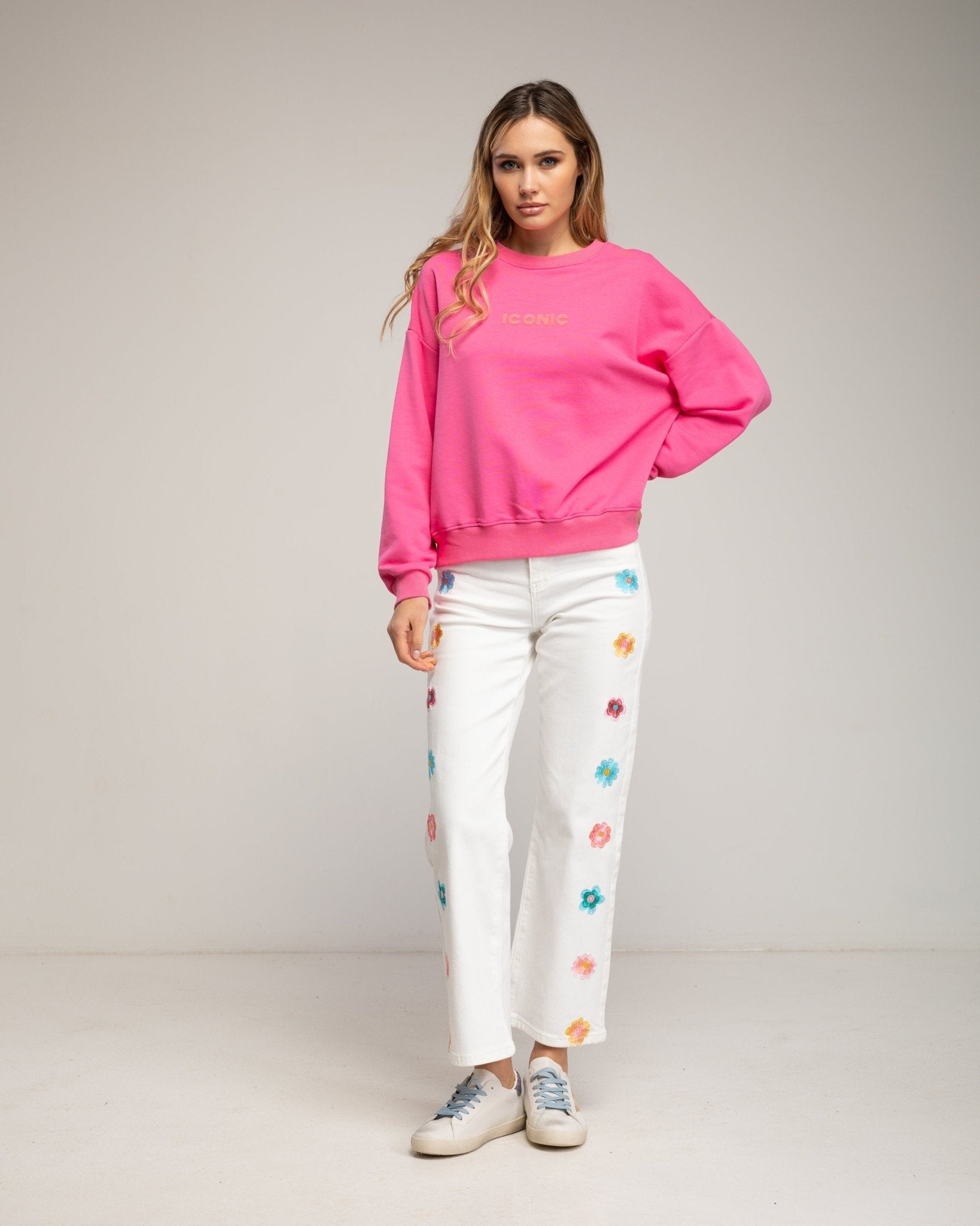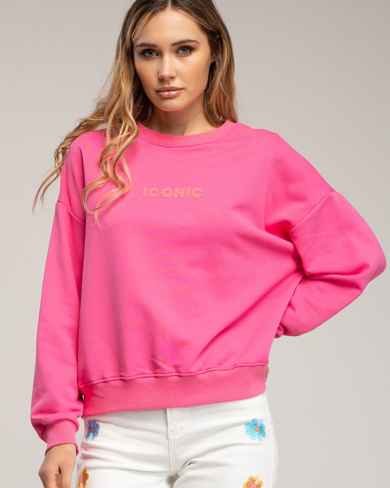Esta sudadera destaca por su diseño moderno y llamativo. El texto “iconic” en color flúor estampado tanto en la parte delantera como en la espalda aporta personalidad y un aire urbano, convirtiéndola en una prenda con carácter. Su tejido suave y confortable la hace perfecta para completar looks casuales con un toque actual.