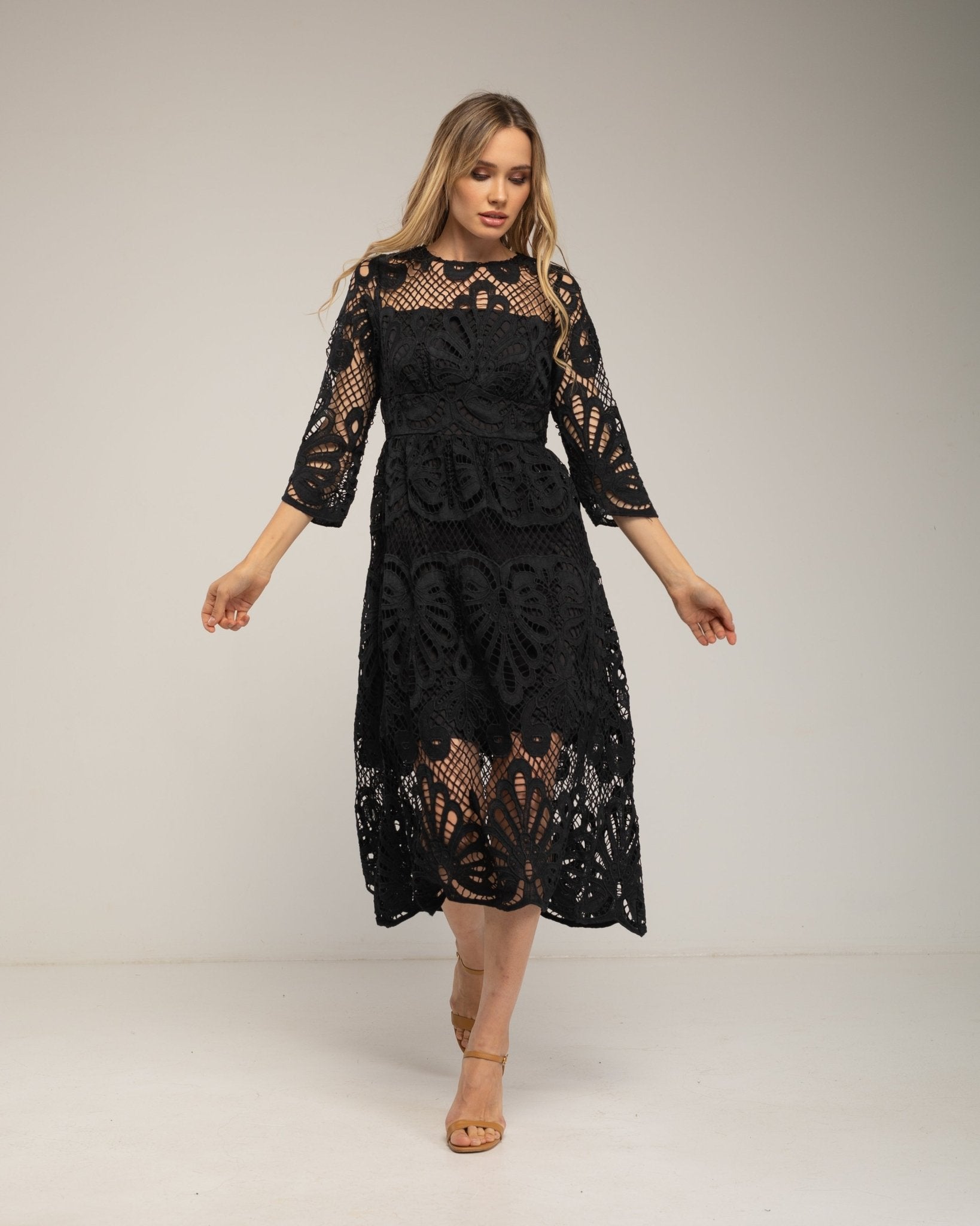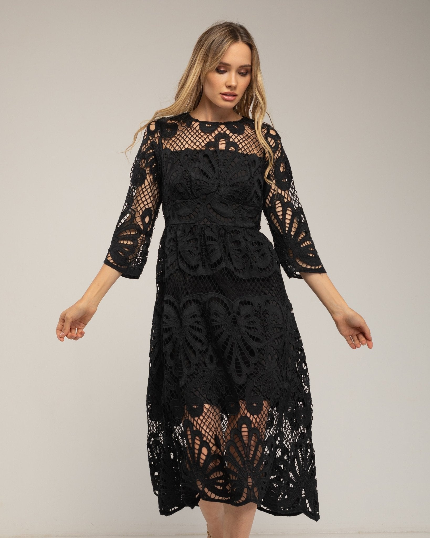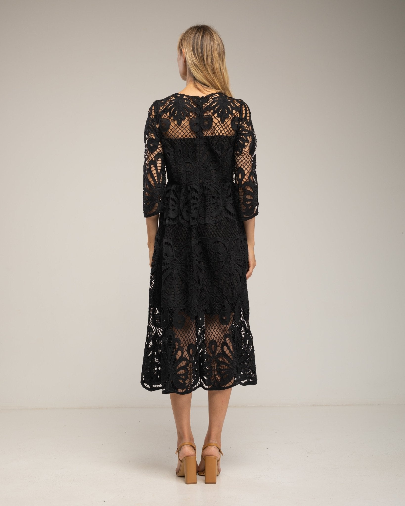 Vestido midi de guipur con transparencias en el escote y las mangas.