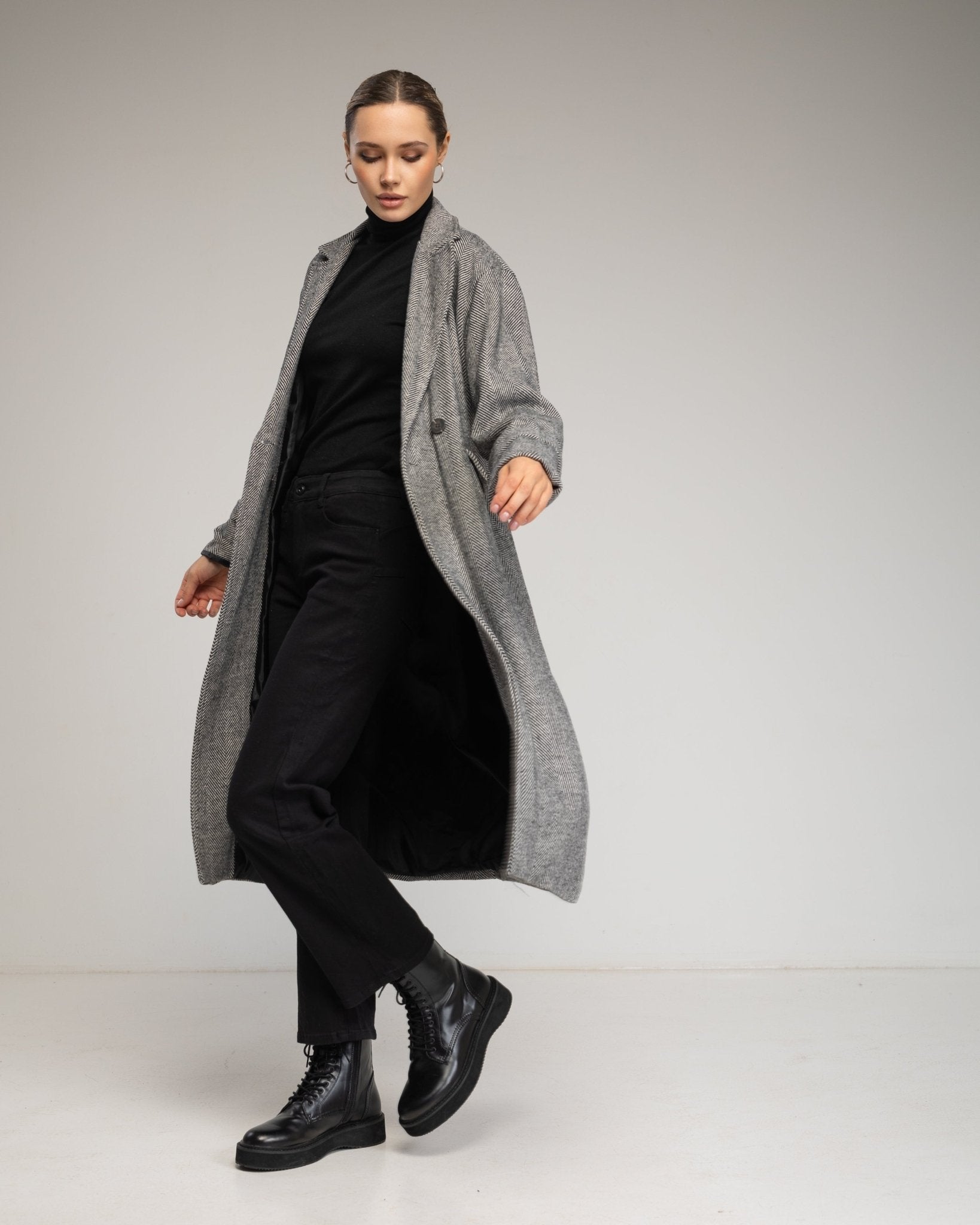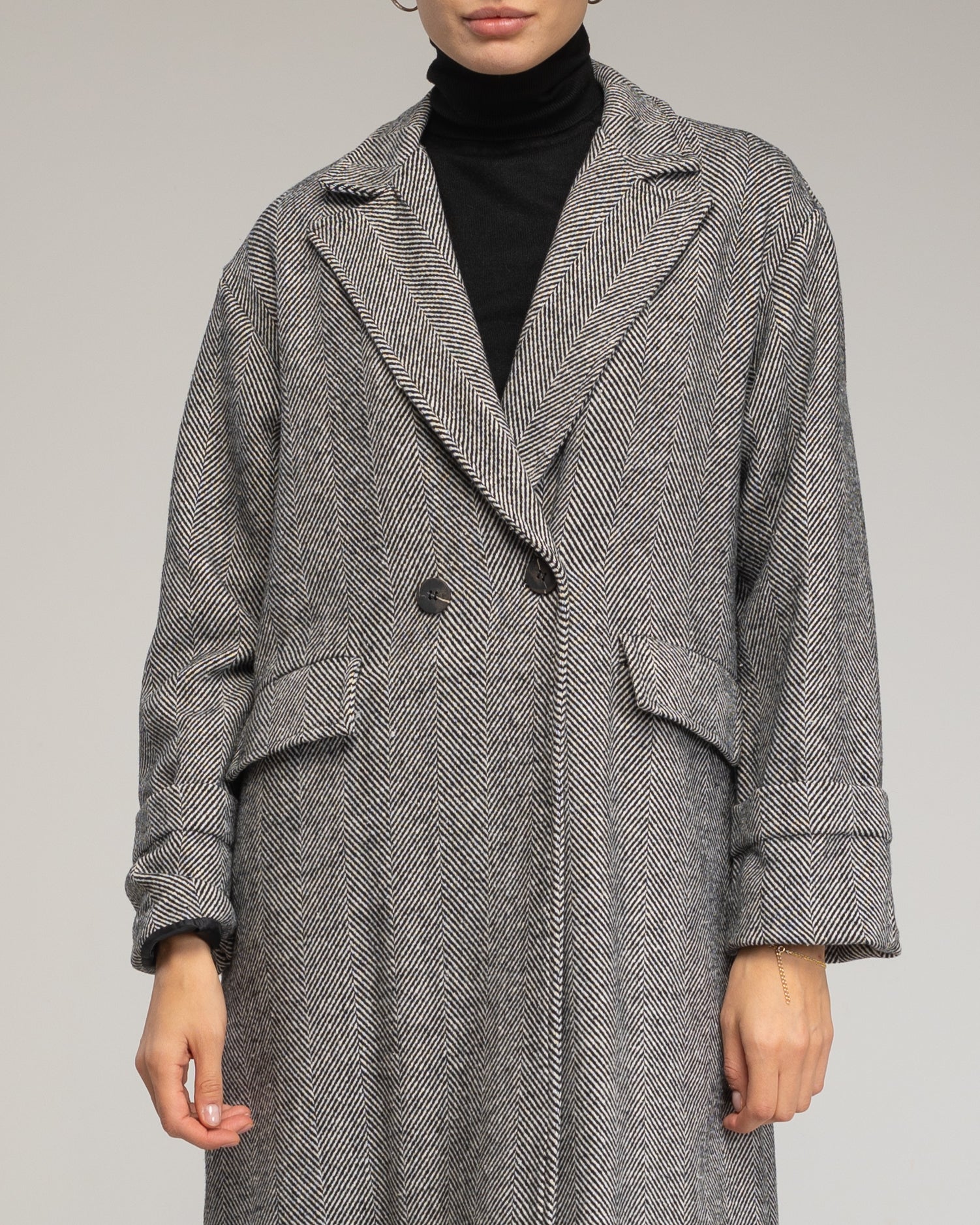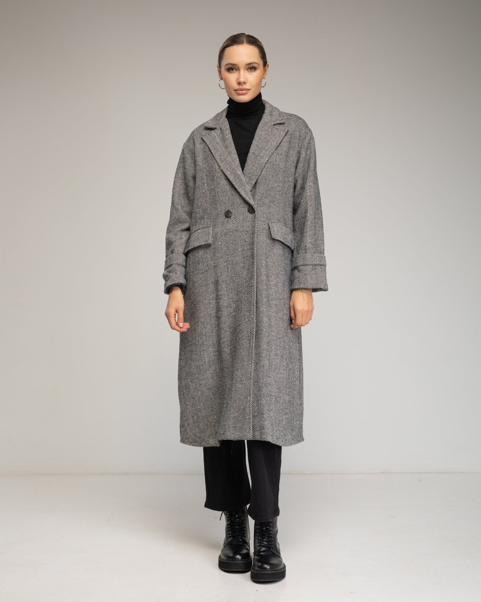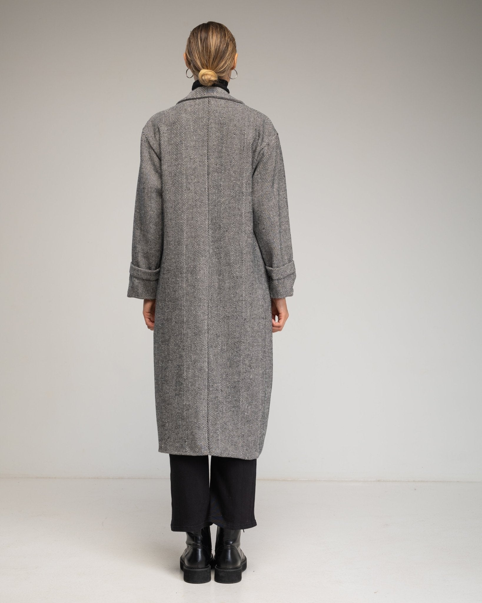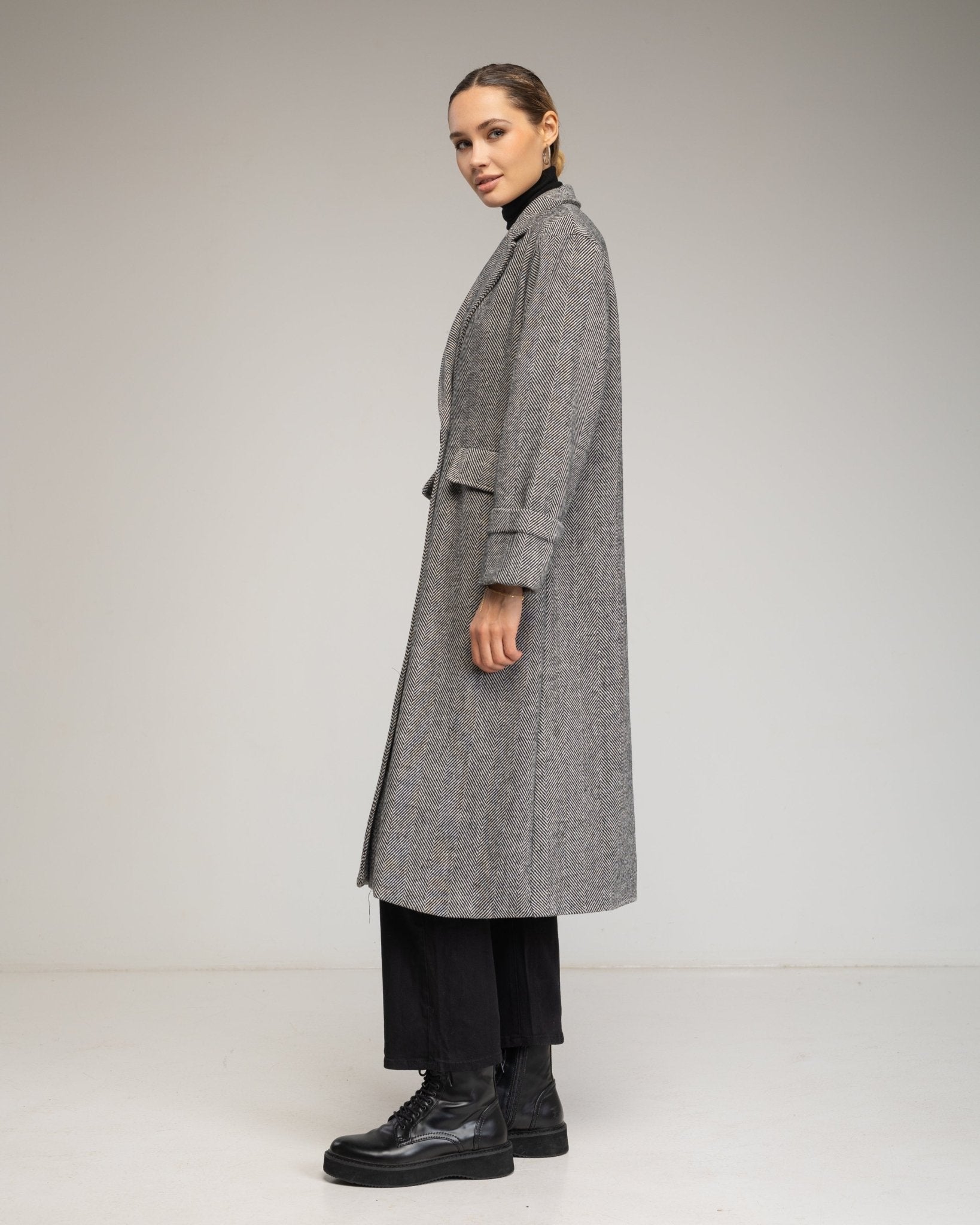 Este abrigo de espiguilla con lana combina elegancia clásica y calidez en una prenda ideal para el invierno. Su tejido con textura sutil y corte estructurado lo convierten en una opción sofisticada y versátil para completar cualquier look de temporada.