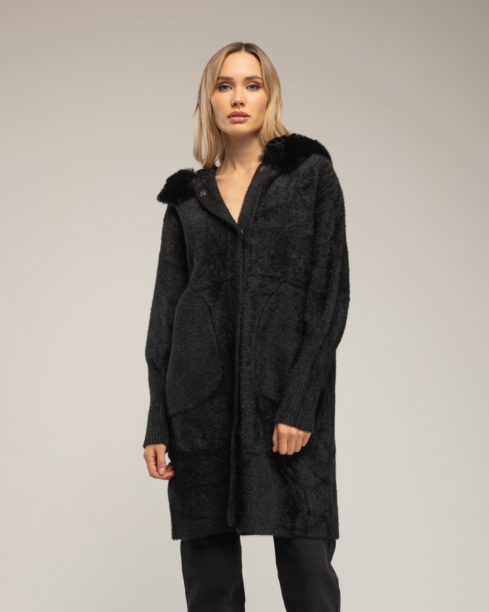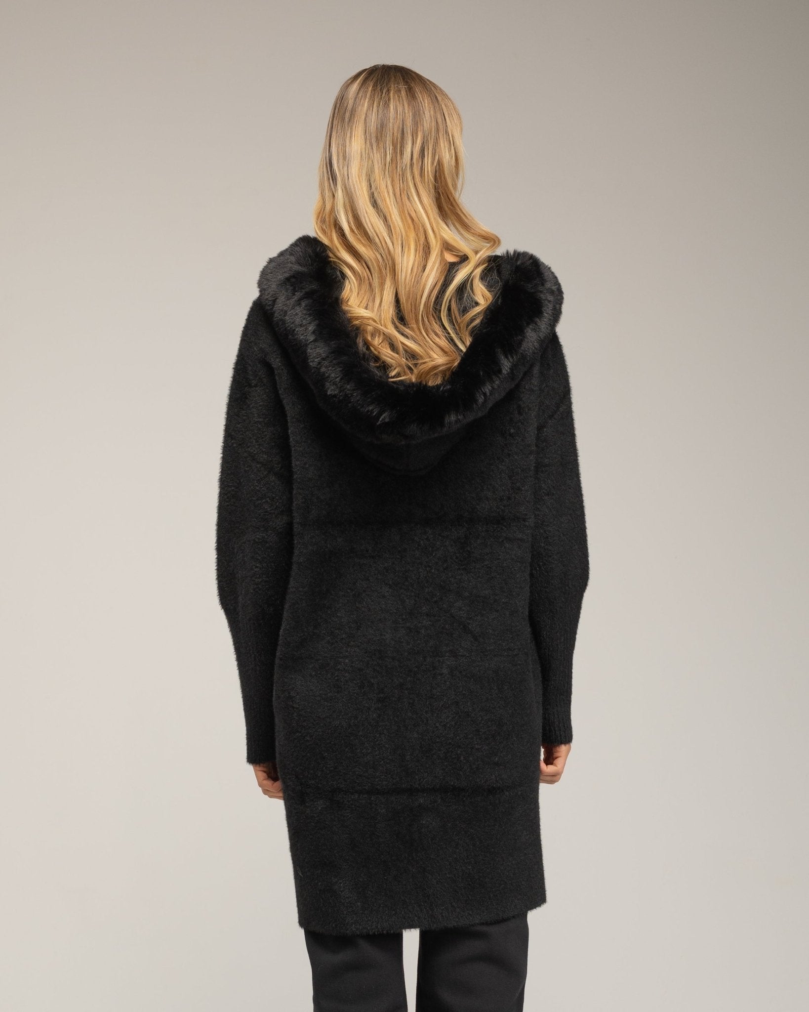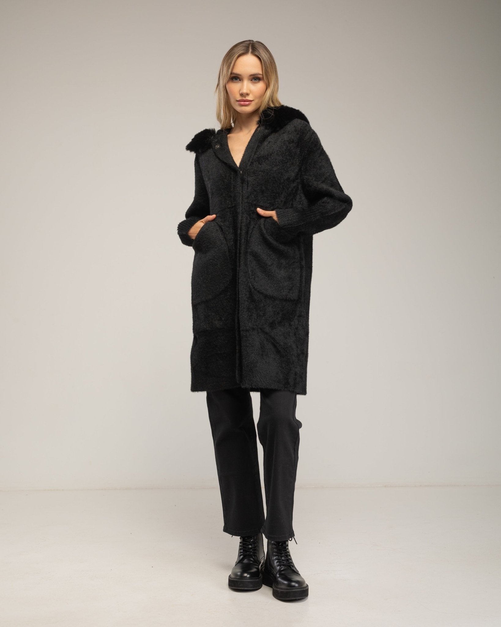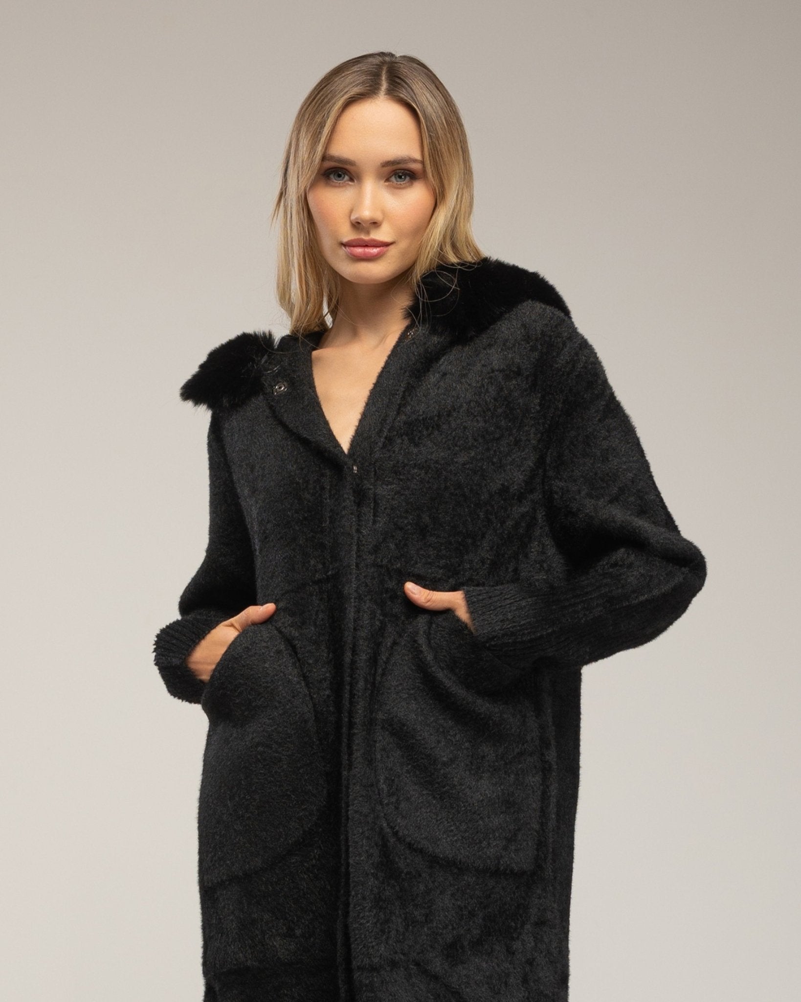 Abrigo efecto punto con pelo, capucha cierre de clip, bolsillos laterales, y cuello desmontable.