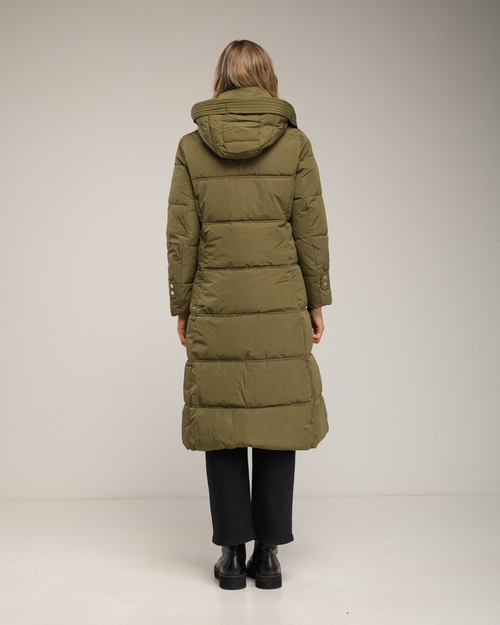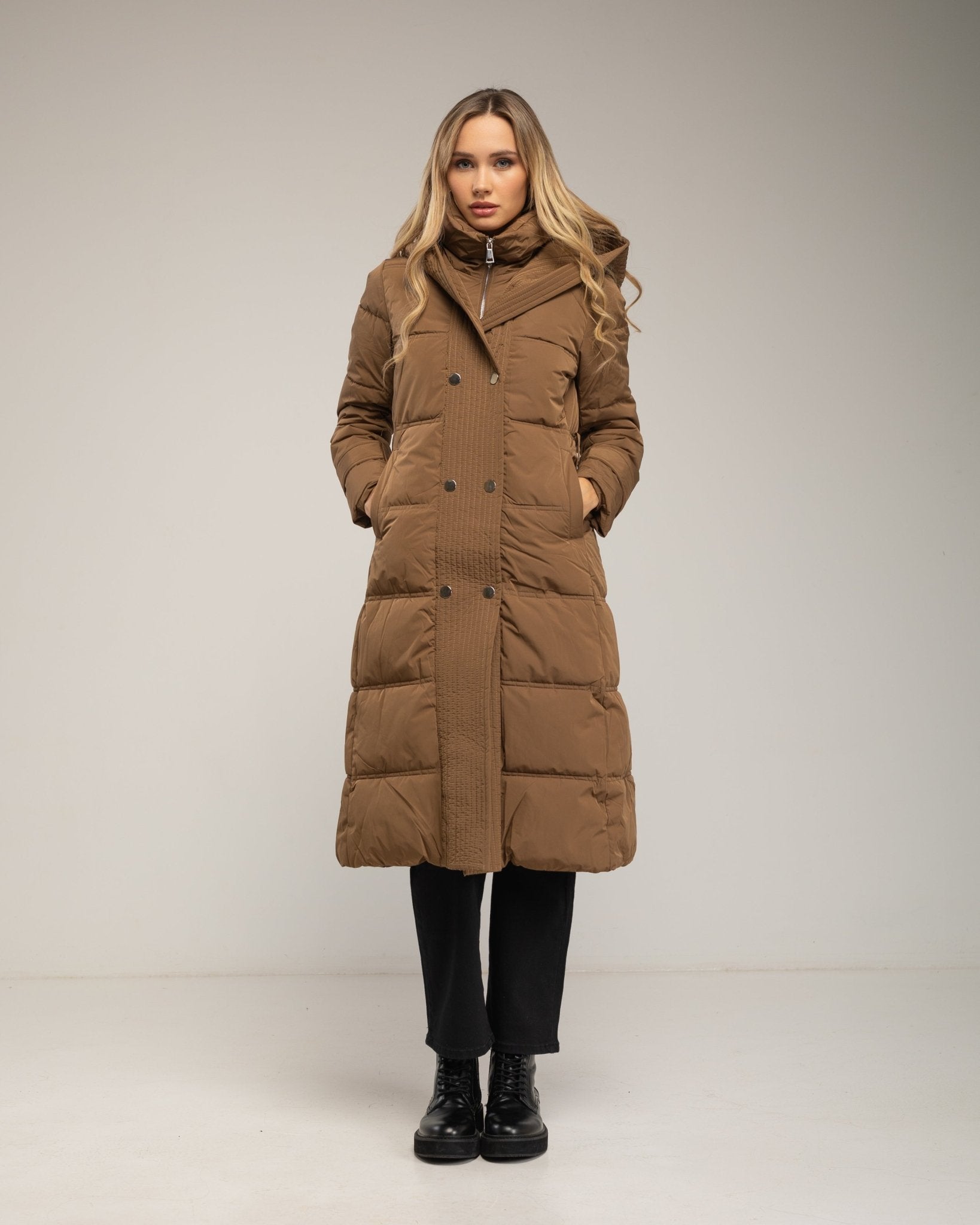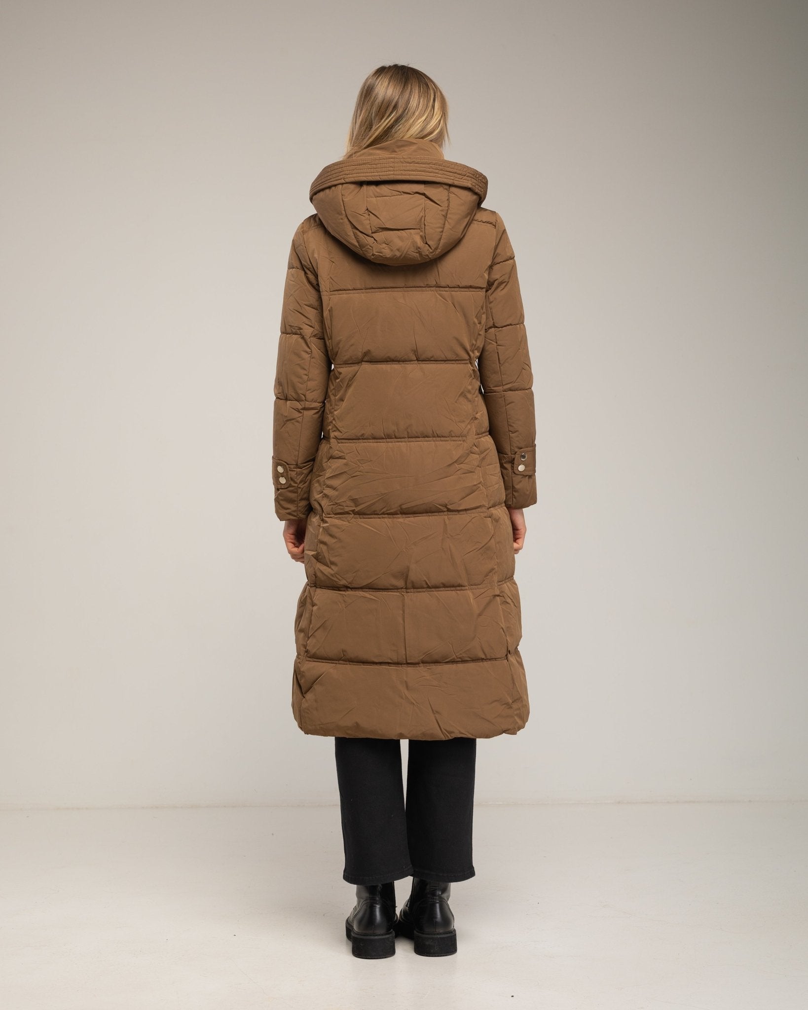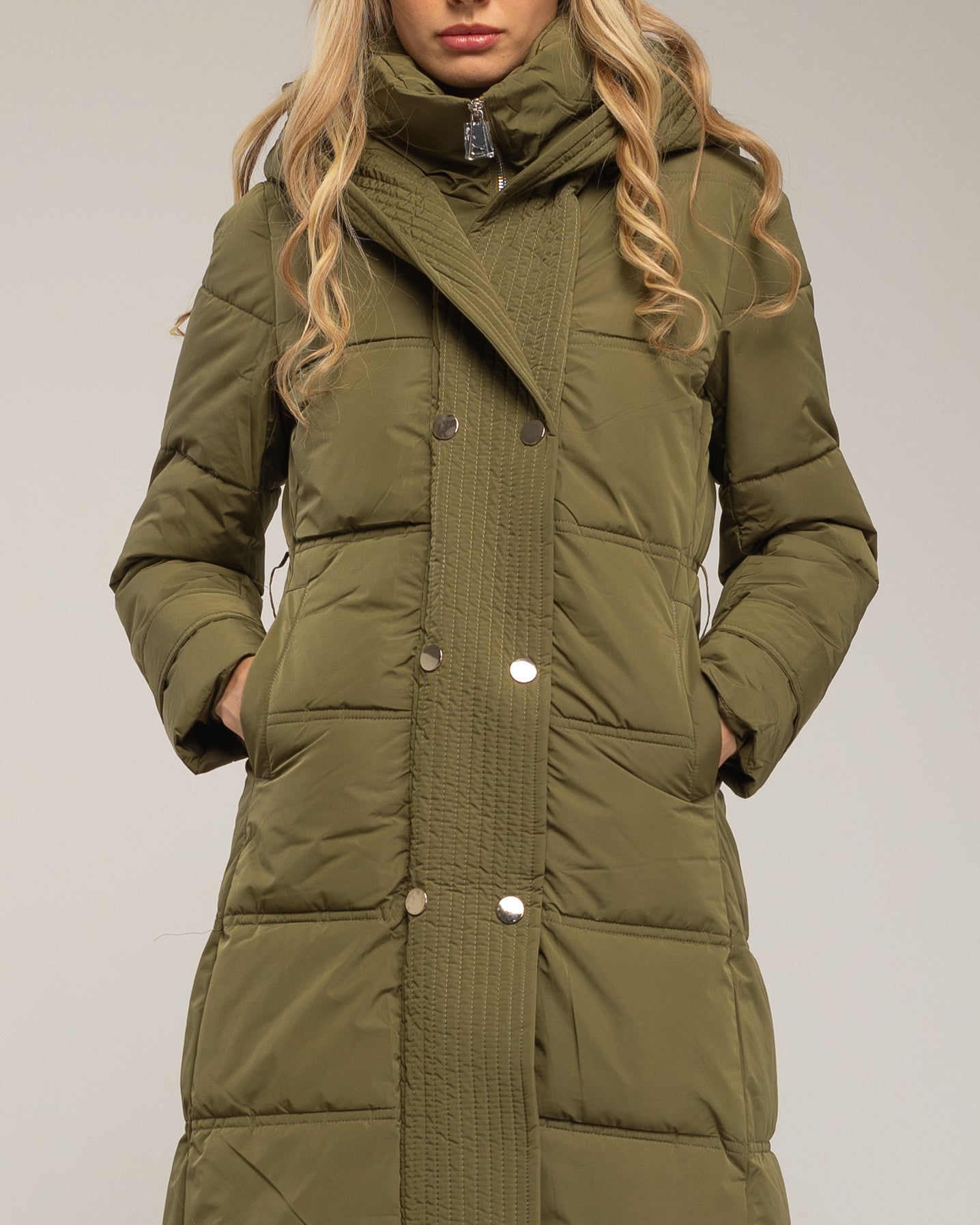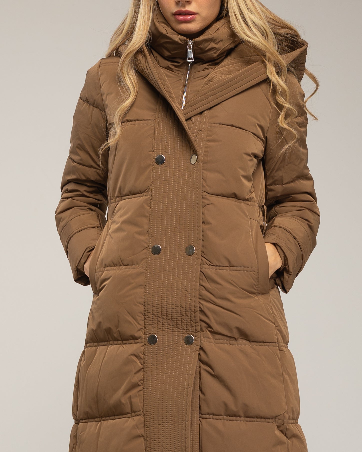 Anorack largo acolchado entallado, con capucha y doble cierre de cremallera.