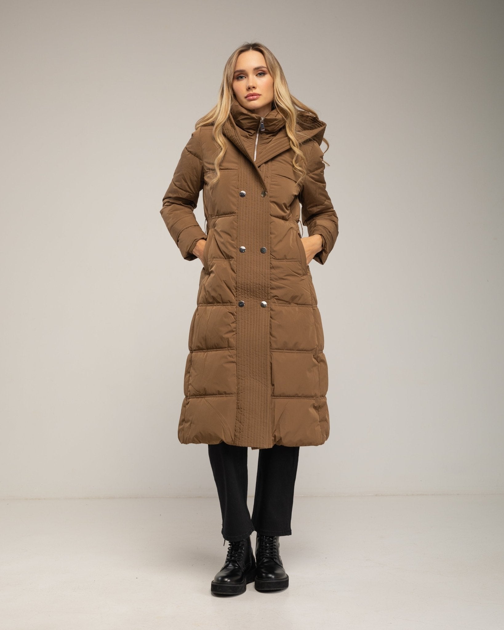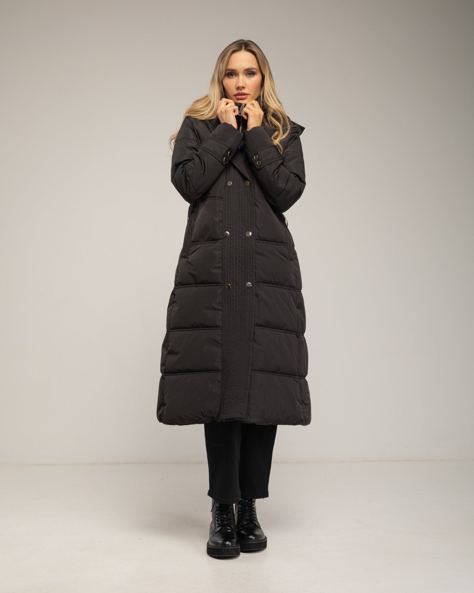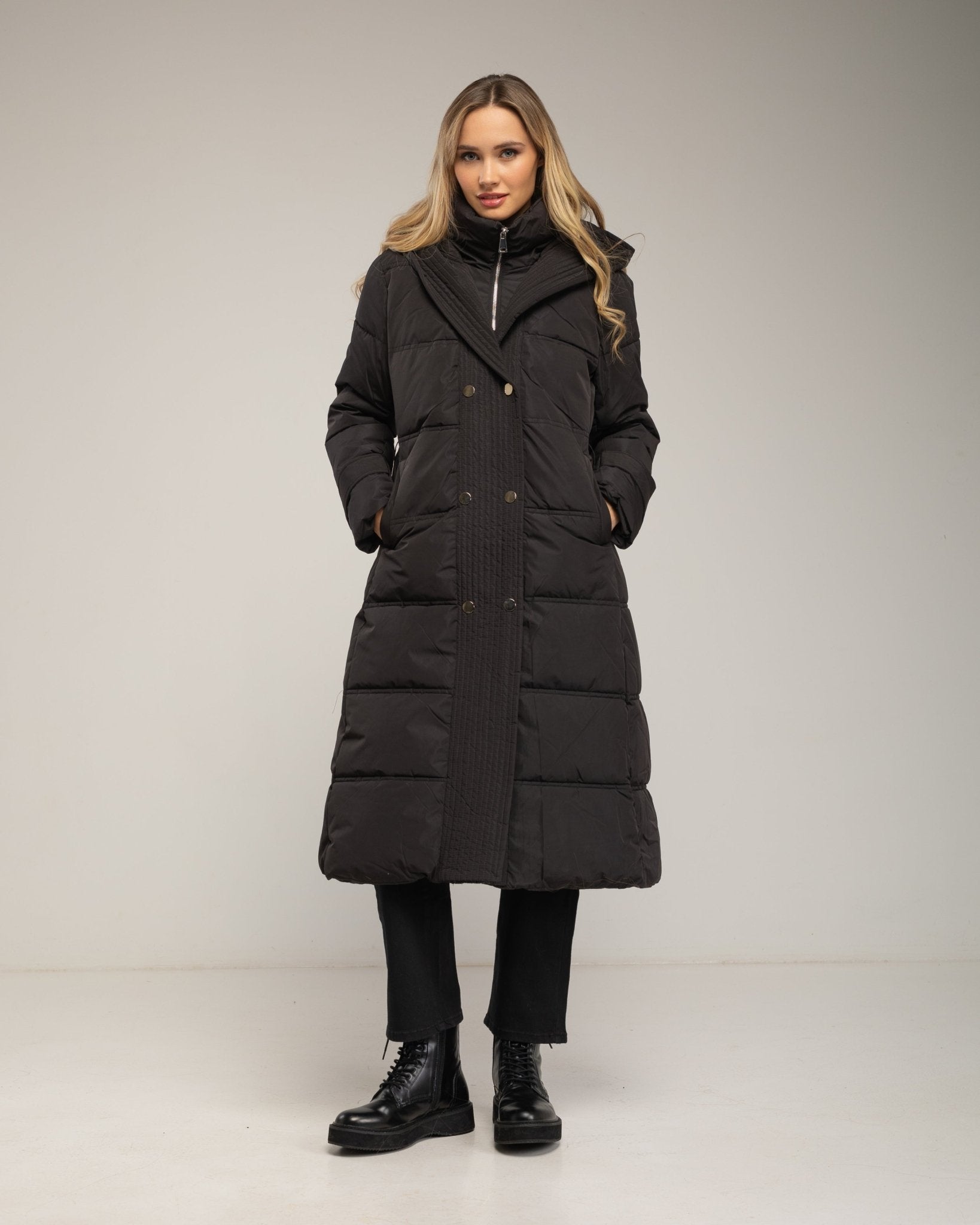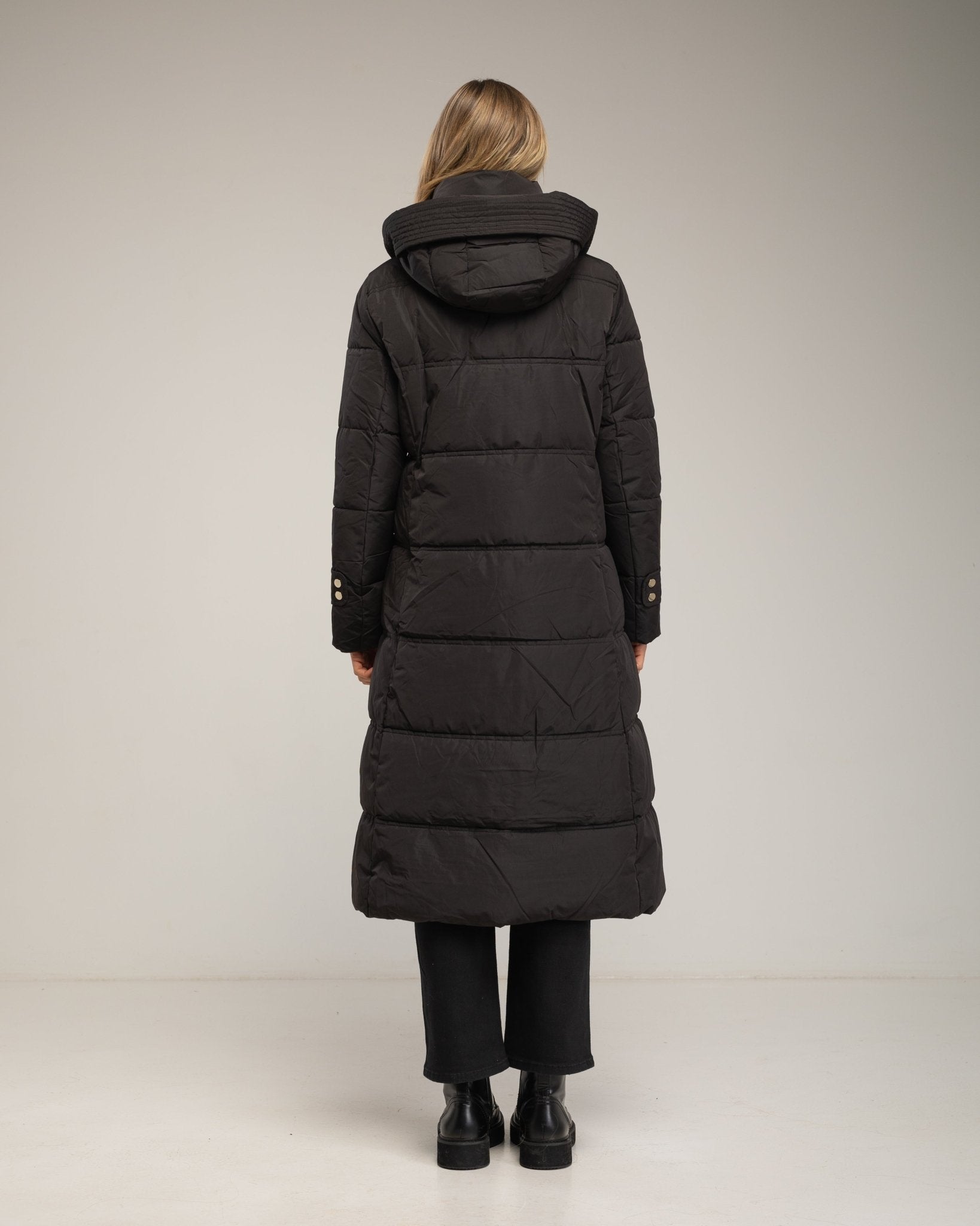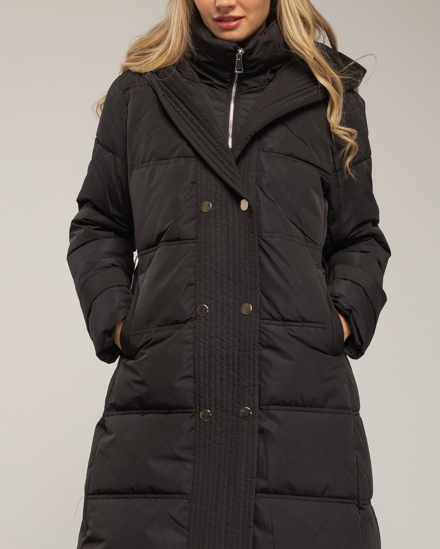 Anorack largo acolchado entallado, con capucha y doble cierre de cremallera.