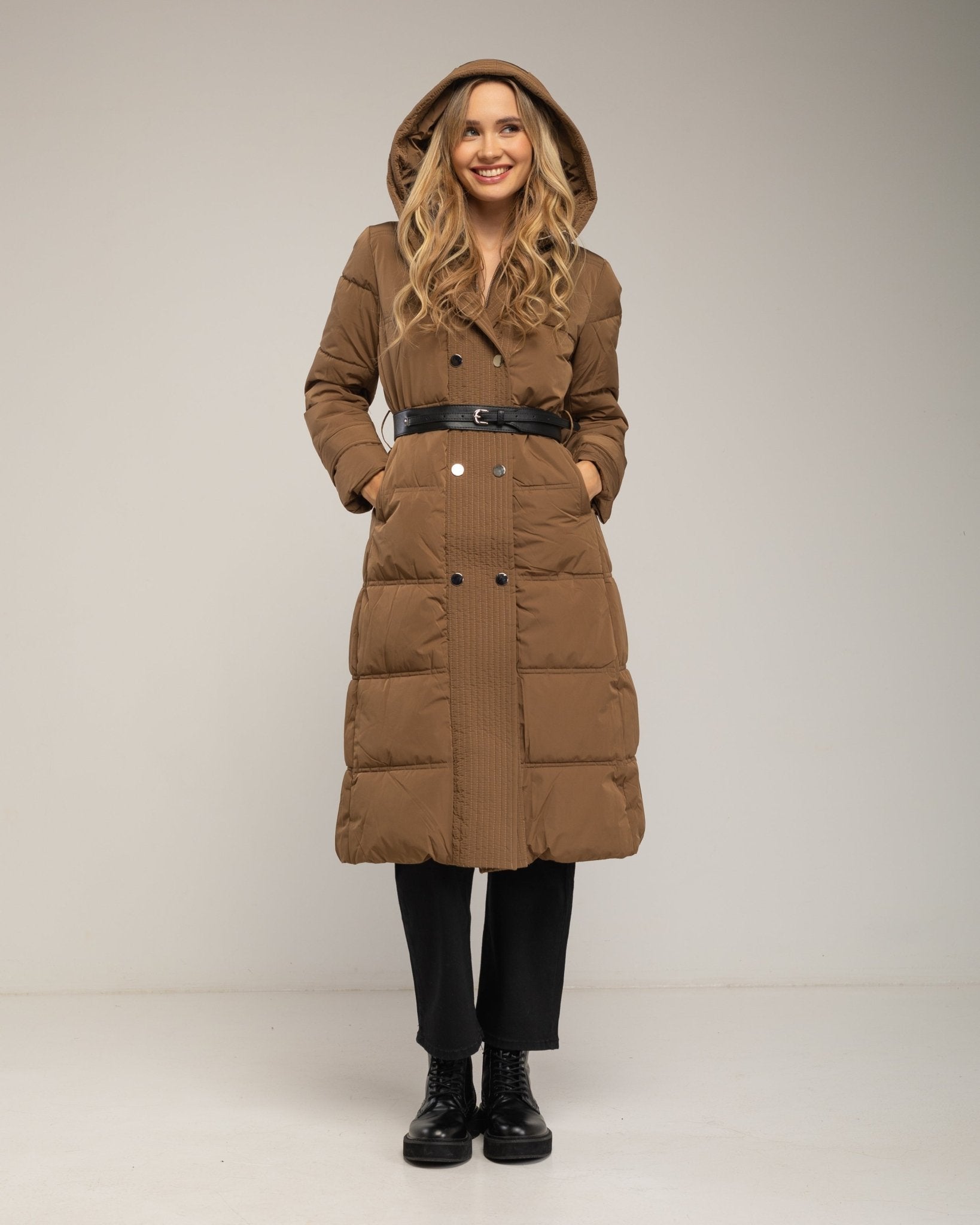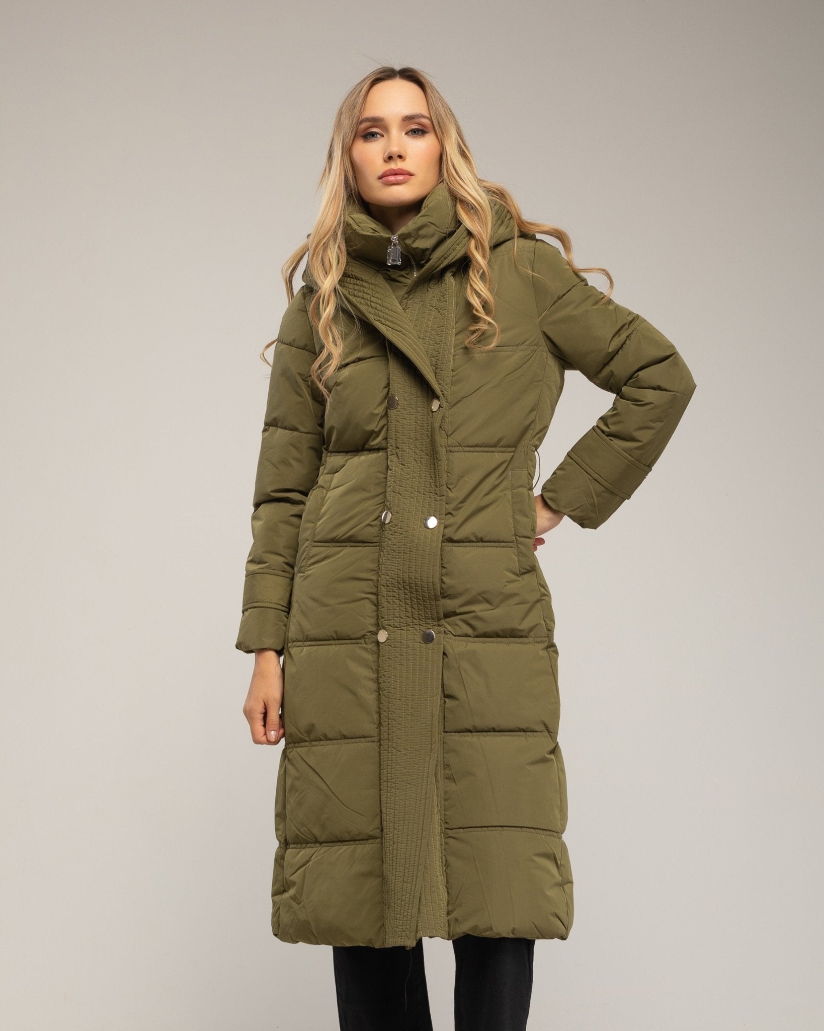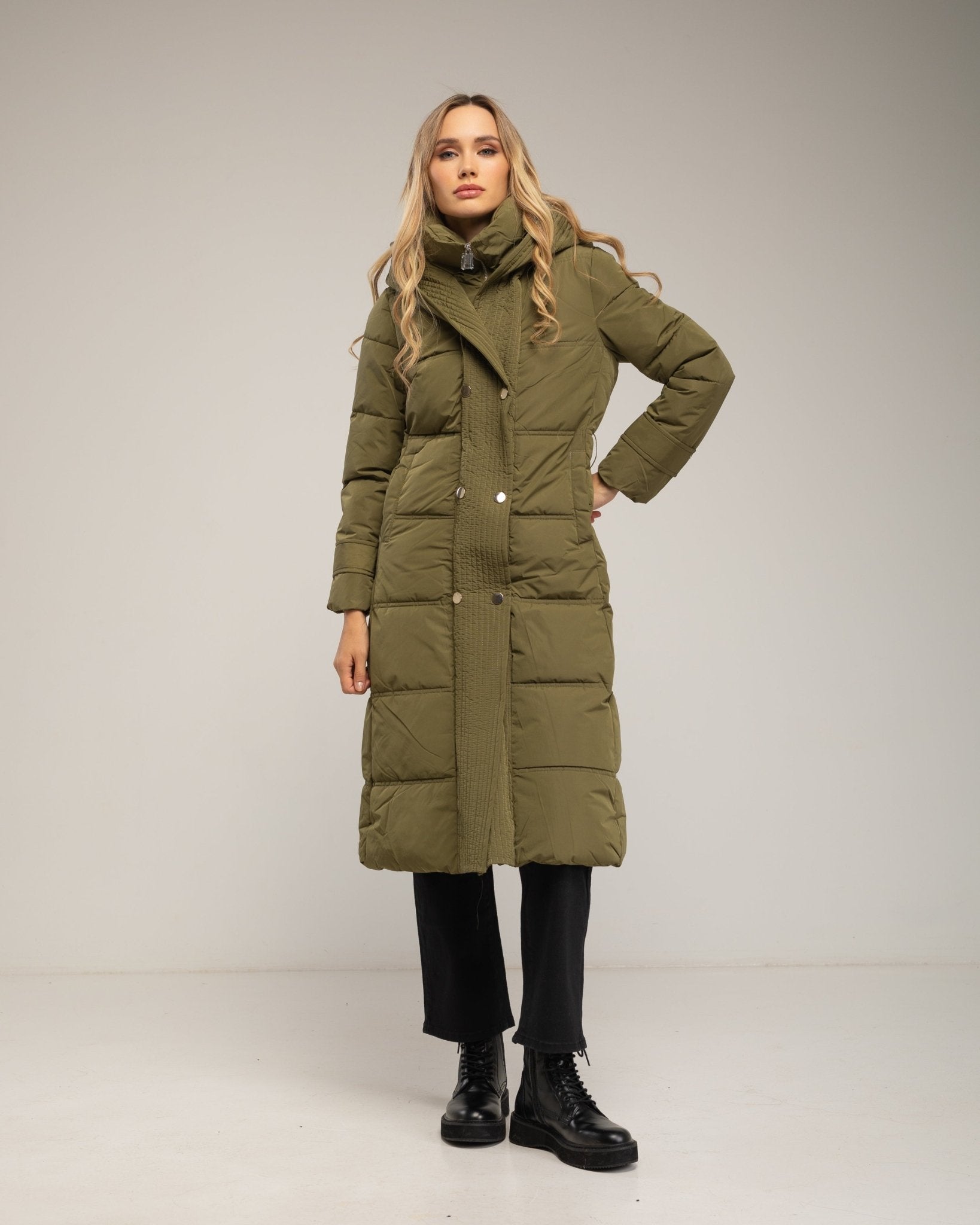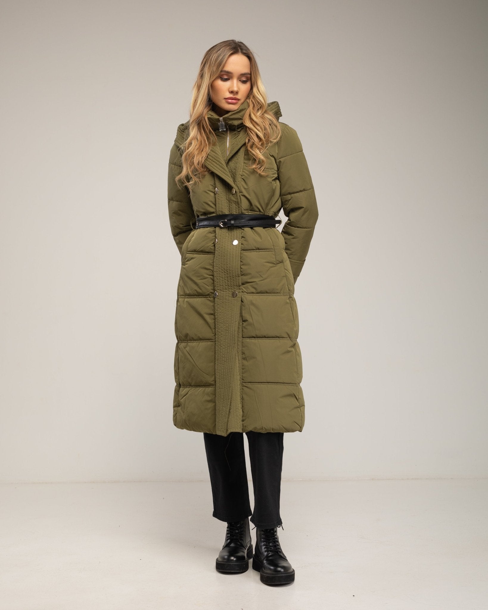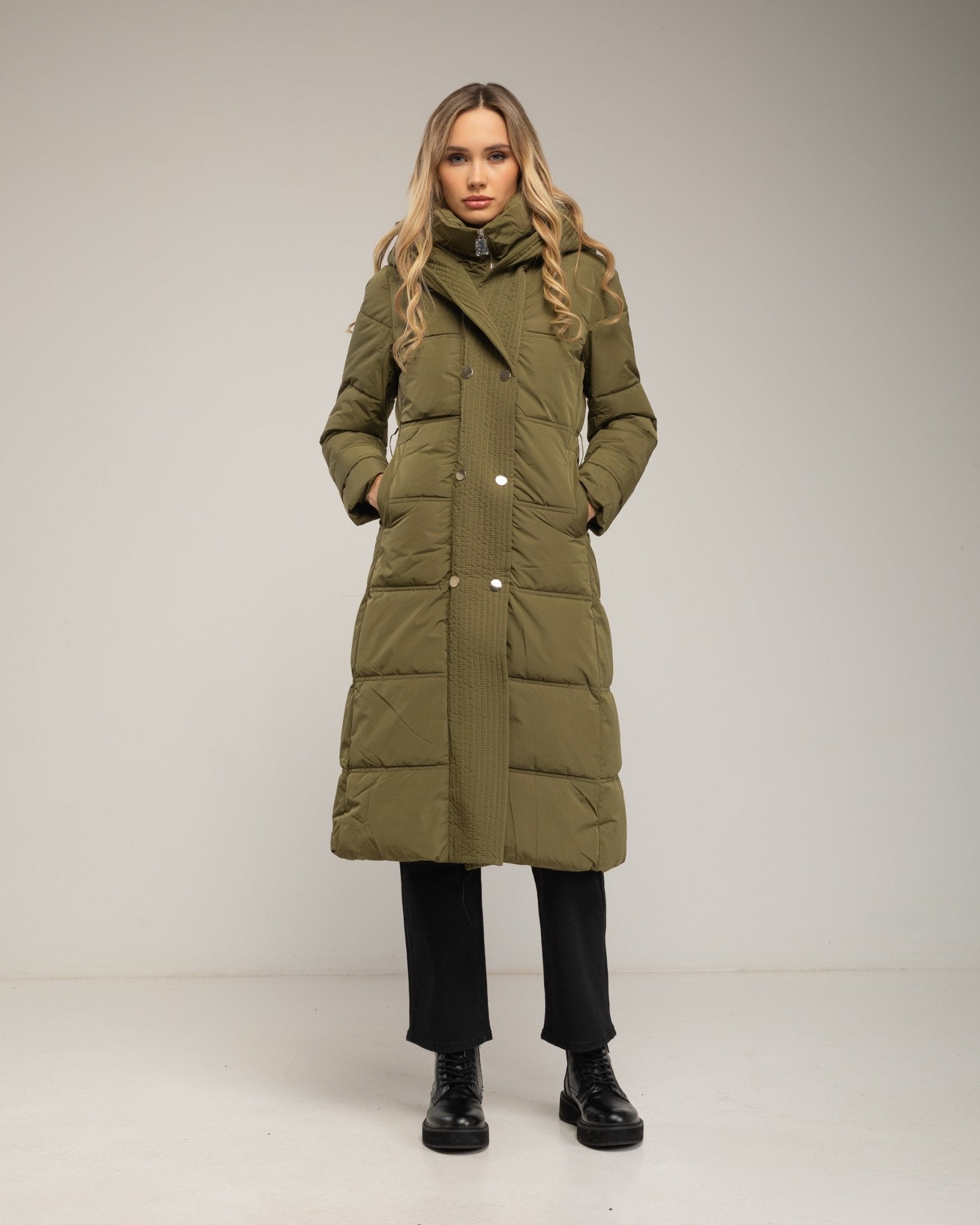 Este anorack largo acolchado ofrece abrigo y estilo con un diseño entallado que realza la silueta. Cuenta con capucha, doble cierre de cremallera y clip, y un cinturón aparte que permite ajustar la prenda a gusto. El detalle de costuras aporta un acabado moderno y estructurado, ideal para enfrentar el frío con elegancia.