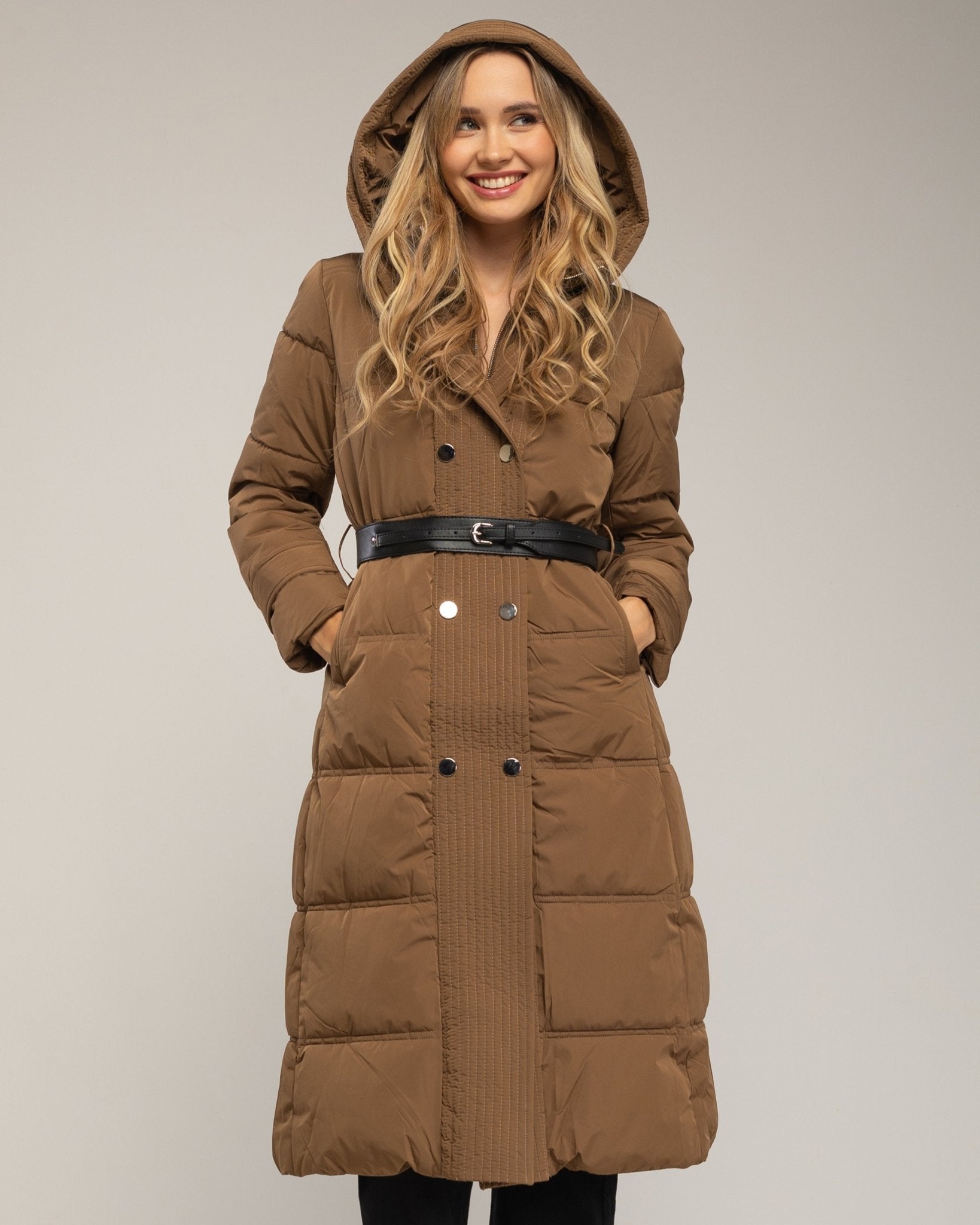 Detalles: capucha, doble cierre de cremallera y clip, cinturón independiente, costuras decorativas.