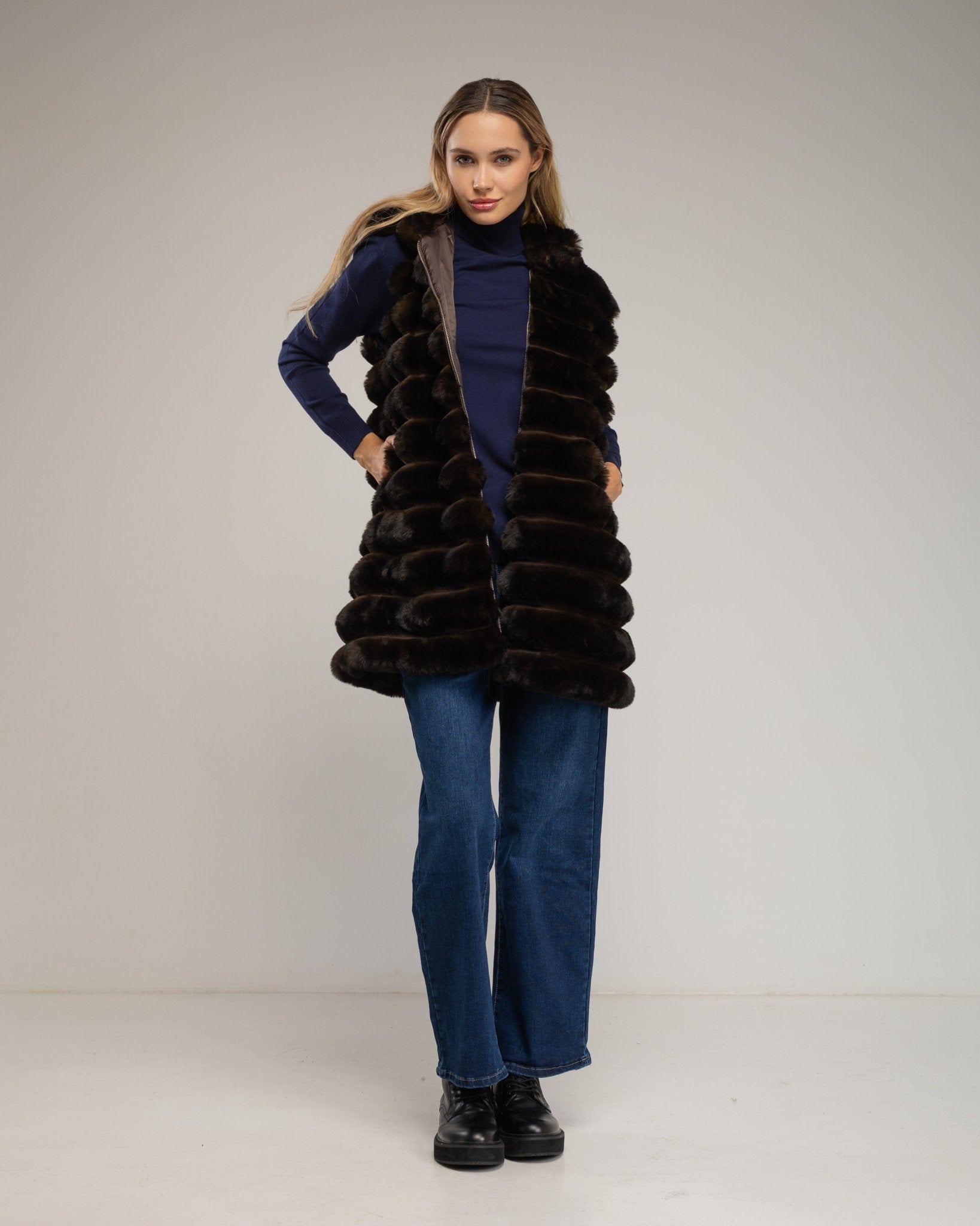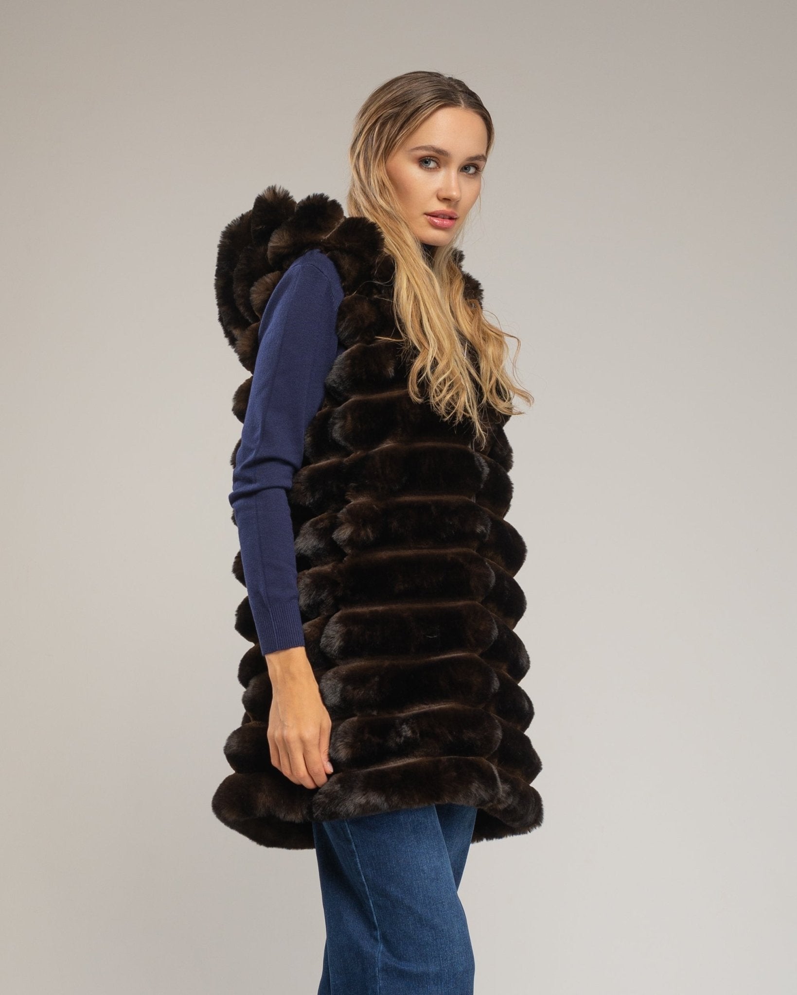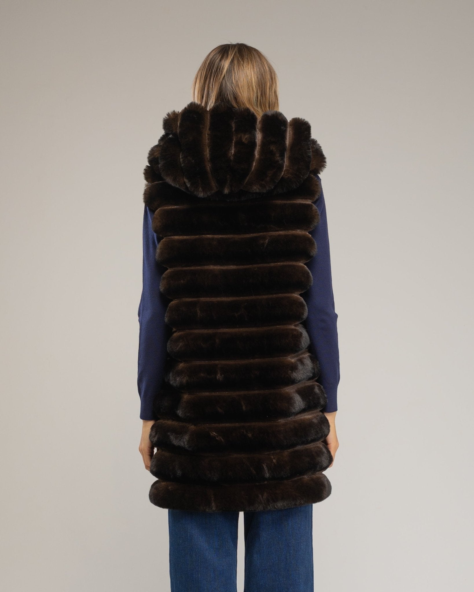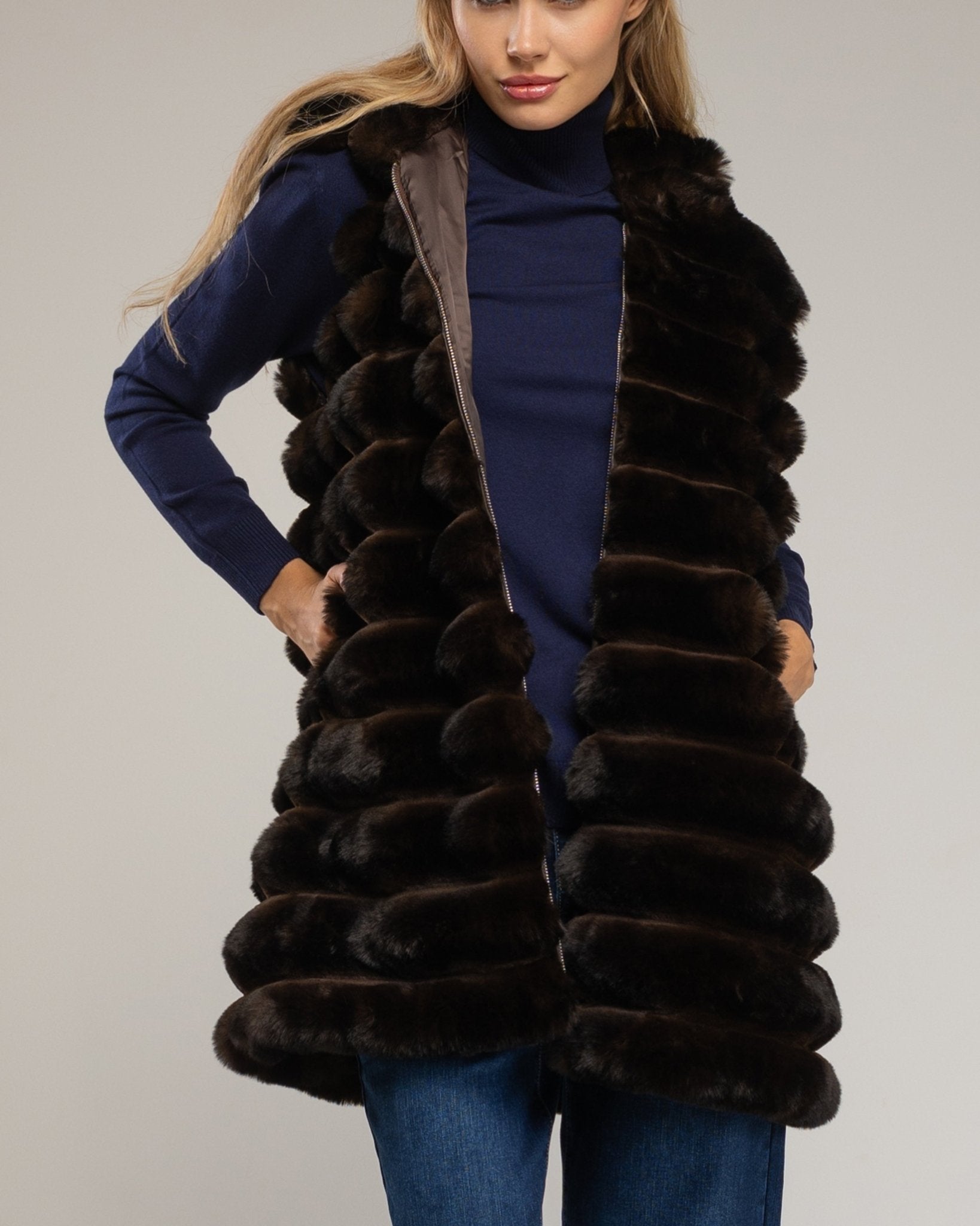 Chaleco largo de pelo sintetico con capucha, cierre de cremallera y bolsillos.