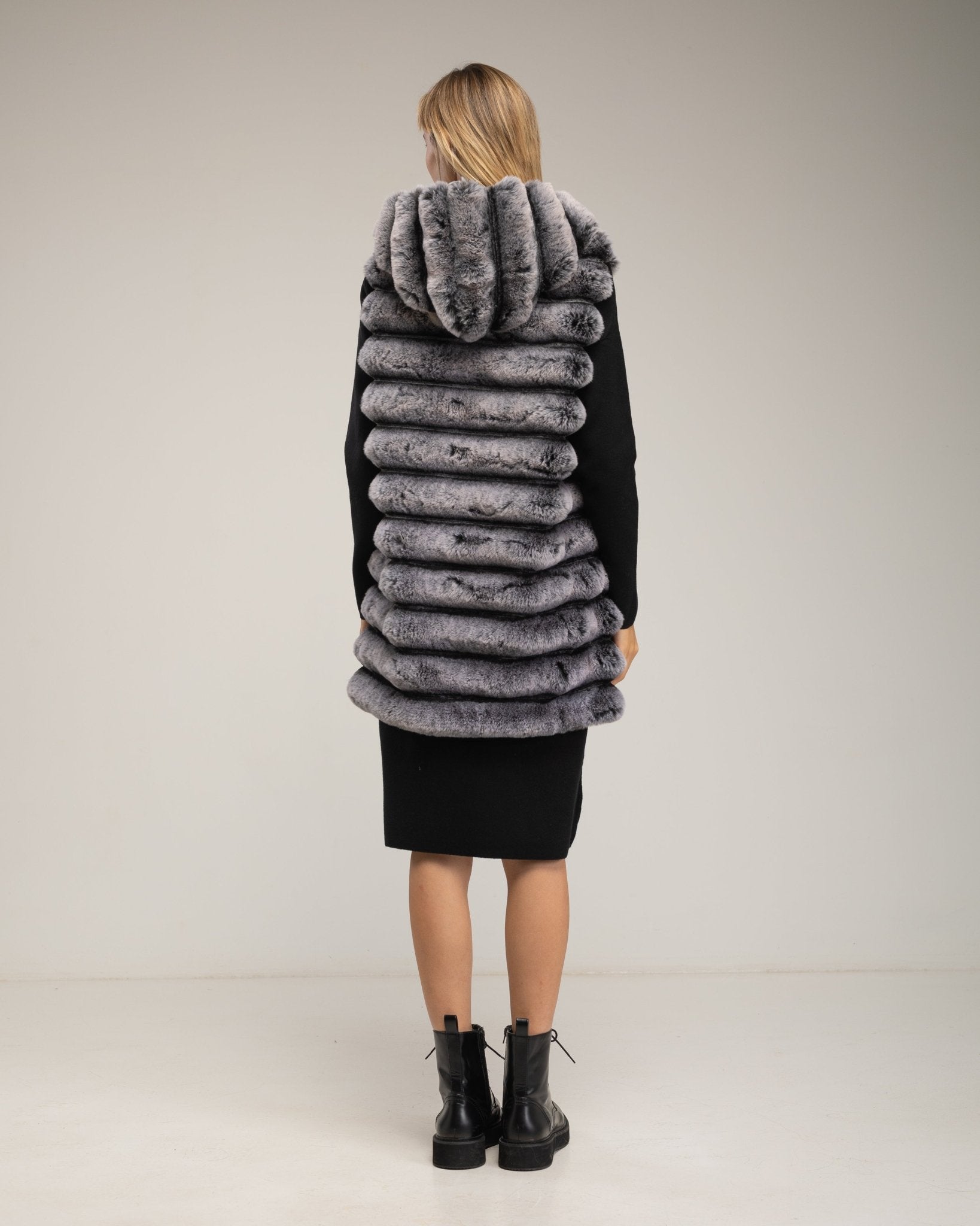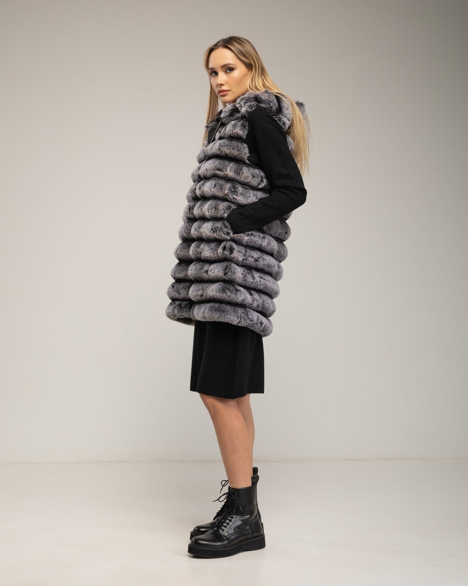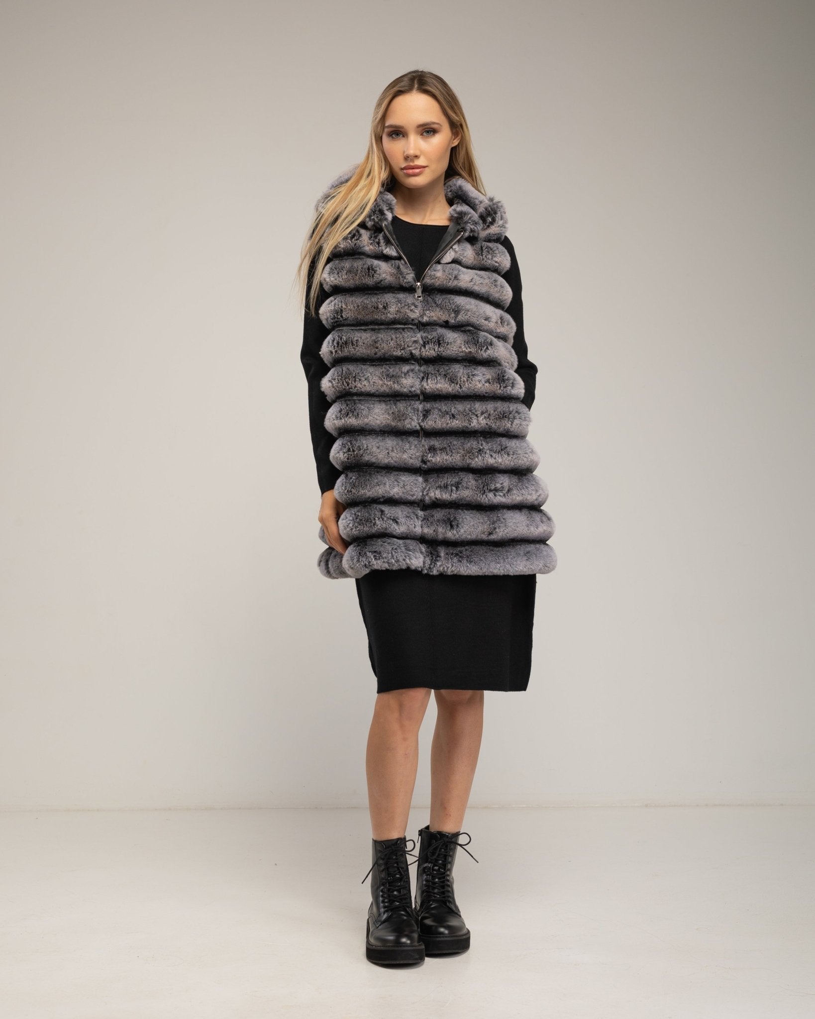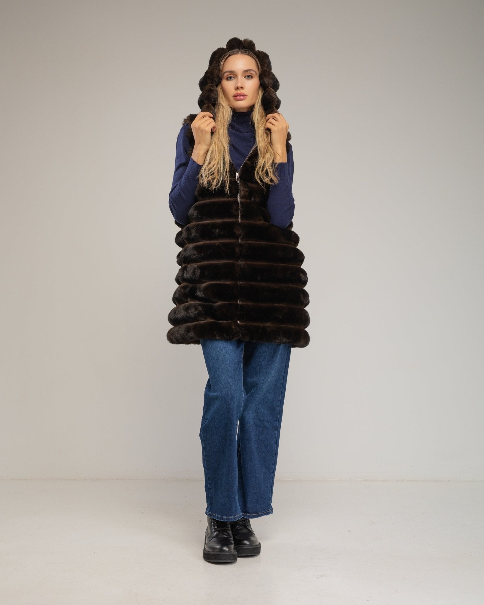 Chaleco largo de pelo sintetico con capucha, cierre de cremallera y bolsillos.