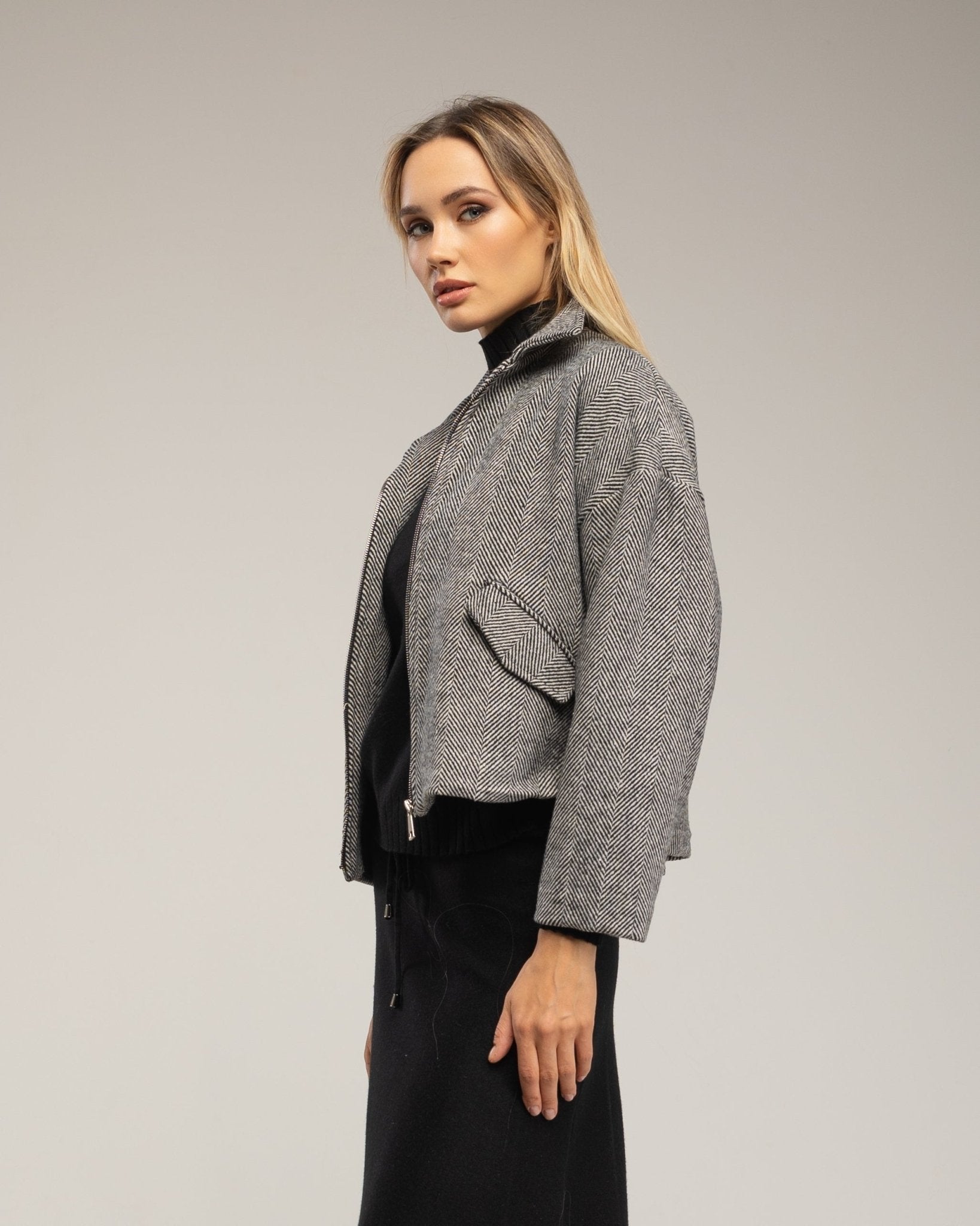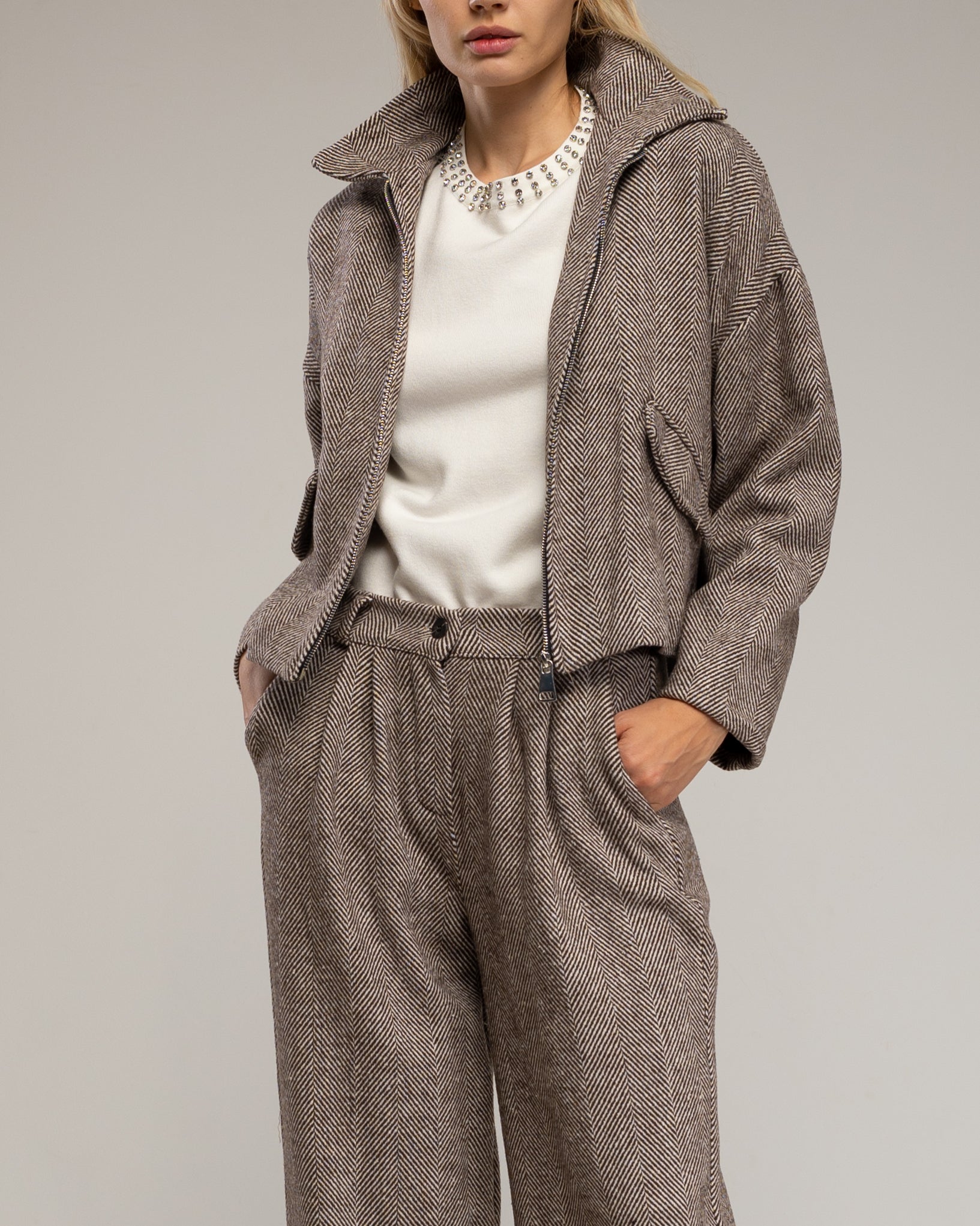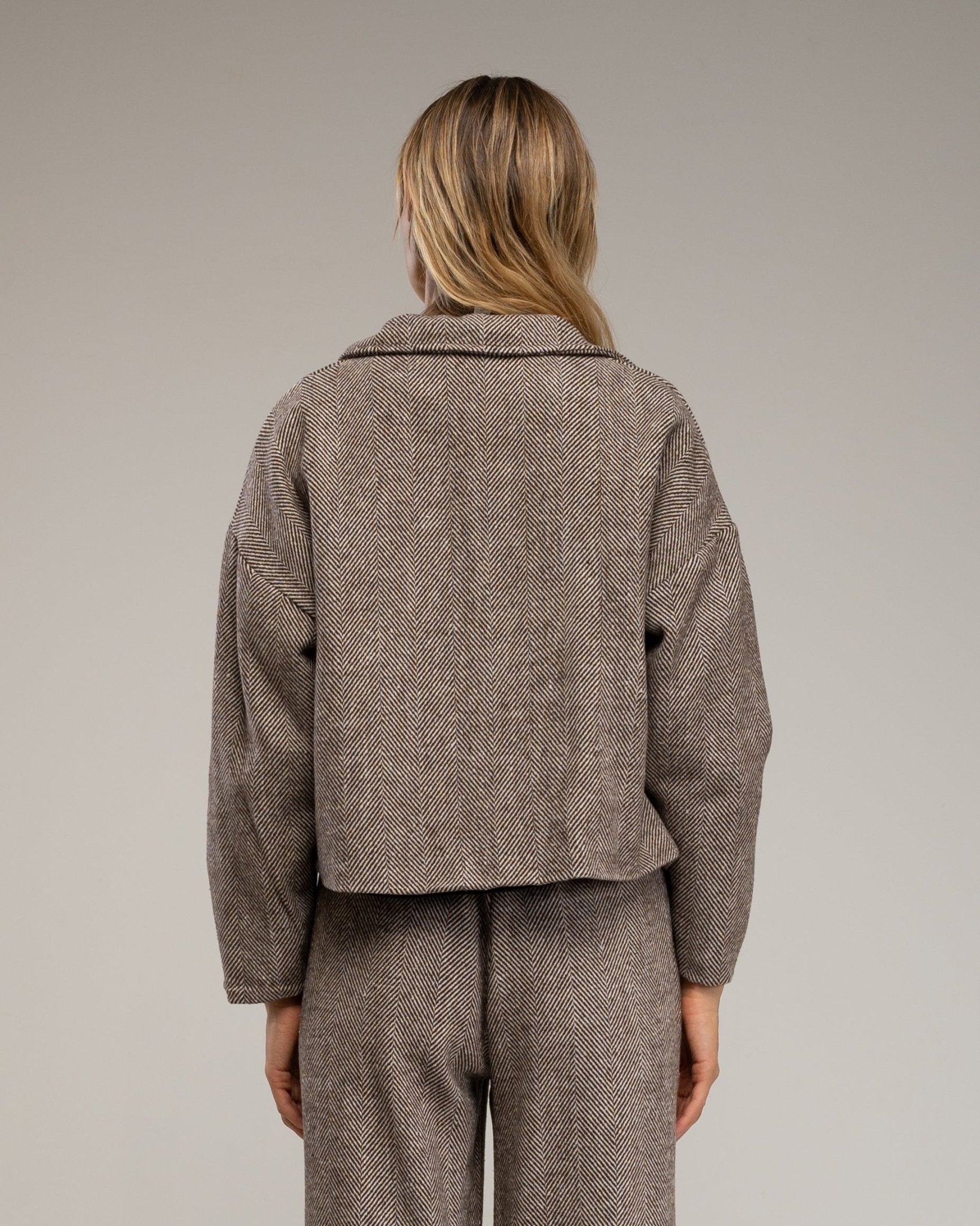 Esta chaqueta de espiguilla combina textura y funcionalidad en un diseño moderno y versátil. Presenta un cierre frontal con cremallera que facilita su uso, mientras que la sutil mezcla de poliéster y lana aporta calidez y durabilidad. Su forro interior garantiza comodidad y una caída perfecta, convirtiéndola en una prenda ideal para completar looks casuales o de oficina con estilo.