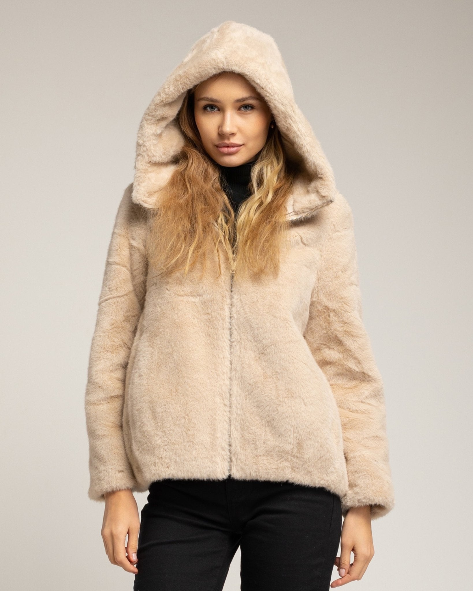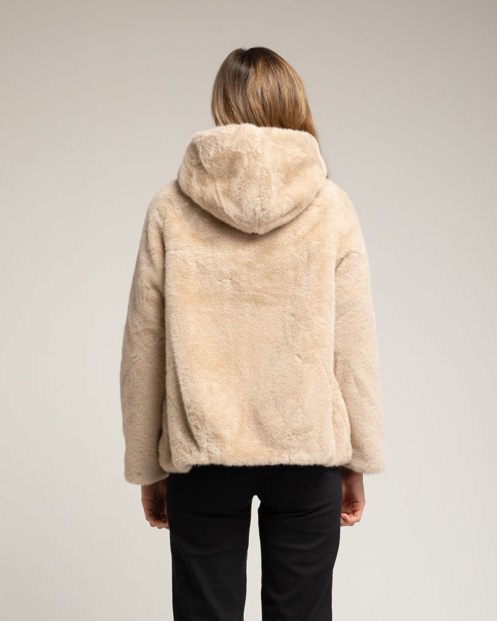 Chaqueta de pelo sintetico con capucha. Beige.