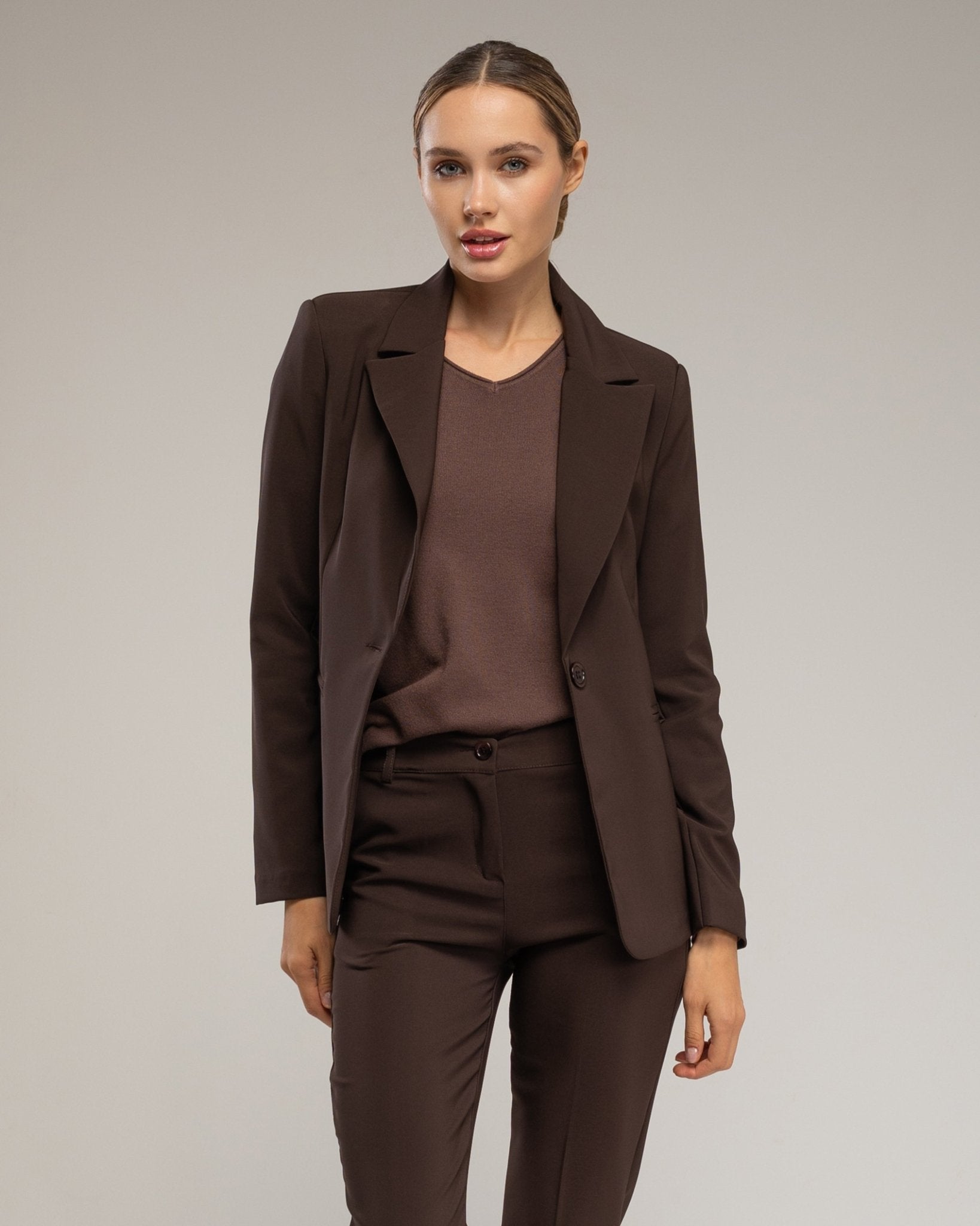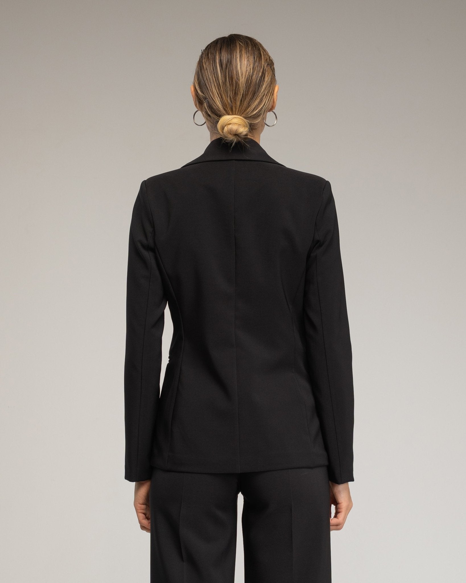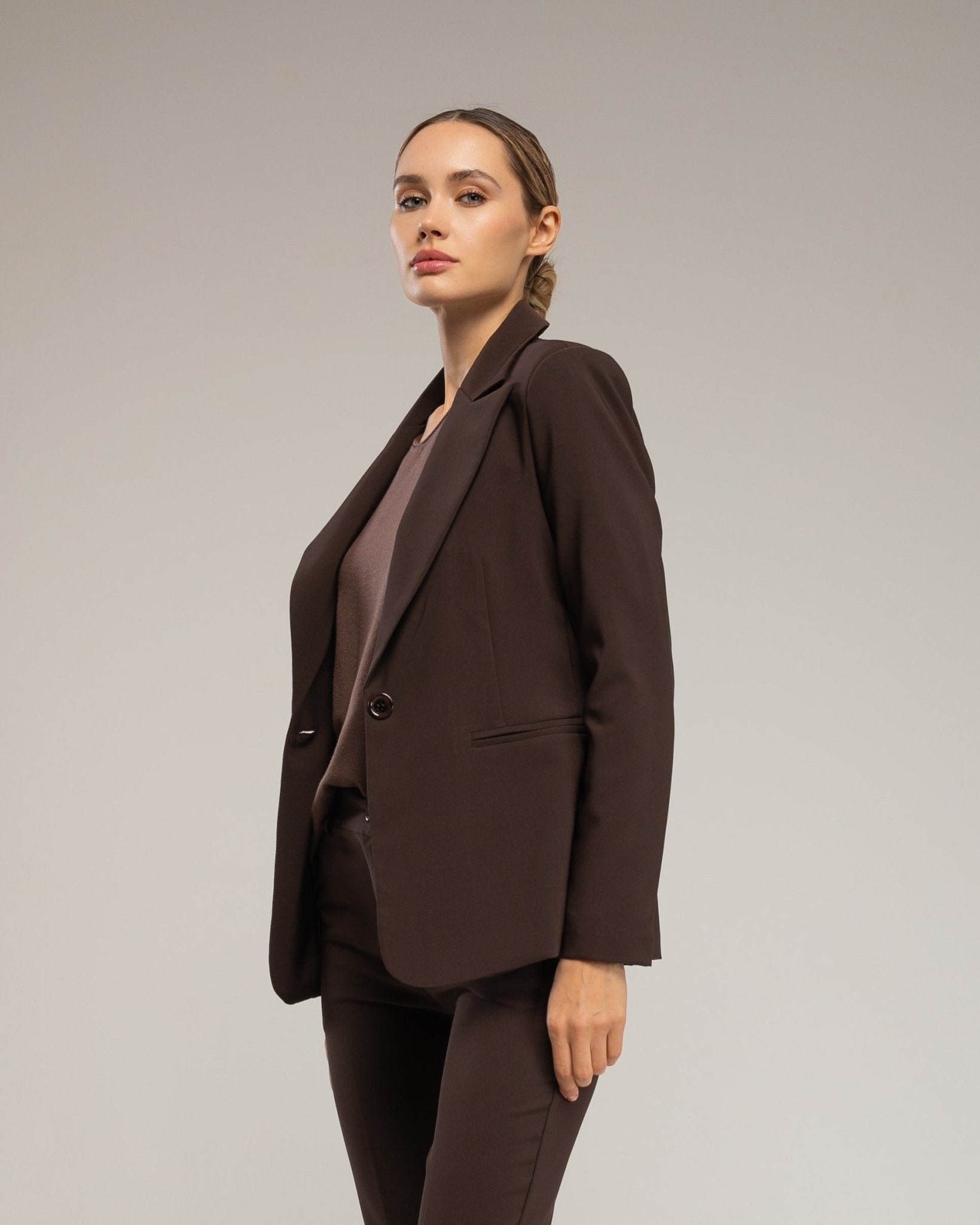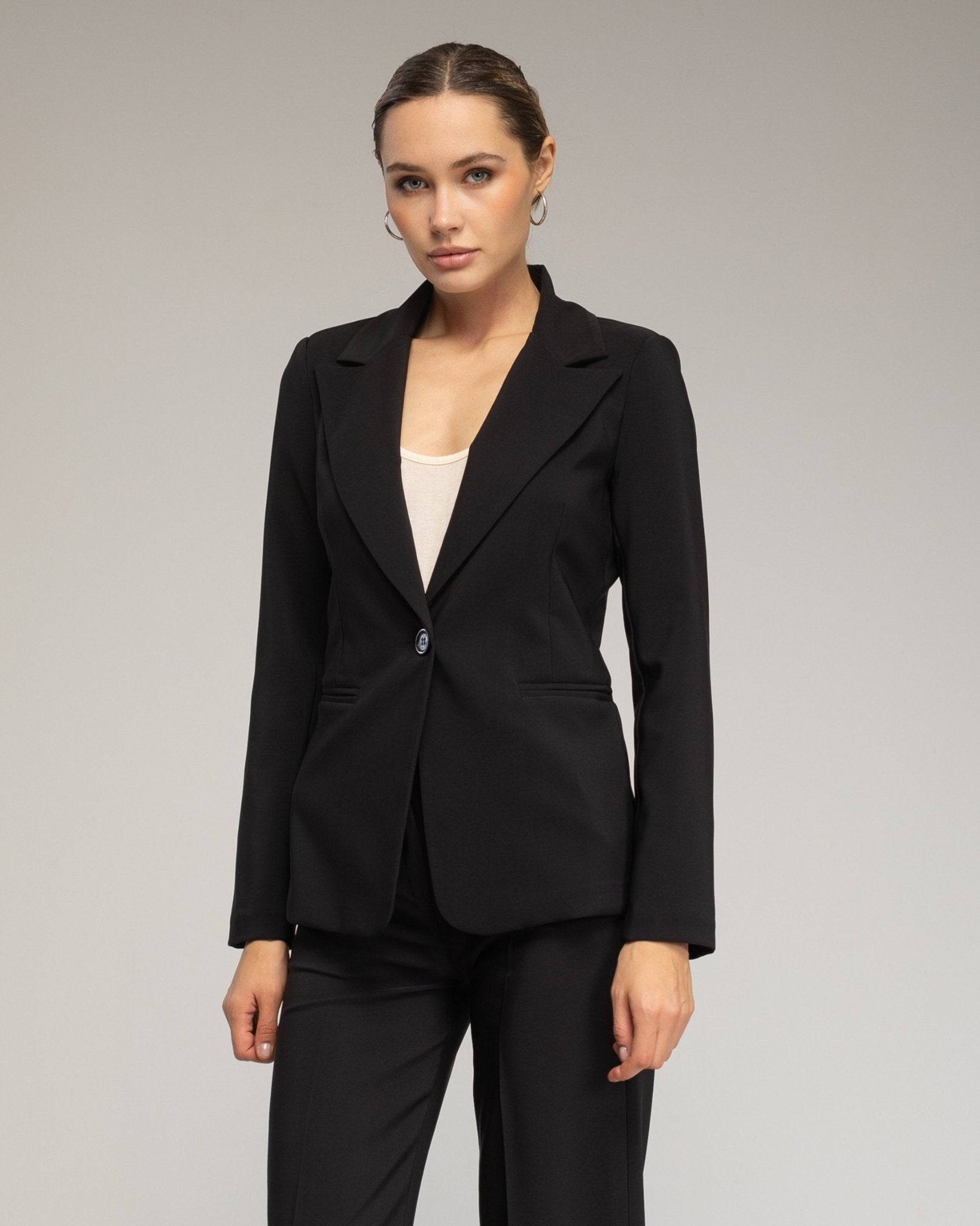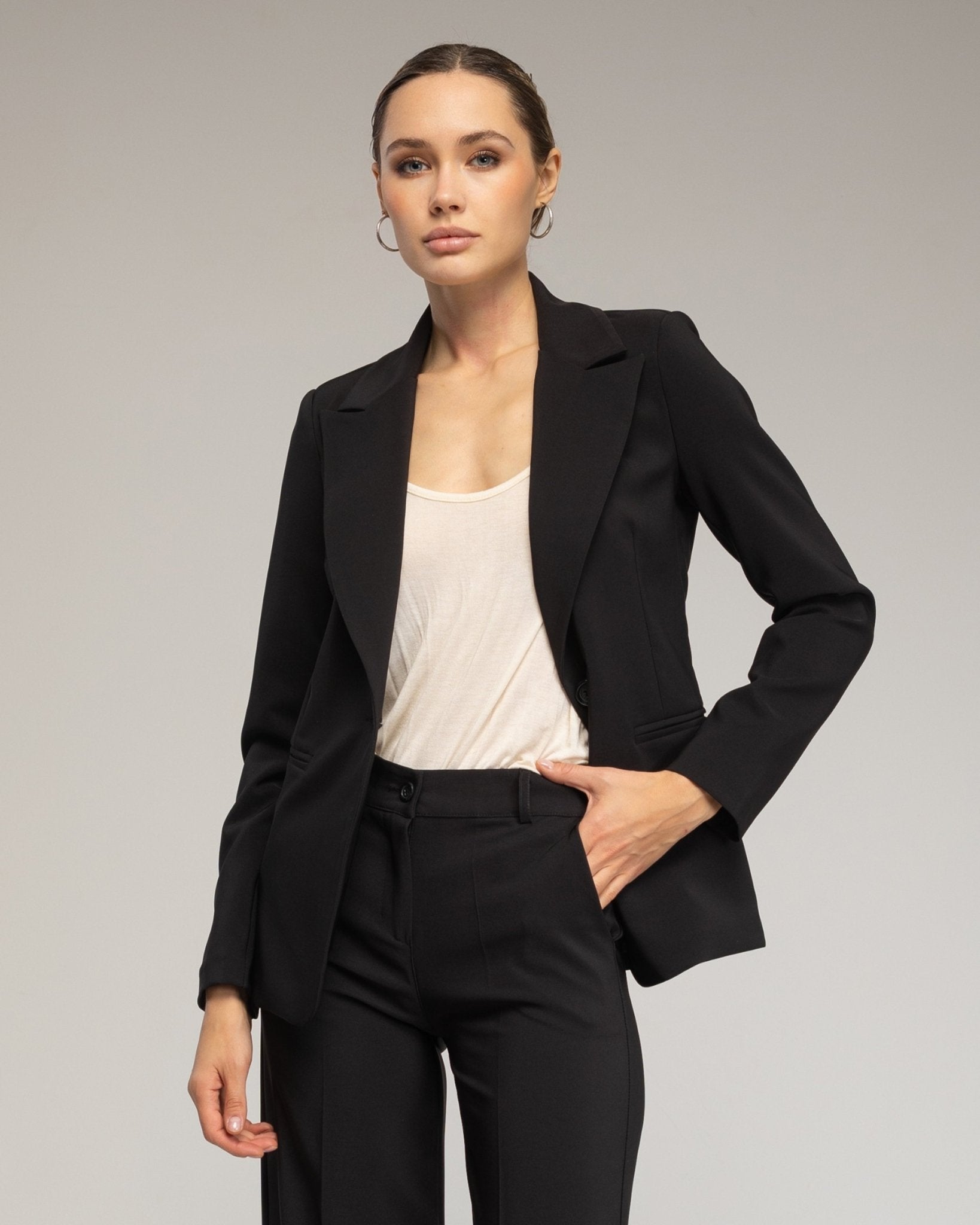 Esta chaqueta entallada combina elegancia y versatilidad en un diseño clásico con toques contemporáneos. Presenta solapas estructuradas, cierre frontal con un solo botón y bolsillos falsos que aportan un acabado pulido y sofisticado. Su tejido con ligera elasticidad ofrece un ajuste cómodo y favorecedor, ideal para completar looks formales o casuales con estilo.