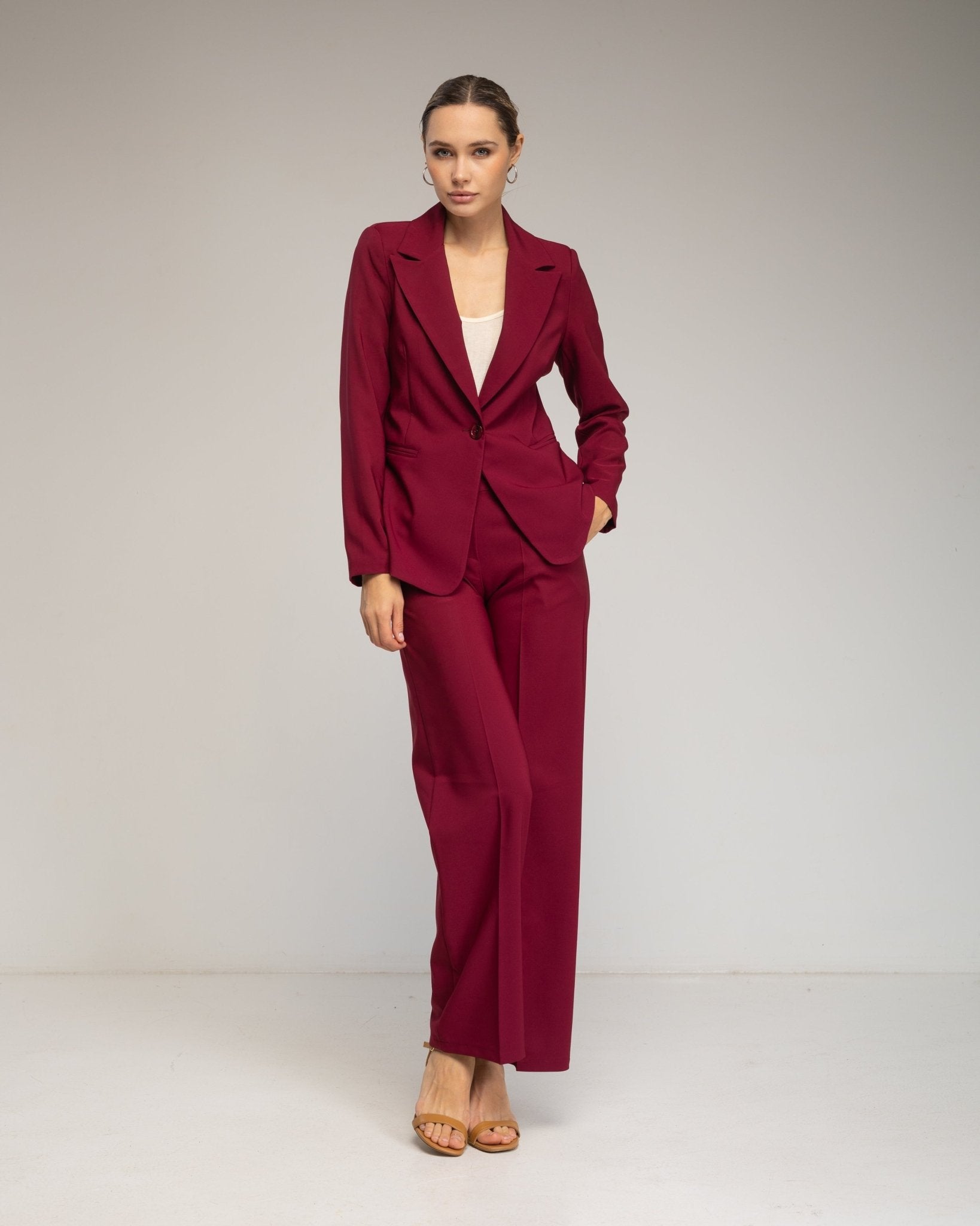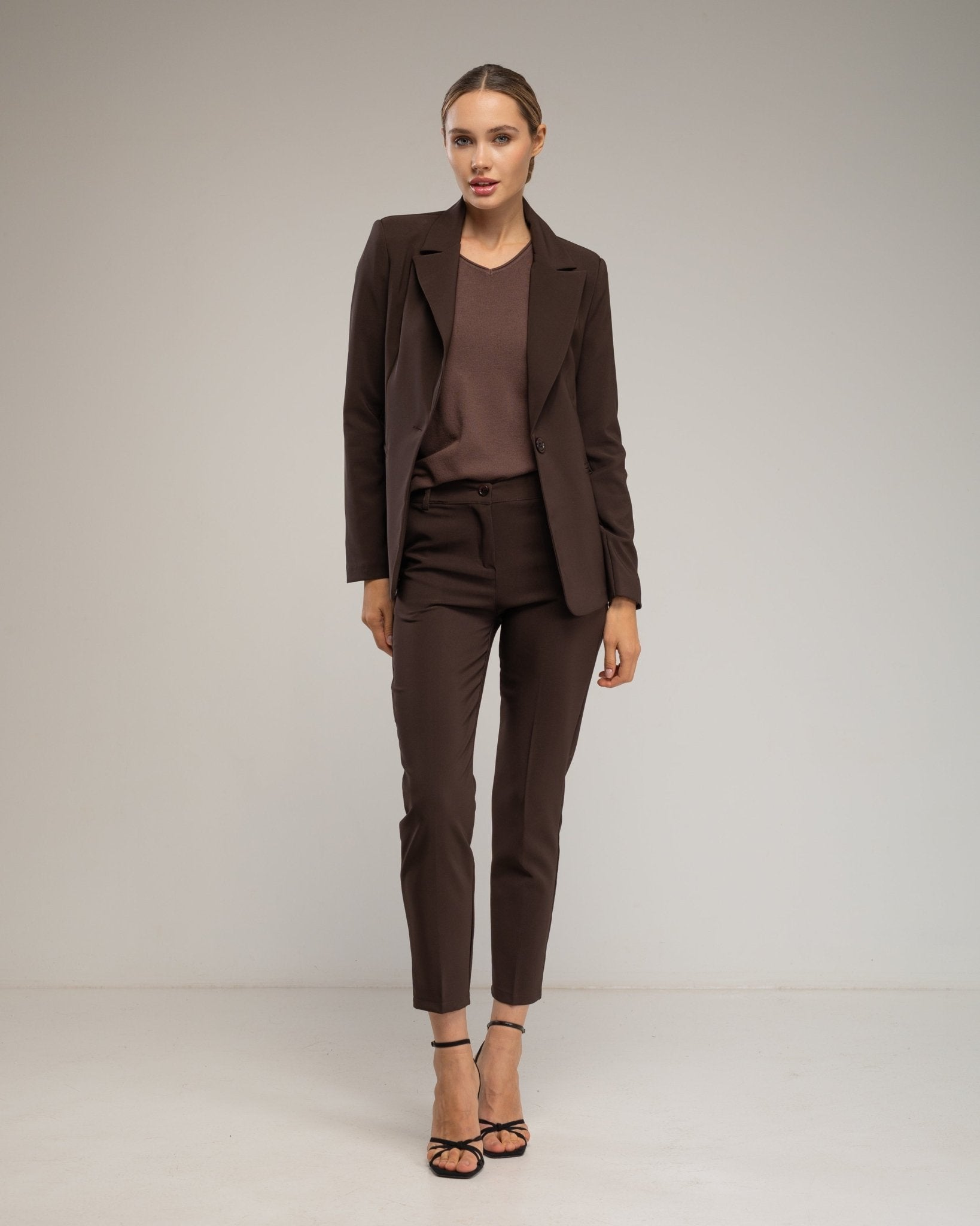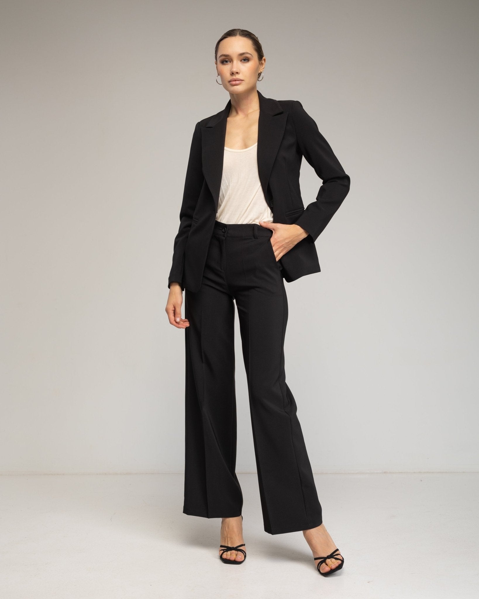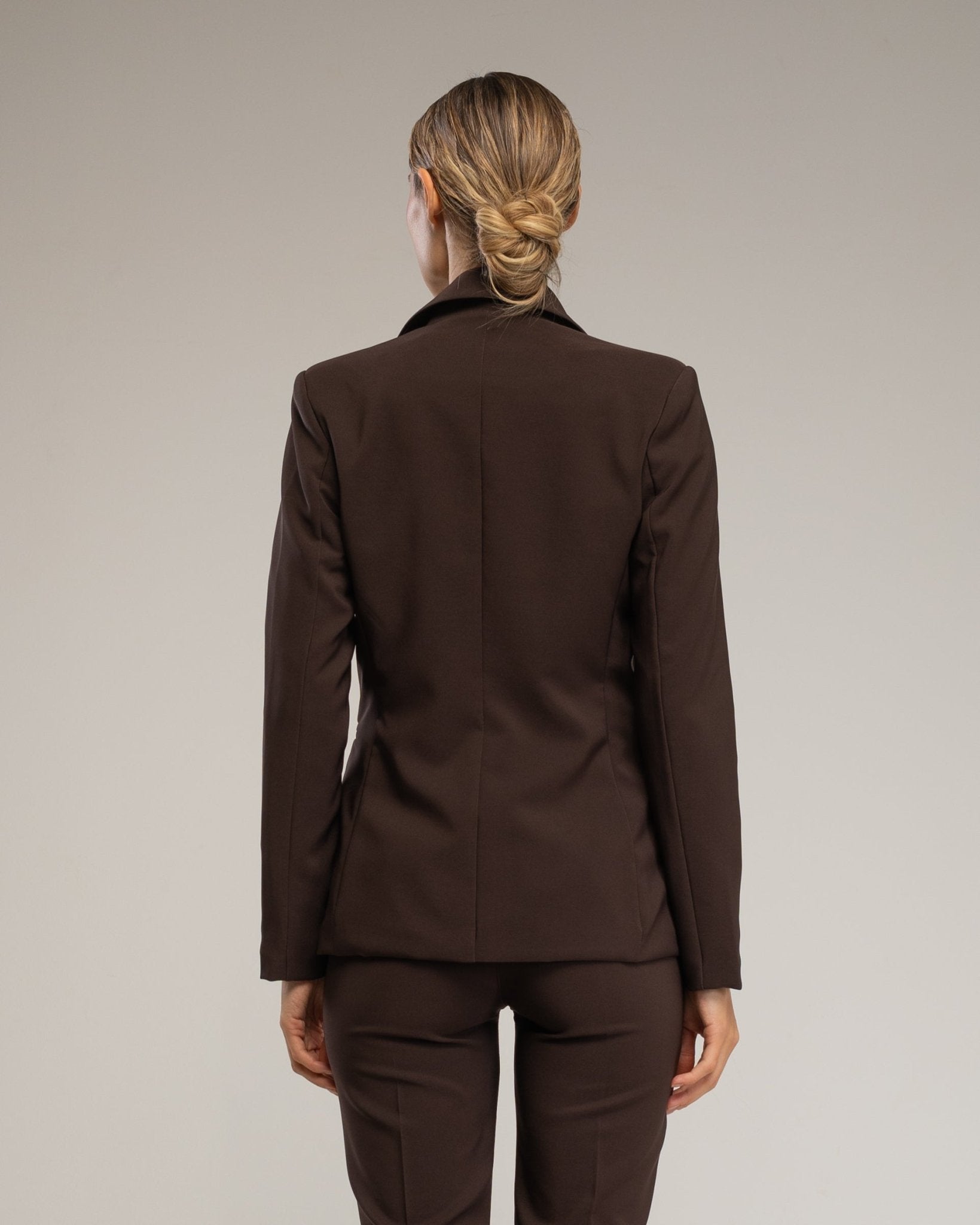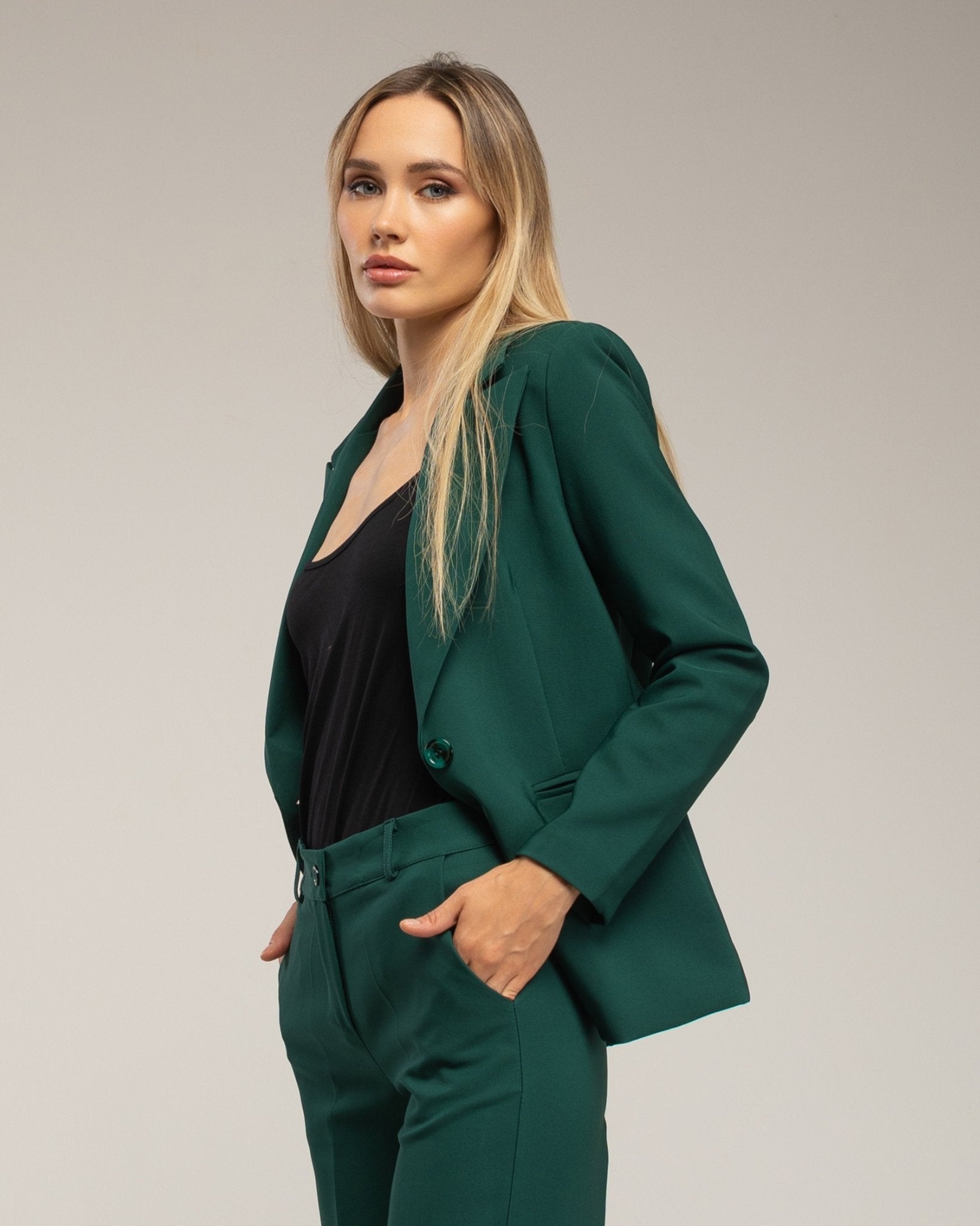 Esta chaqueta entallada combina elegancia y versatilidad en un diseño clásico con toques contemporáneos. Presenta solapas estructuradas, cierre frontal con un solo botón y bolsillos falsos que aportan un acabado pulido y sofisticado. Su tejido con ligera elasticidad ofrece un ajuste cómodo y favorecedor, ideal para completar looks formales o casuales con estilo.