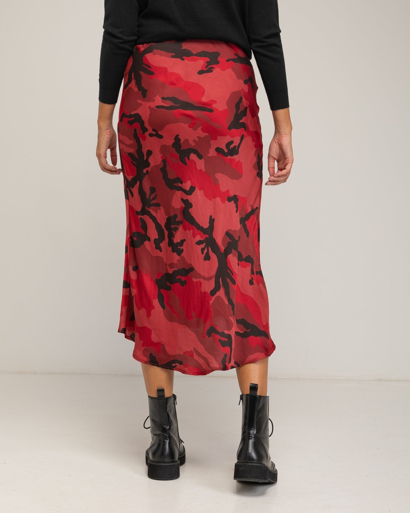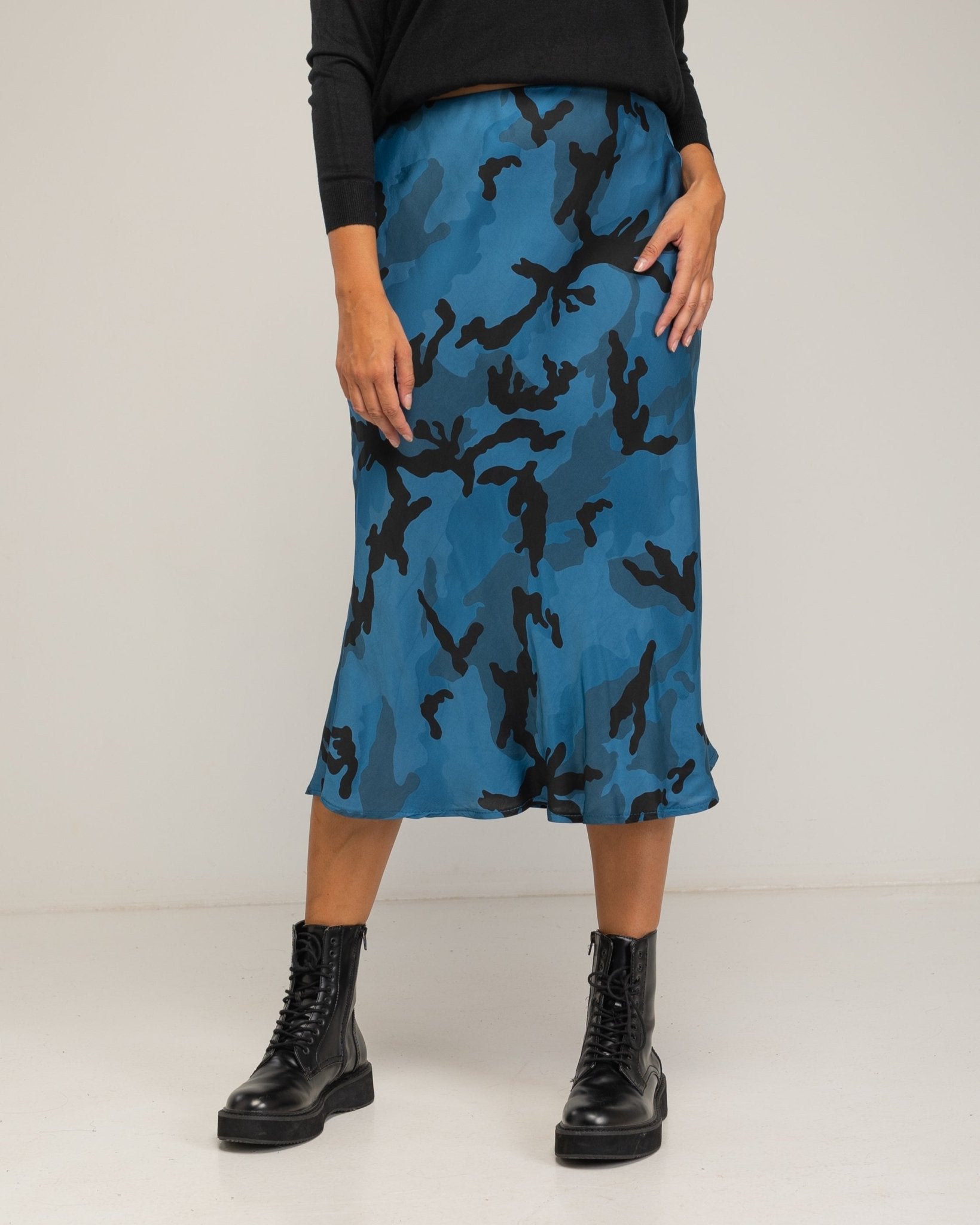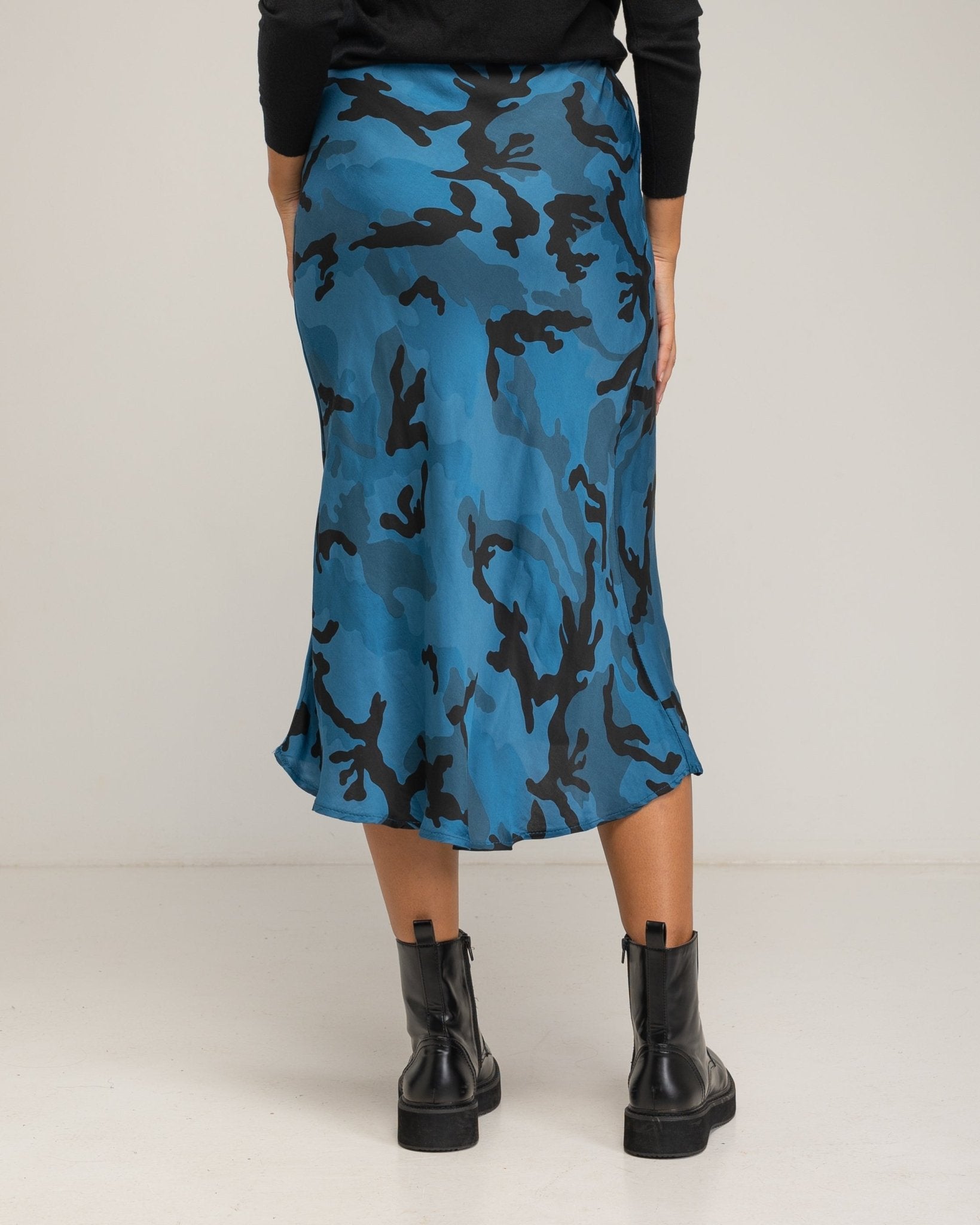 Falda estampada midi con seda, vuelo y cintura elástica.