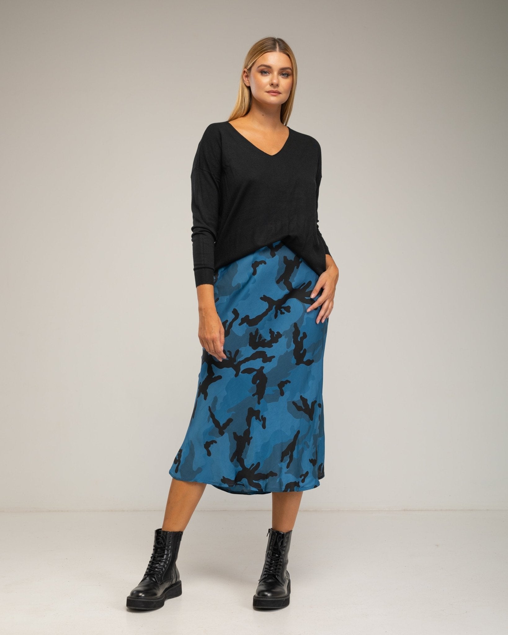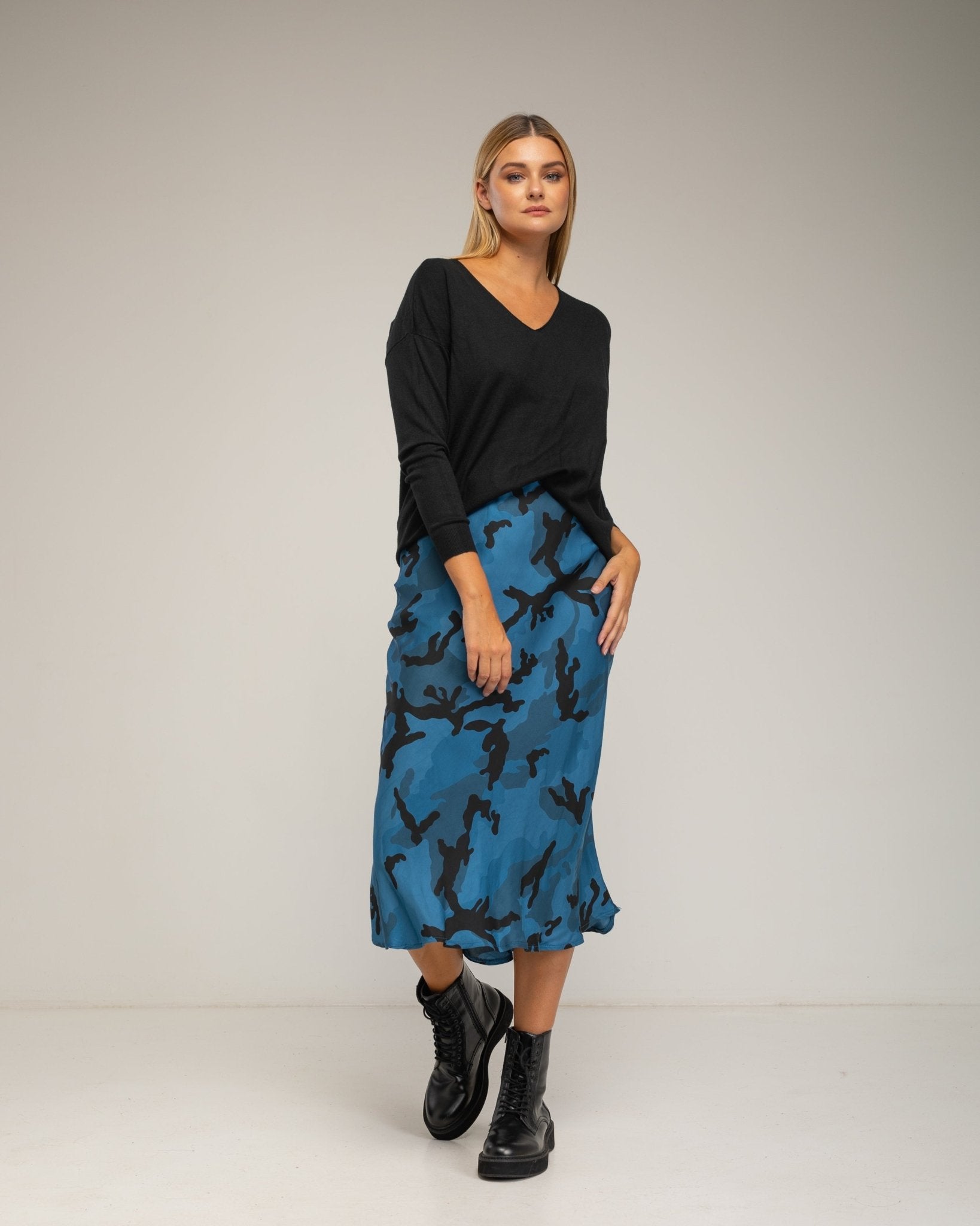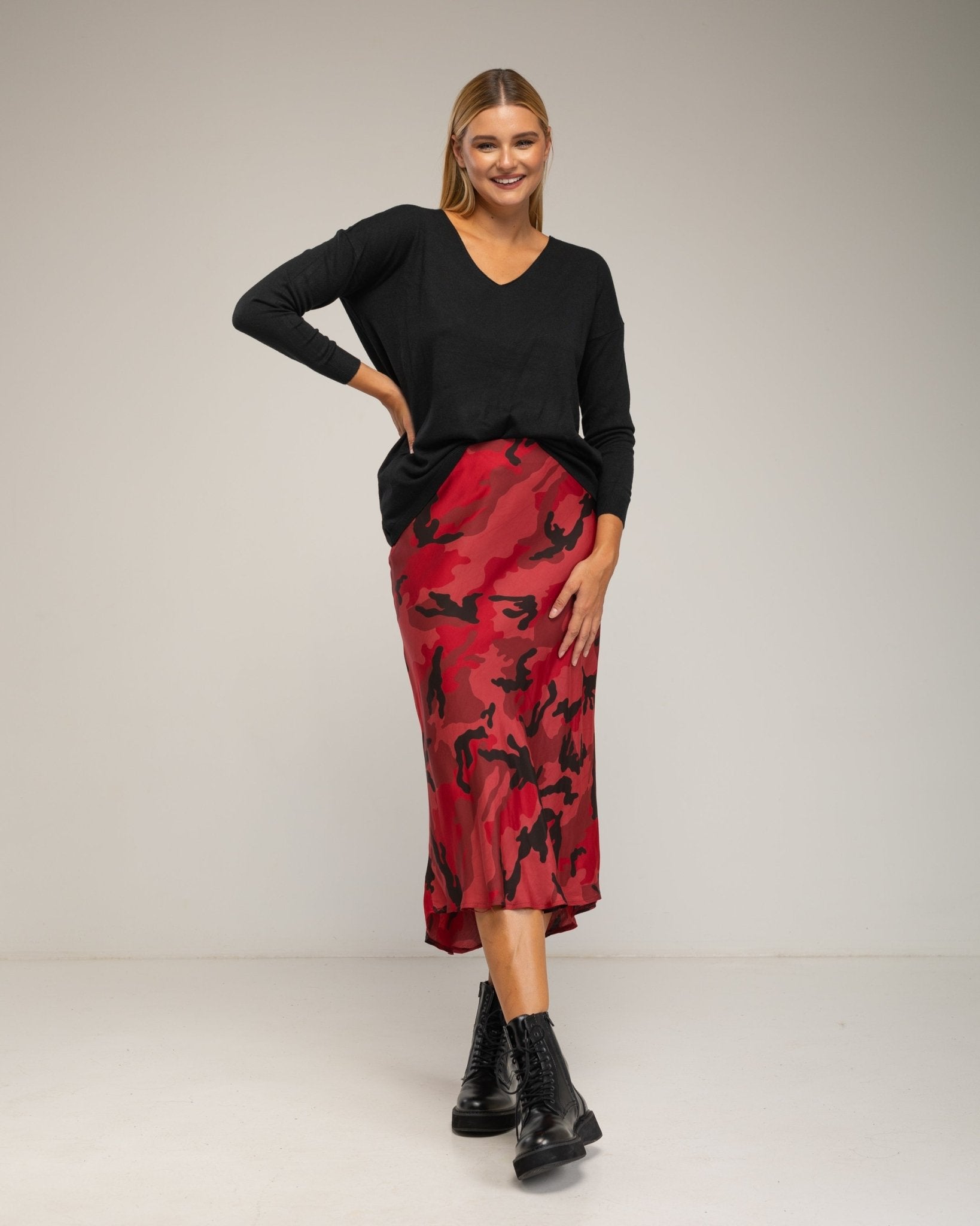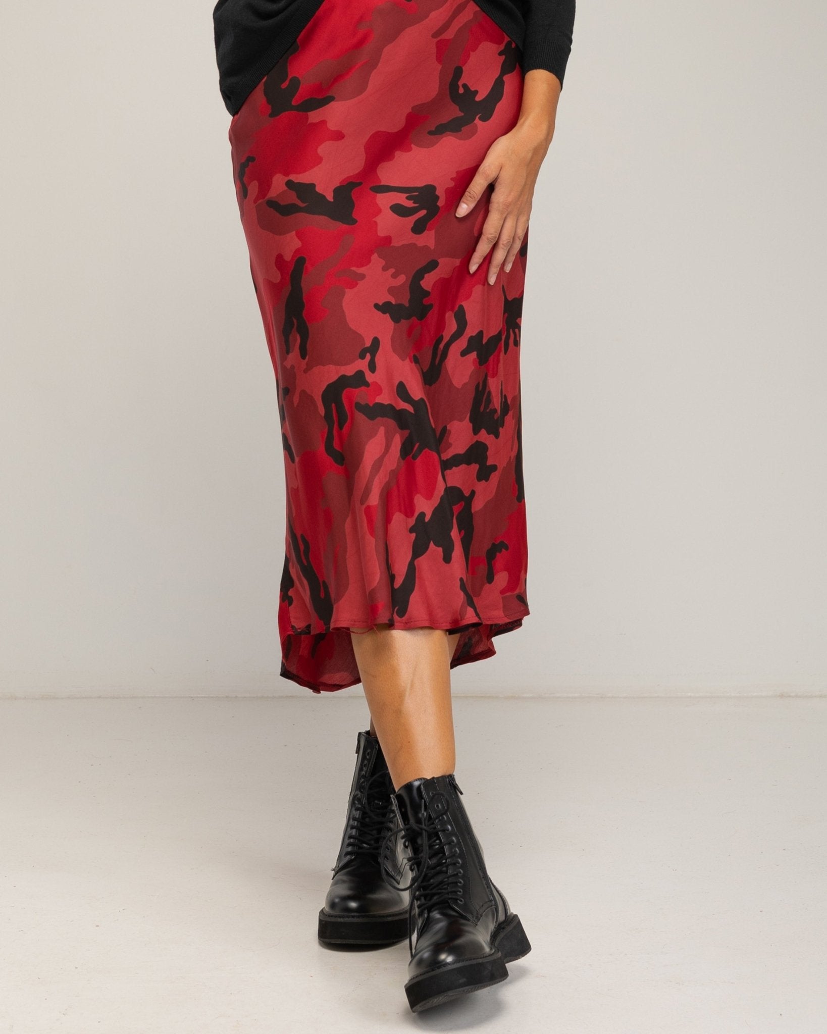 Falda estampada midi con seda, vuelo y cintura elástica.