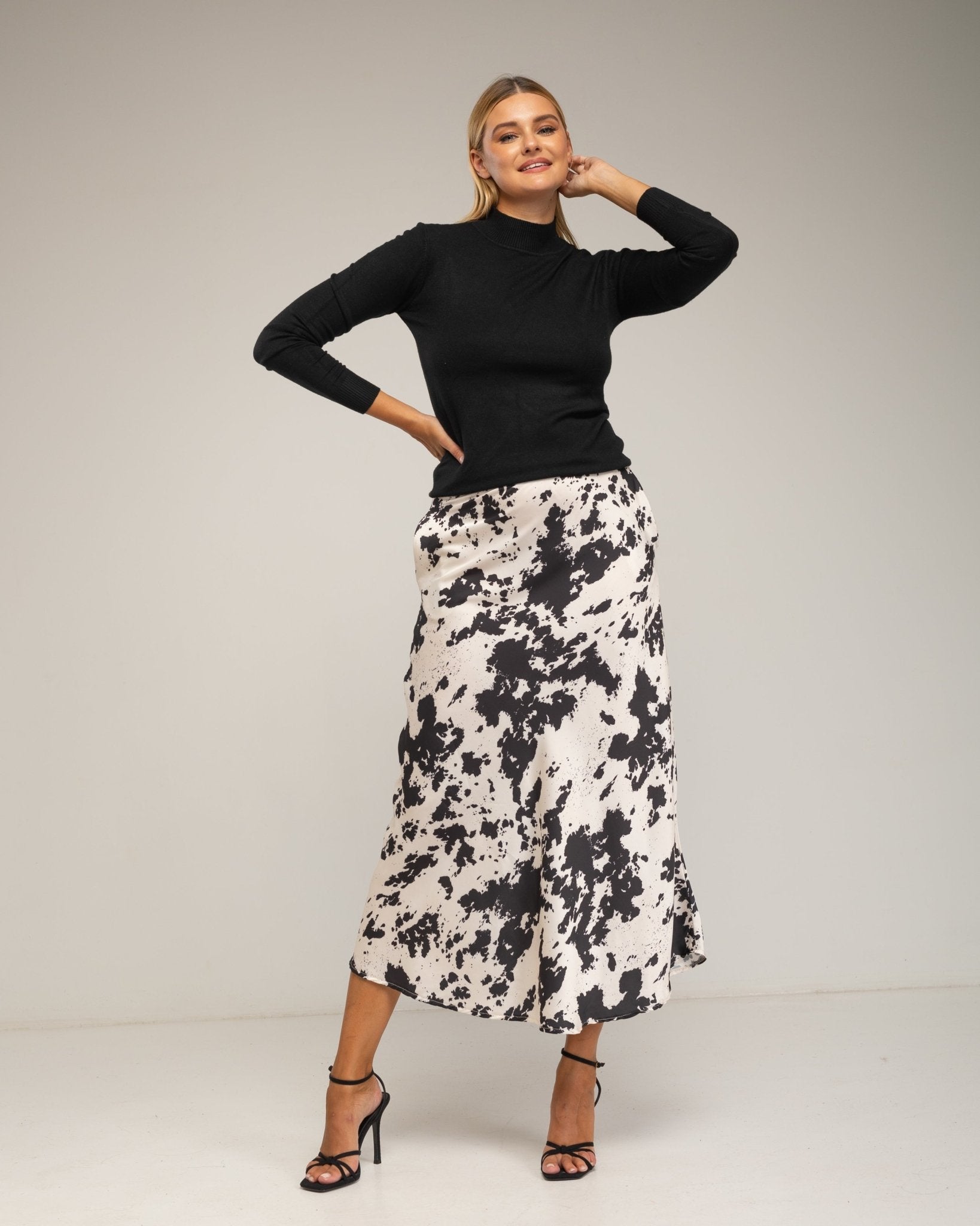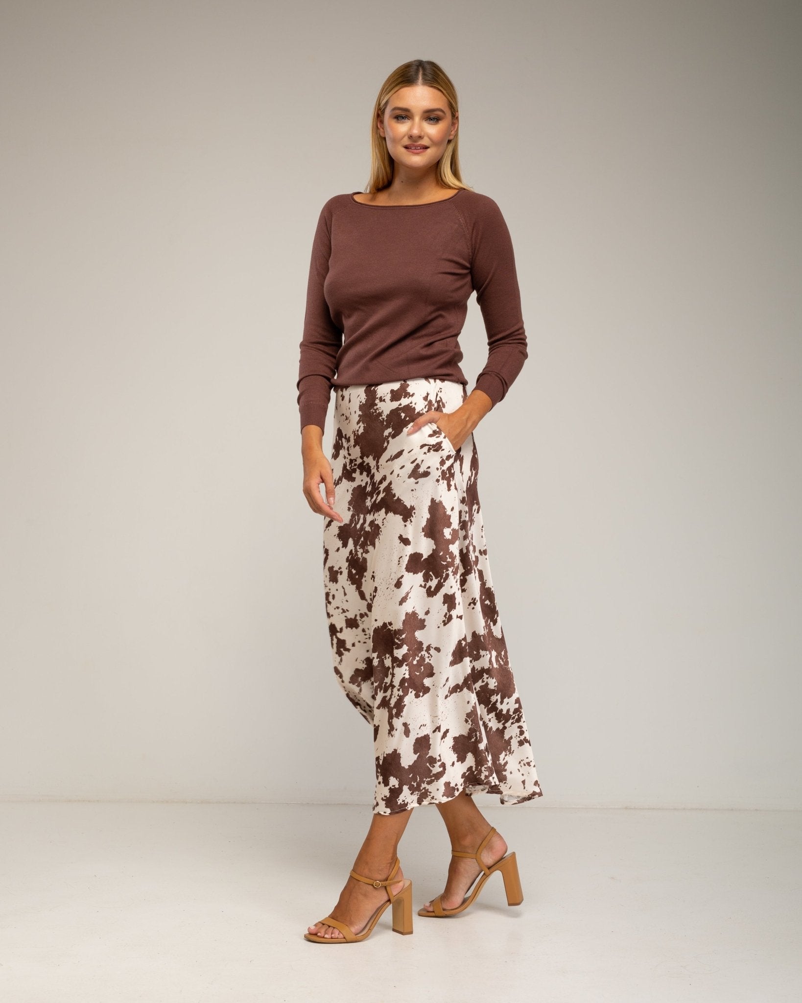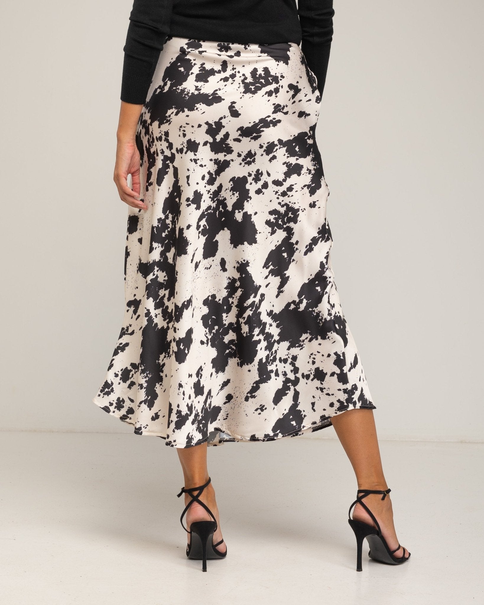 Falda midi de vuelo con seda, estampado de vaca, bolsillos y cintura elástica.