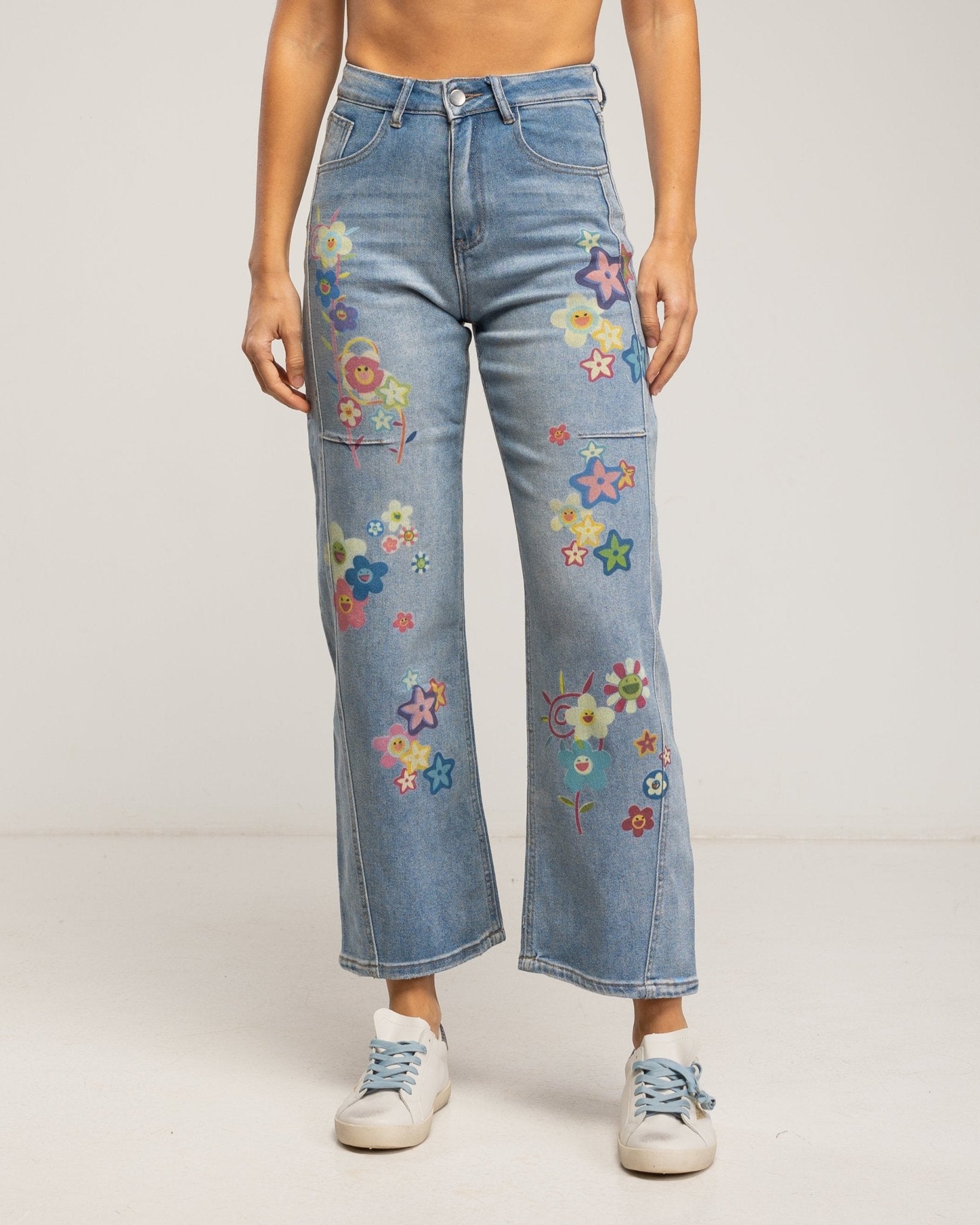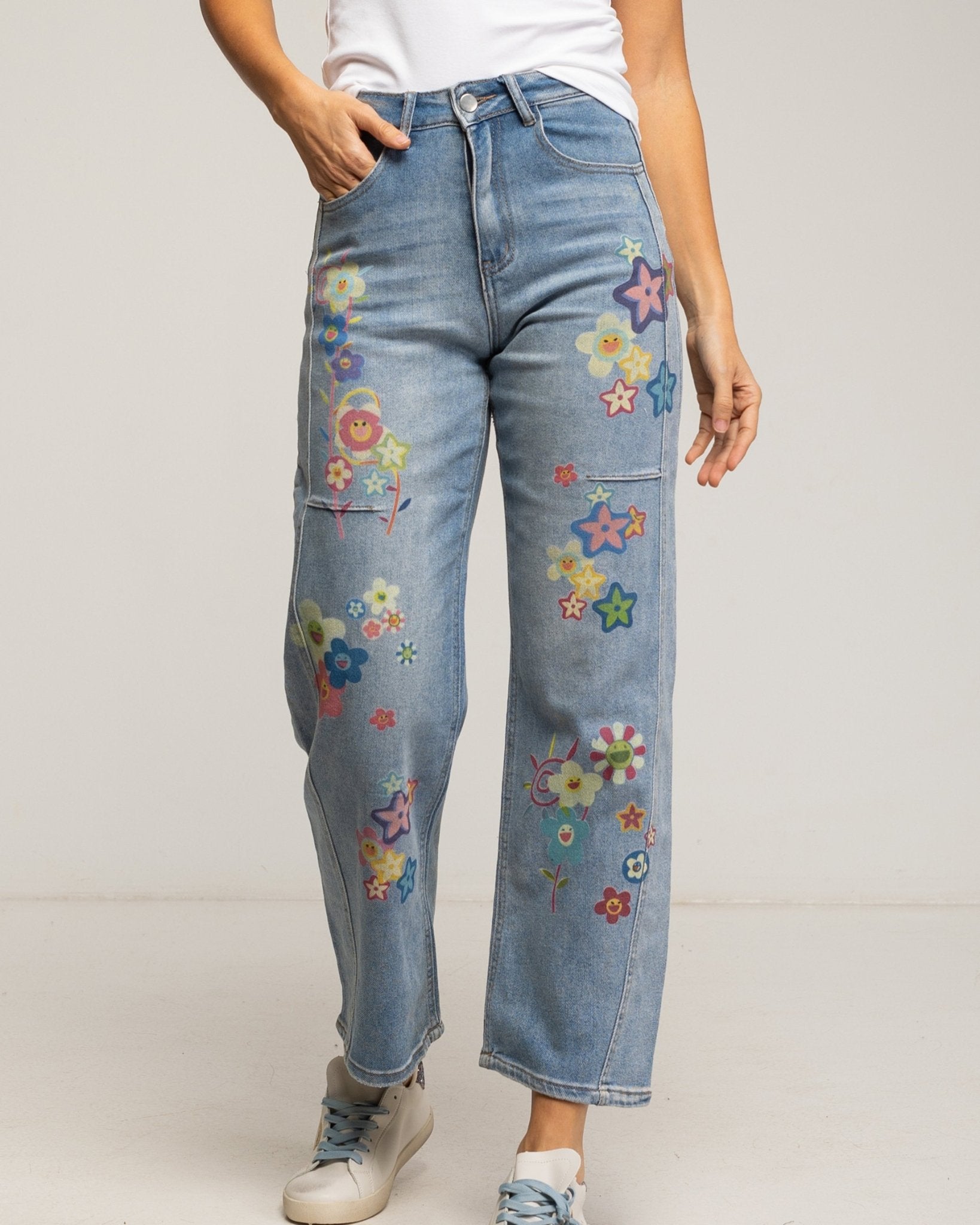 Jeans rectos de tiro alto con flores y dibujos pintados en la parte anterior y posteriot