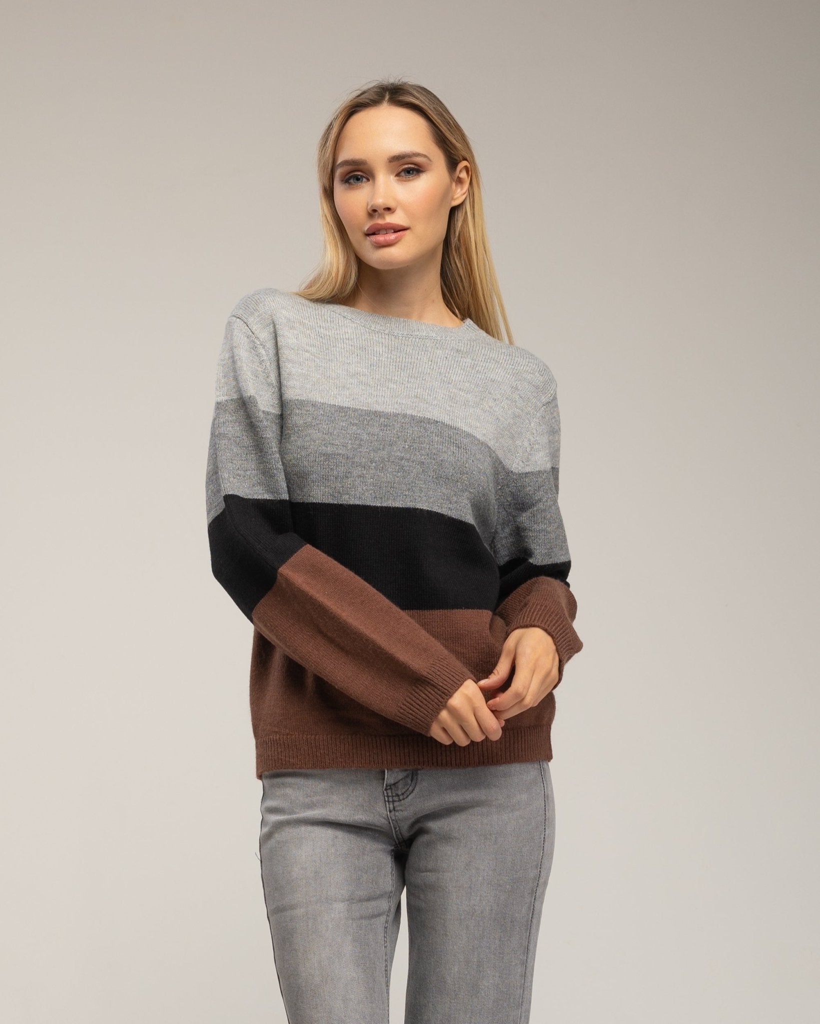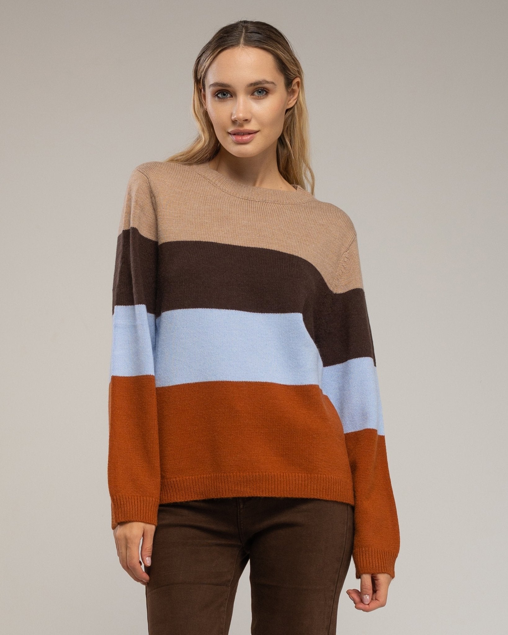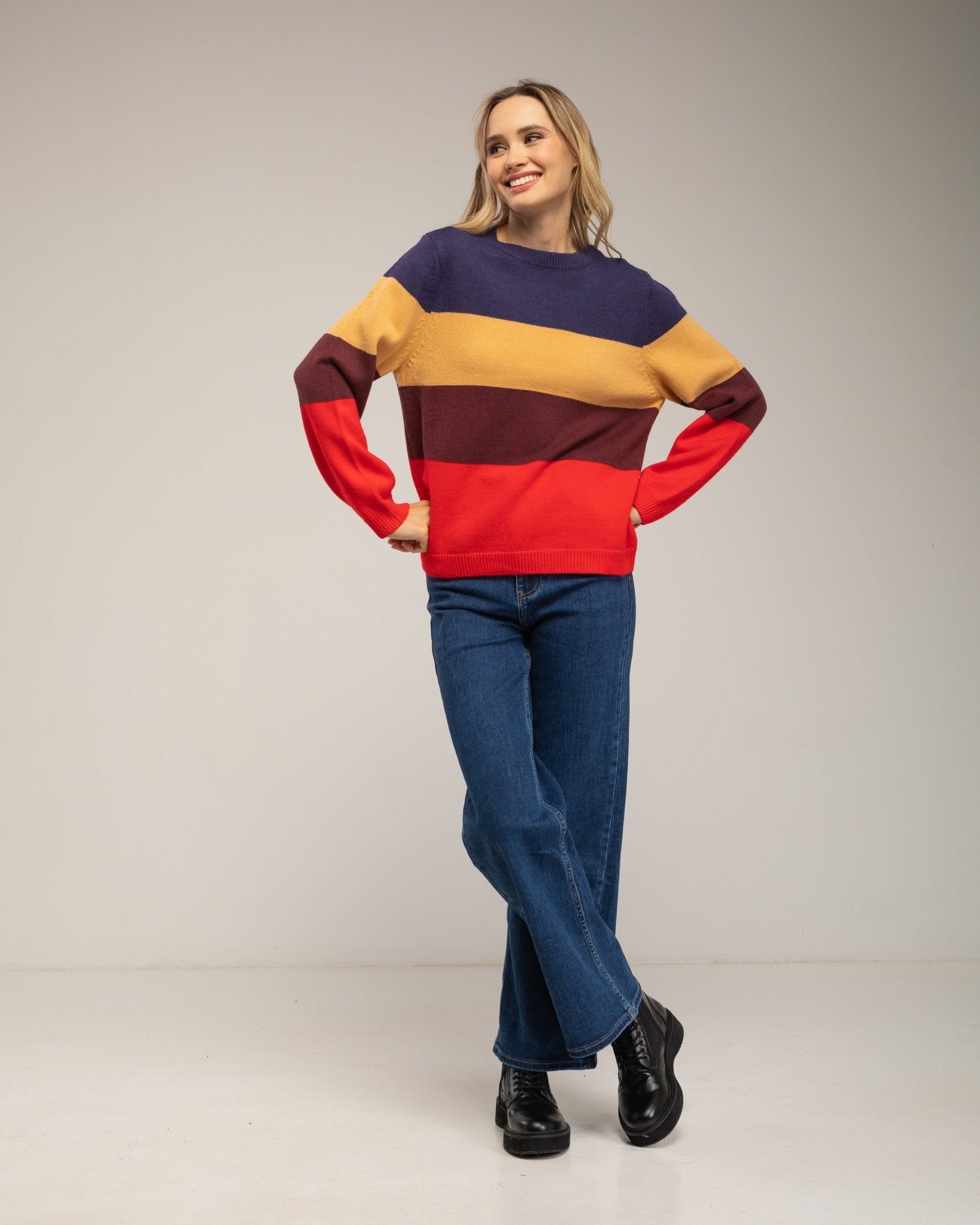 Este jersey de cuello redondo destaca por su diseño moderno y llamativo gracias a las franjas de colores. Su mezcla de fibras, que incluye lana, viscosa y poliamida, ofrece suavidad, calidez y elasticidad, brindando confort y versatilidad para cualquier ocasión.