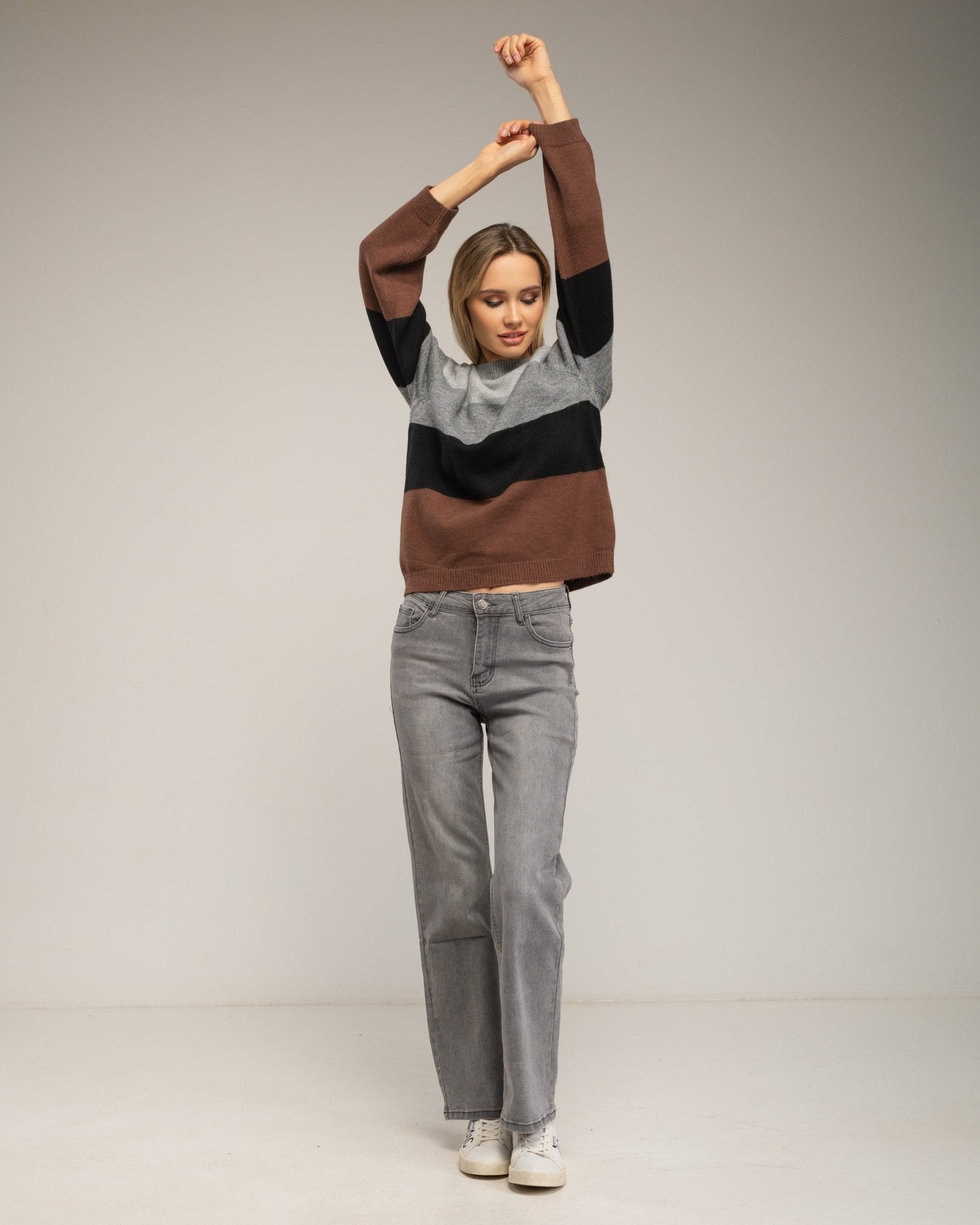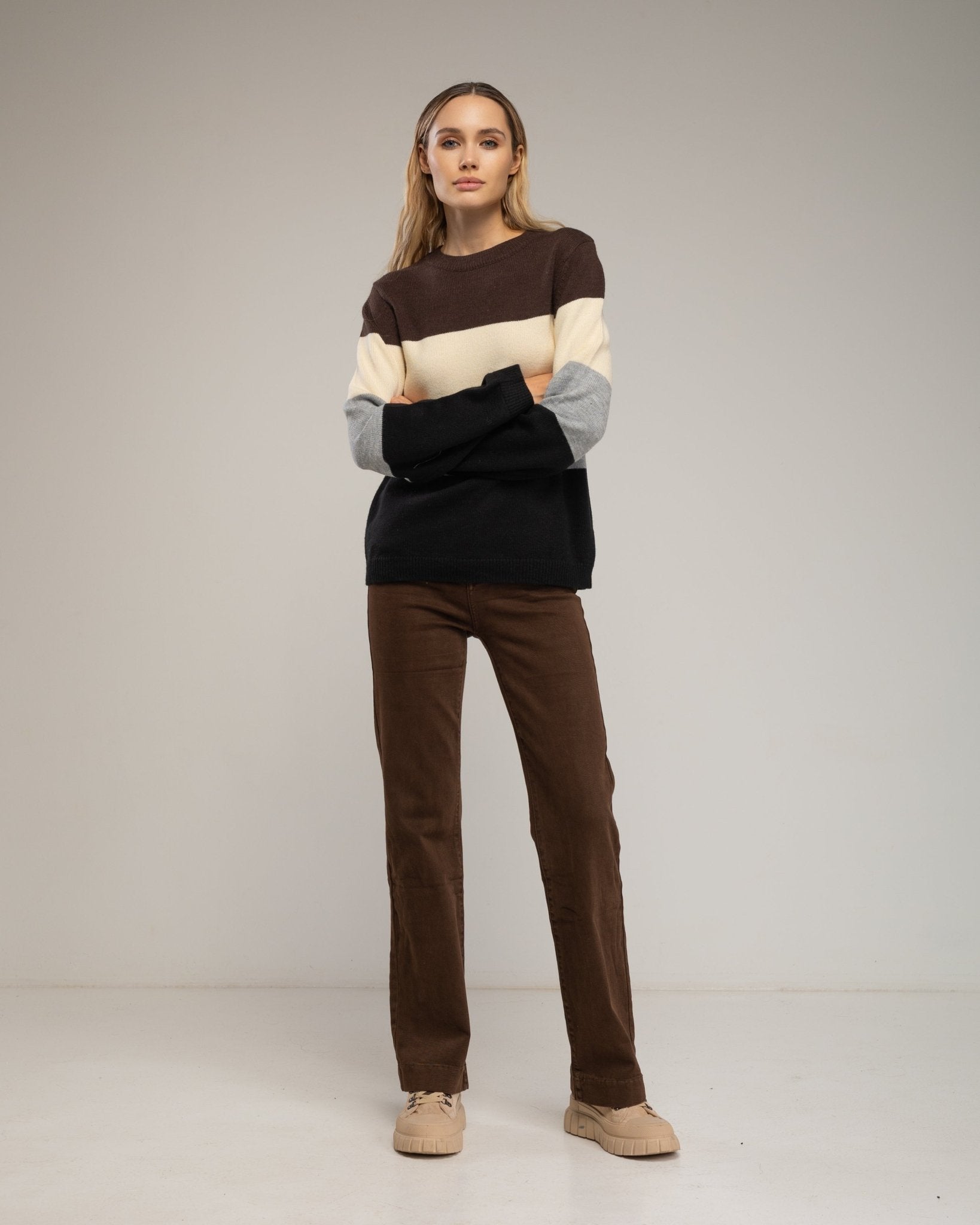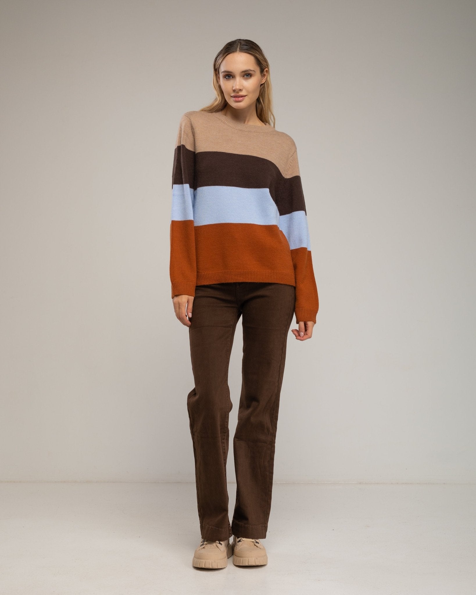 Este jersey de cuello redondo destaca por su diseño moderno y llamativo gracias a las franjas de colores. Su mezcla de fibras, que incluye lana, viscosa y poliamida, ofrece suavidad, calidez y elasticidad, brindando confort y versatilidad para cualquier ocasión.