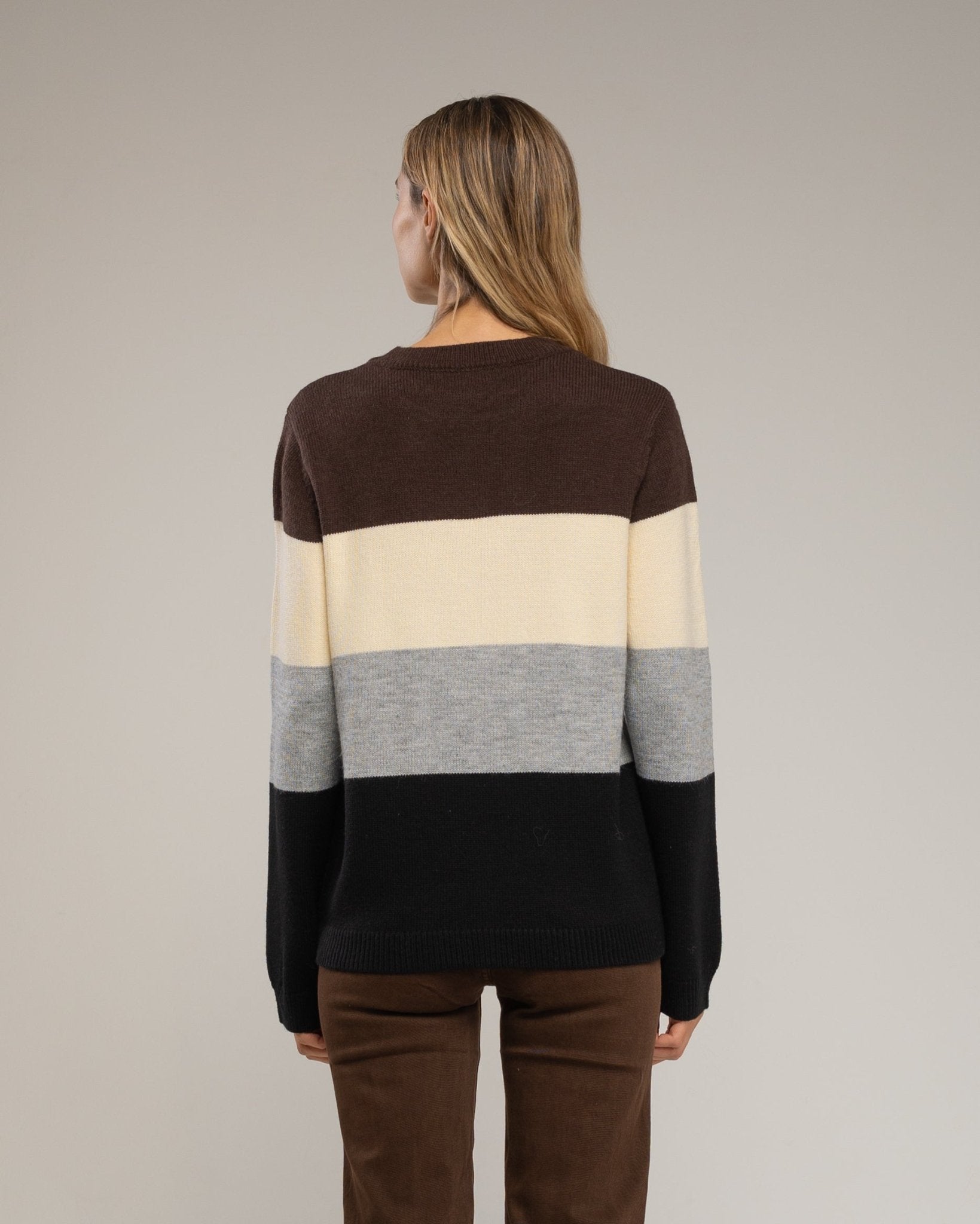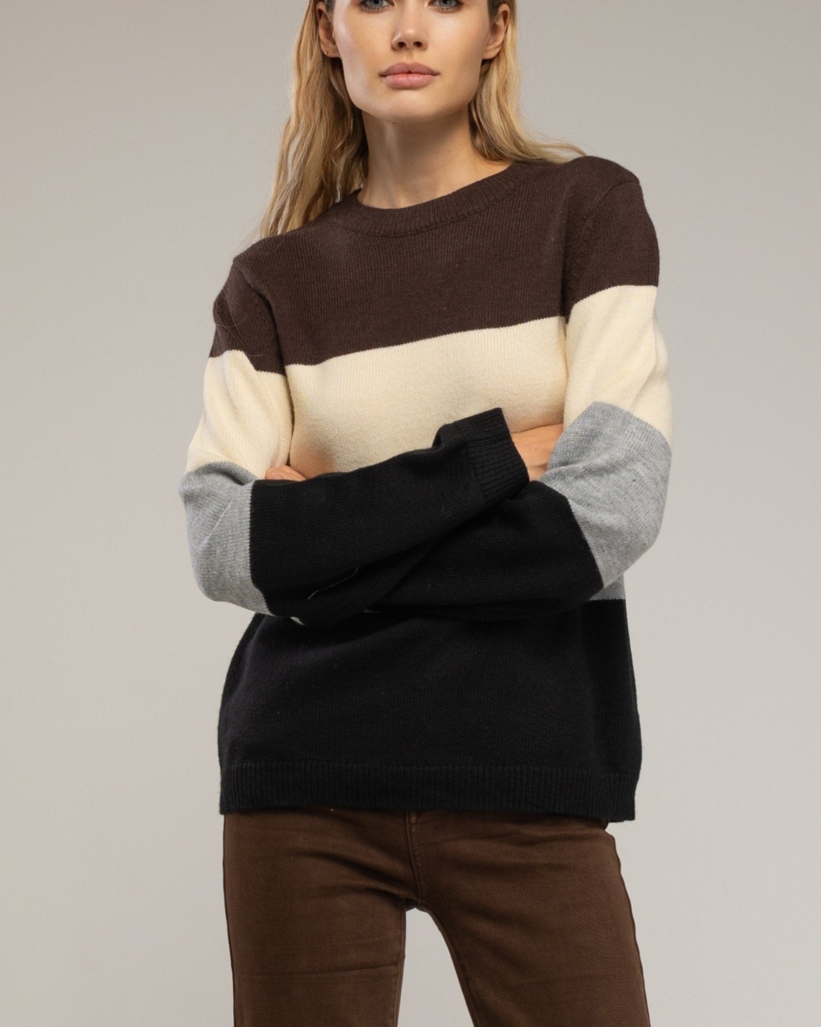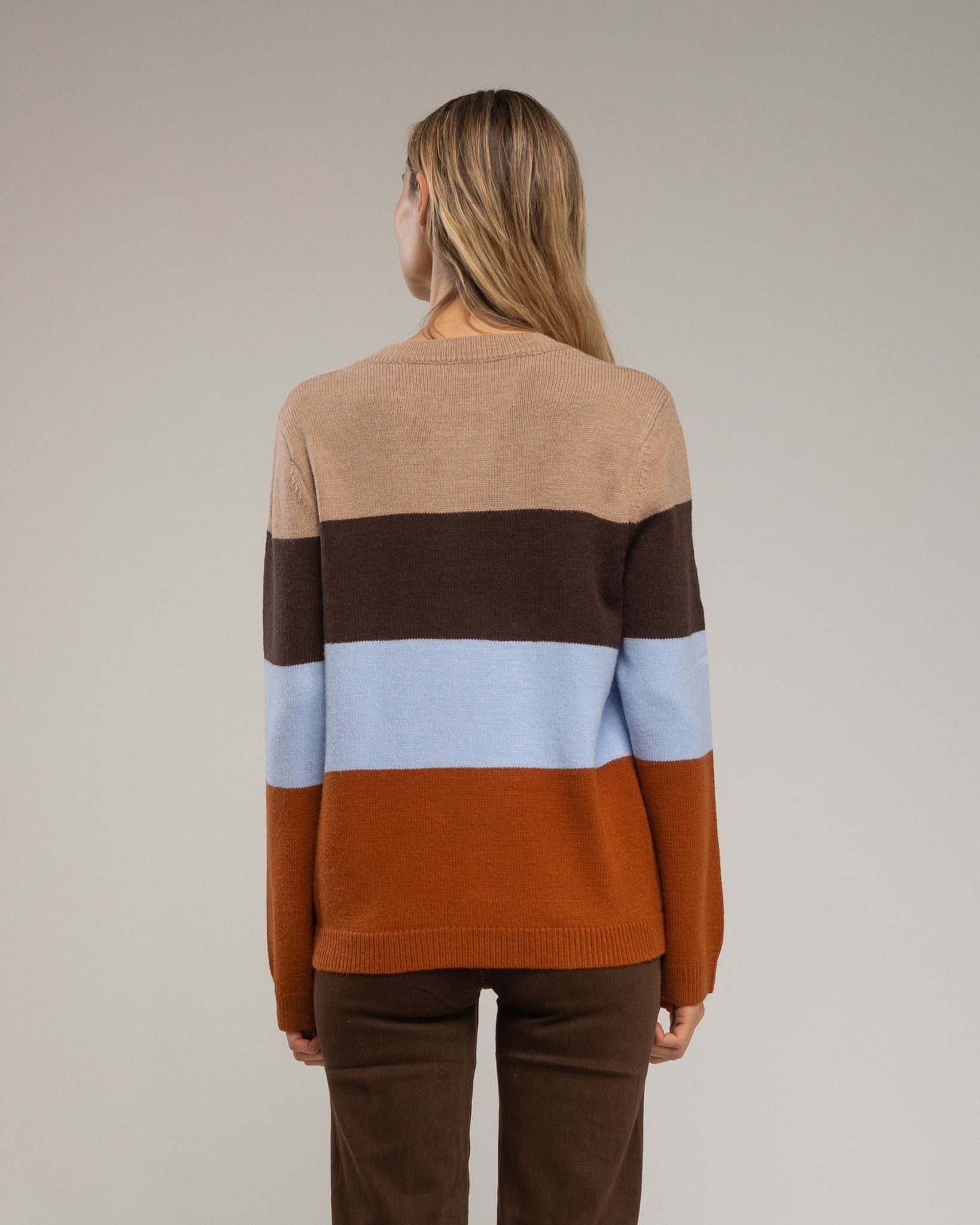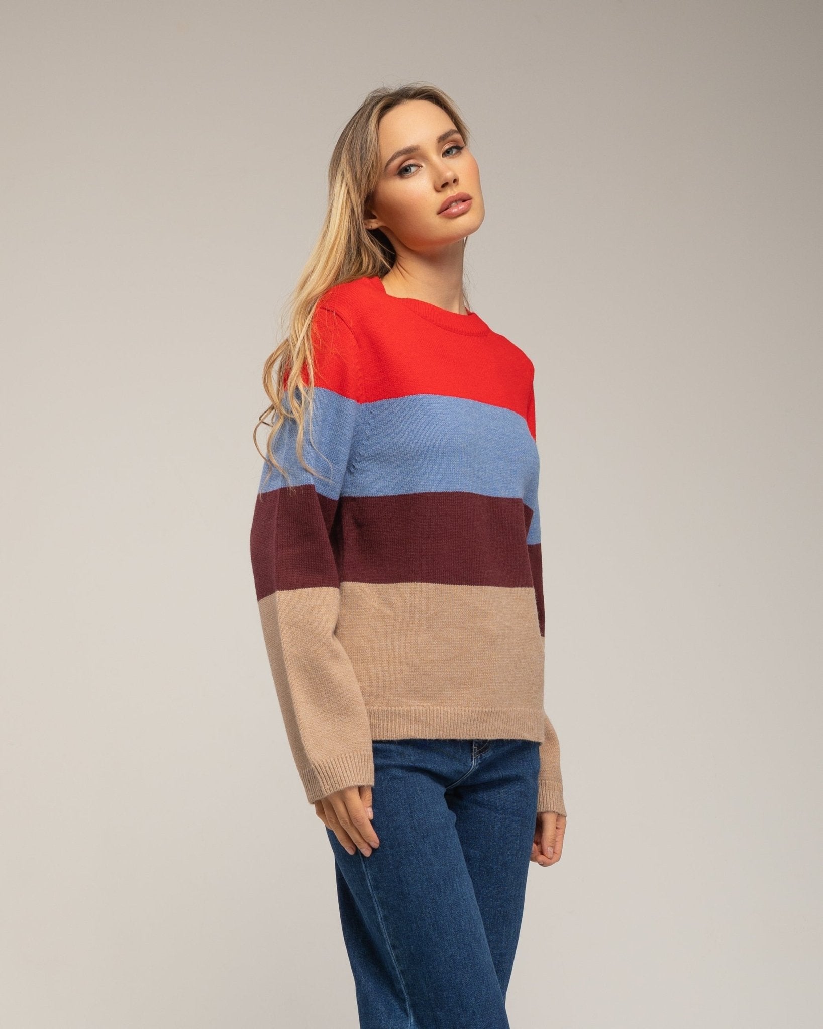 Detalles: cuello redondo, franjas de colores, tejido suave y cálido, diseño versátil y moderno.