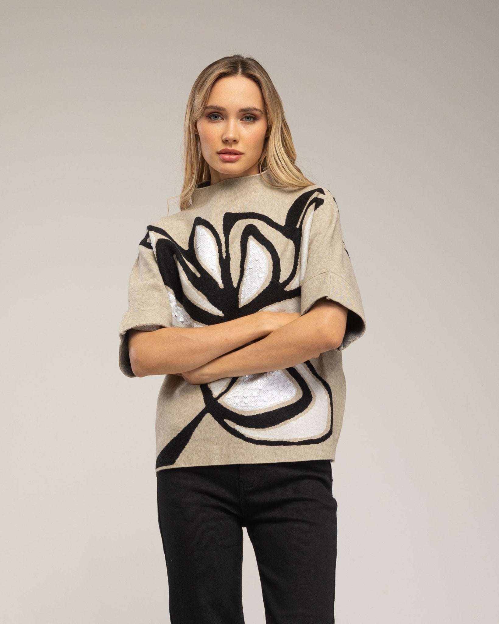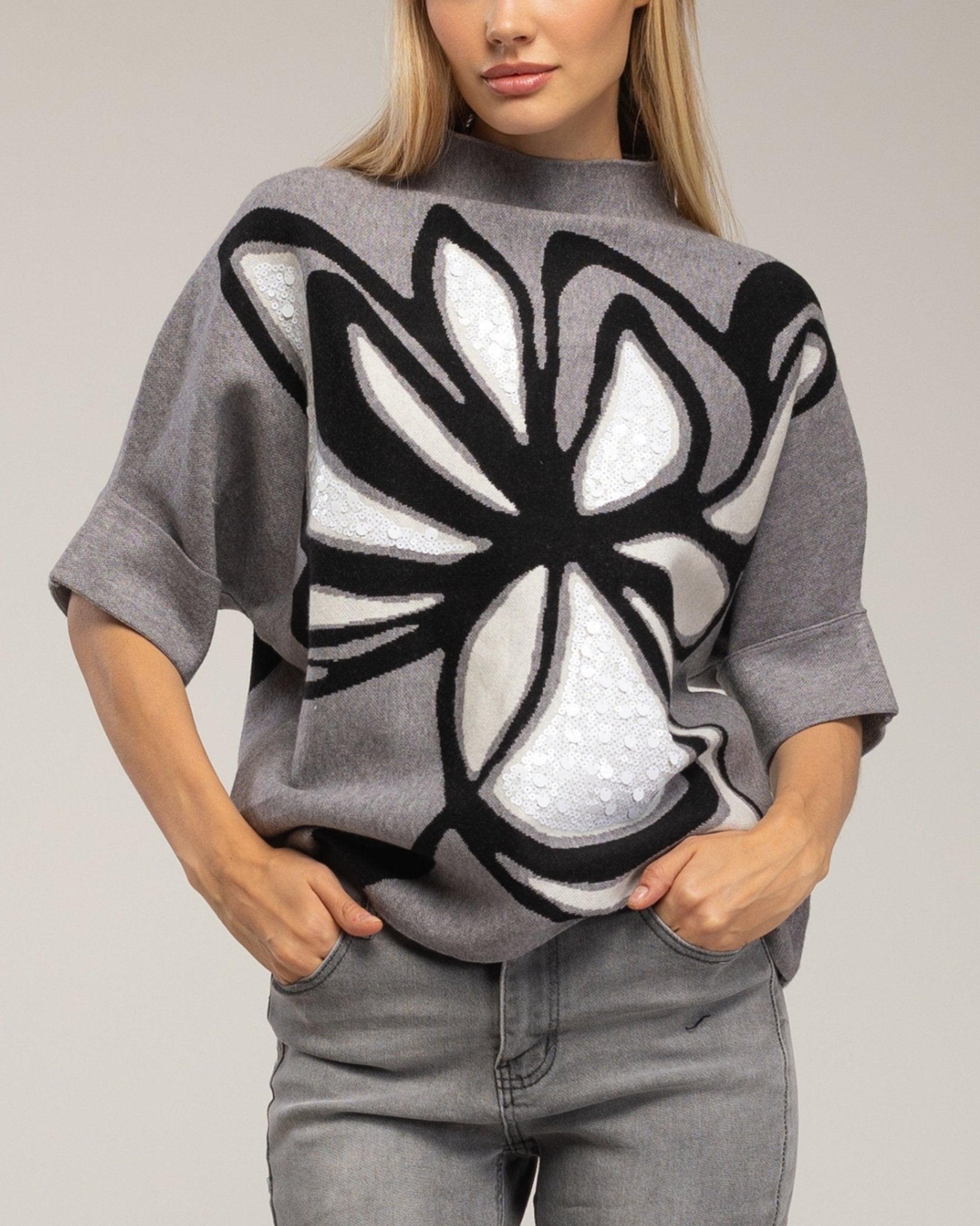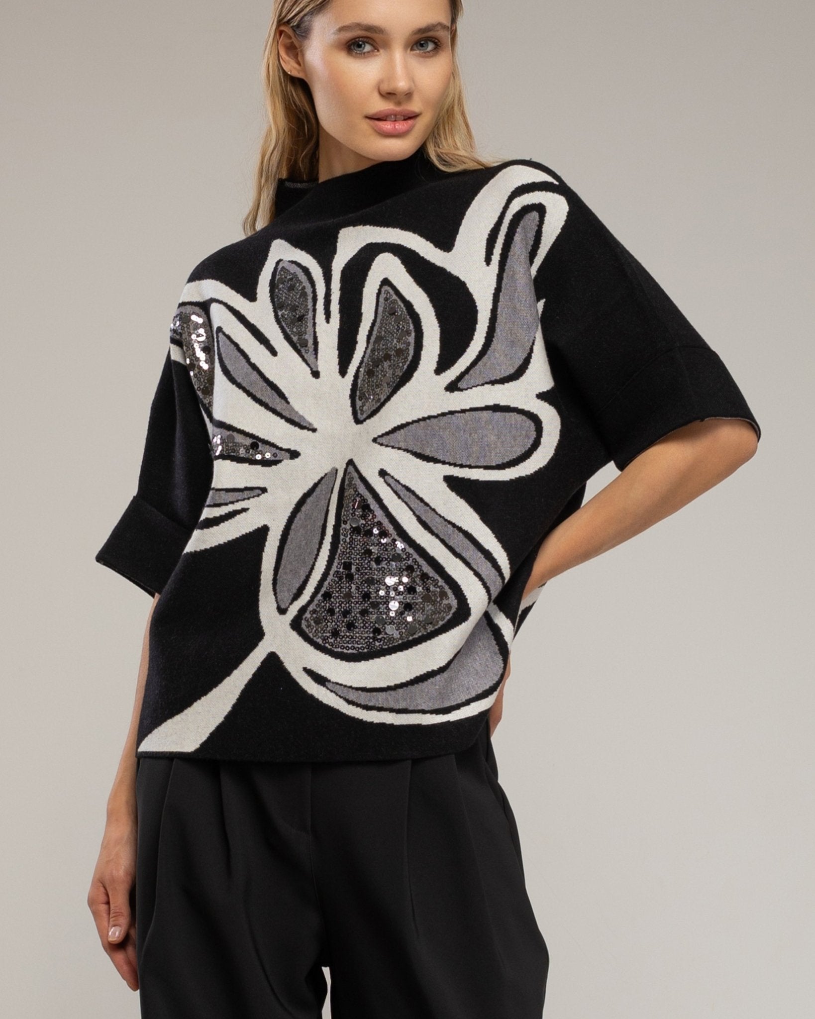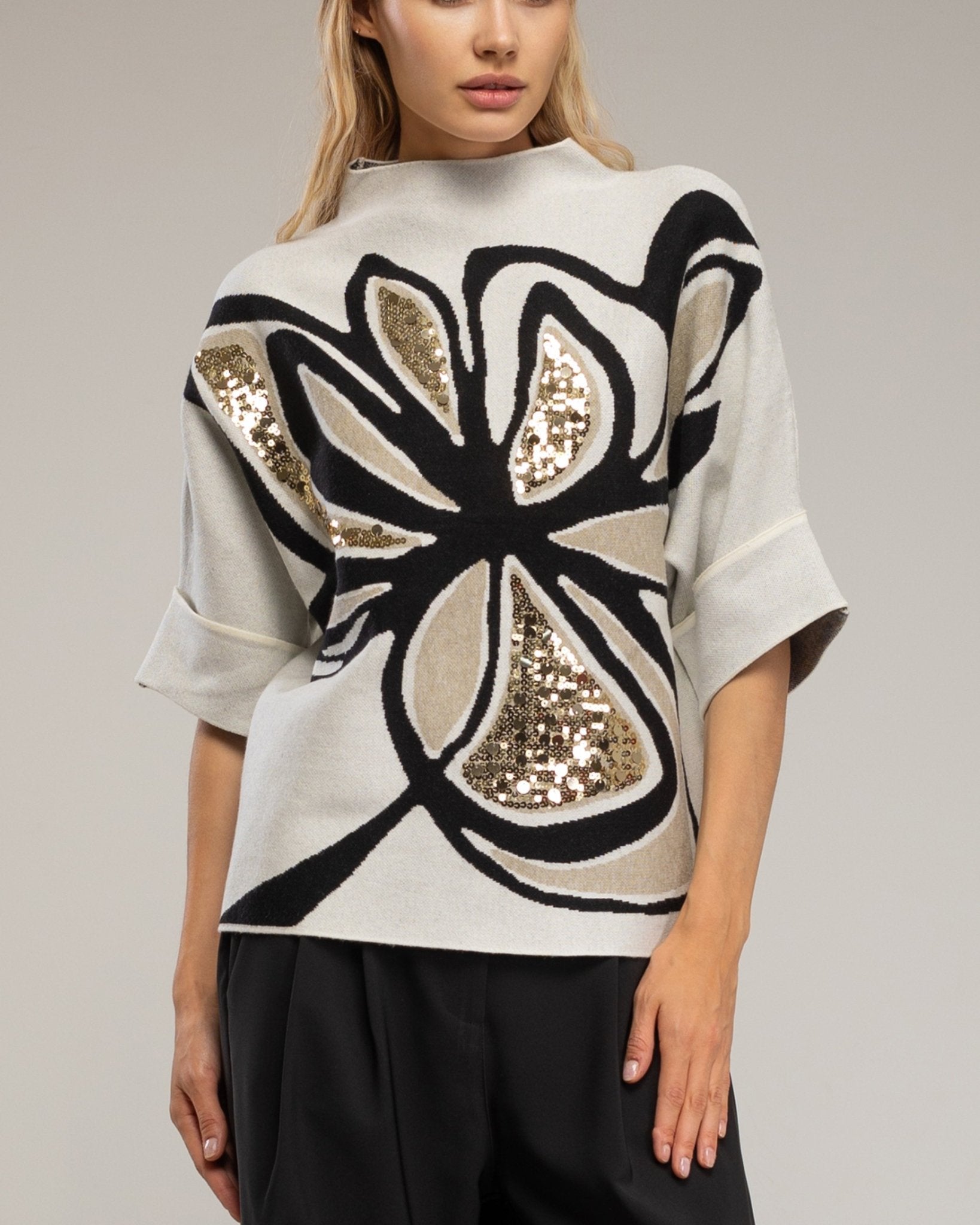 Jersey de punto estampado de flores con lentejuelas y manga francesa.