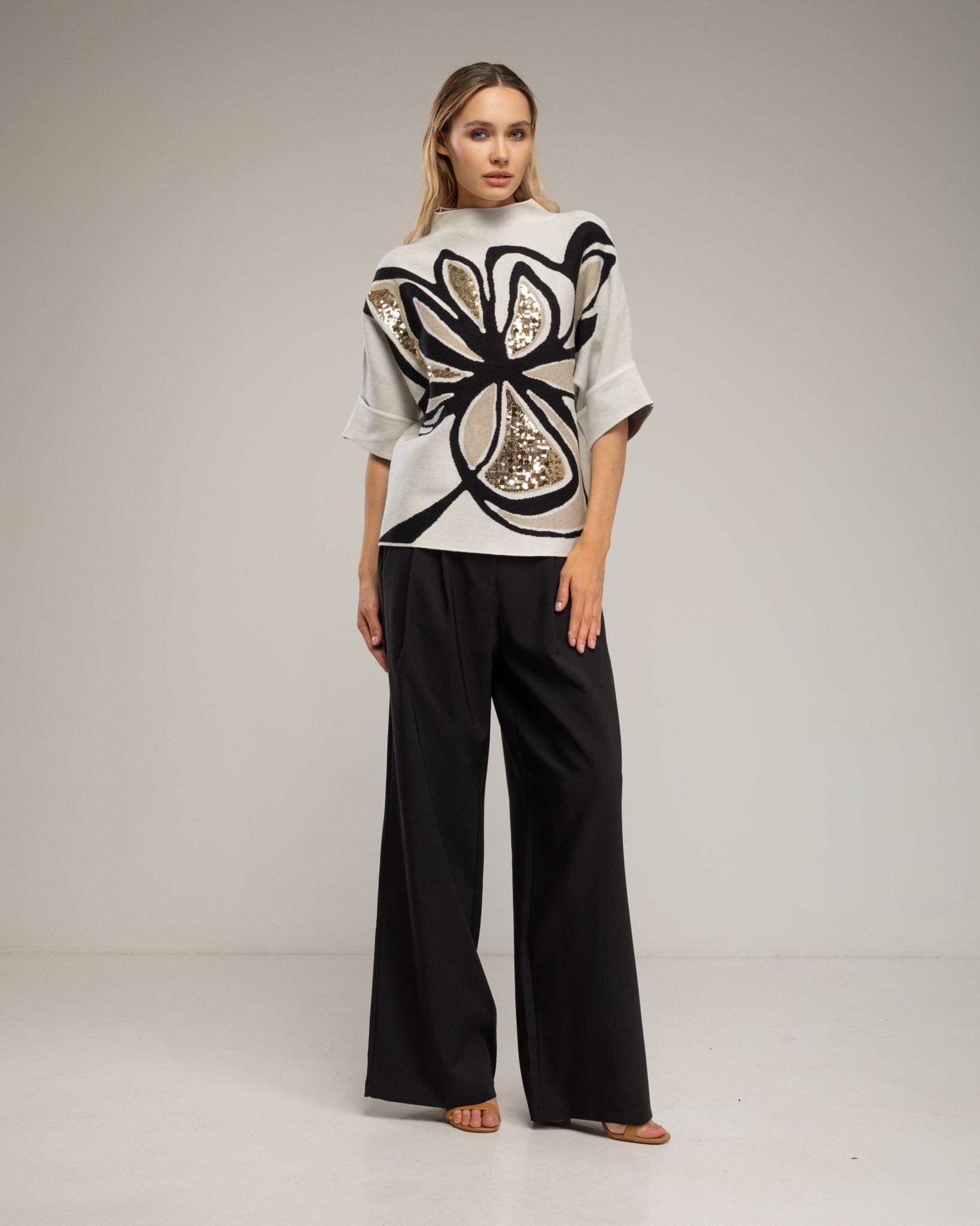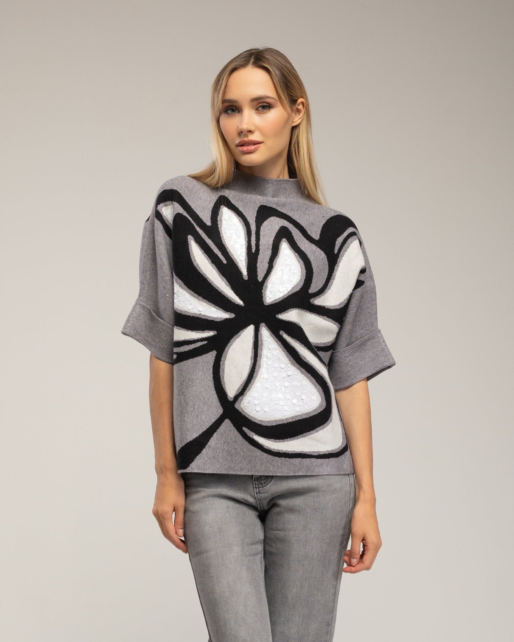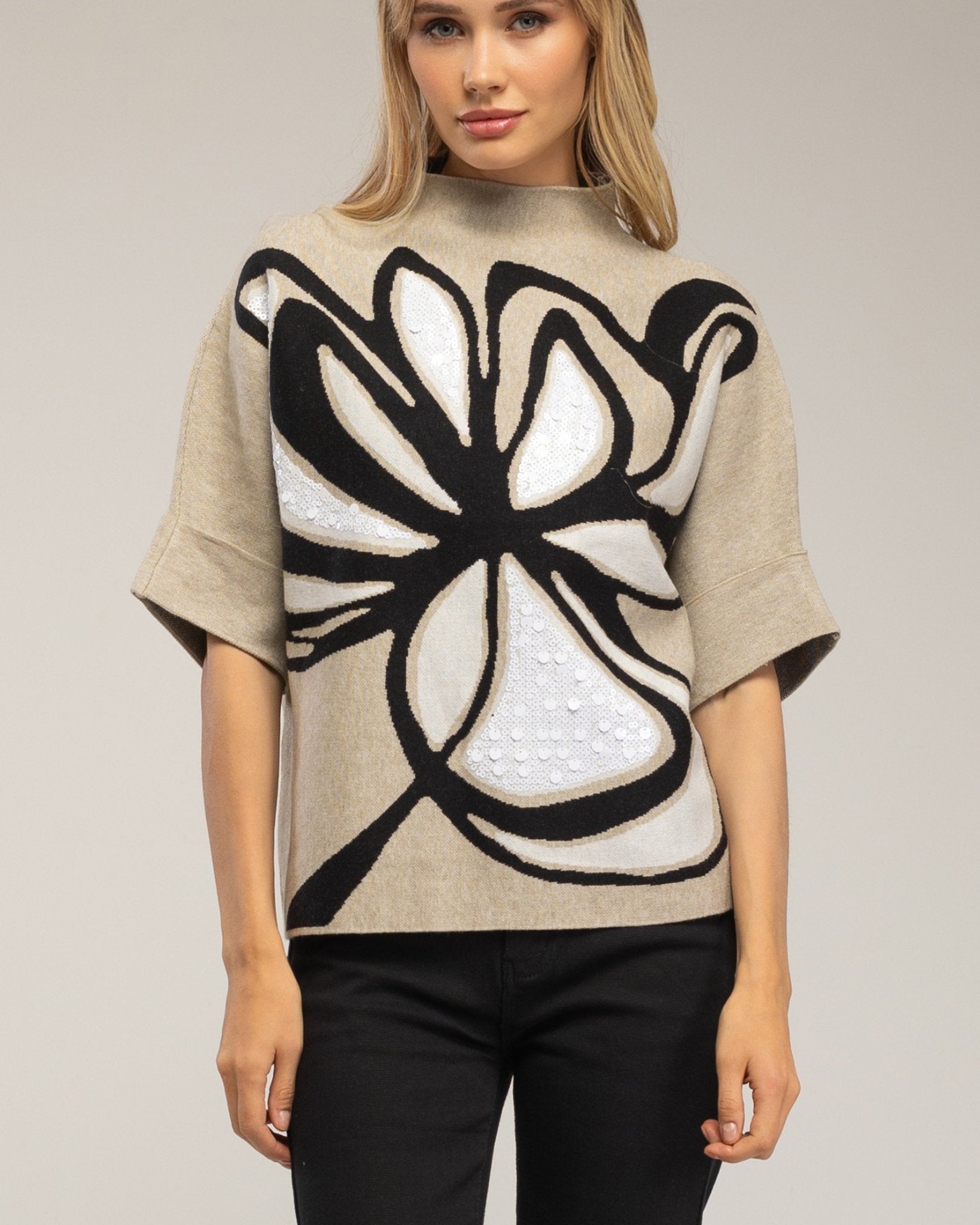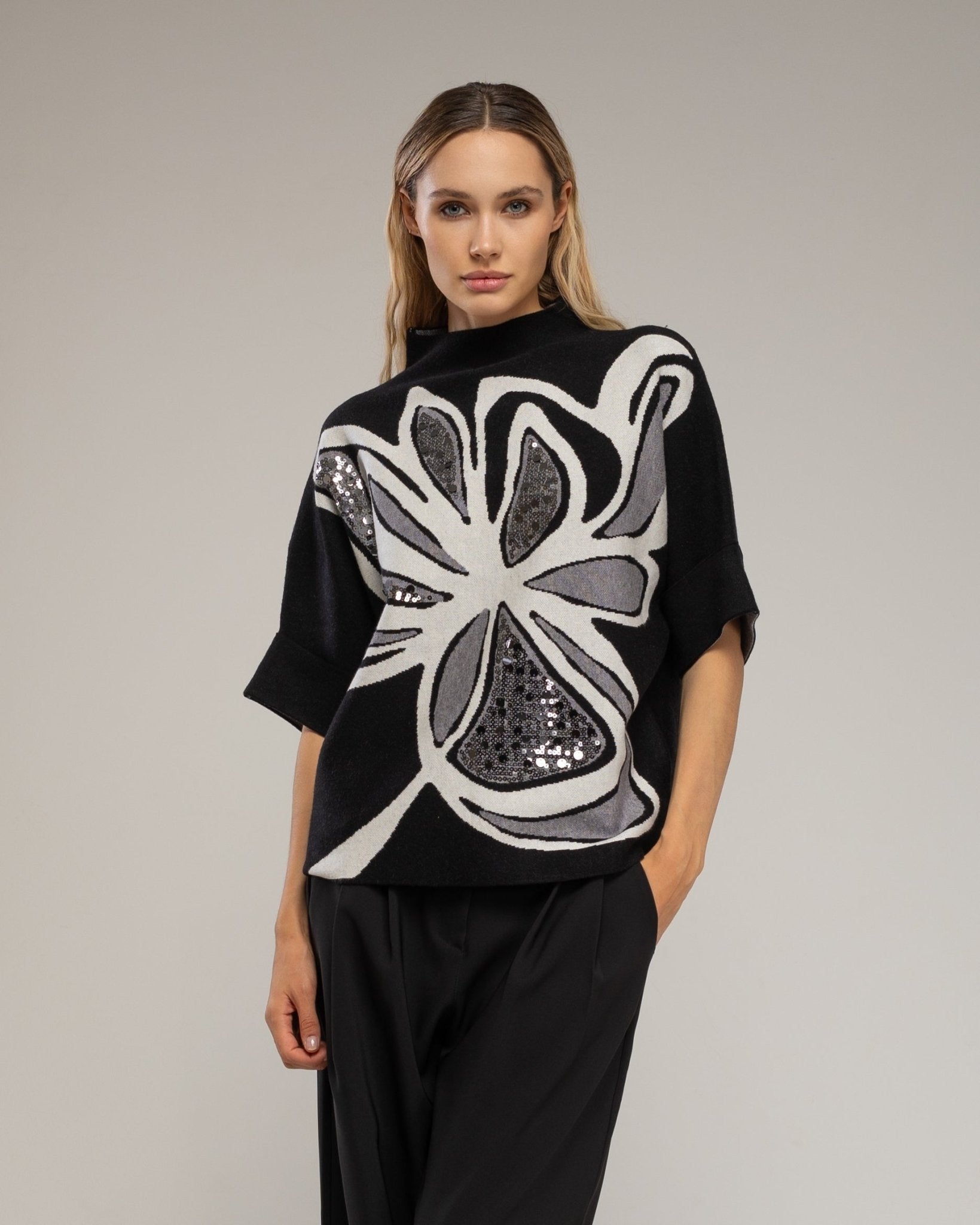 Jersey de punto estampado de flores con lentejuelas y manga francesa.