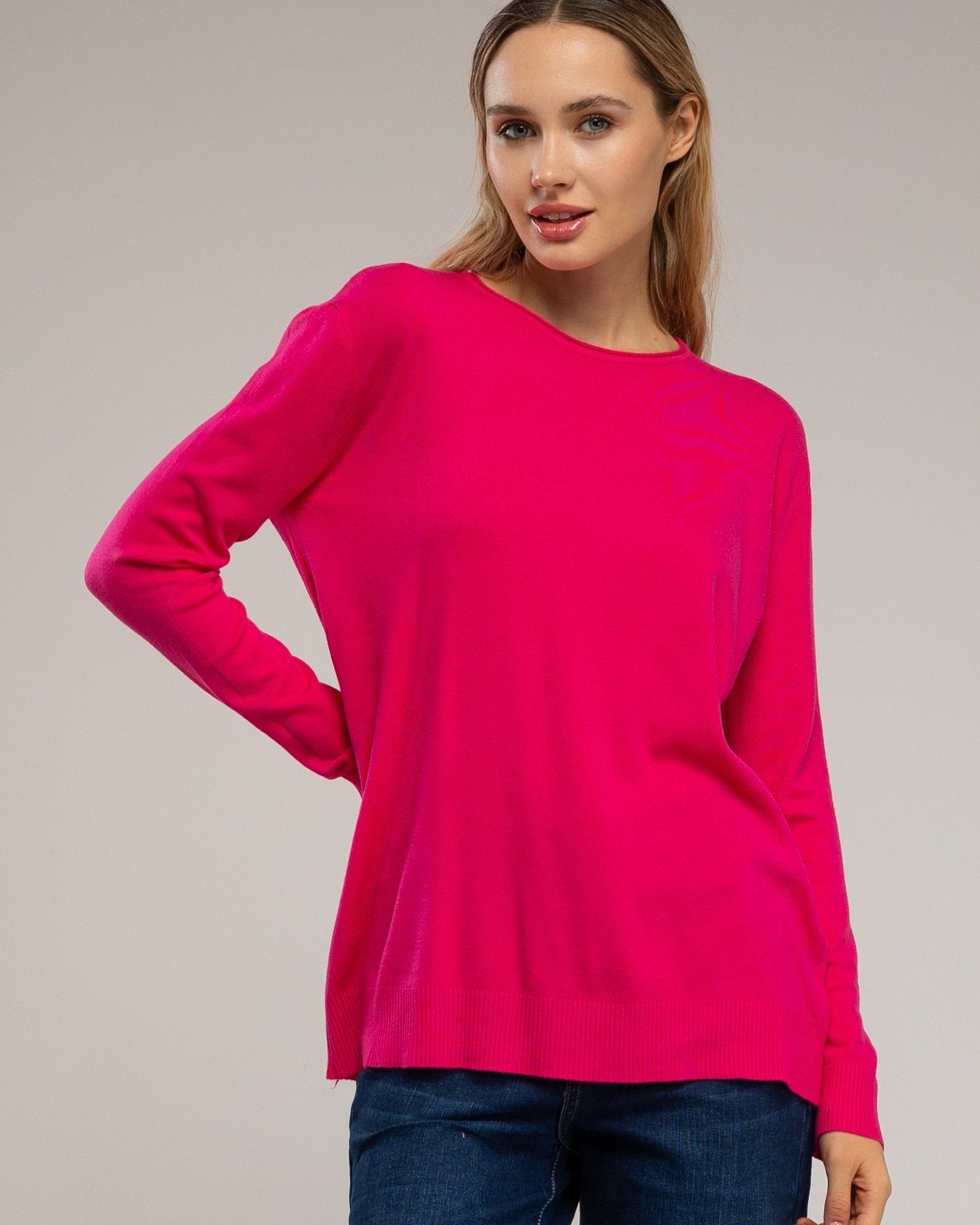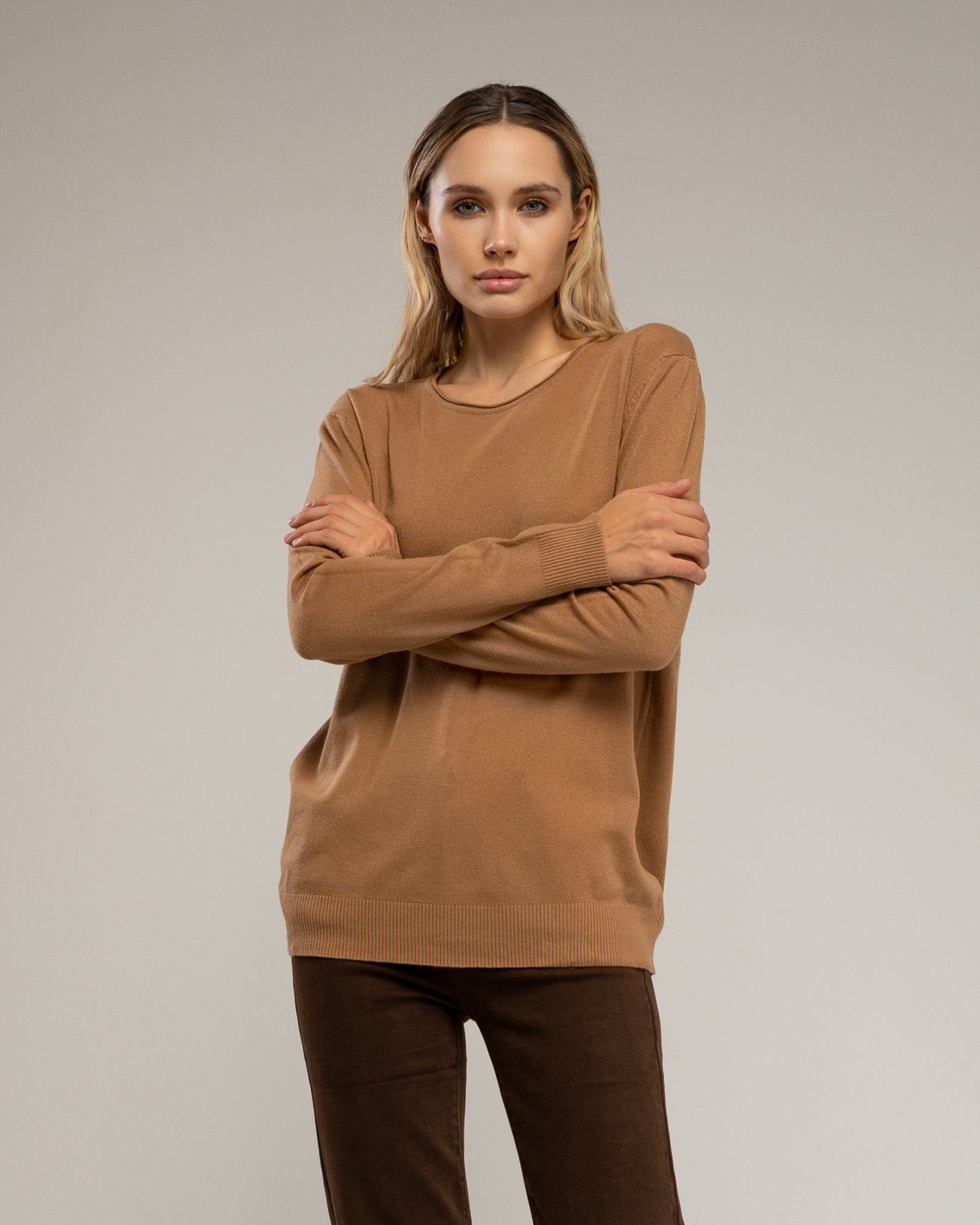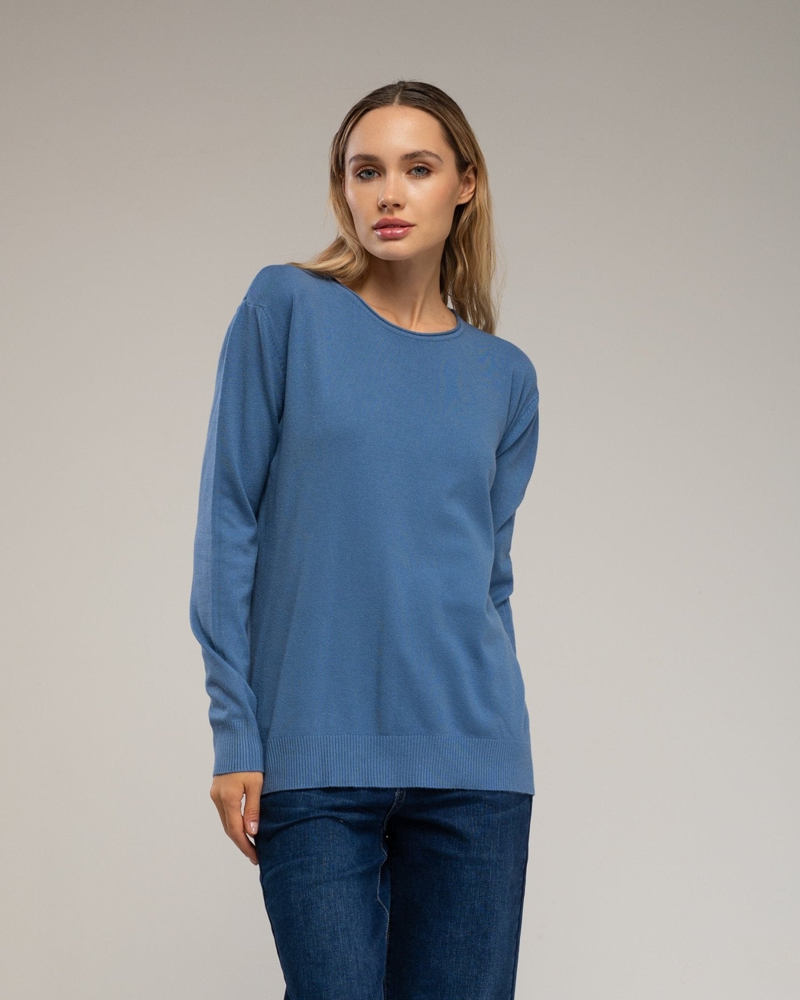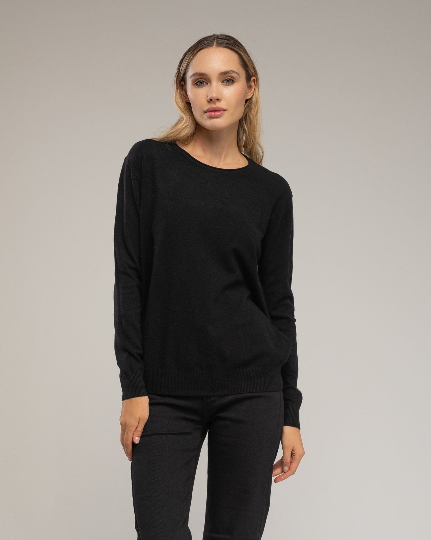 Este jersey de punto fino básico con cuello redondo es una prenda esencial para el día a día. Su tejido suave, ligero y elástico ofrece una gran comodidad y un ajuste favorecedor, ideal para combinar con cualquier estilo, desde looks casuales hasta más formales.