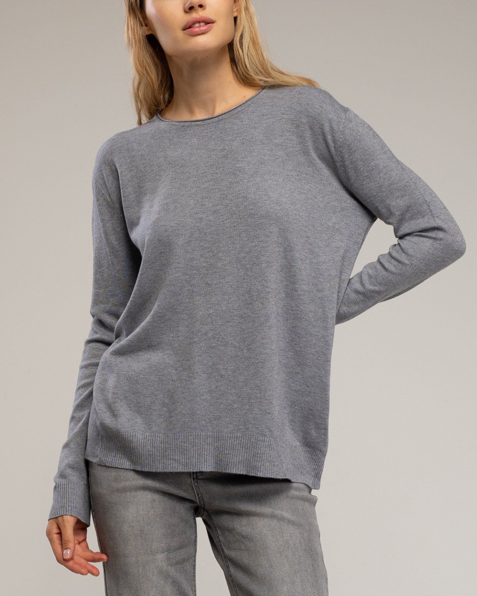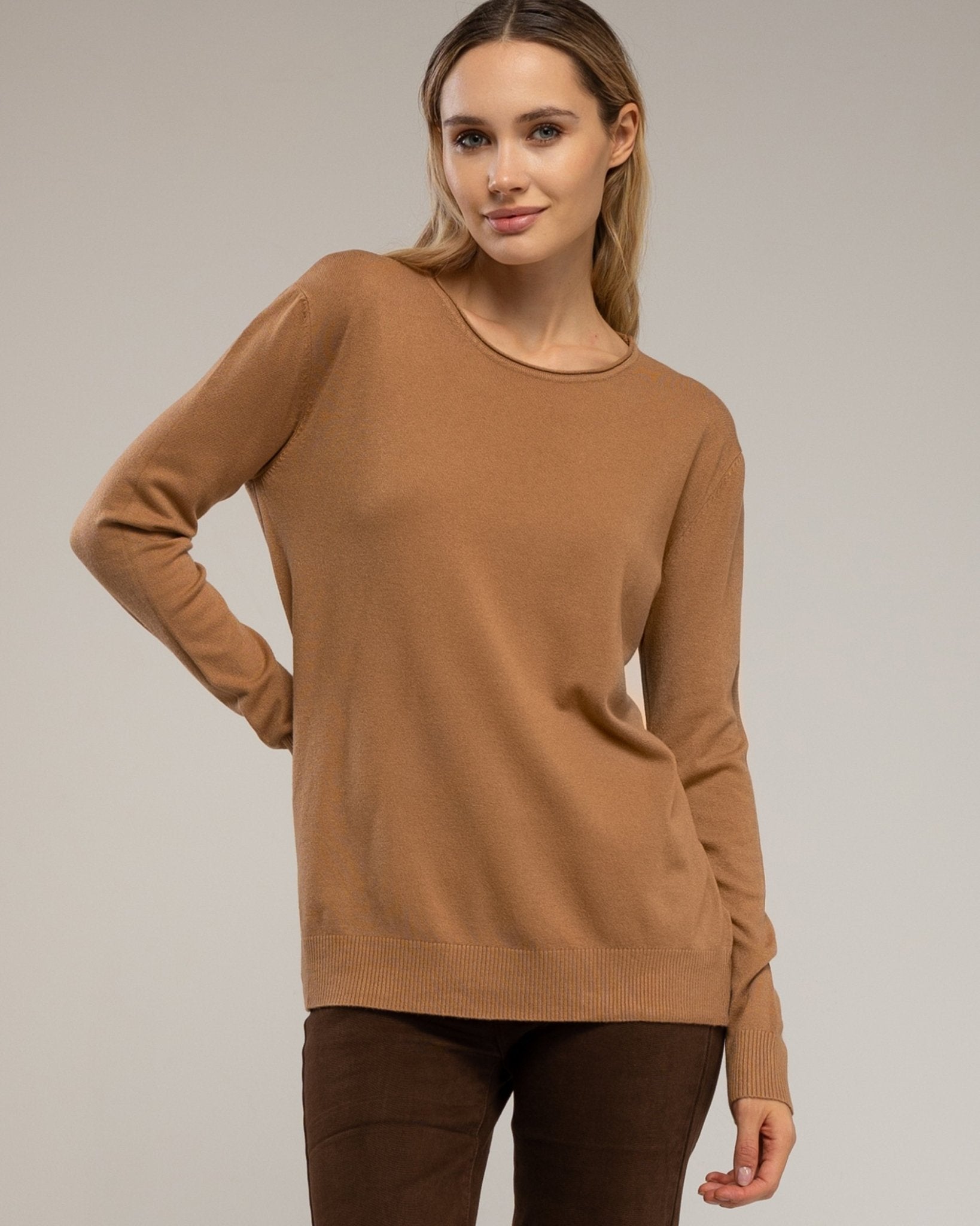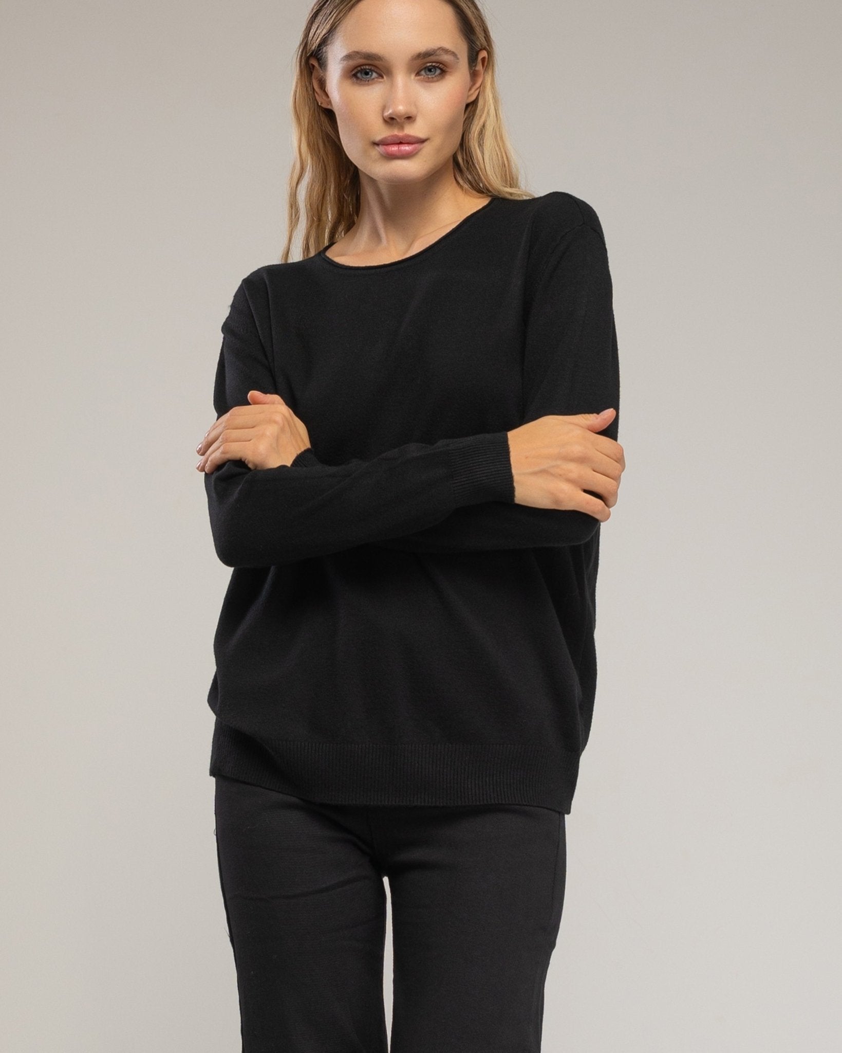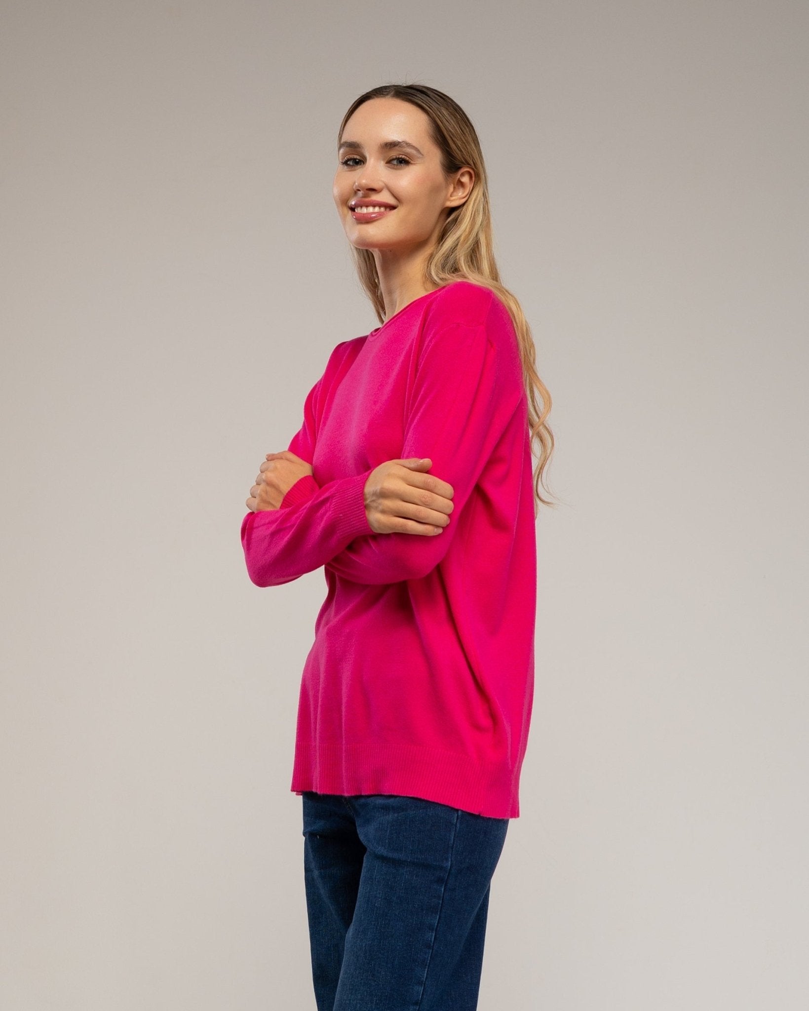 Este jersey de punto fino básico con cuello redondo es una prenda esencial para el día a día. Su tejido suave, ligero y elástico ofrece una gran comodidad y un ajuste favorecedor, ideal para combinar con cualquier estilo, desde looks casuales hasta más formales.