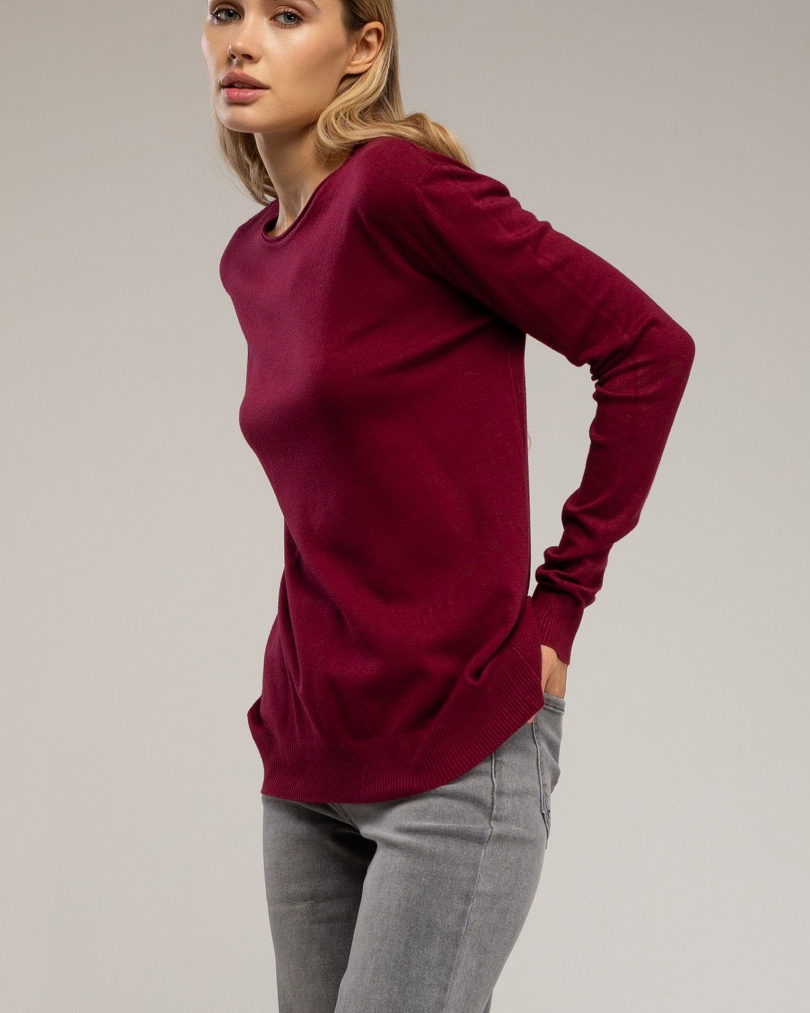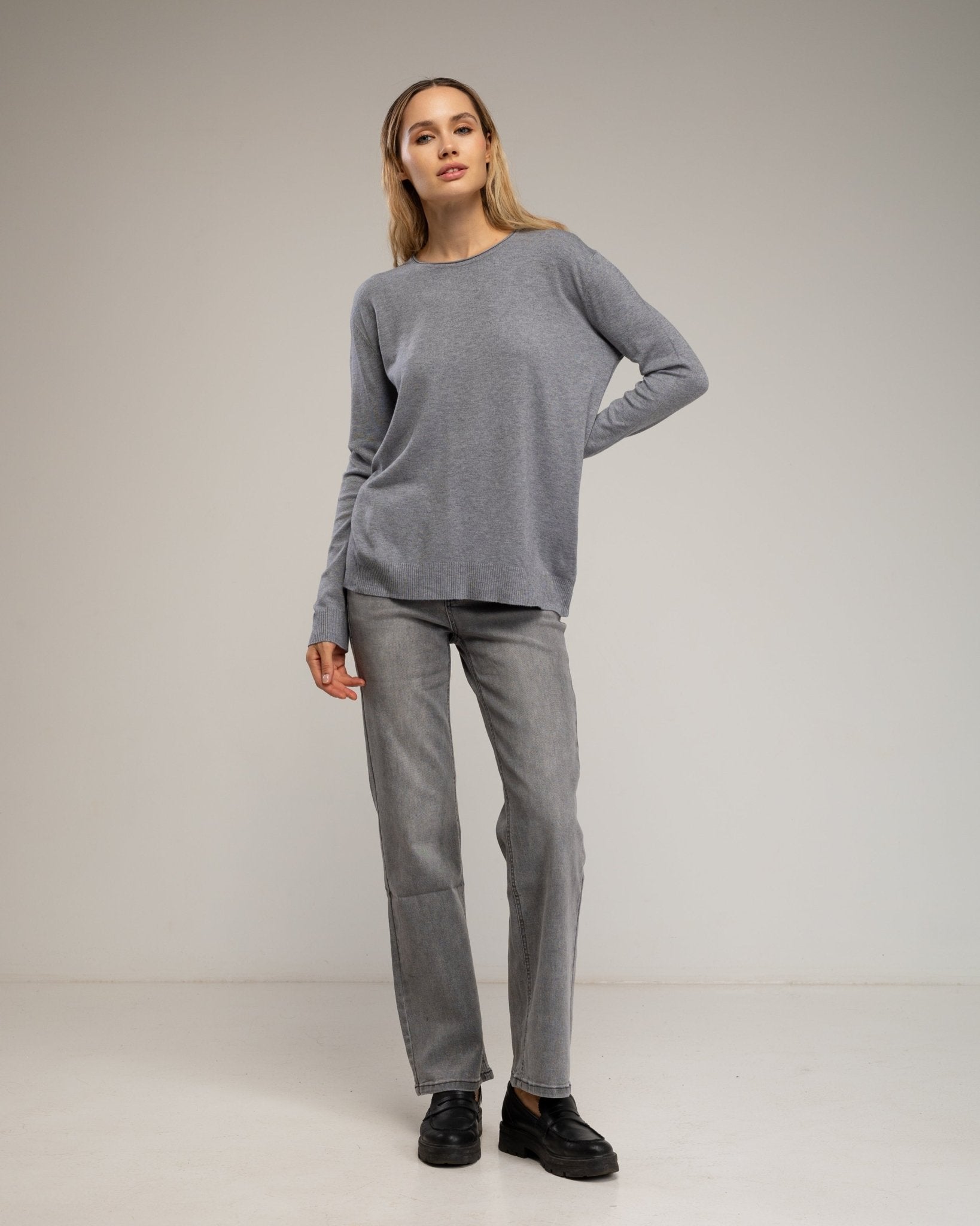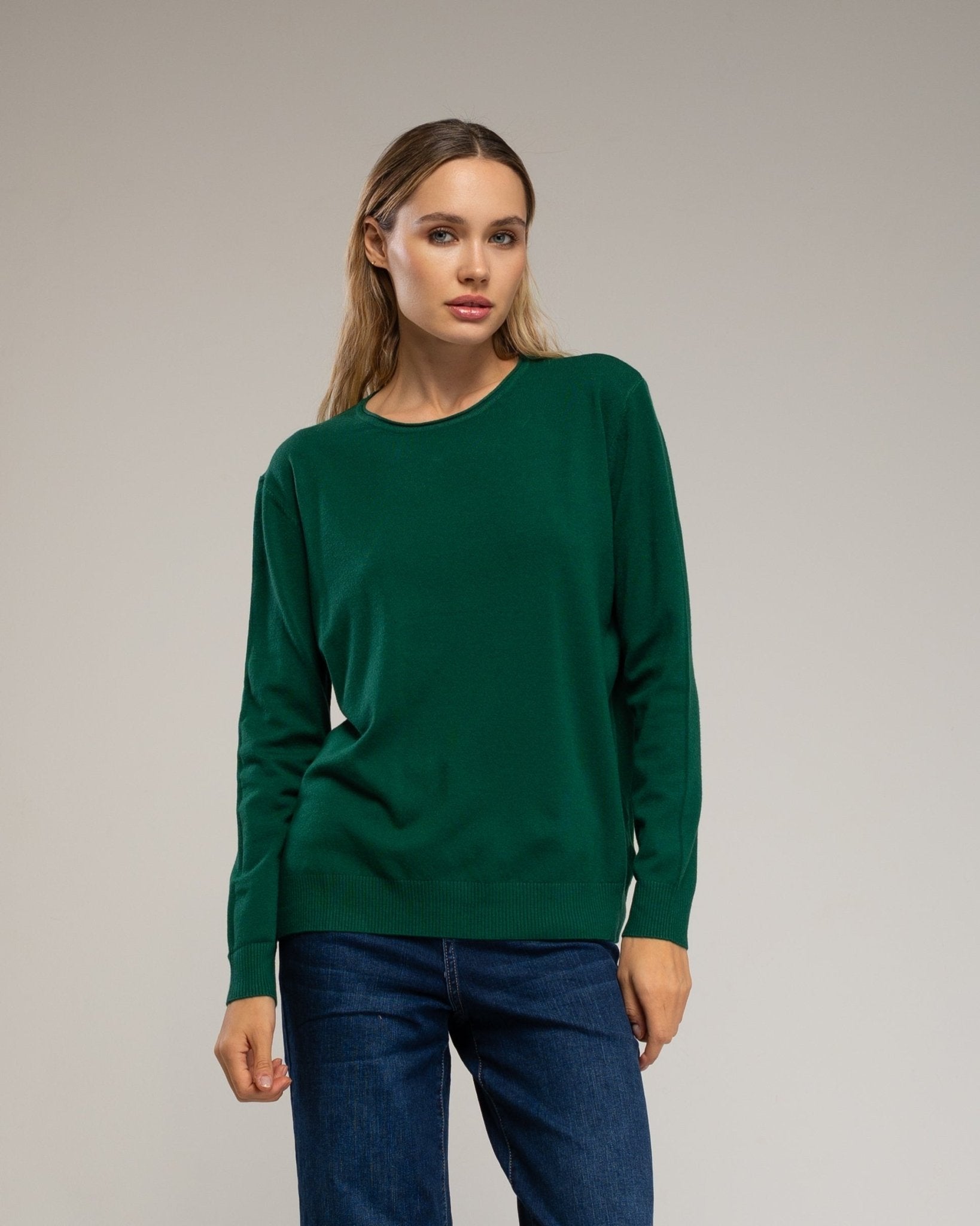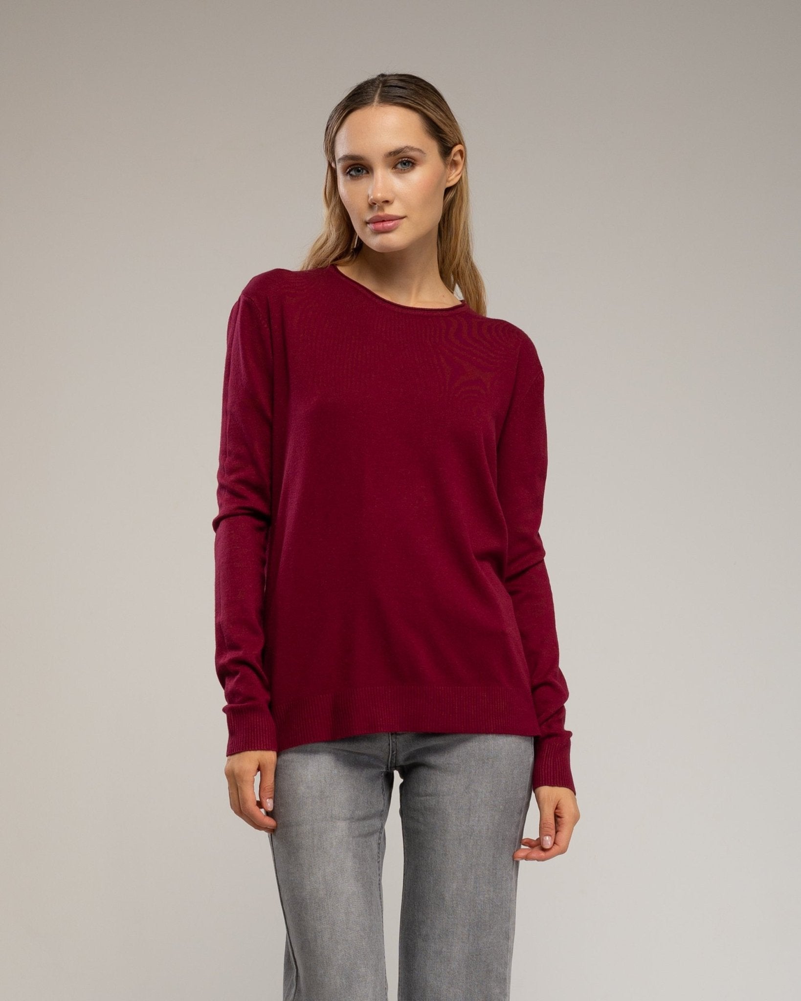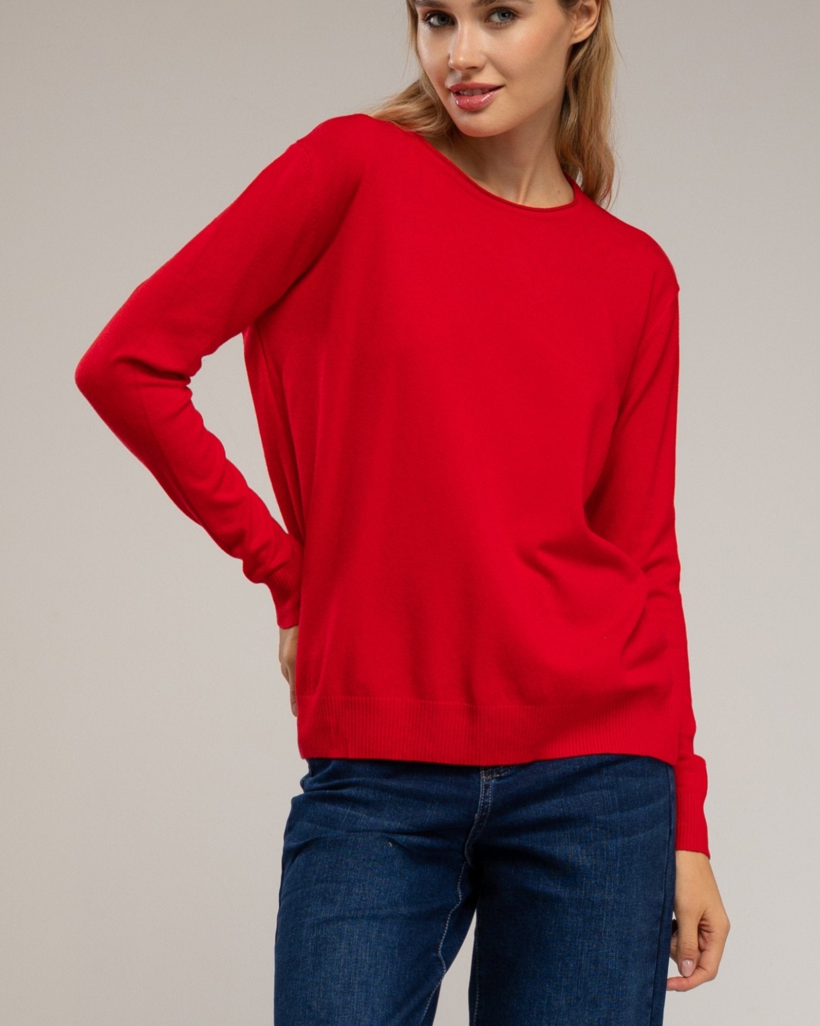 Este jersey de punto fino básico con cuello redondo es una prenda esencial para el día a día. Su tejido suave, ligero y elástico ofrece una gran comodidad y un ajuste favorecedor, ideal para combinar con cualquier estilo, desde looks casuales hasta más formales.