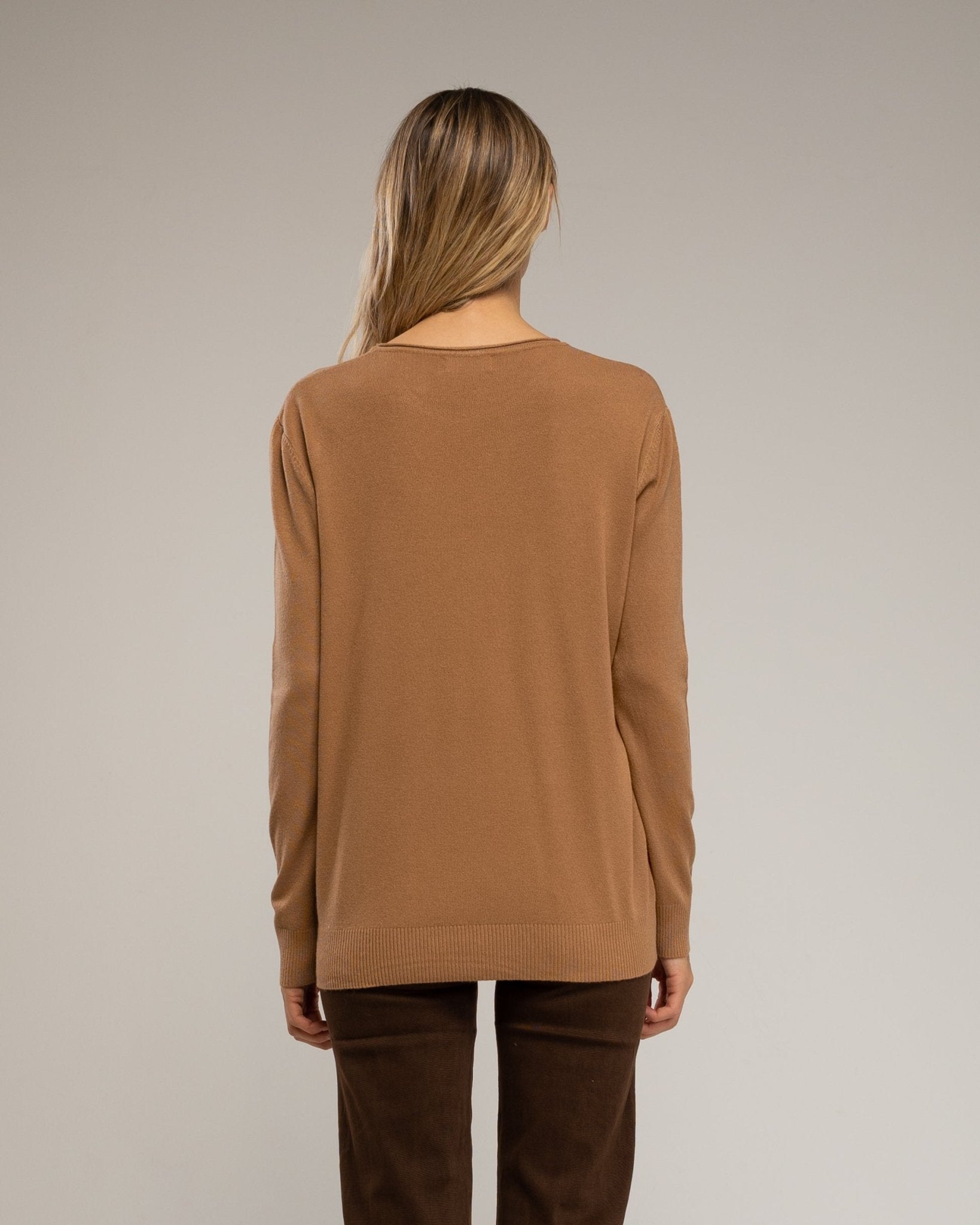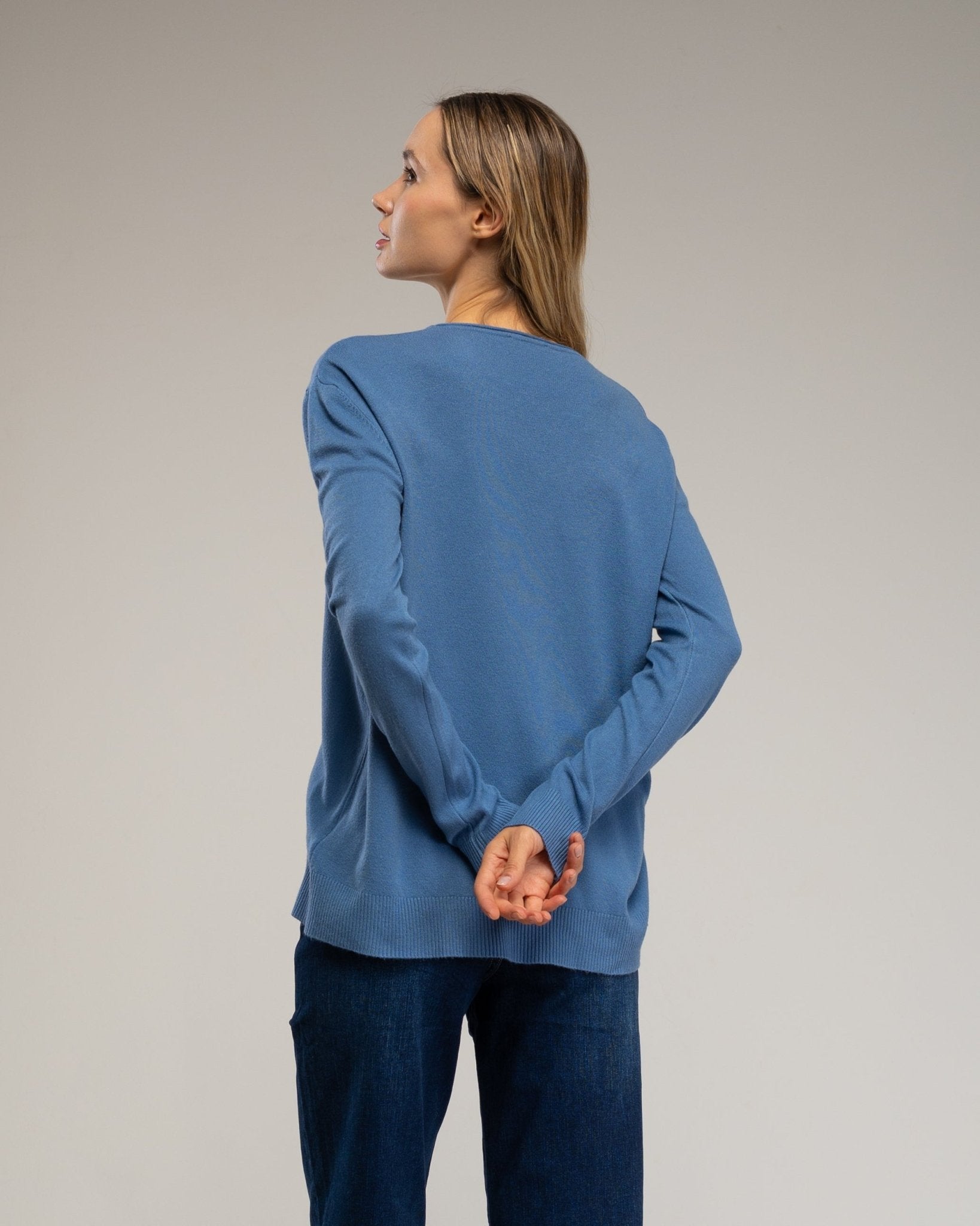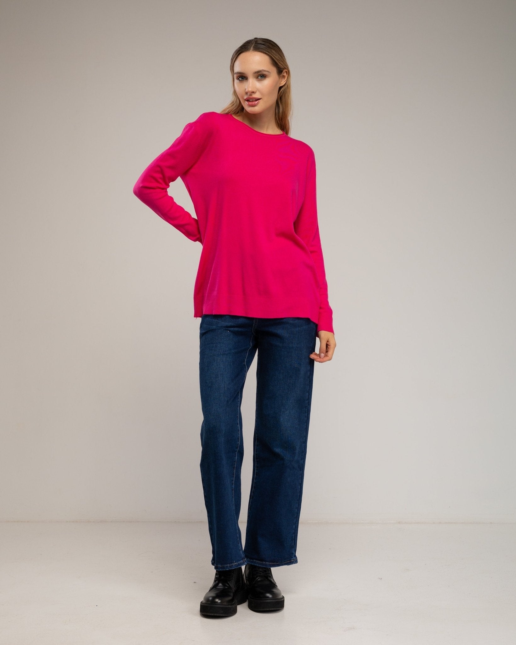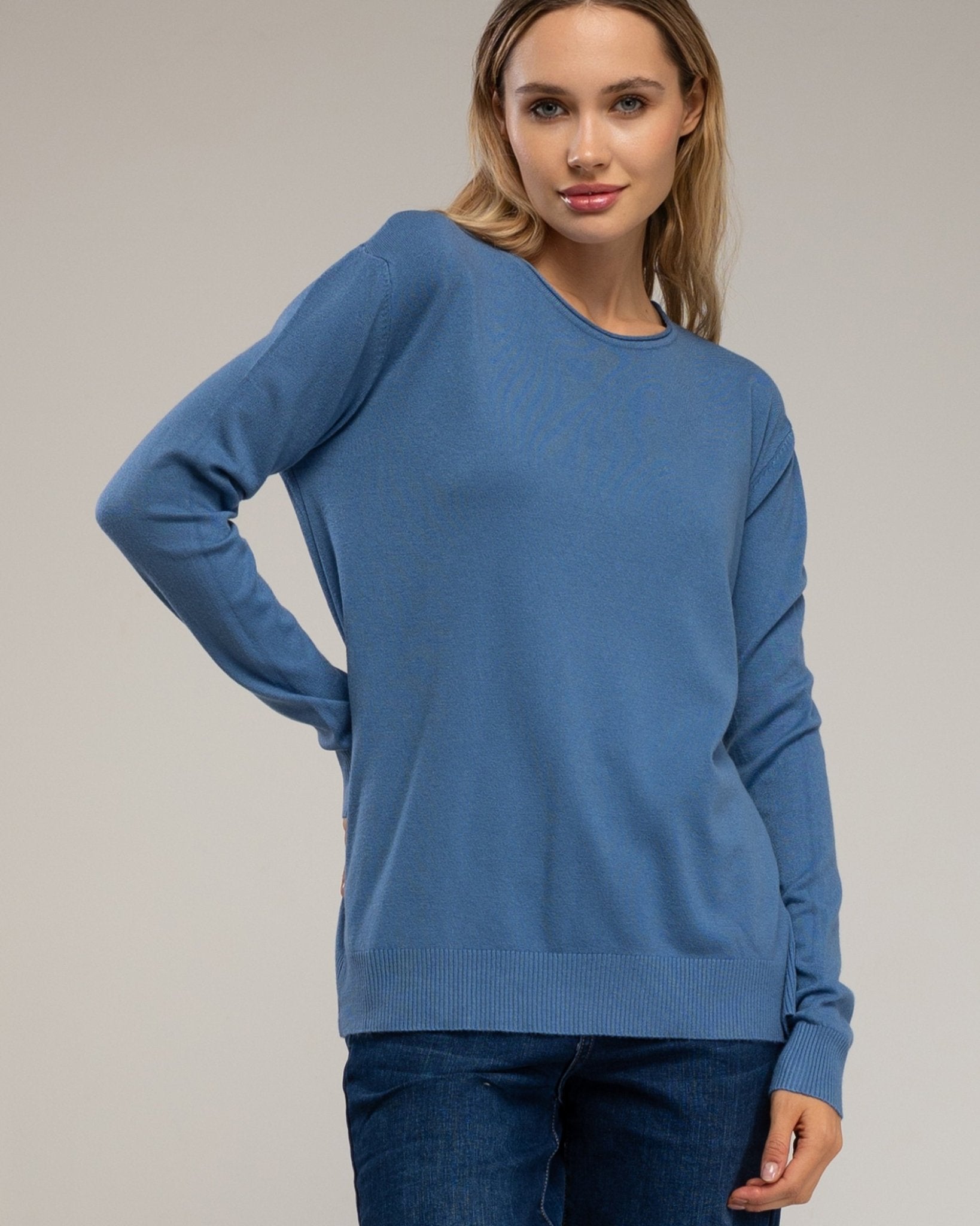 Este jersey de punto fino básico con cuello redondo es una prenda esencial para el día a día. Su tejido suave, ligero y elástico ofrece una gran comodidad y un ajuste favorecedor, ideal para combinar con cualquier estilo, desde looks casuales hasta más formales.