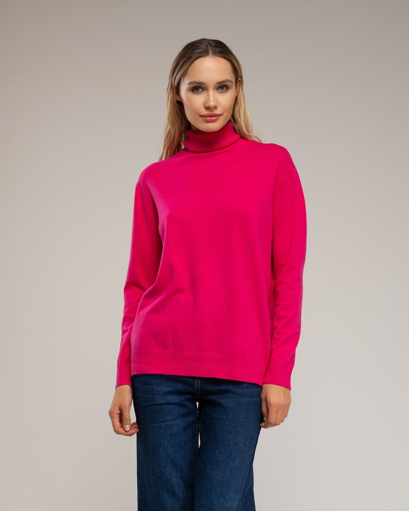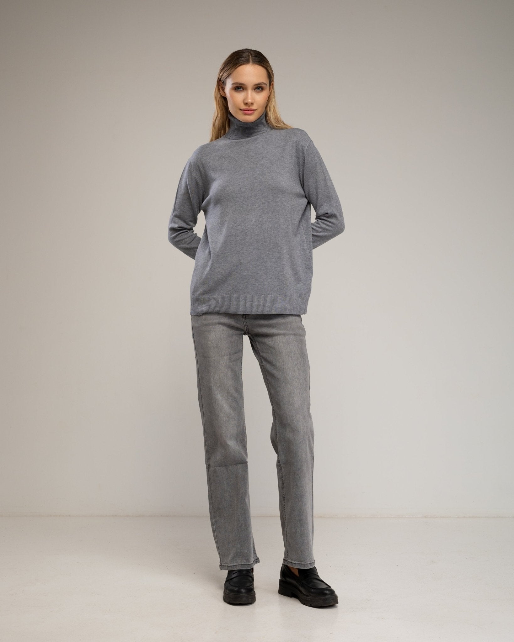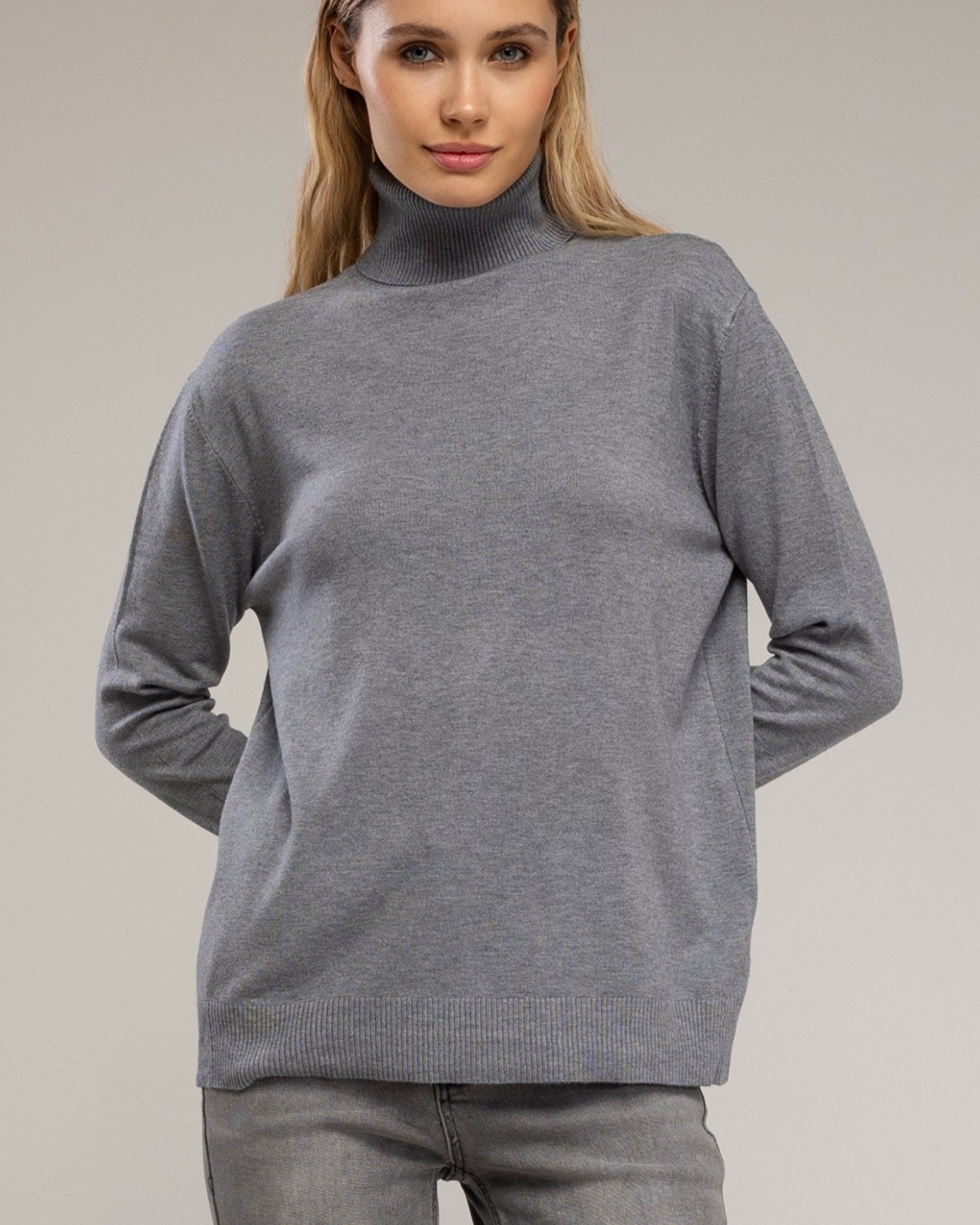 Este jersey de punto fino básico con cuello vuelto es un clásico atemporal que combina confort y estilo. Su tejido suave y elástico se adapta al cuerpo, aportando calidez sin renunciar a la elegancia. Ideal para llevar solo o como capa base en los meses más fríos.