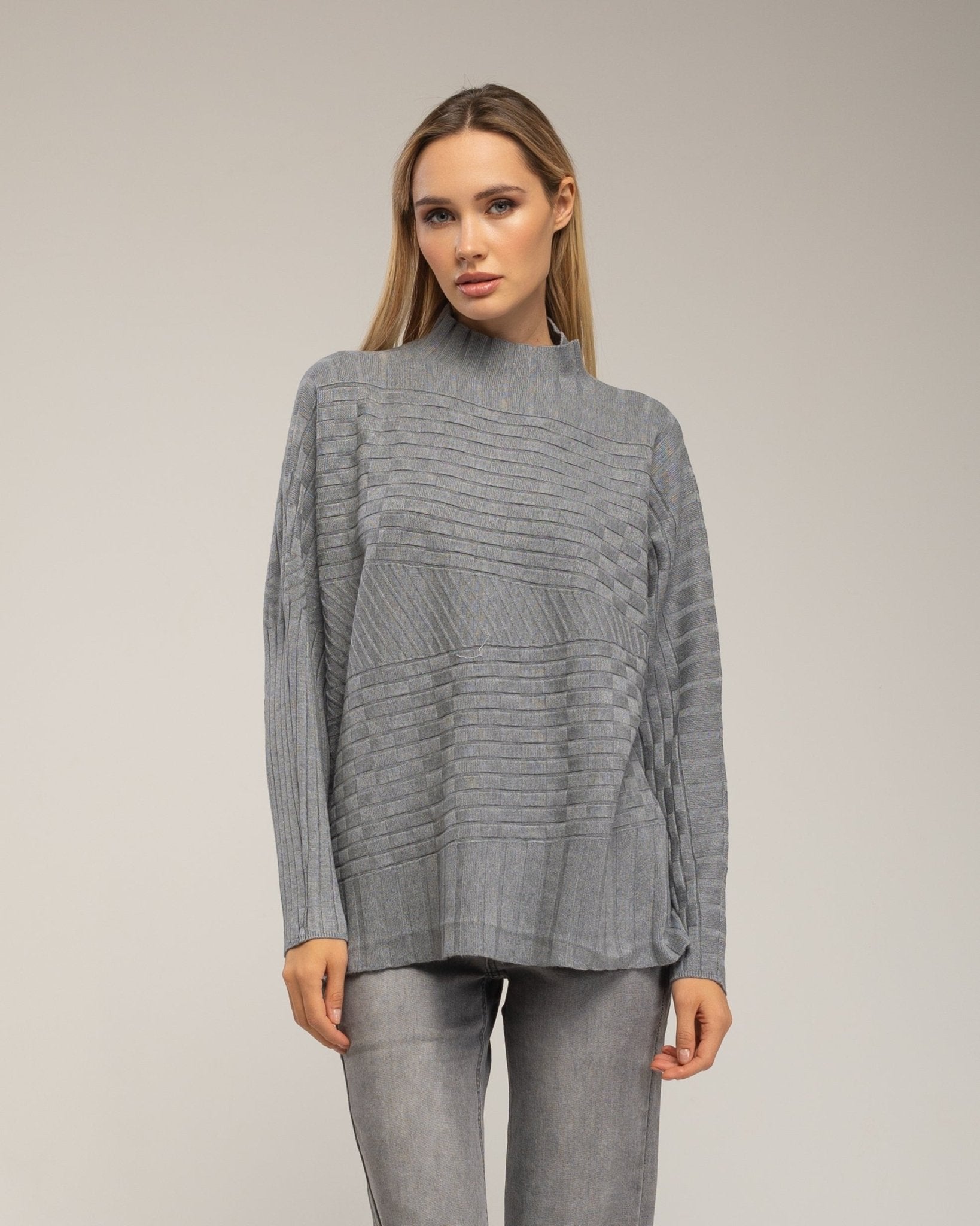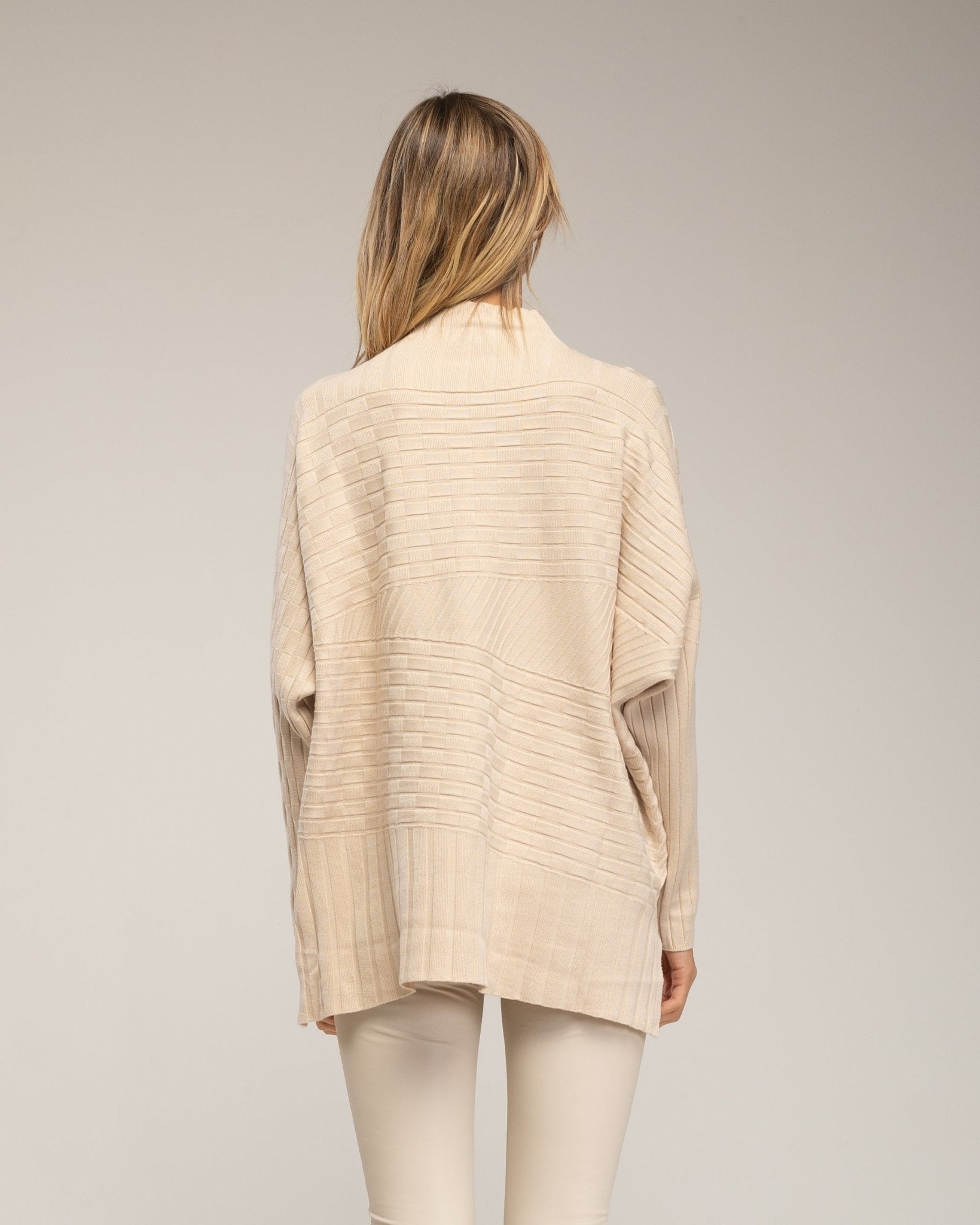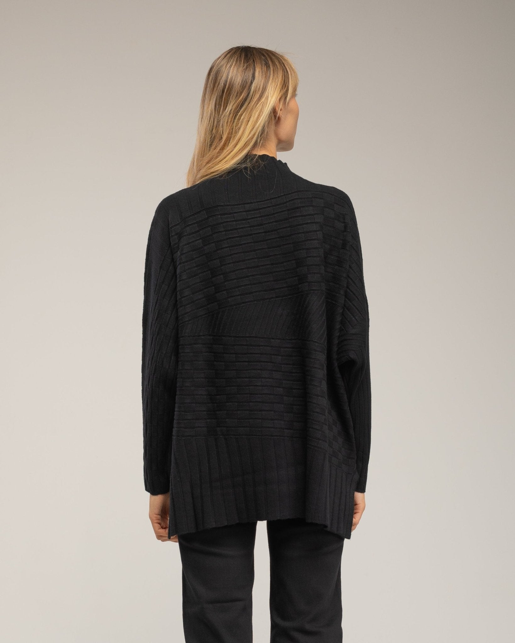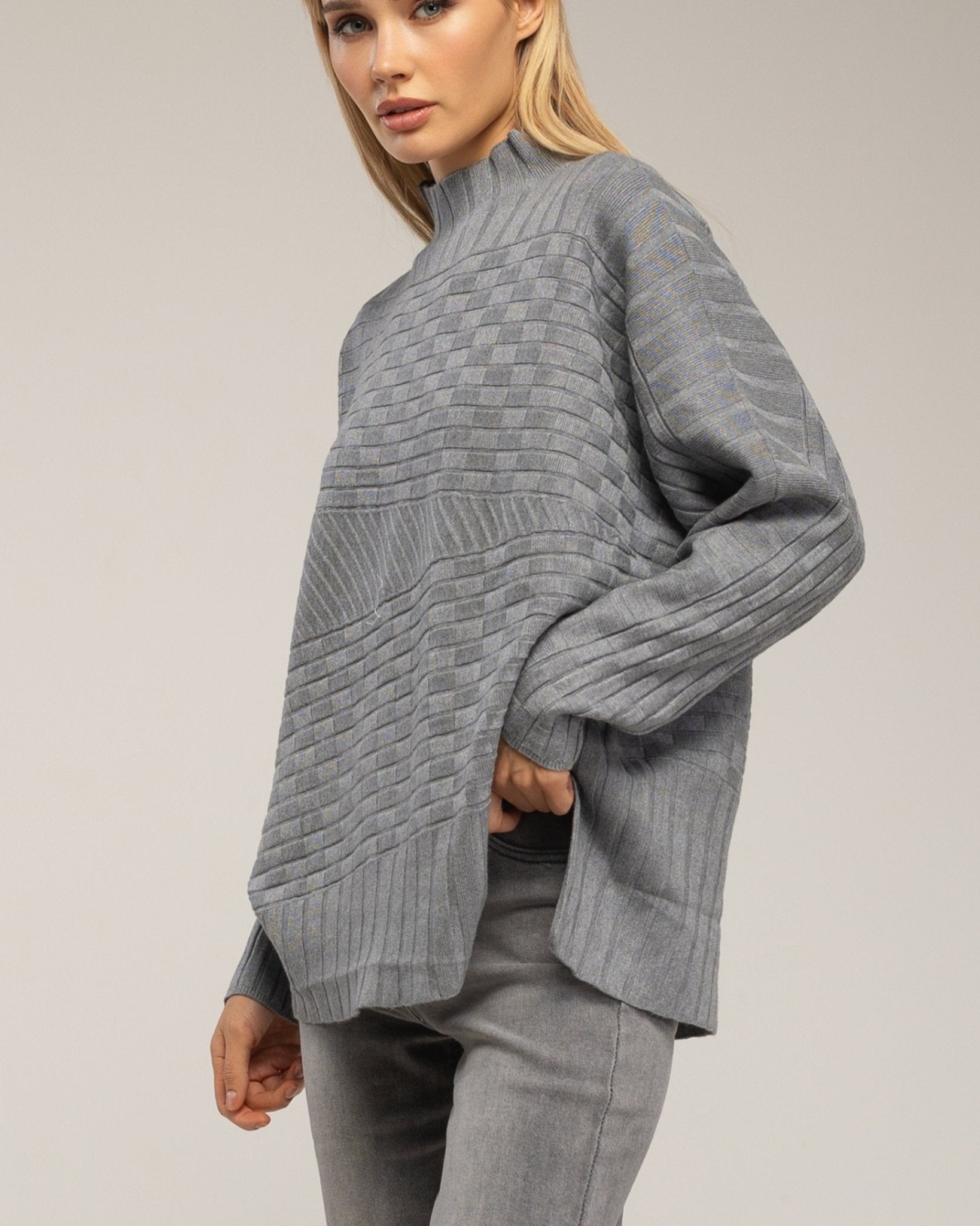 Este jersey oversize combina estilo y comodidad con su original textura de rayas y cuadros. Su tejido suave y elástico proporciona una sensación agradable al tacto y libertad de movimiento, perfecto para looks casuales y modernos con un toque sofisticado.