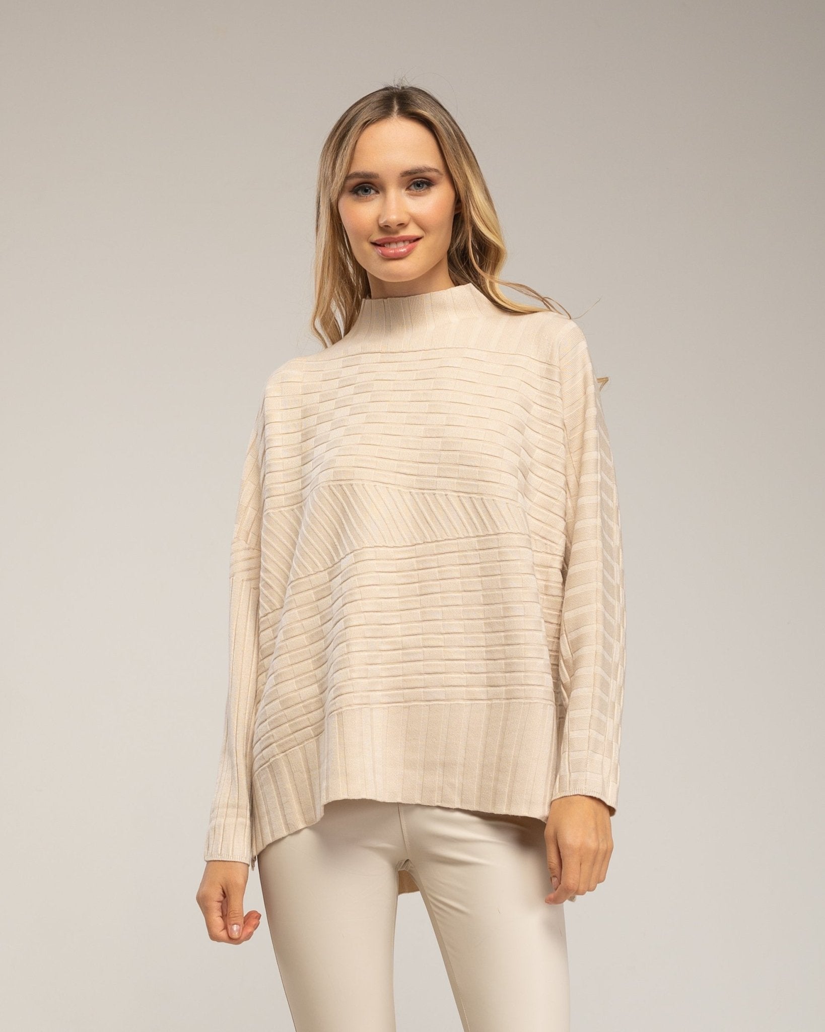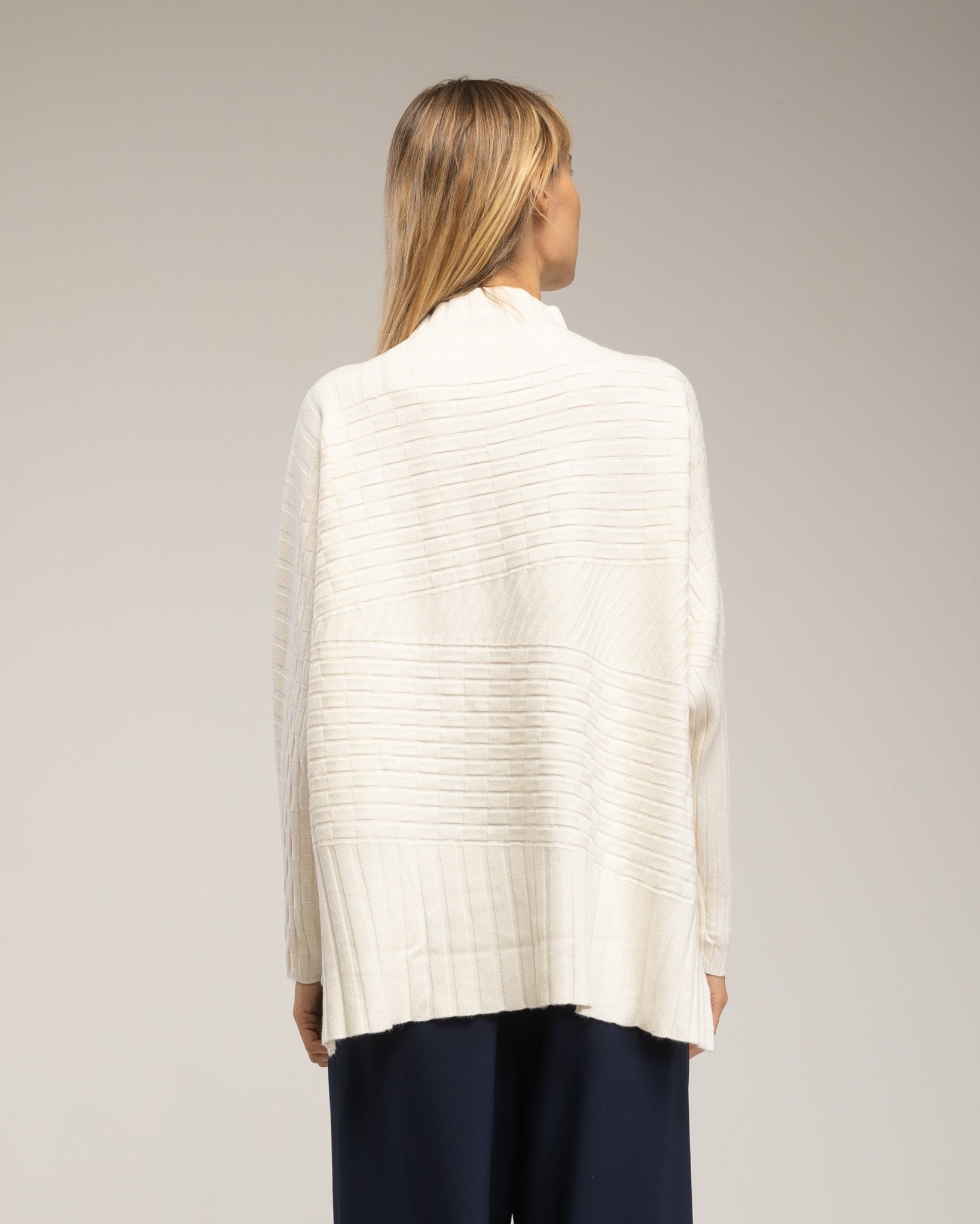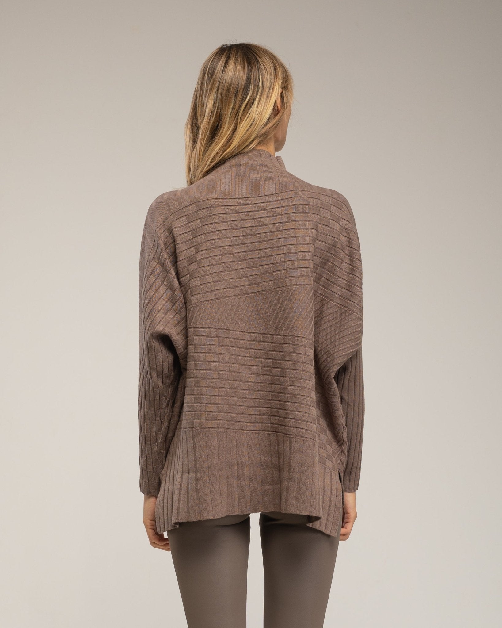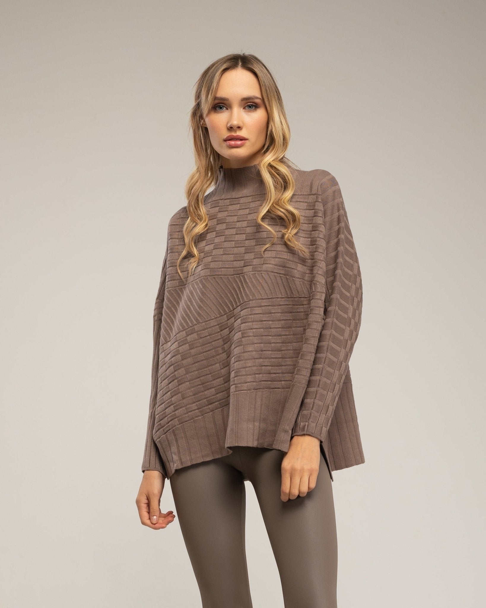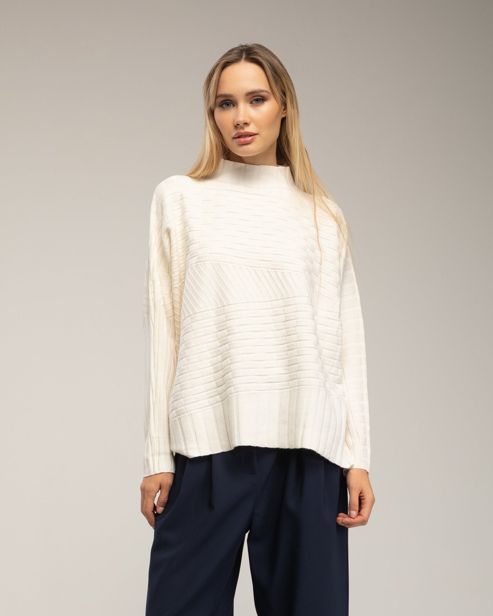 Este jersey oversize combina estilo y comodidad con su original textura de rayas y cuadros. Su tejido suave y elástico proporciona una sensación agradable al tacto y libertad de movimiento, perfecto para looks casuales y modernos con un toque sofisticado.