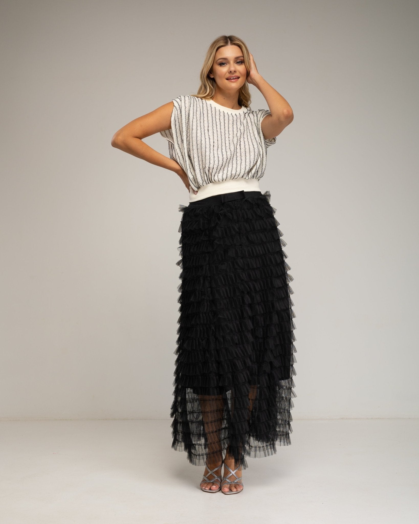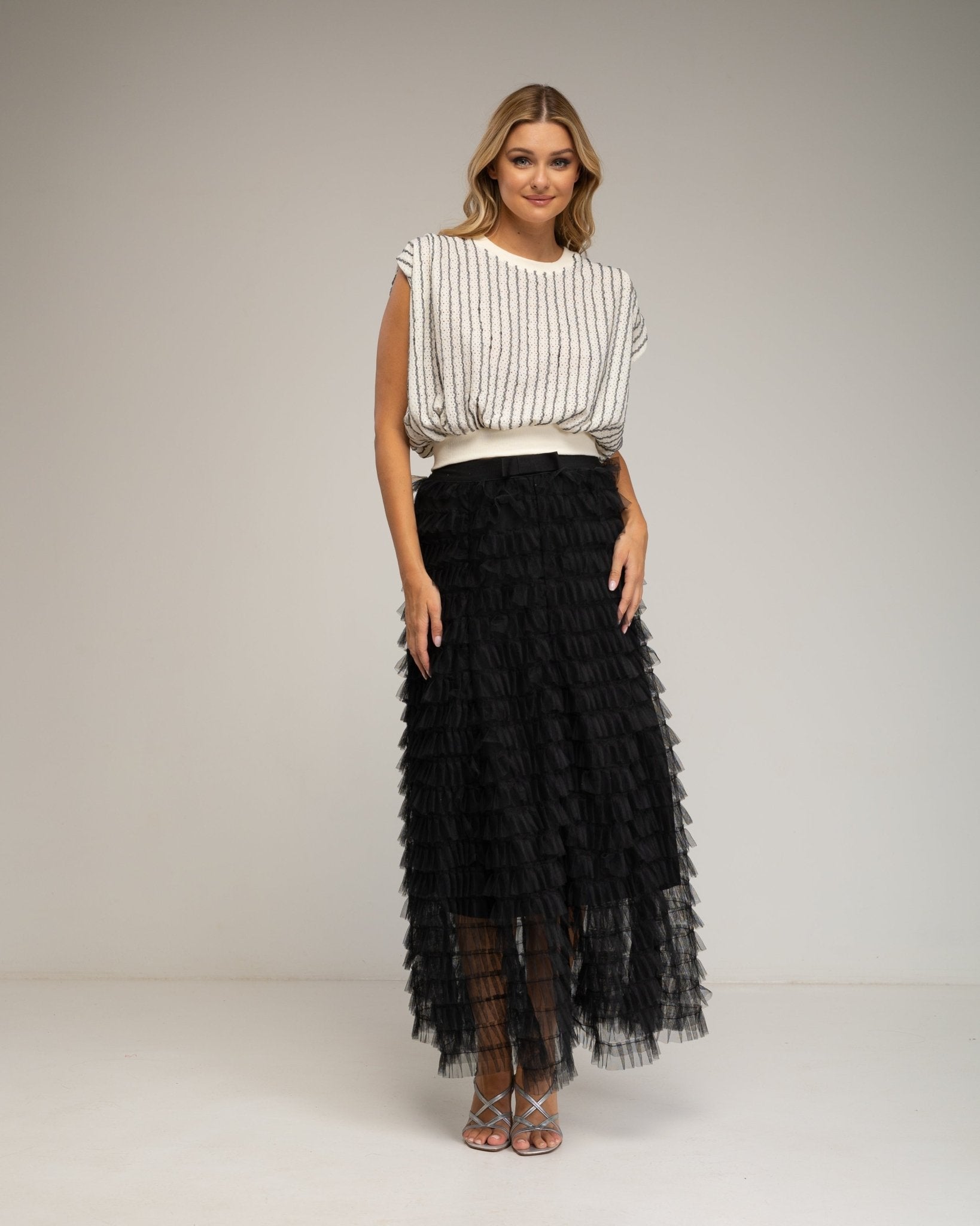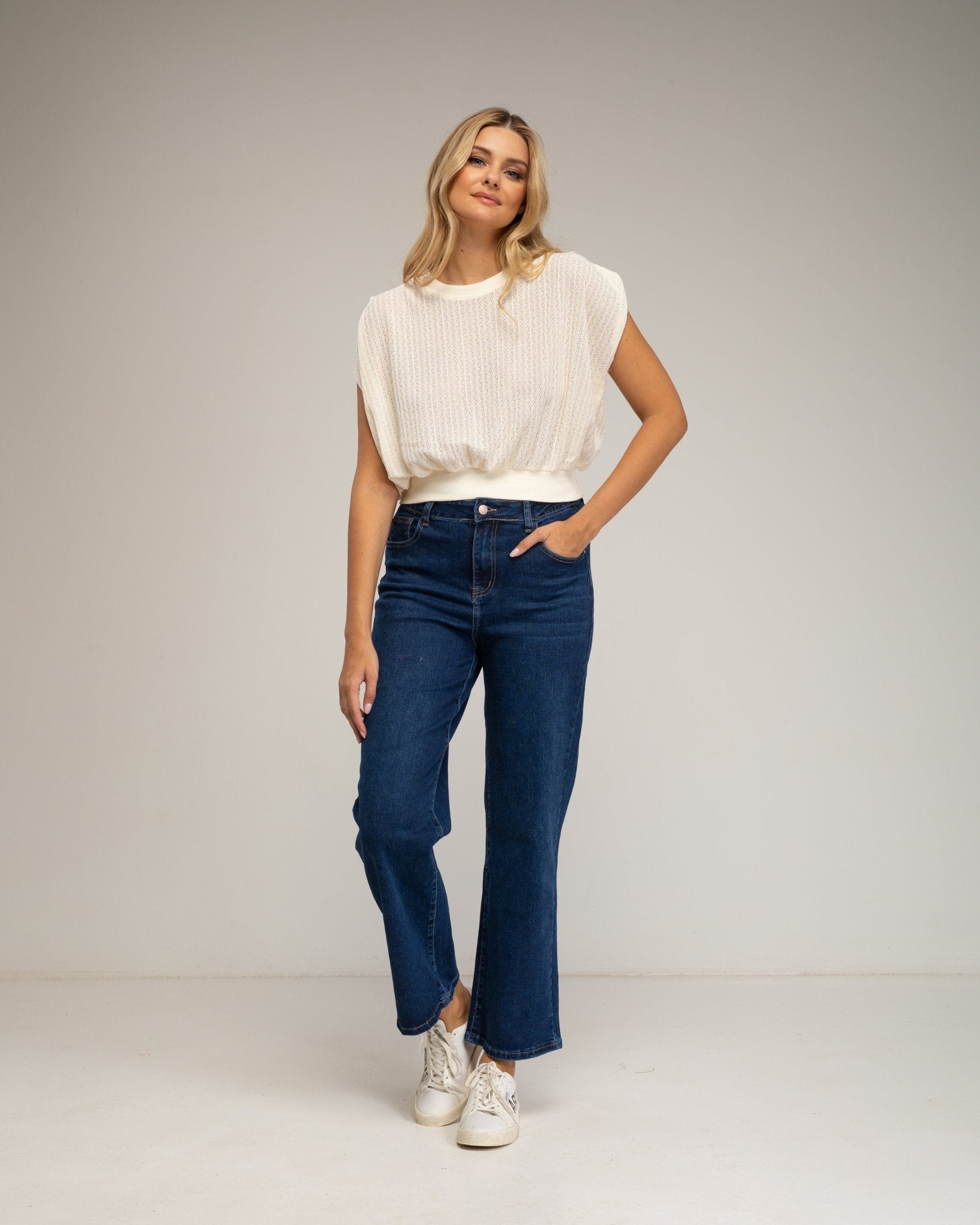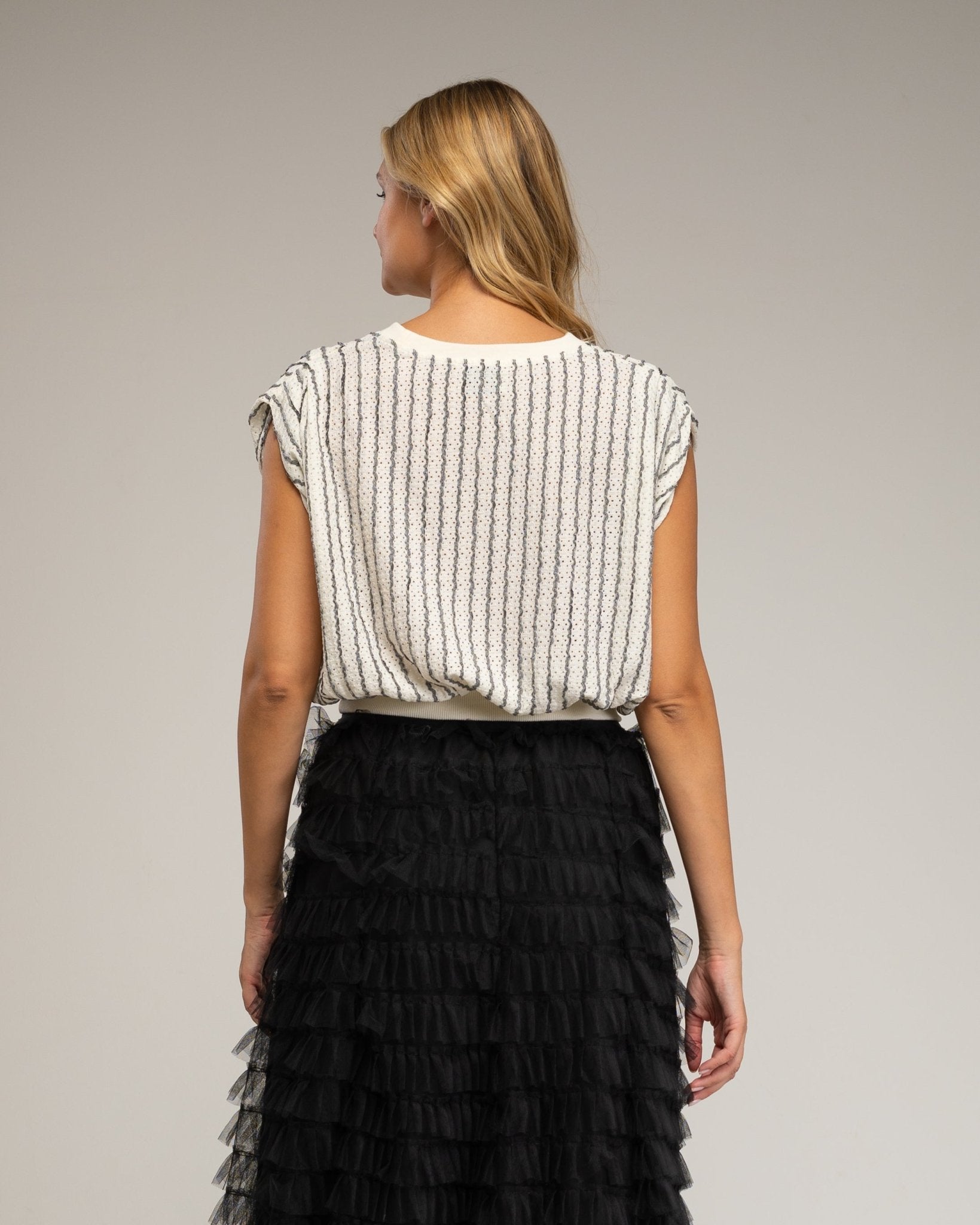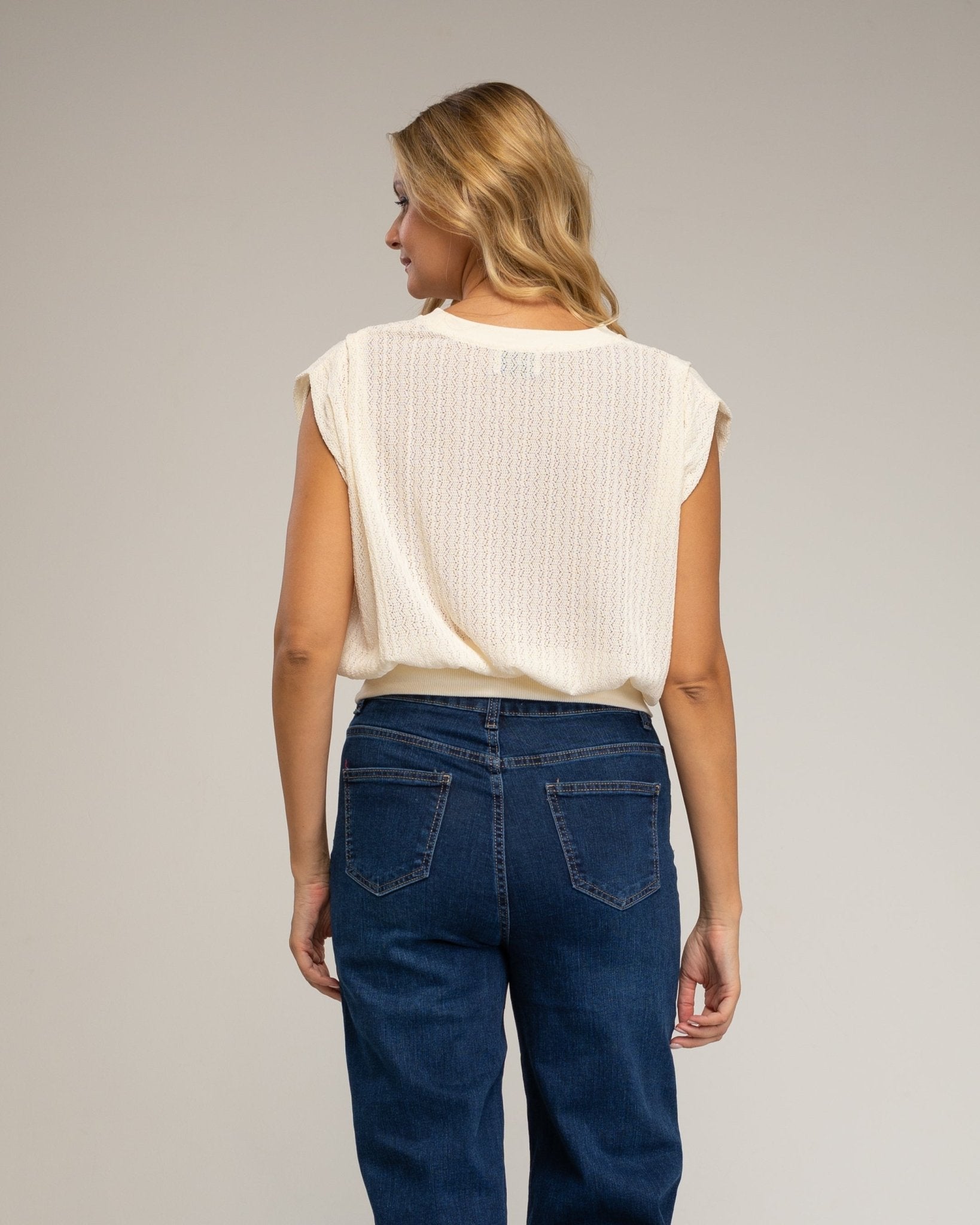 Este top de punto calado sin mangas combina delicadeza y estructura gracias a sus pliegues en los hombros y la cintura elástica que define la silueta. Su diseño ligero y femenino lo convierte en una prenda ideal para looks frescos y con estilo.